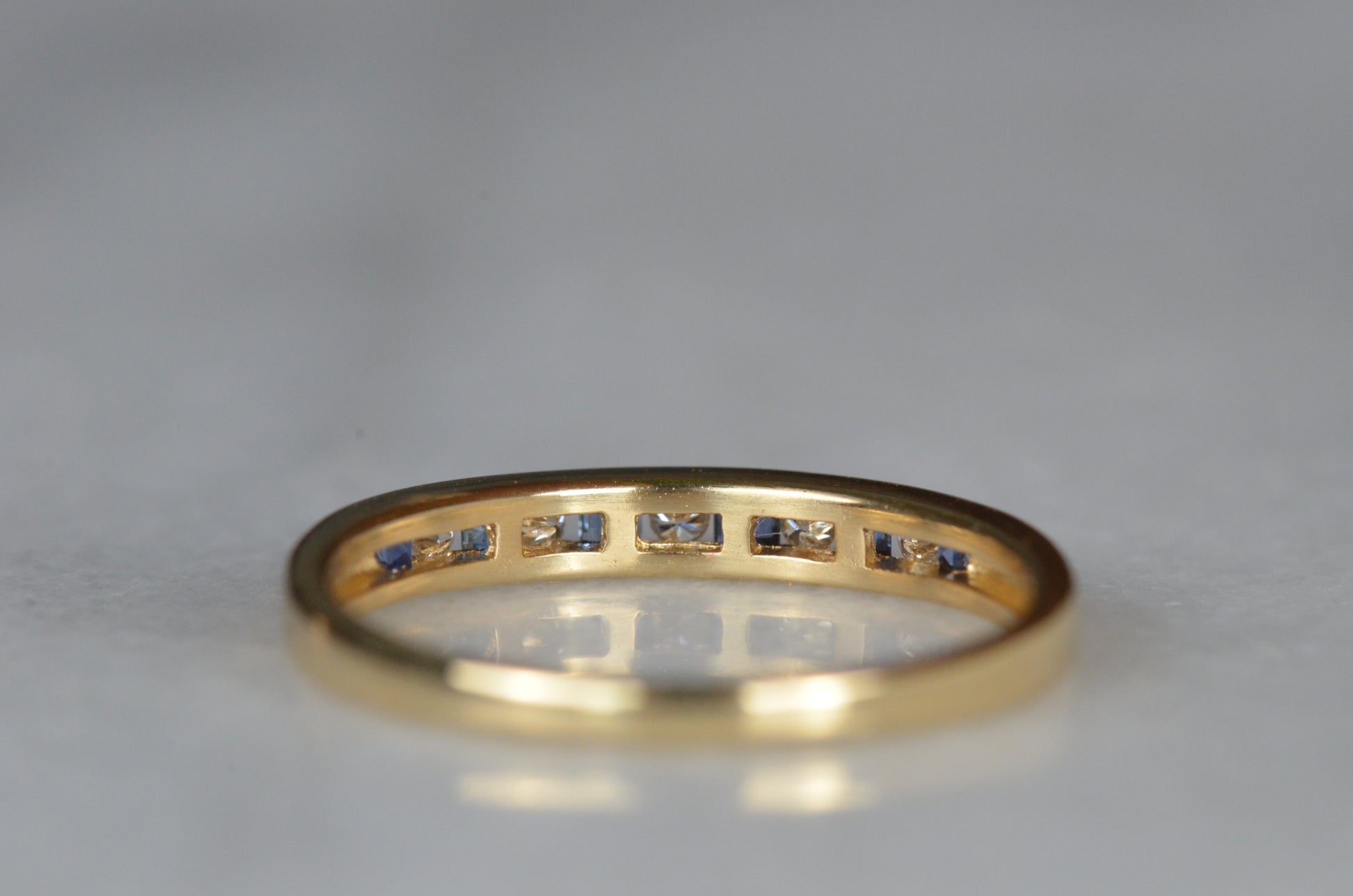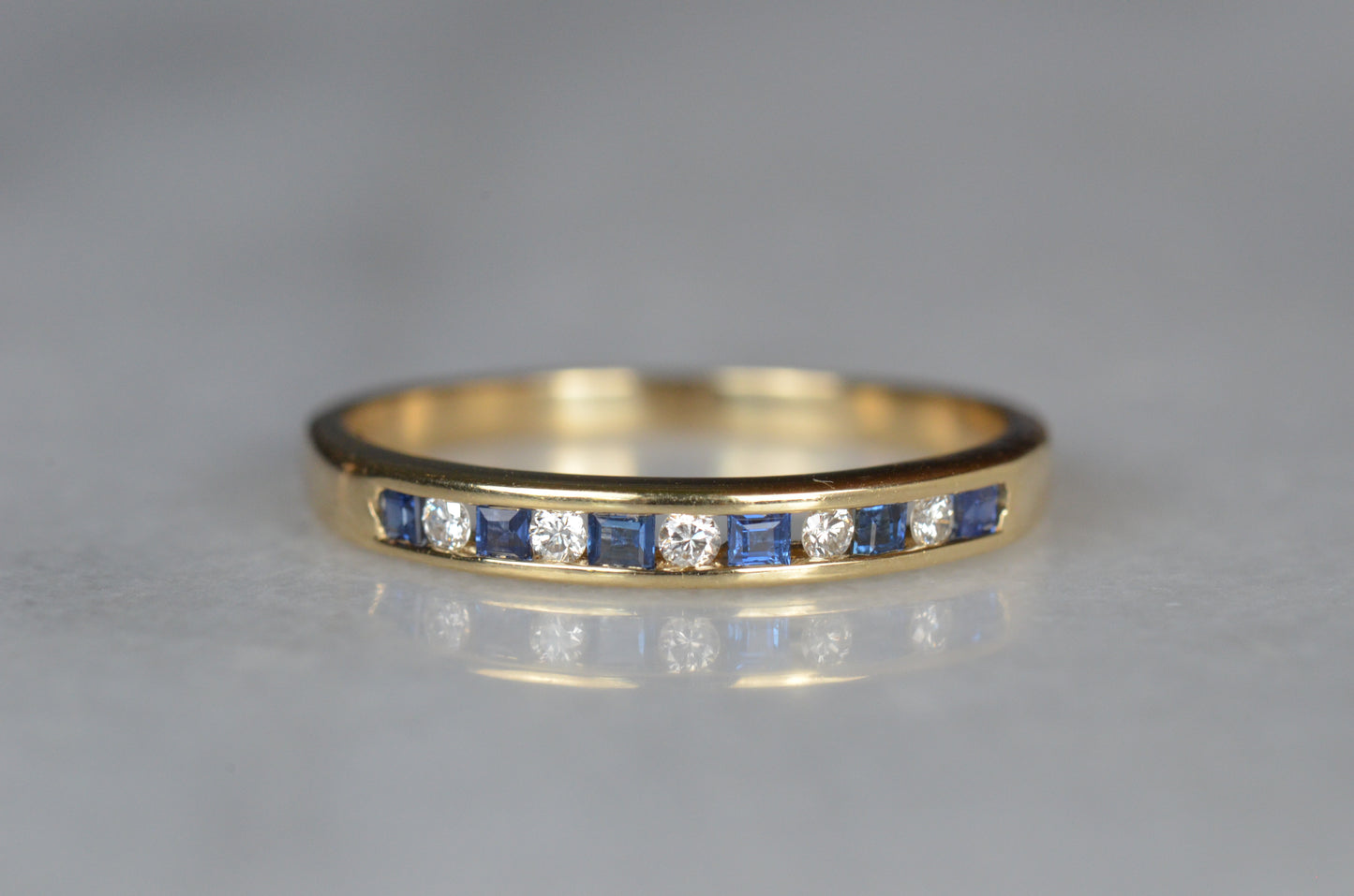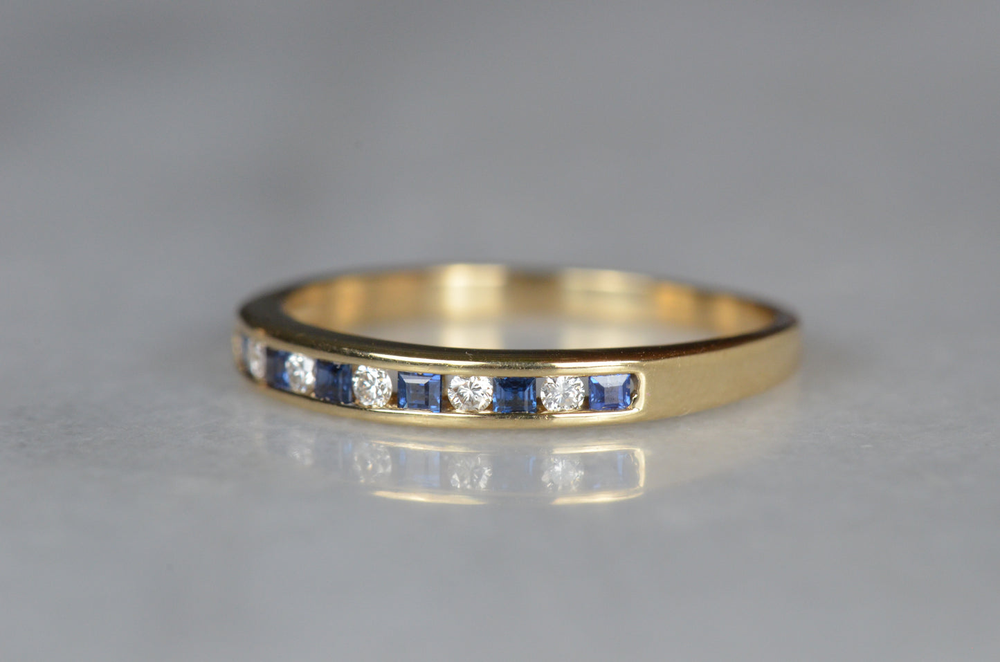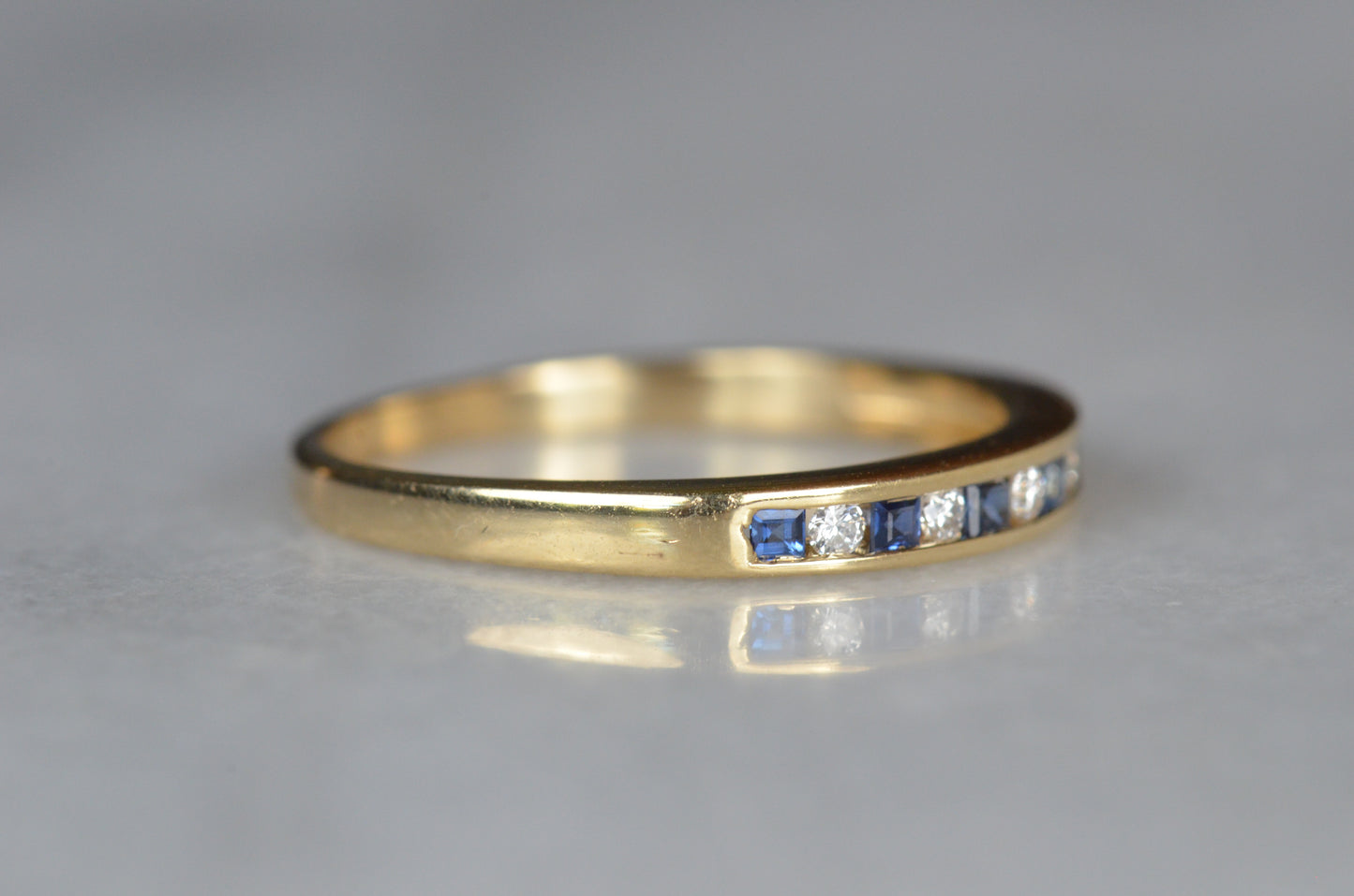 Smooth, shining, and sleek with a pop of colour - this is a dream band. Warm yellow gold balances the cool sparkle of vivid blue sapphires and crisp diamonds. The channel setting allows the band to be ultra low rise while also protecting the stones from both edges, making it a perfect choice to slip into a stack - wedding or otherwise.