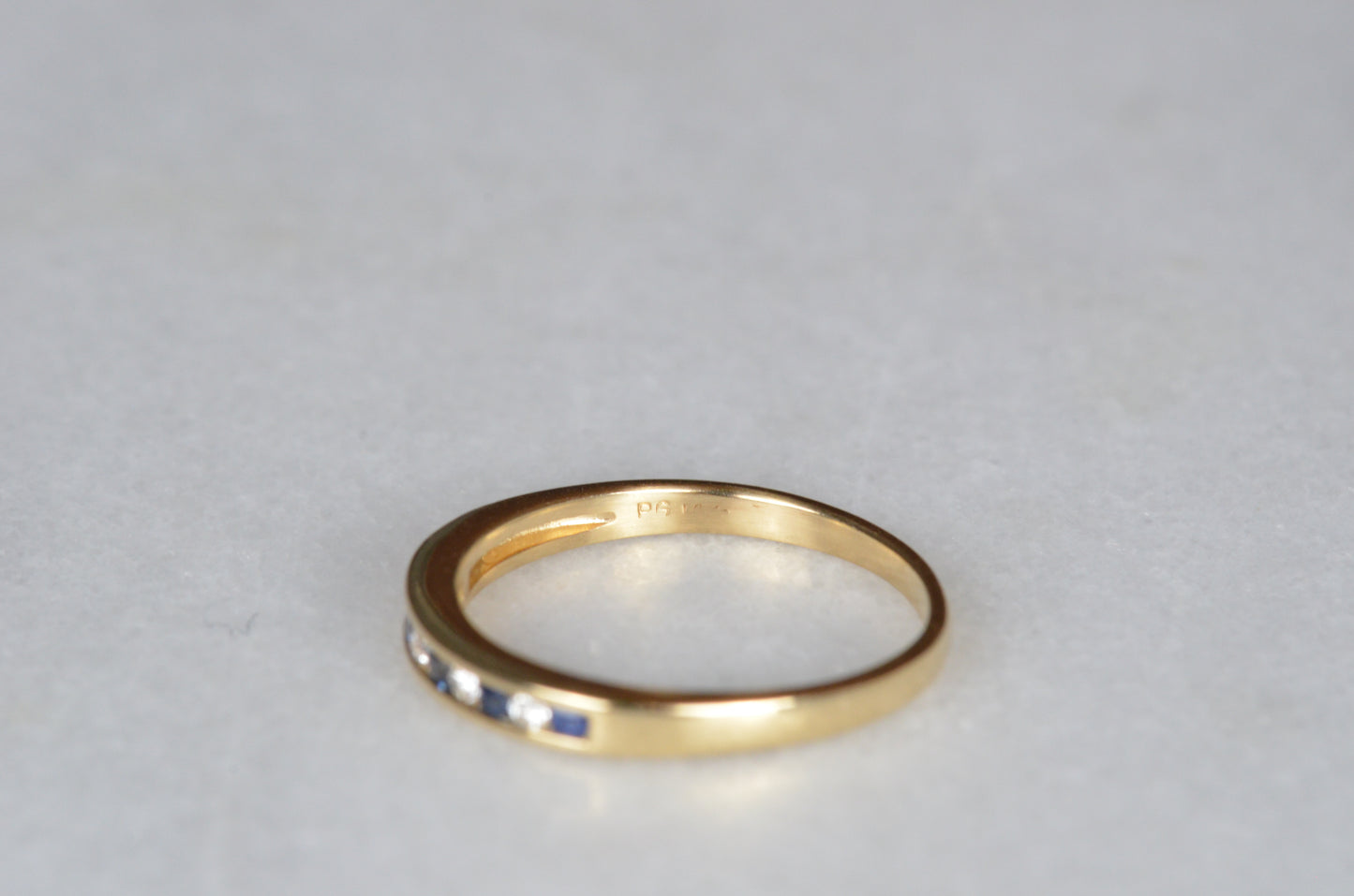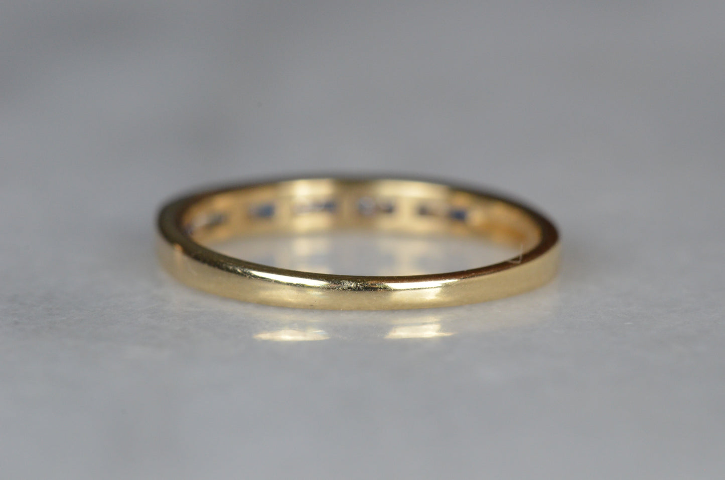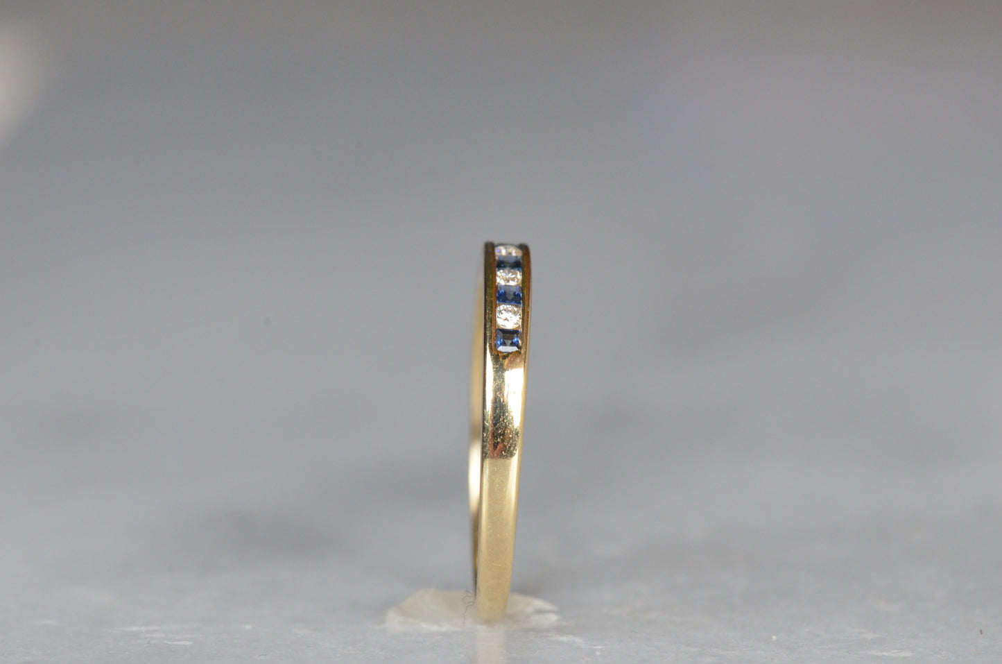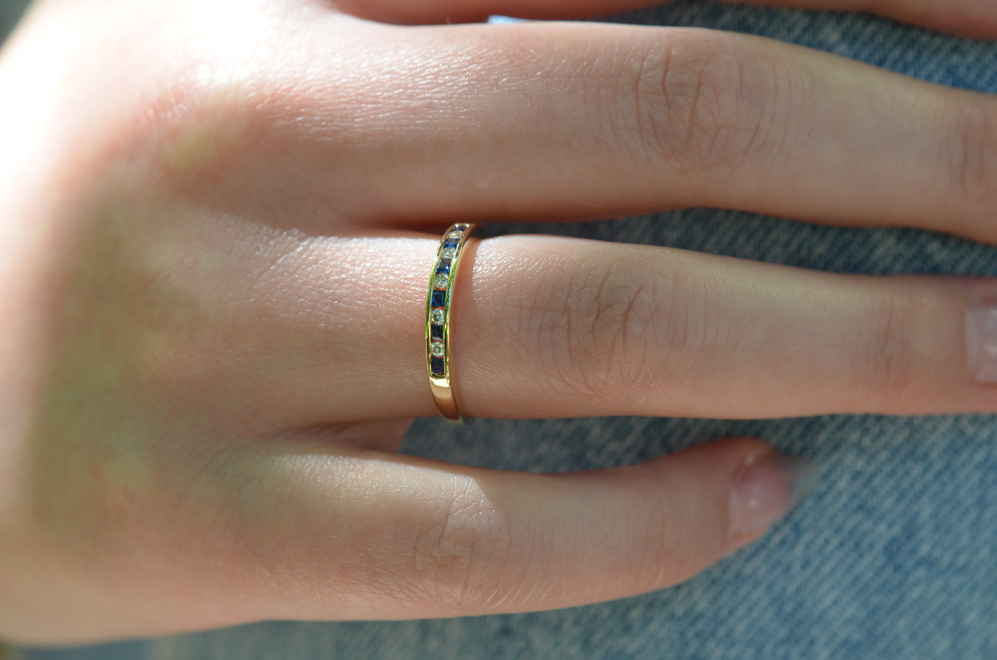 Smooth, shining, and sleek with a pop of colour - this is a dream band. Warm yellow gold balances the cool sparkle of vivid blue sapphires and crisp diamonds. The channel setting allows the band to be ultra low rise while also protecting the stones from both edges, making it a perfect choice to slip into a stack - wedding or otherwise.