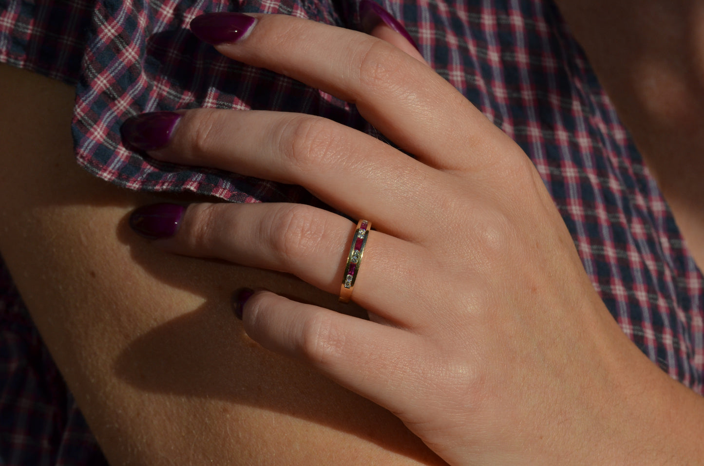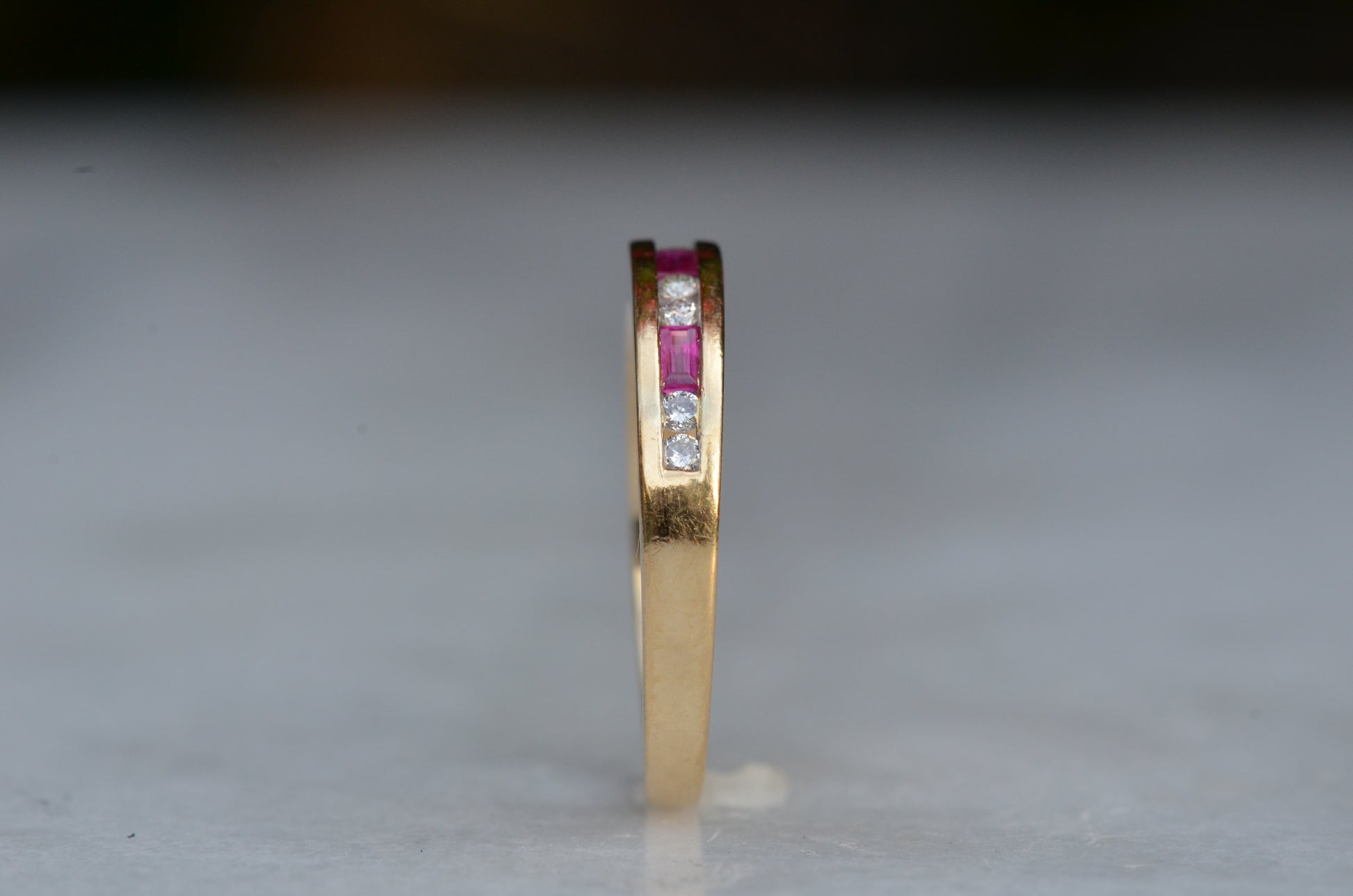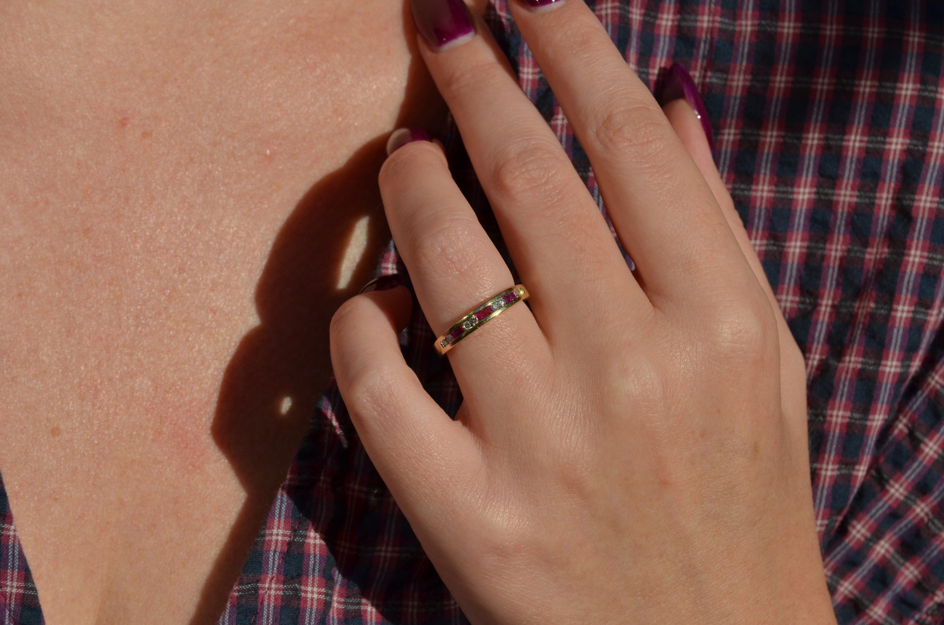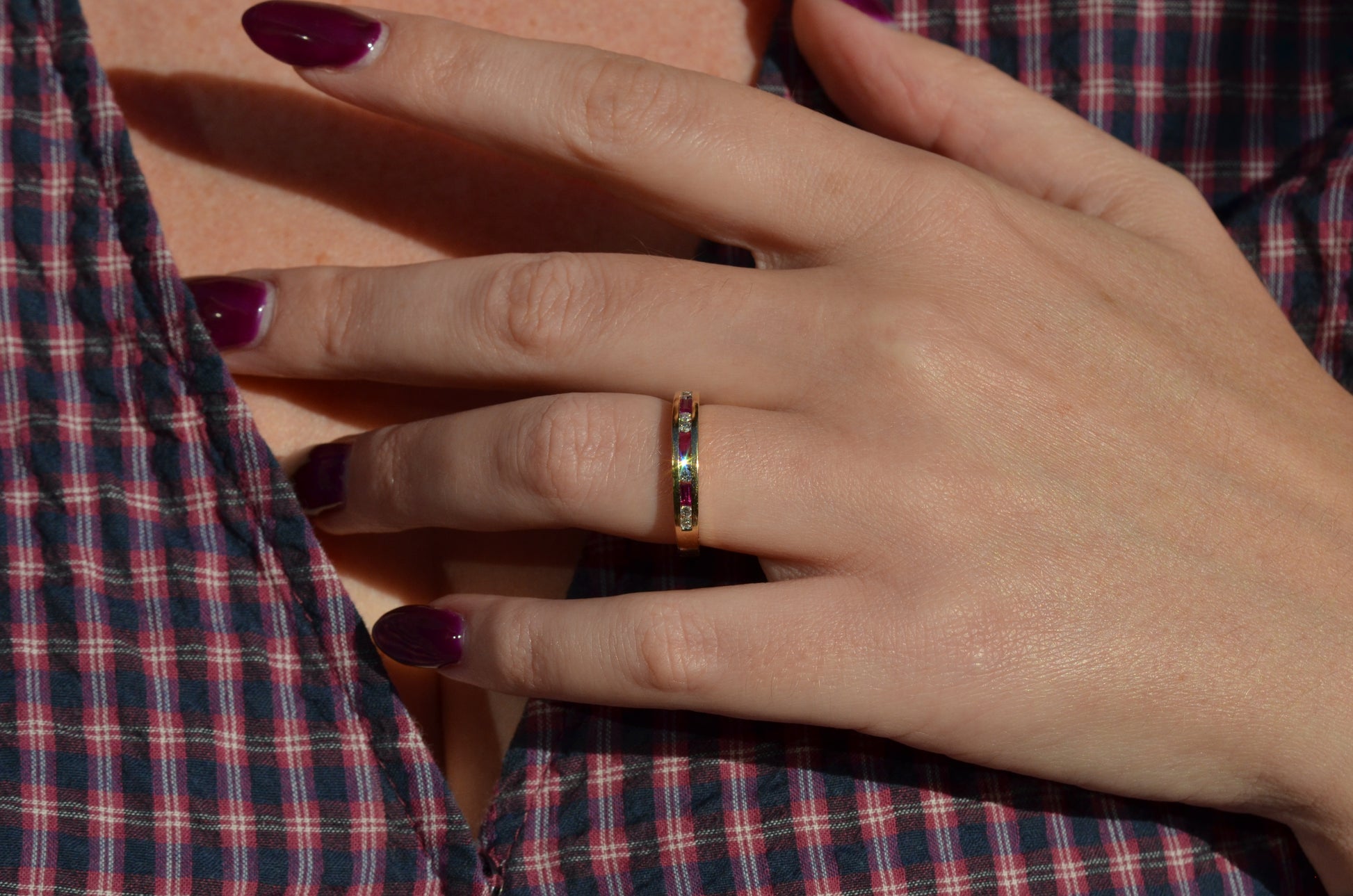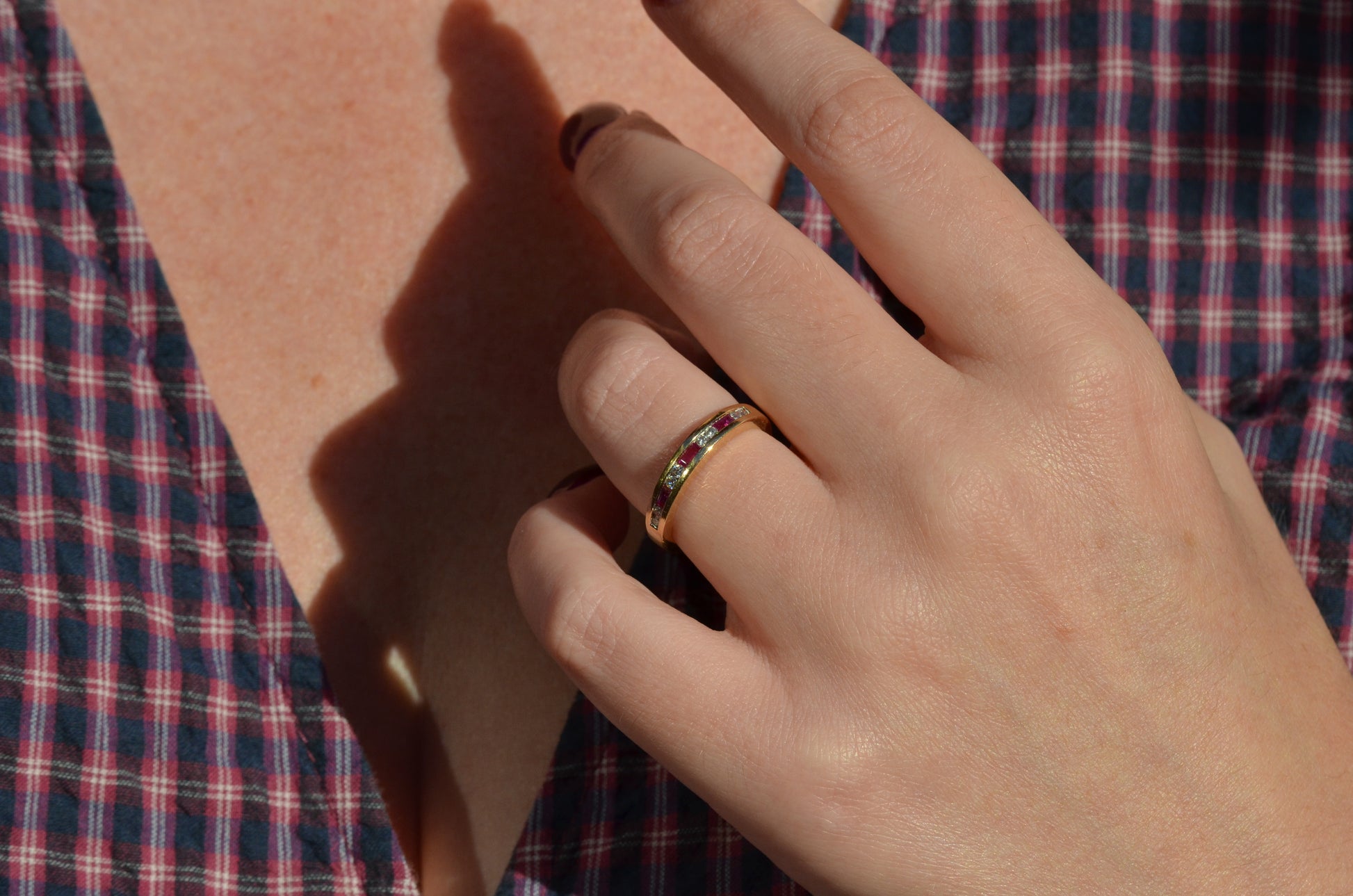 Bright and lovely, this gorgeous ring features alternating diamonds and rubies dazzling in a substantial channel setting. Easy to wear and stack, and a great way to add a pop of colour to your jewelry wardrobe.