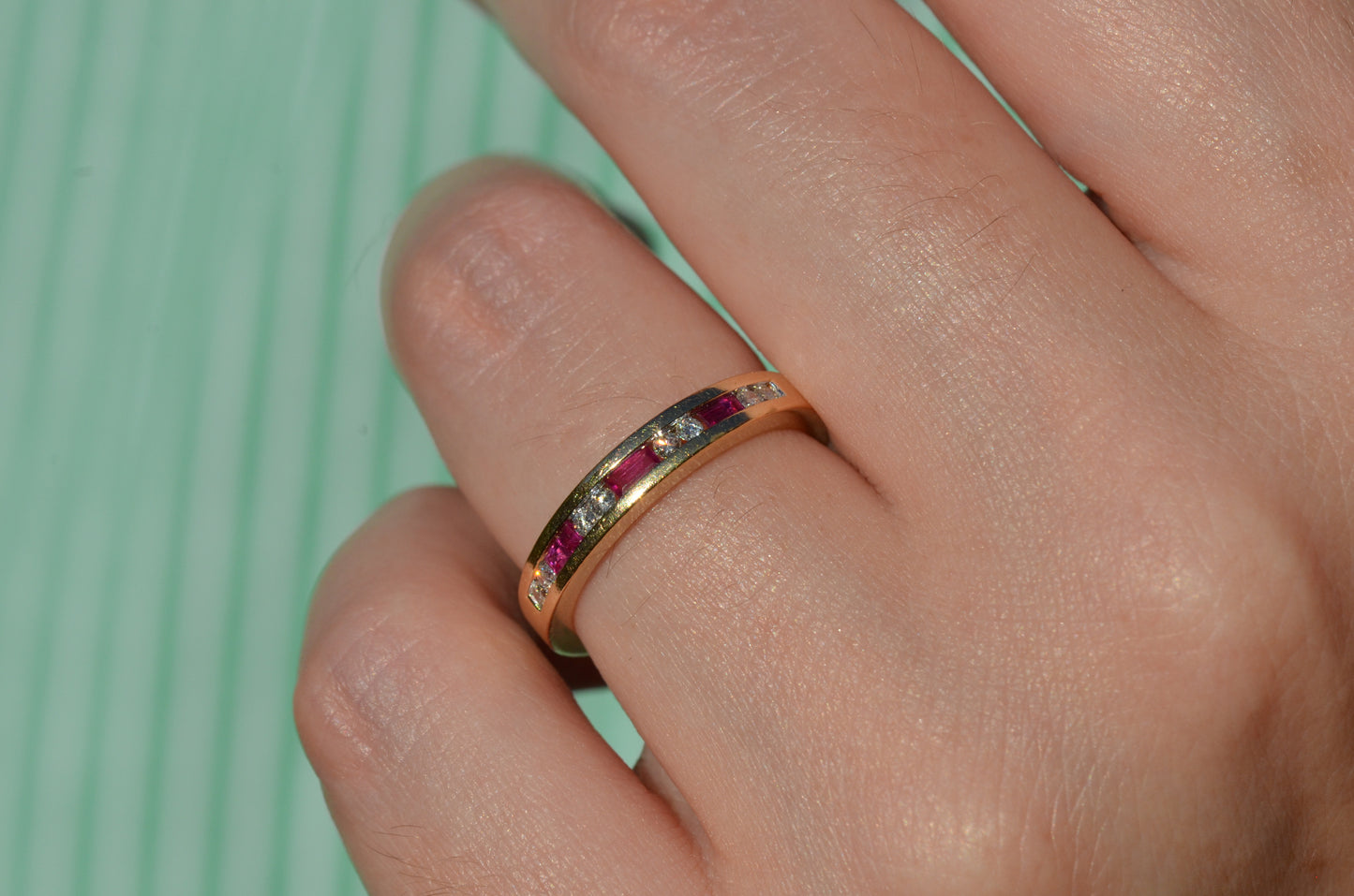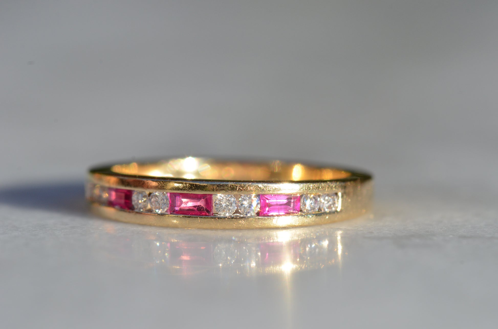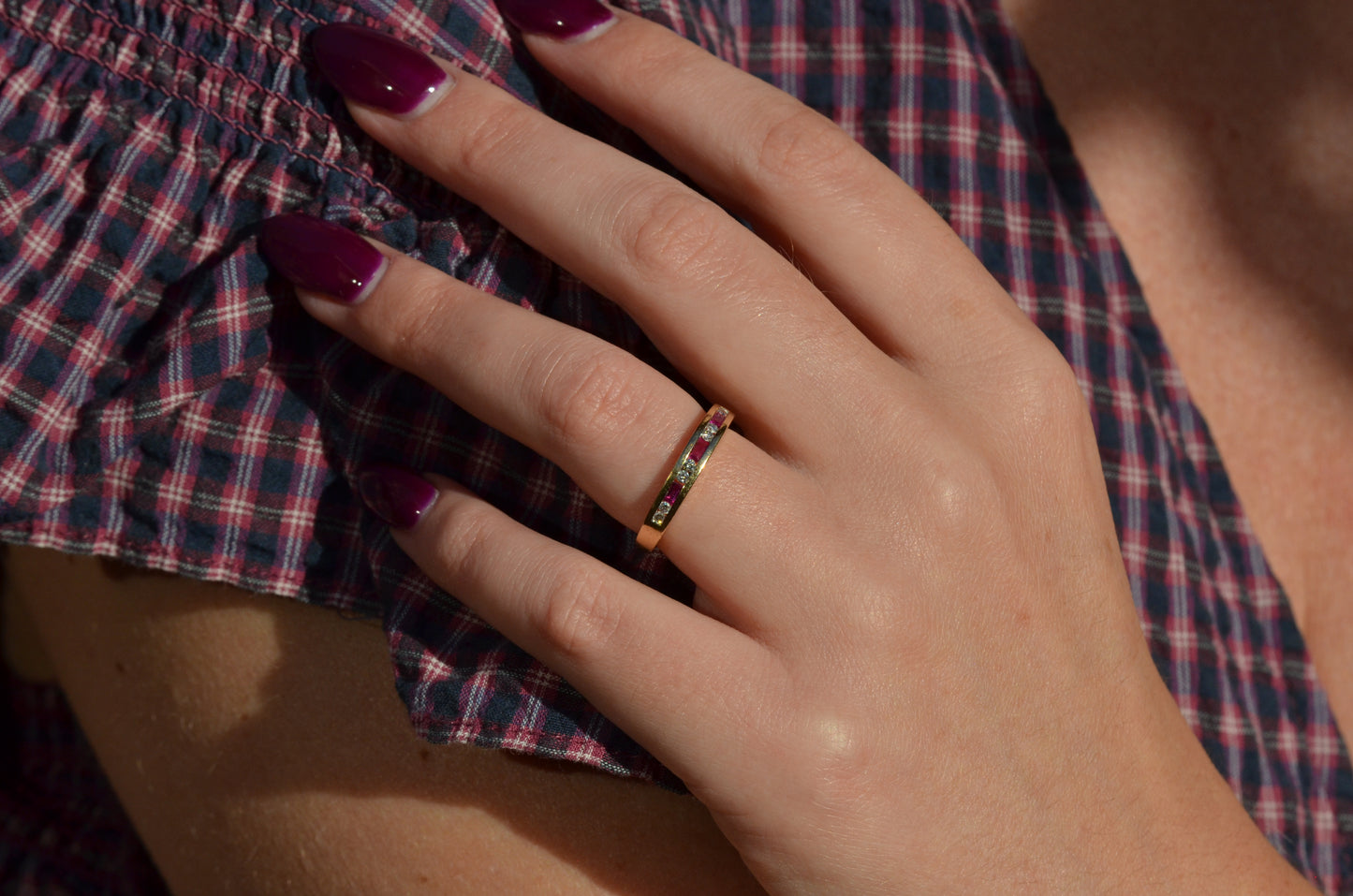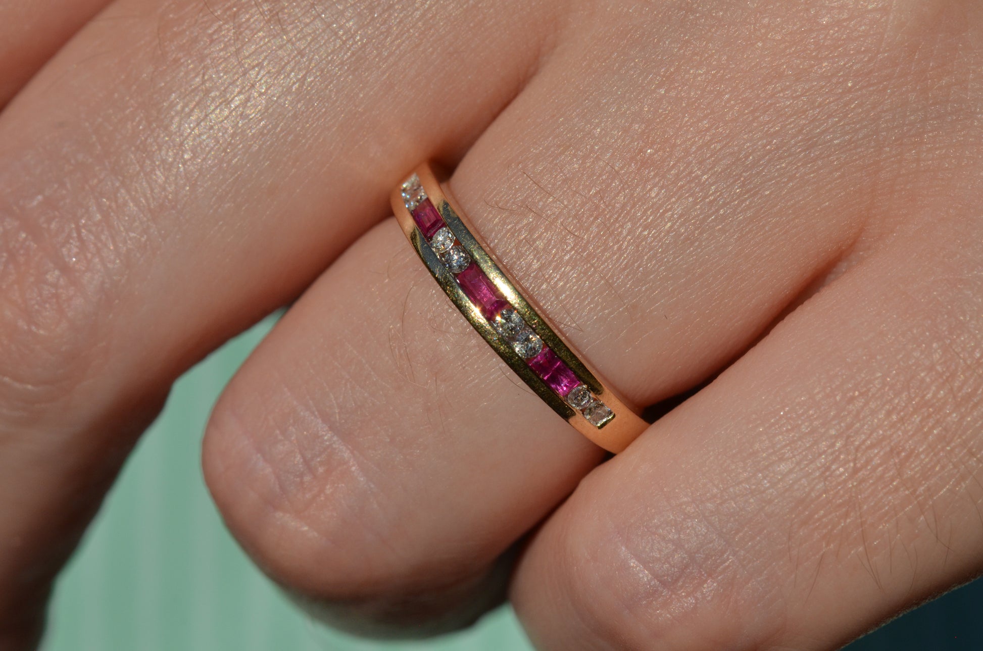 Bright and lovely, this gorgeous ring features alternating diamonds and rubies dazzling in a substantial channel setting. Easy to wear and stack, and a great way to add a pop of colour to your jewelry wardrobe.
