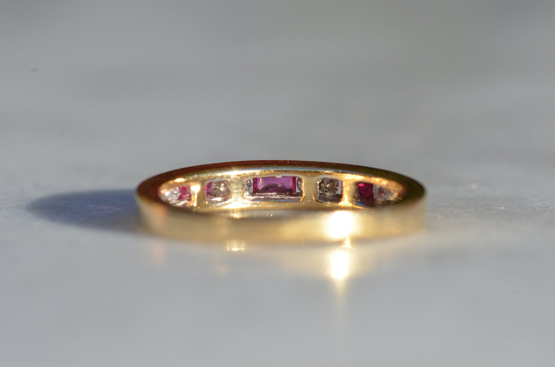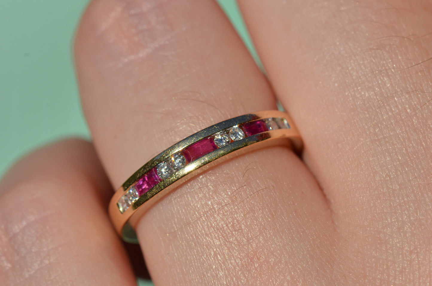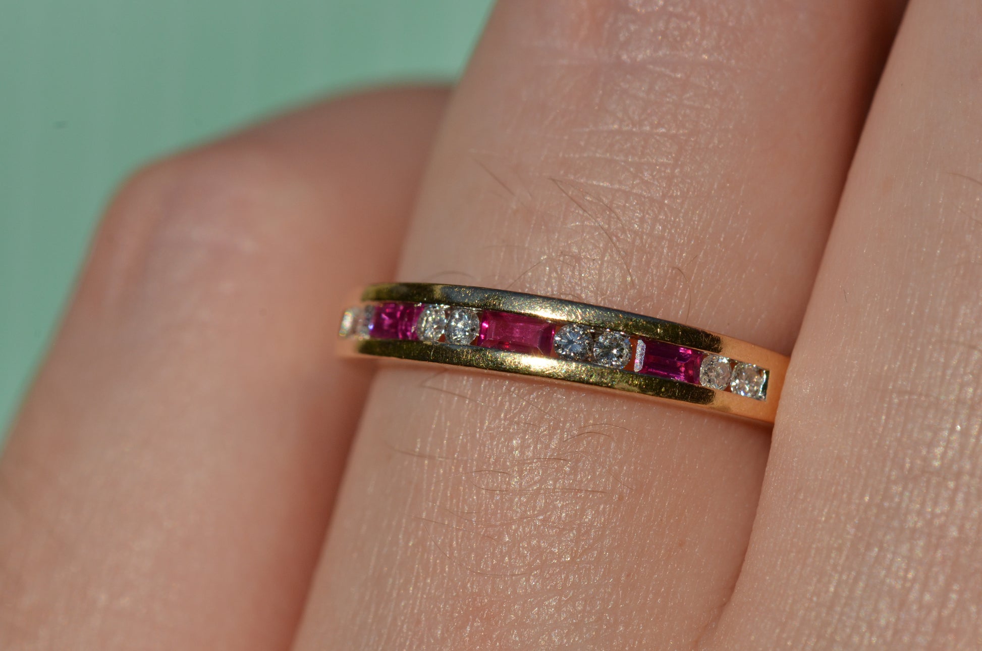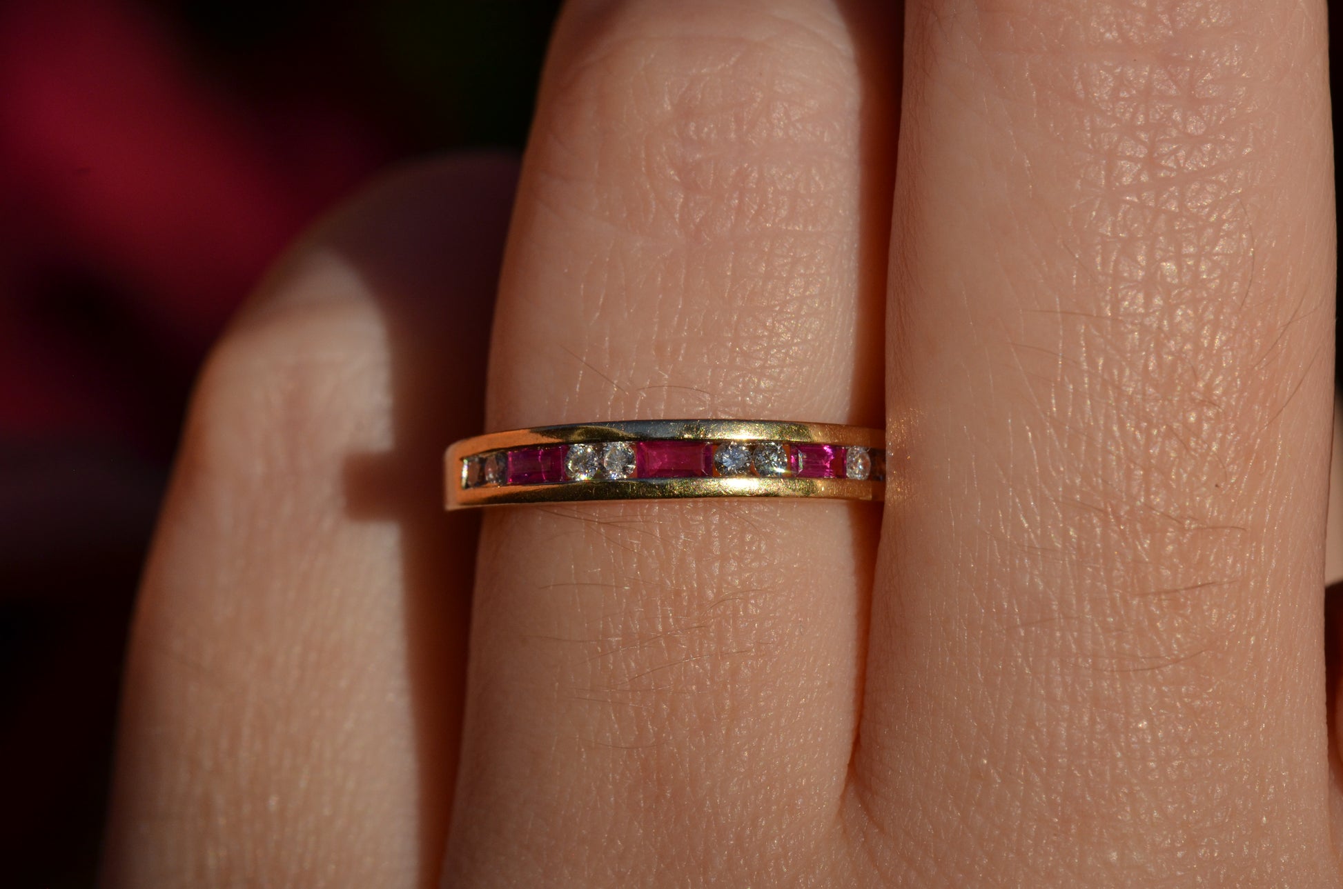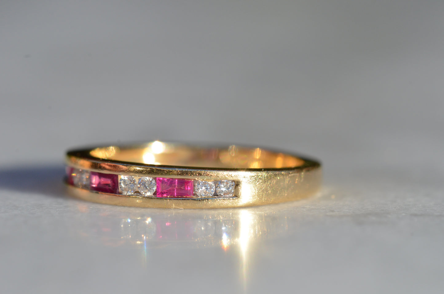 Bright and lovely, this gorgeous ring features alternating diamonds and rubies dazzling in a substantial channel setting. Easy to wear and stack, and a great way to add a pop of colour to your jewelry wardrobe.