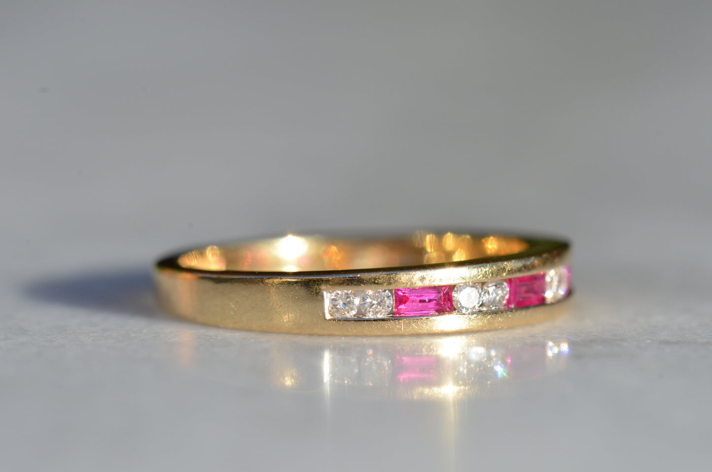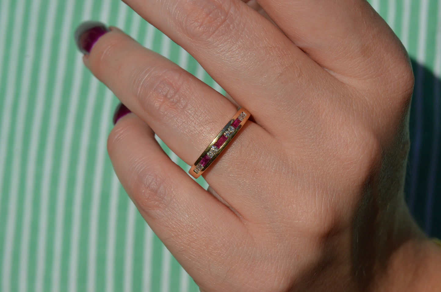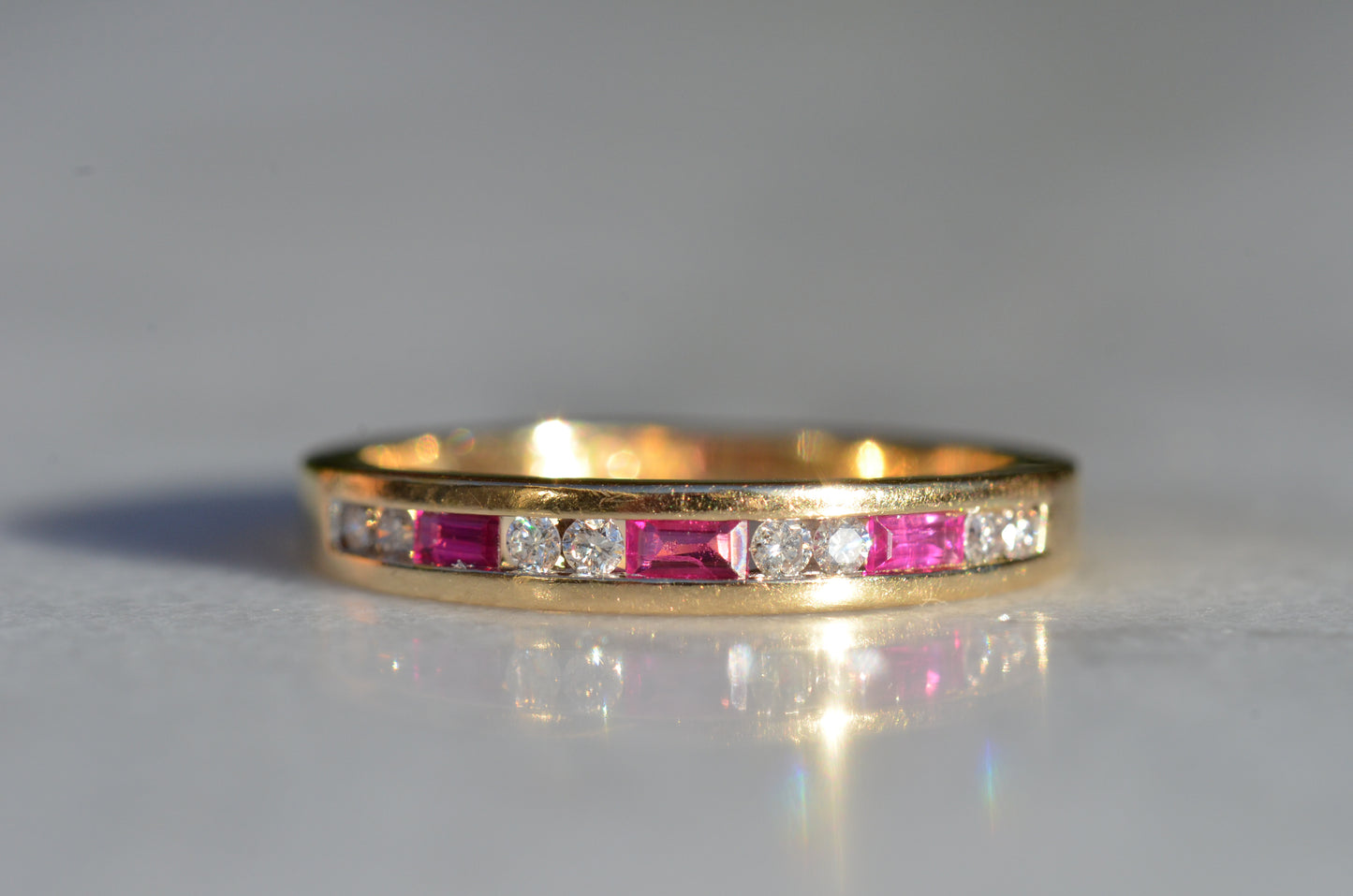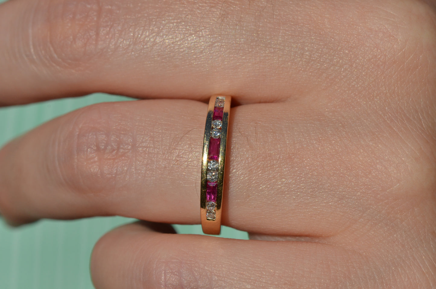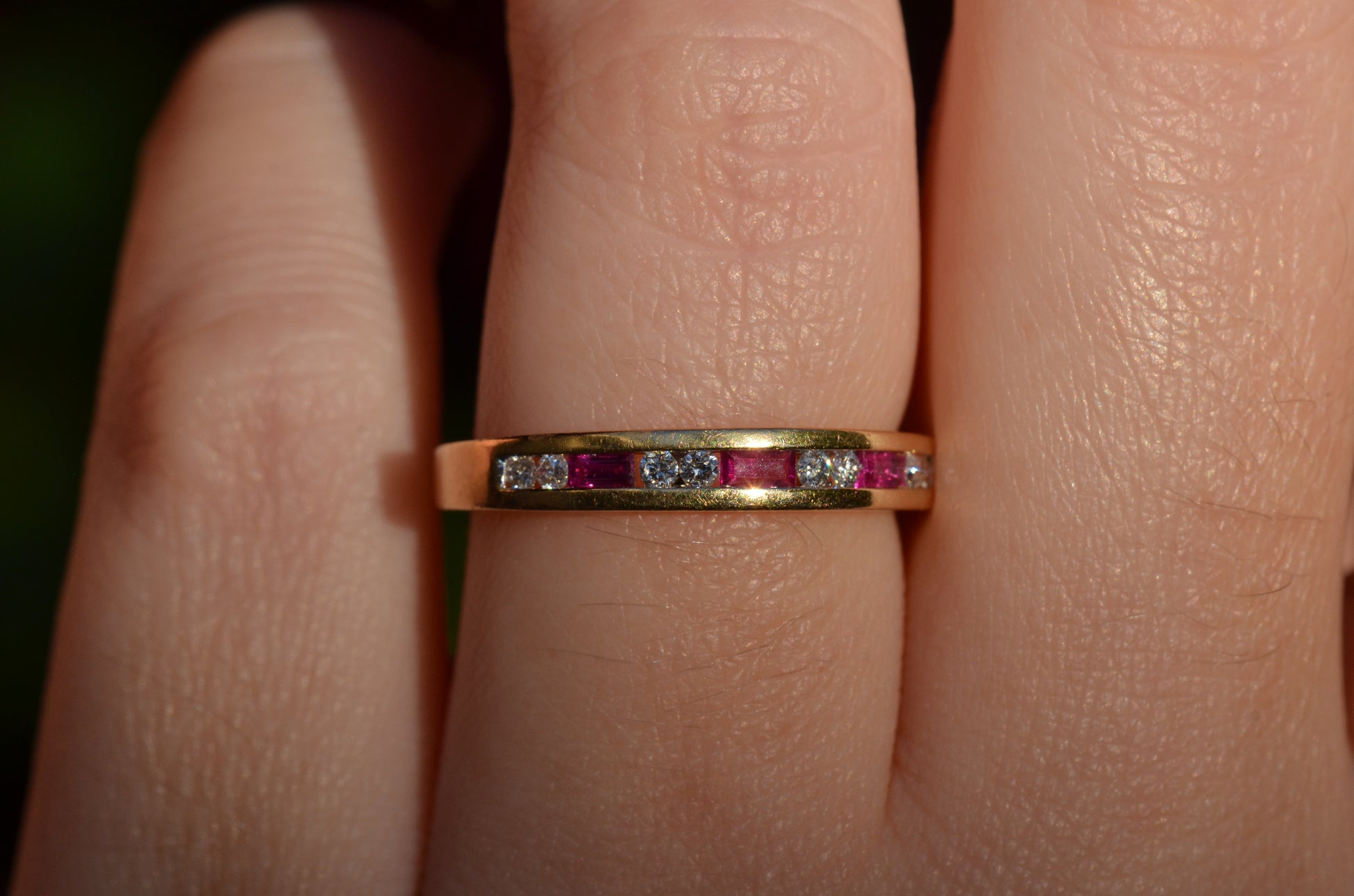 Bright and lovely, this gorgeous ring features alternating diamonds and rubies dazzling in a substantial channel setting. Easy to wear and stack, and a great way to add a pop of colour to your jewelry wardrobe.