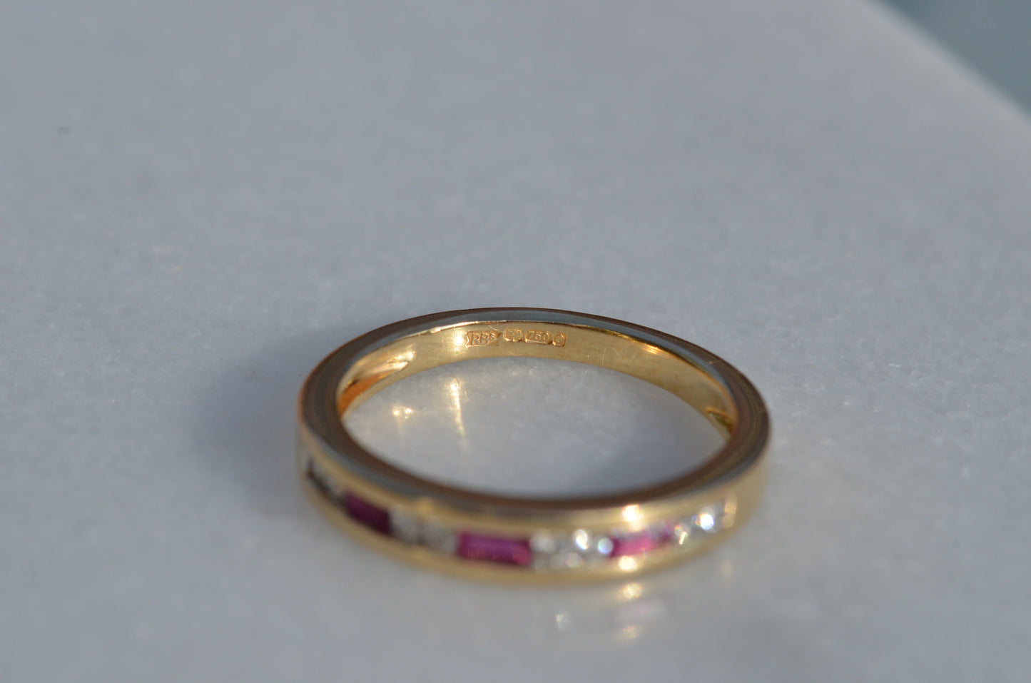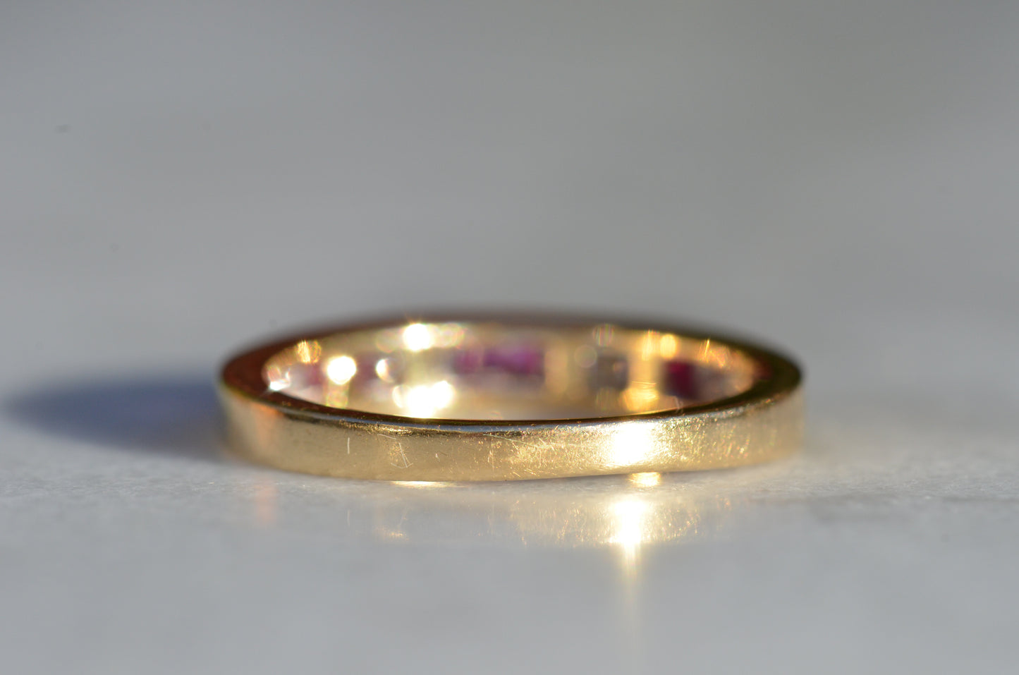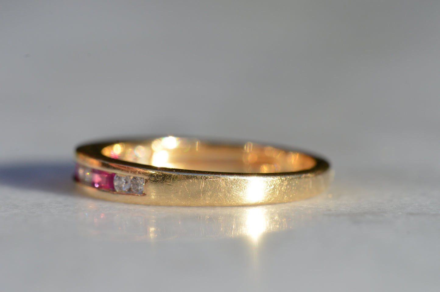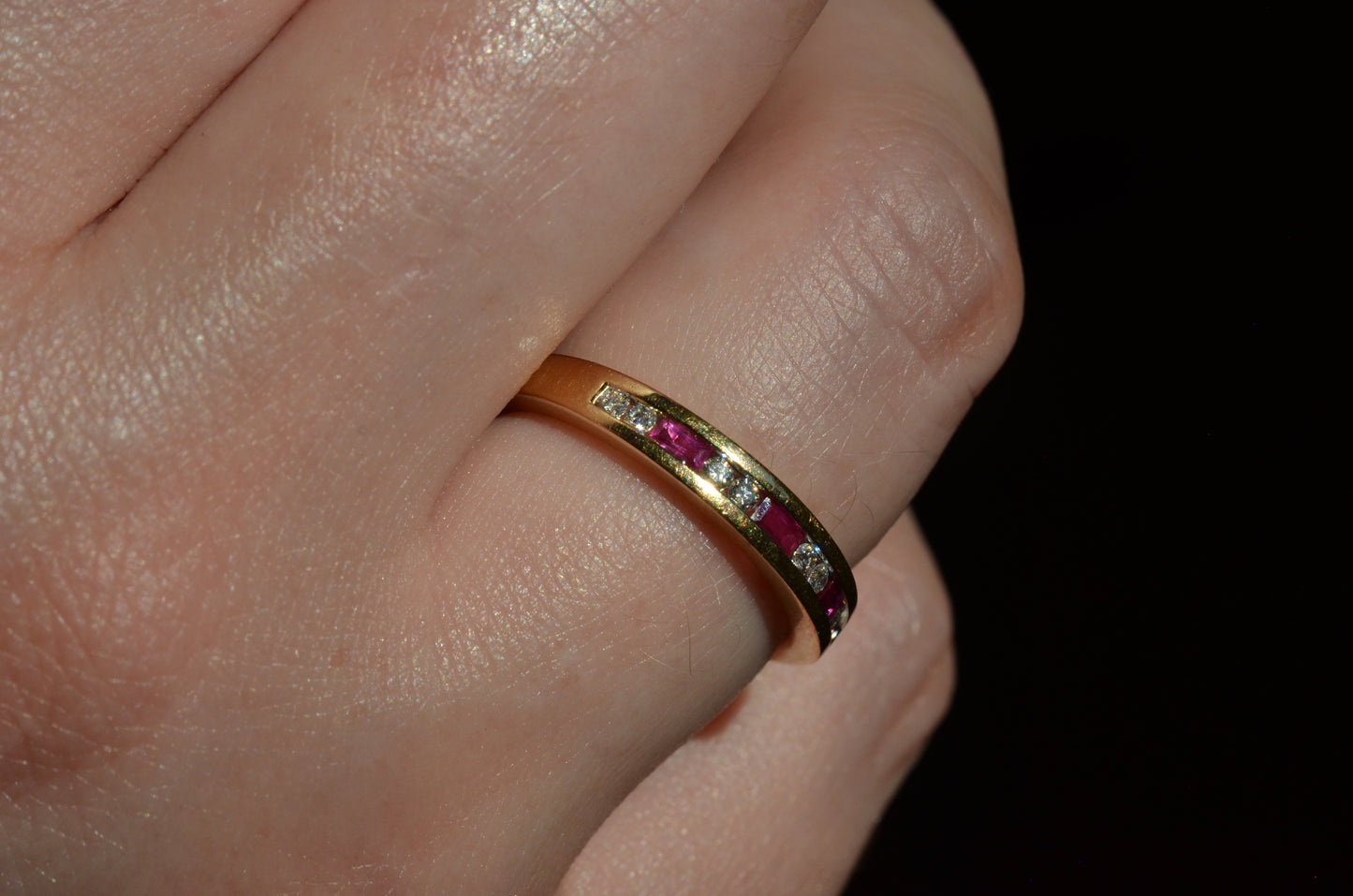 Bright and lovely, this gorgeous ring features alternating diamonds and rubies dazzling in a substantial channel setting. Easy to wear and stack, and a great way to add a pop of colour to your jewelry wardrobe.