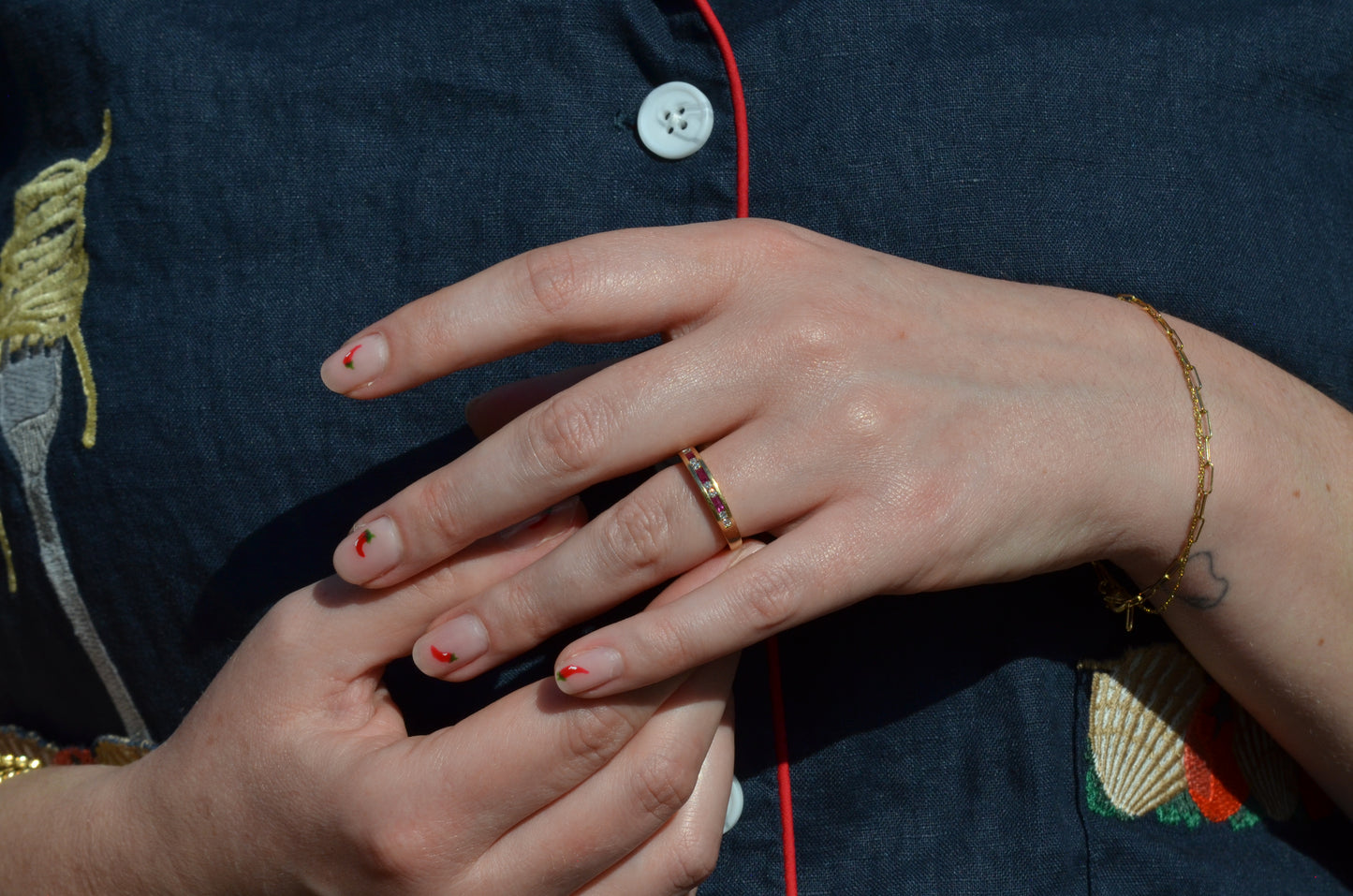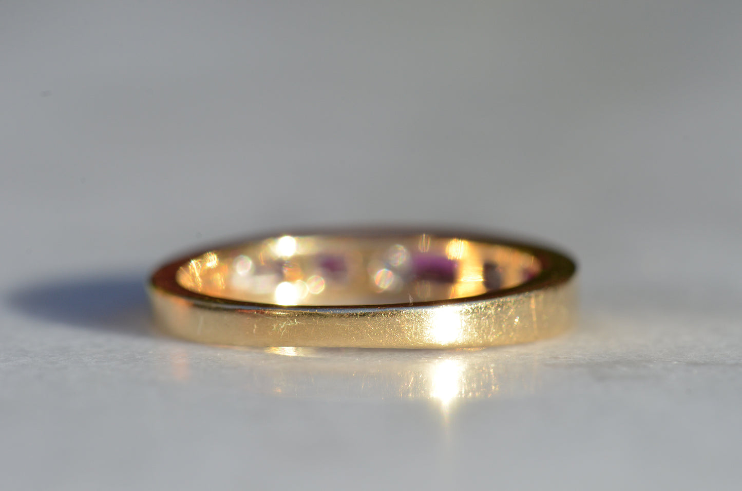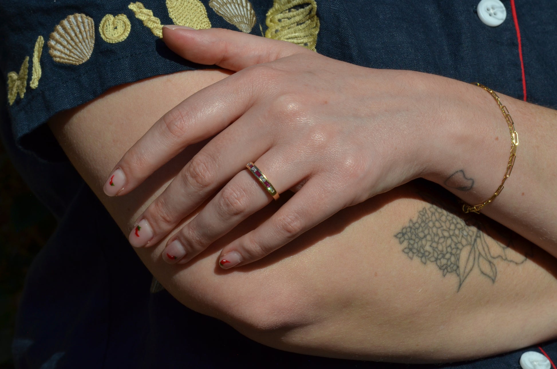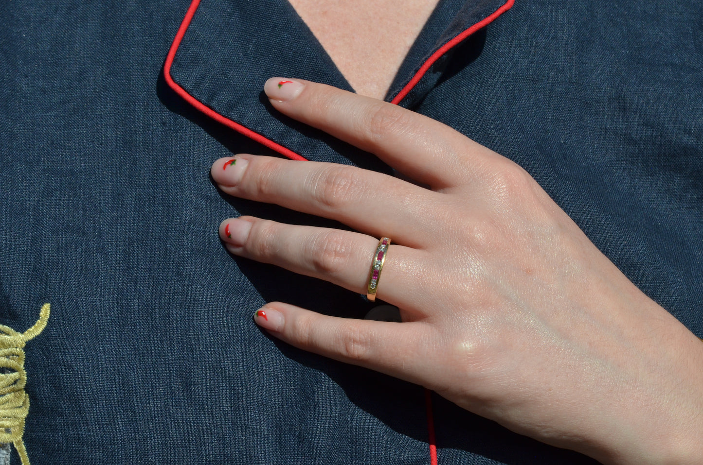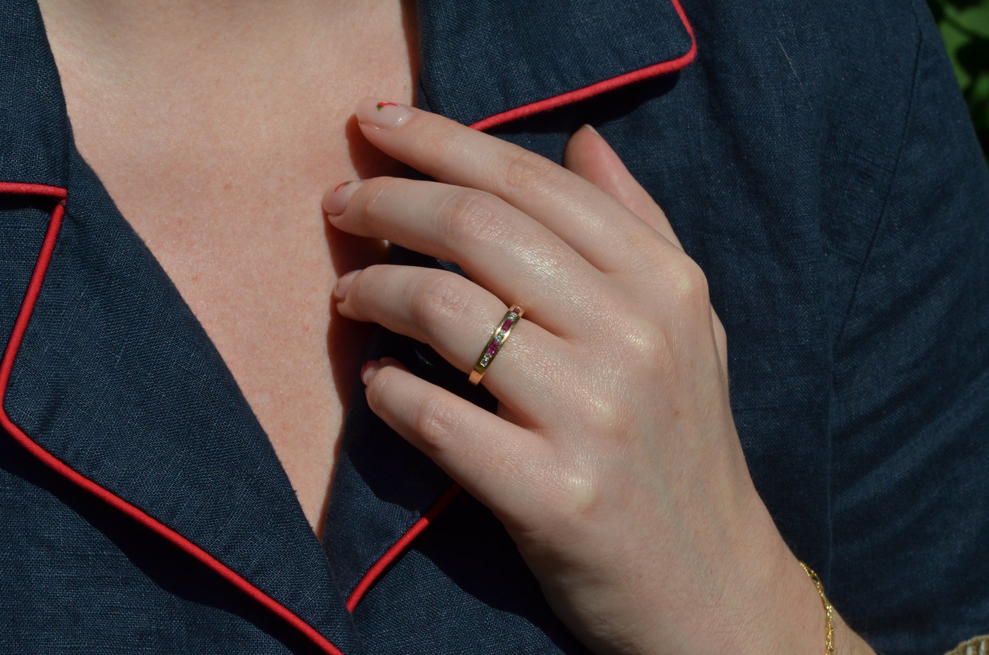 Bright and lovely, this gorgeous ring features alternating diamonds and rubies dazzling in a substantial channel setting. Easy to wear and stack, and a great way to add a pop of colour to your jewelry wardrobe.
