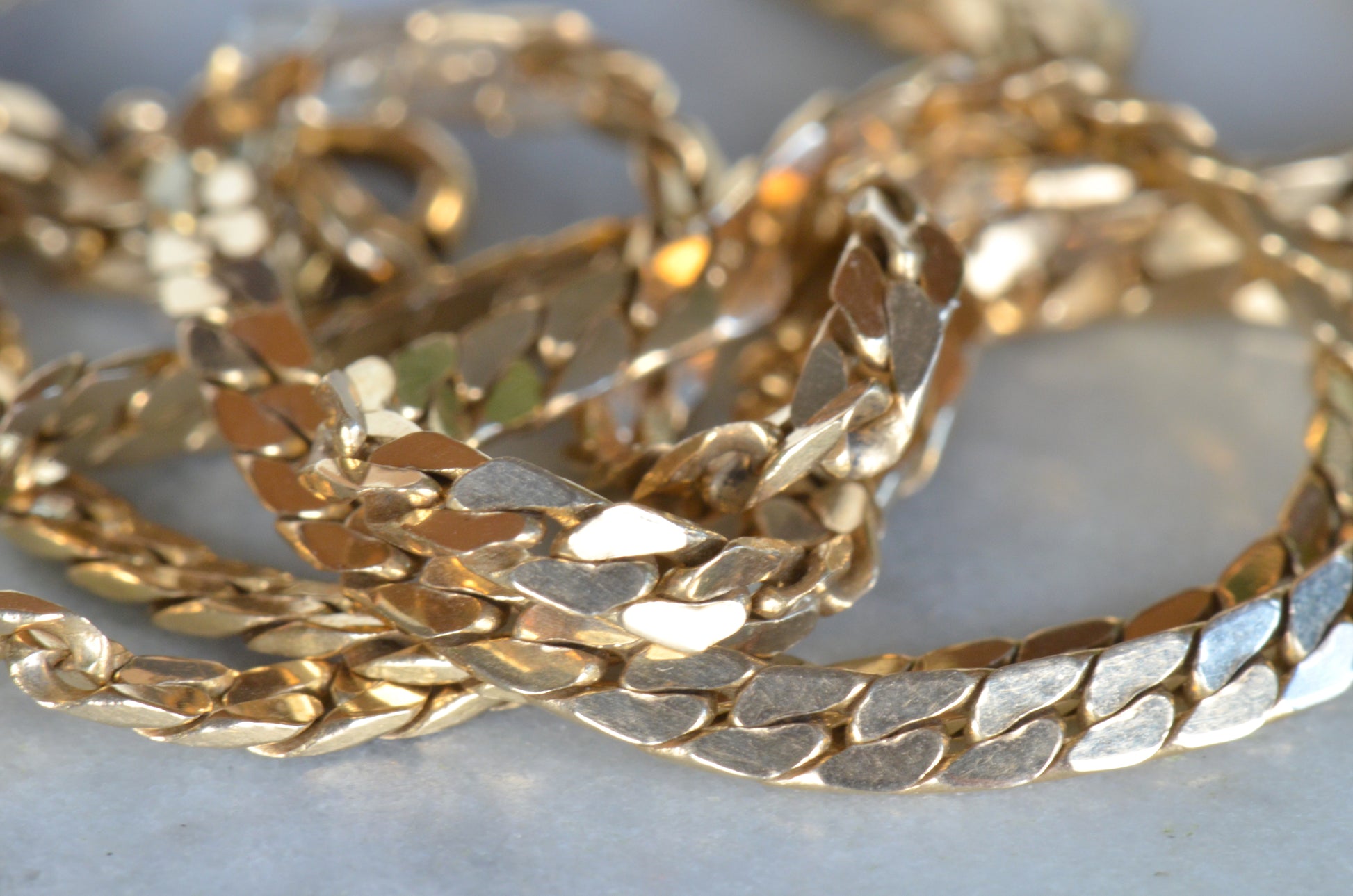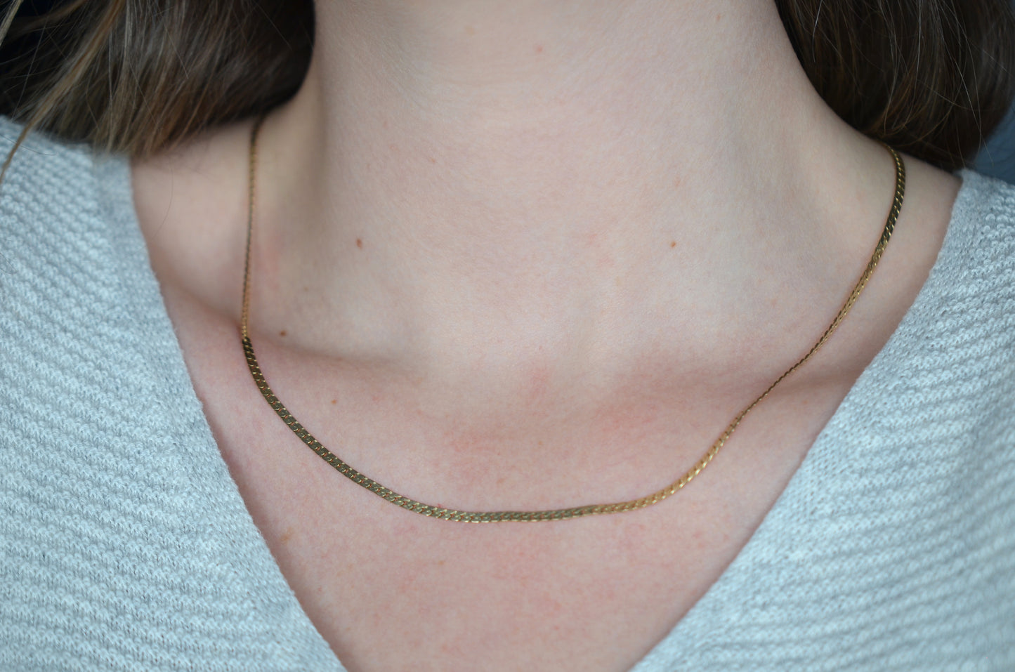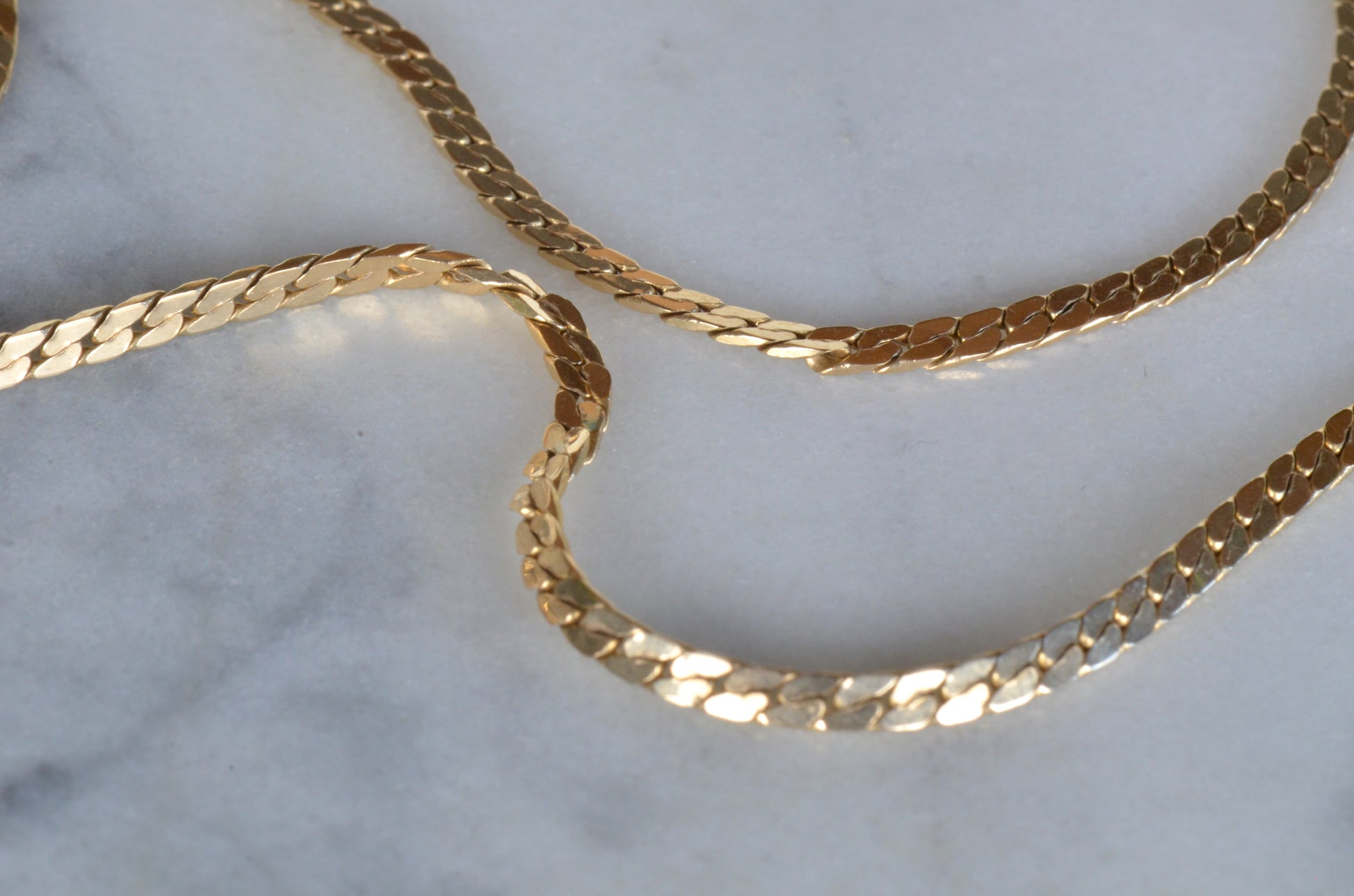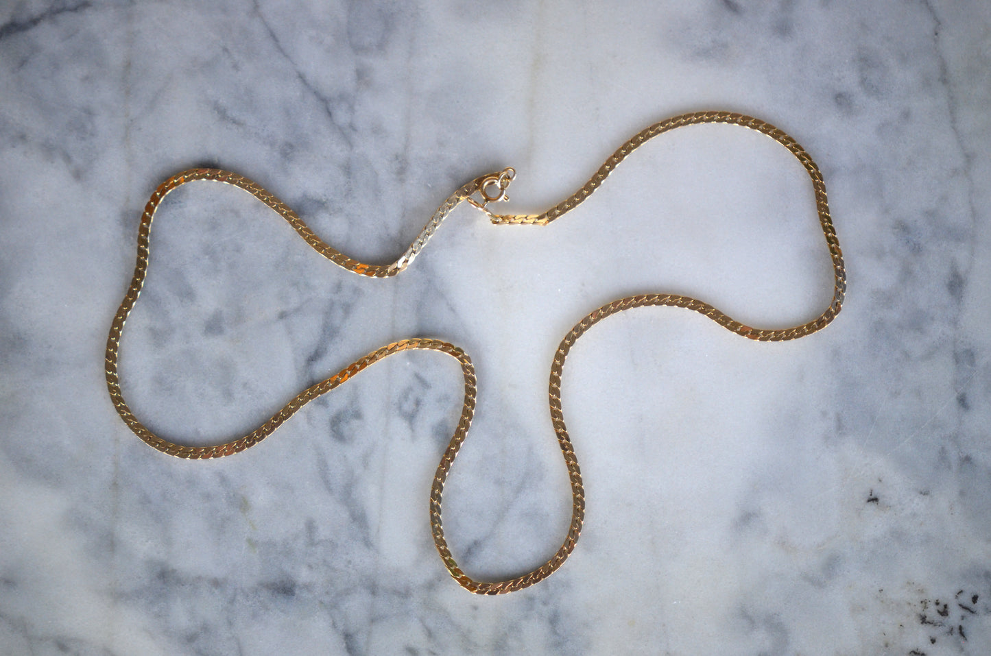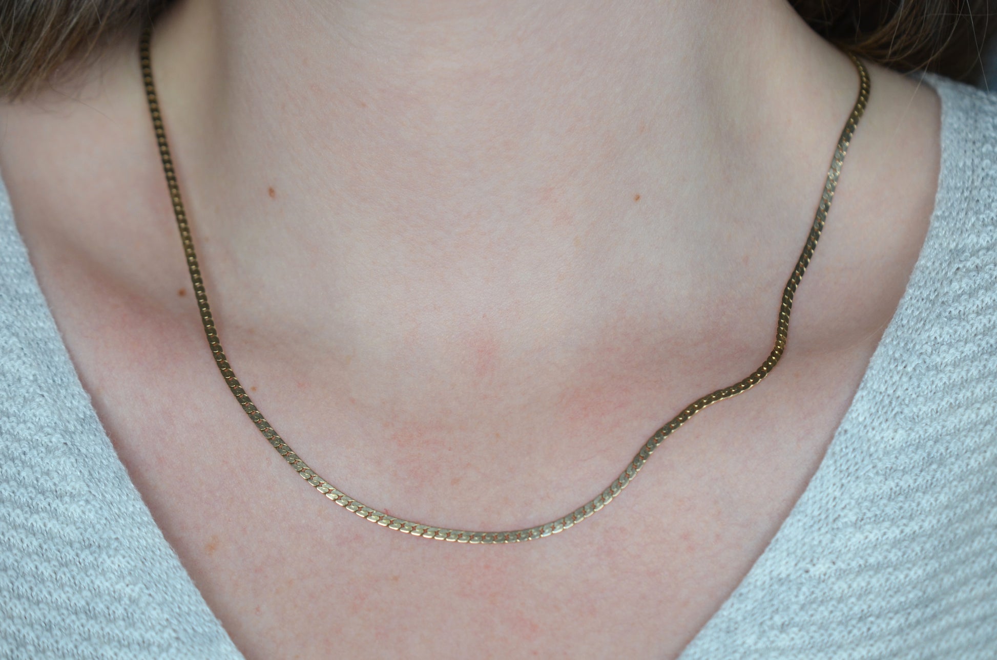 Sleek and slinky, this slim flat chain is so smooth on the neck and reflects the light beautifully off its softly worn faces. A hybrid style between a herringbone and a cuban link, the flat surfaces shine while a little negative space adds depth and interest. A perfect way to elevate your look, whether wearing the chain alone or in a stack. While we don't recommend wearing charms along flat chains (as the weight can bend the links, creating a kink that can't be smoothed out), we promise you'll love this piece as is.