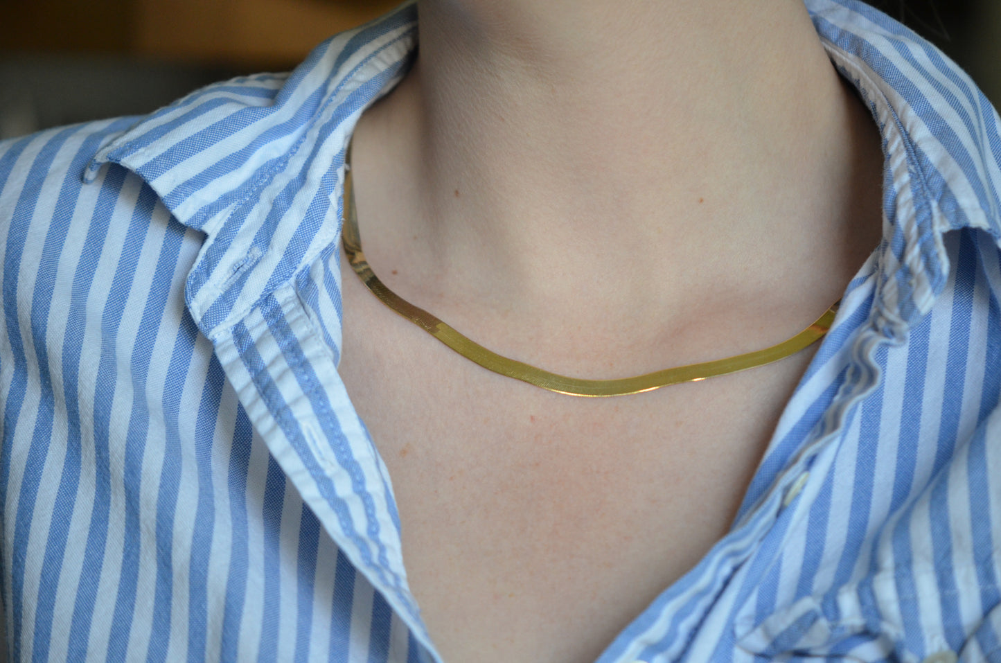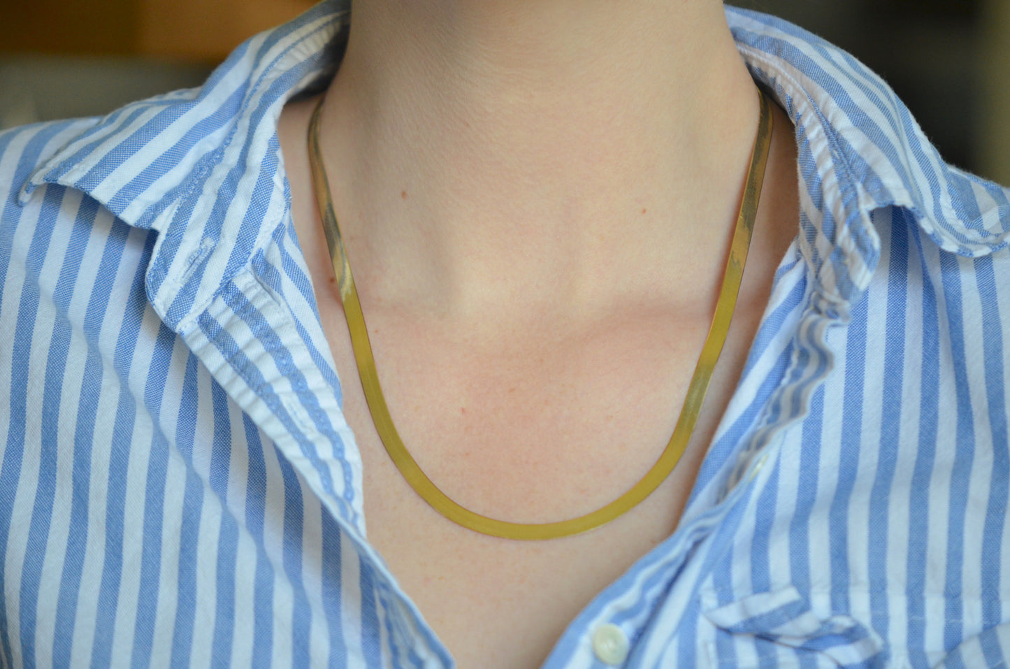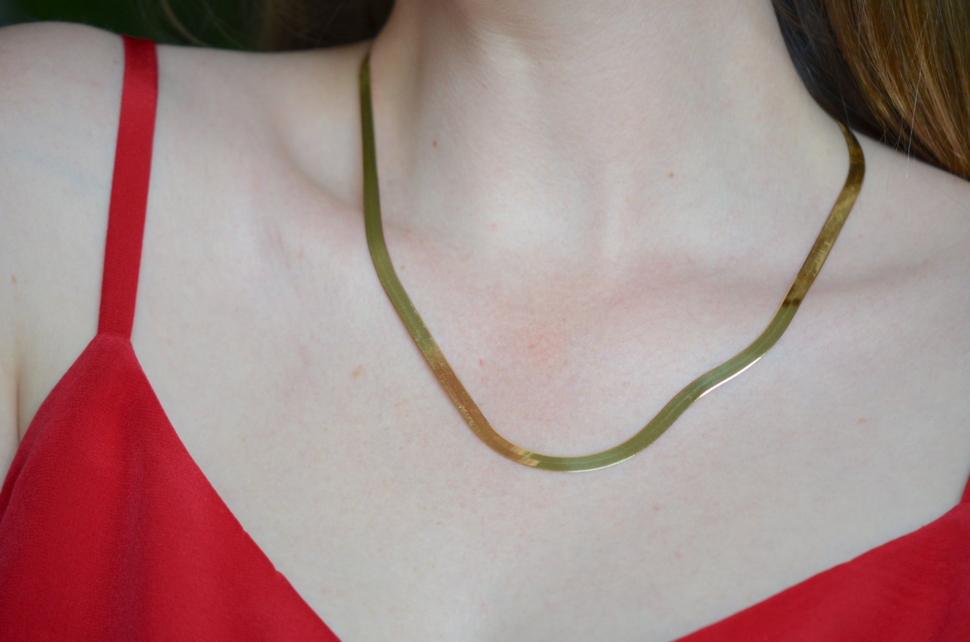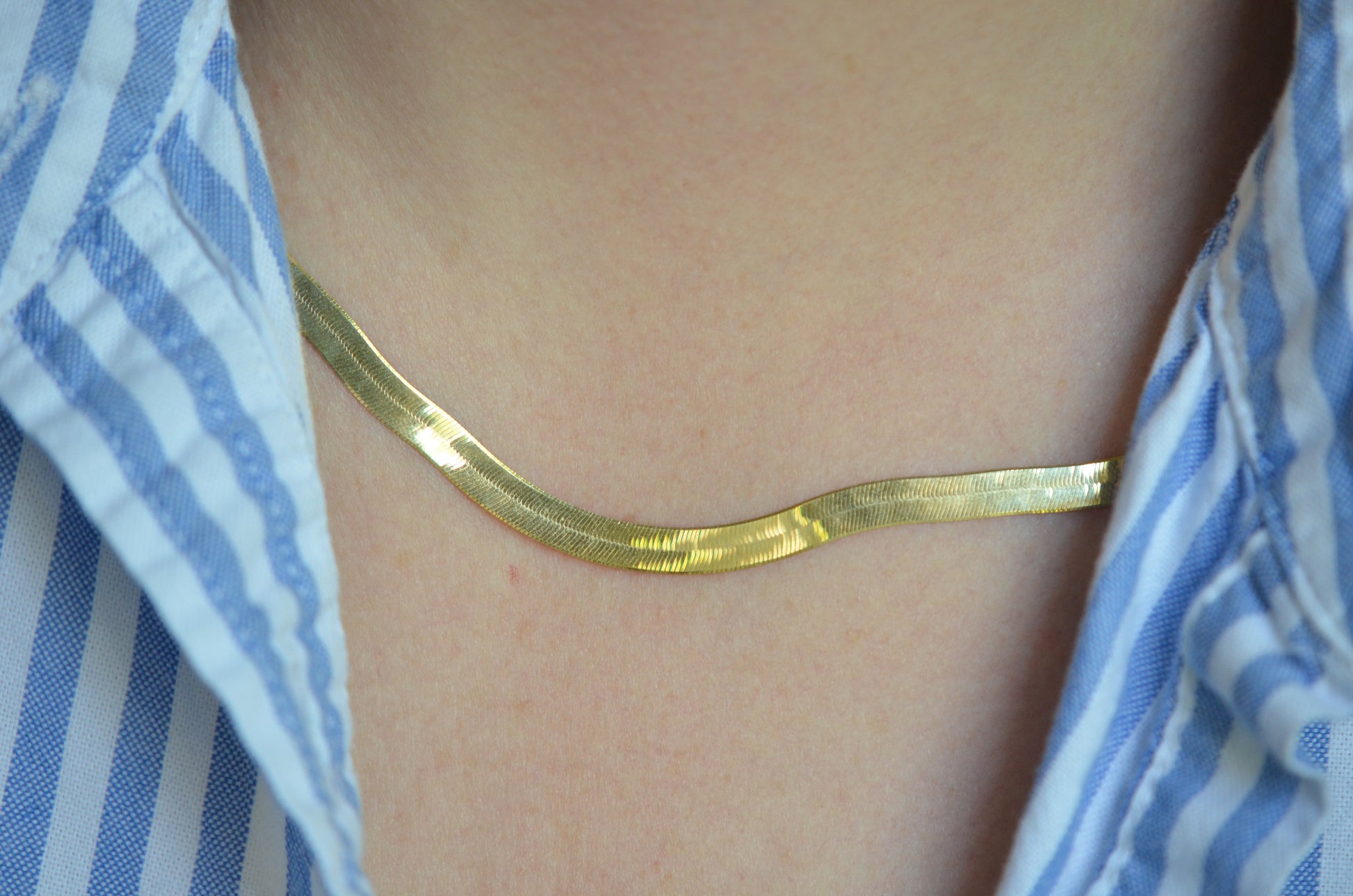 We are completely in love with this sexy, slinky, gold chain! The herringbone chain has been through something of an evolution over its time, from wide blocky individual links to a tight zipper-like style. This version sits somewhere in the middle, with noticeable individual links coming together in a broad, flat style. The sinuous movement of each link means that the drape is just right - falling along your neck like liquid gold. Though 20" long, the chain tends to settle a little rounder and as such a little higher on the neck as it moves about through the day.