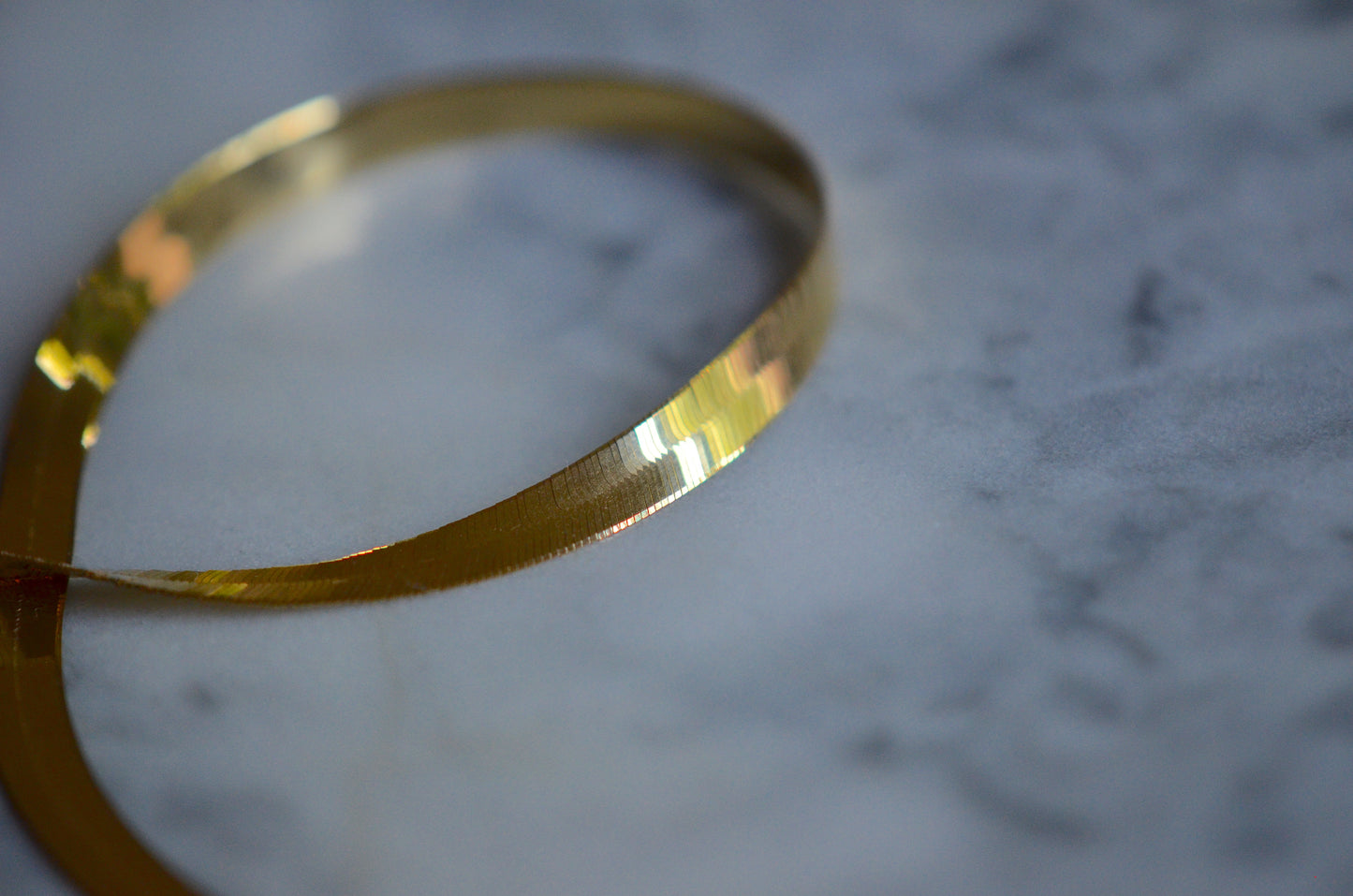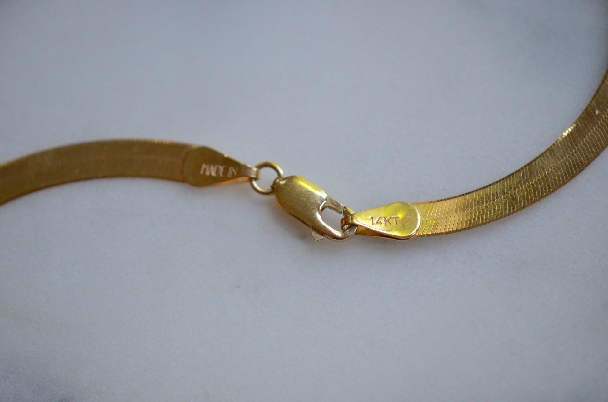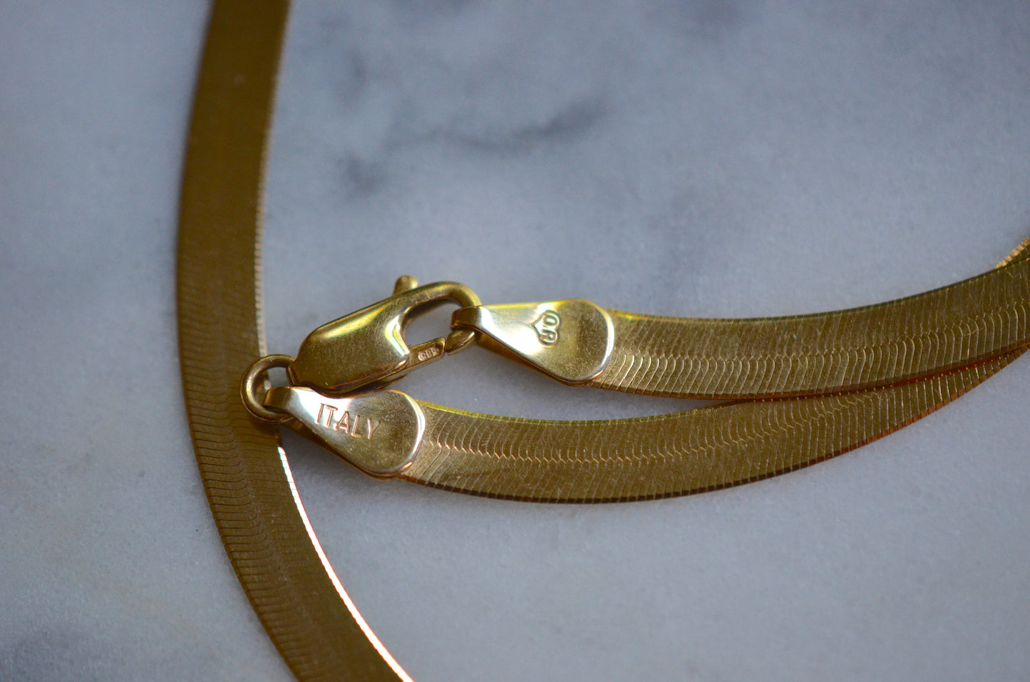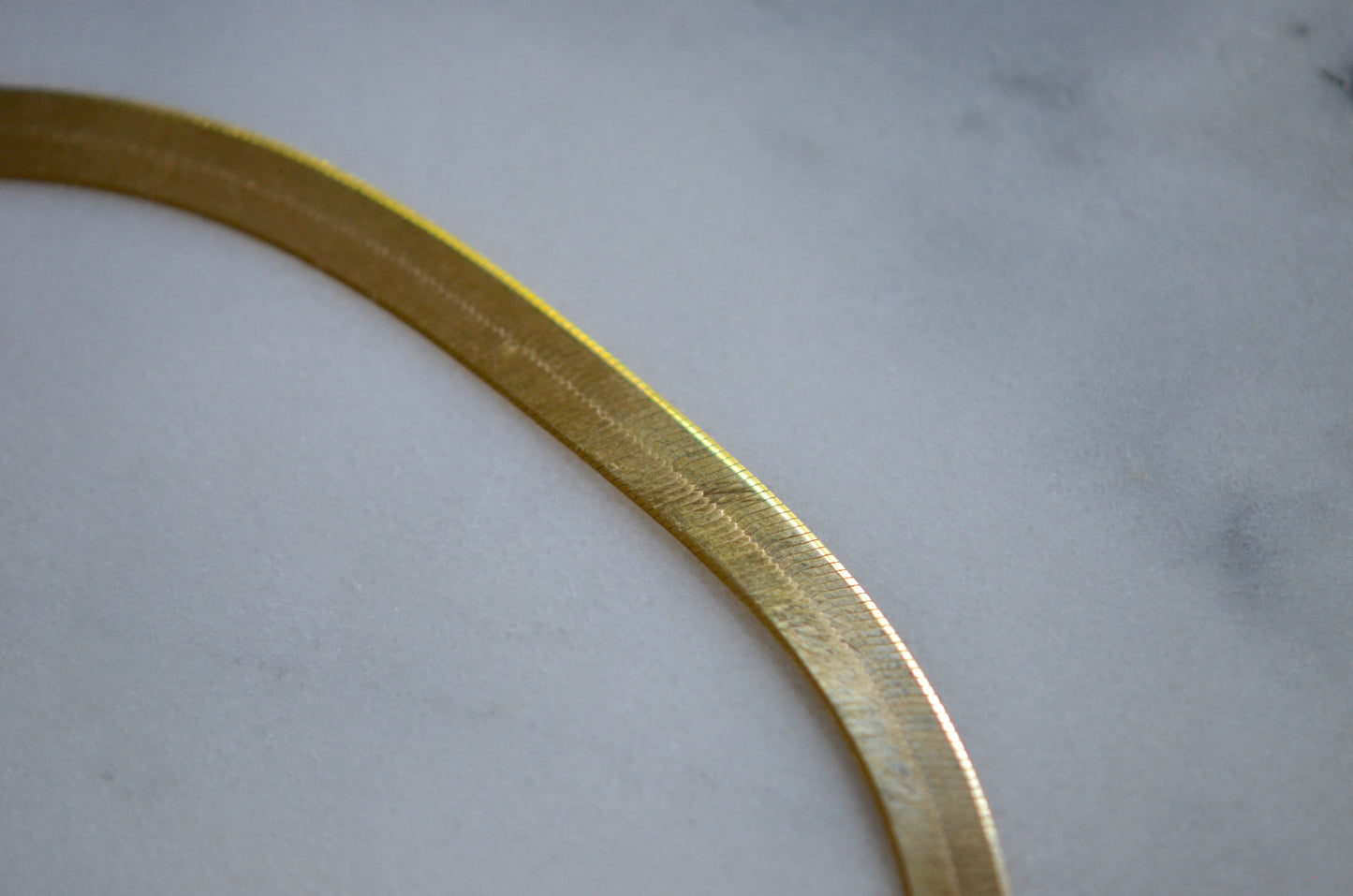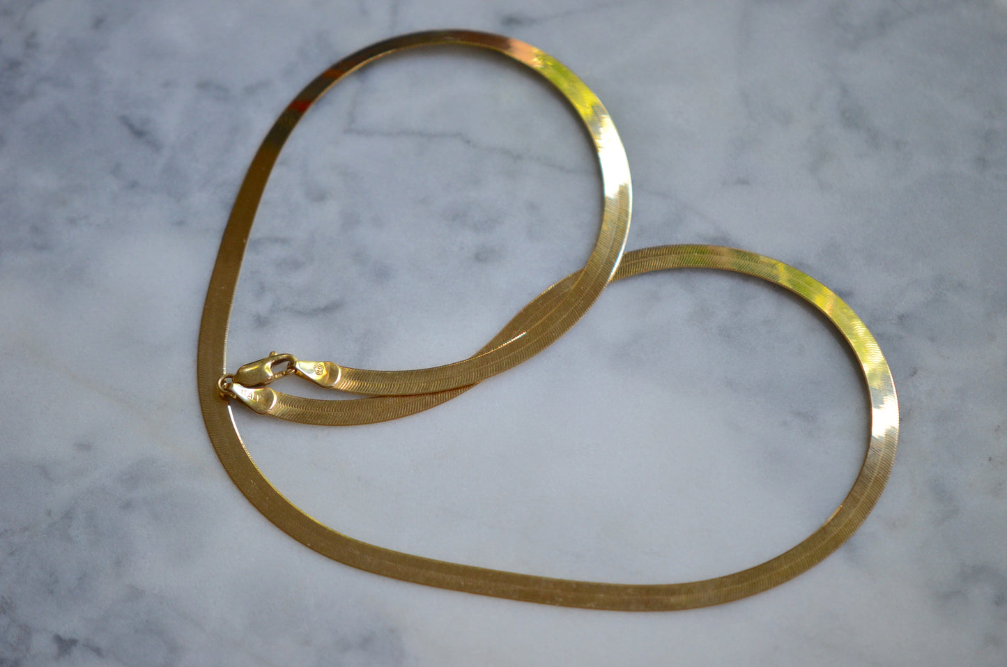 Vintage and estate herringbone chains can be difficult to find, as they were the bane of jewellers' existence - without proper care, the links could become bent and "kinked," at which point the shape couldn't be seamlessly repaired, so many were sent to melt. This beautiful specimen is in perfect, smooth condition, and will remain that way with a little TLC: be sure you're not hanging pendants from flat chains, nor sleeping (or for that matter, showering/swimming/working out) in them, and when you're not wearing them always carefully lay them flat rather than tossing them in your jewelry box.