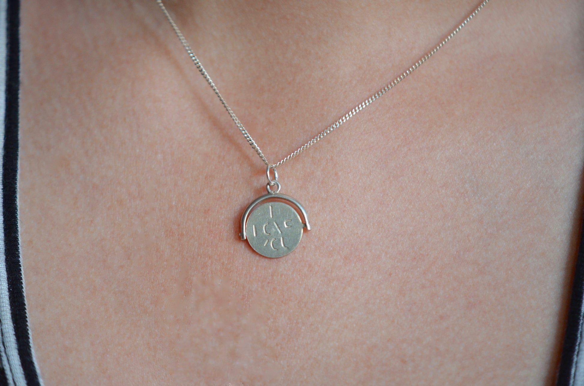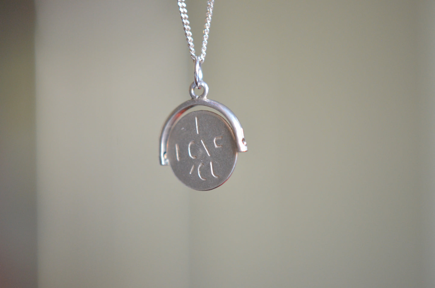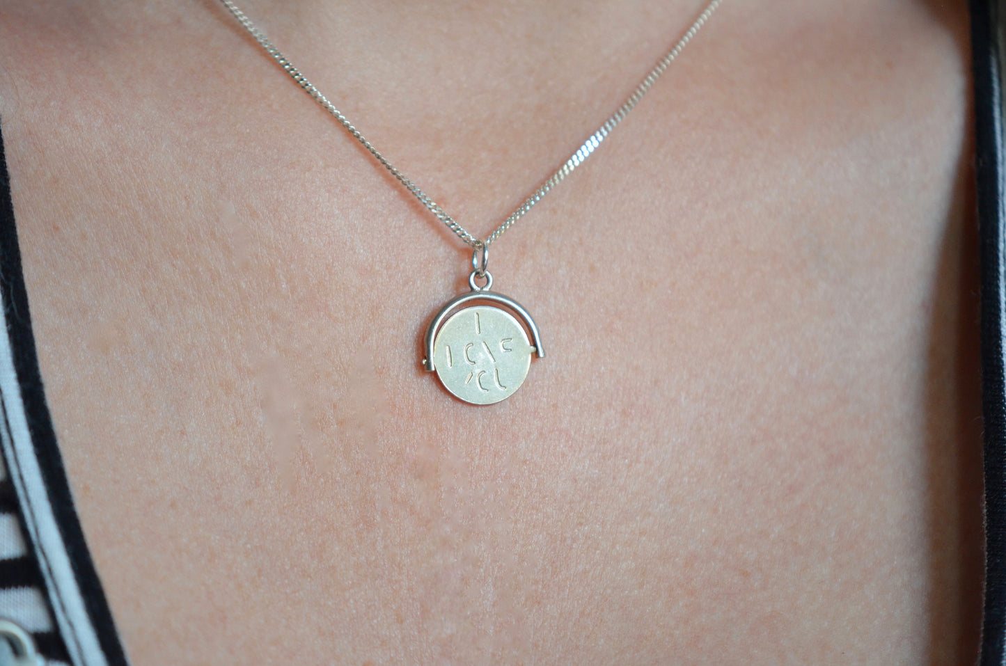 Straight from the mid-century charm craze, these delightful pieces can be added to your own charm bracelet or necklace, or worn alone on a chain to give them all the focus. Each side of the disc bears only a portion of each letter, creating a secret message that is only revealed when the disc is spun and in motion.