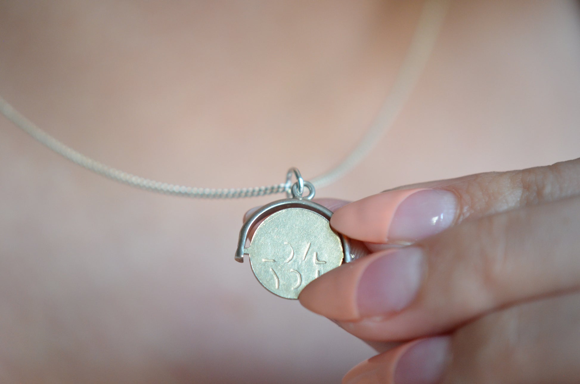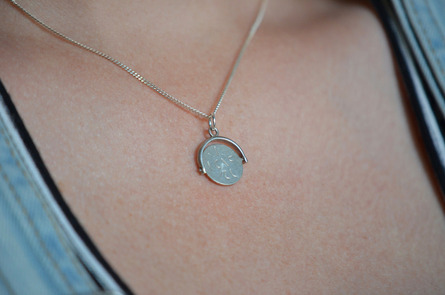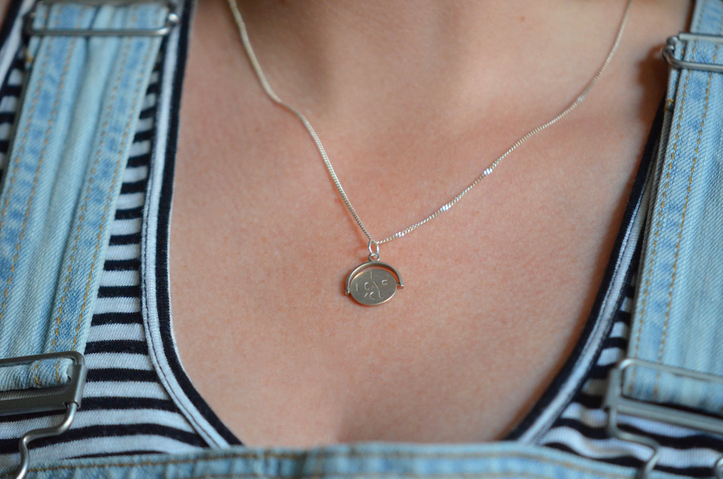 Straight from the mid-century charm craze, these delightful pieces can be added to your own charm bracelet or necklace, or worn alone on a chain to give them all the focus. Each side of the disc bears only a portion of each letter, creating a secret message that is only revealed when the disc is spun and in motion.