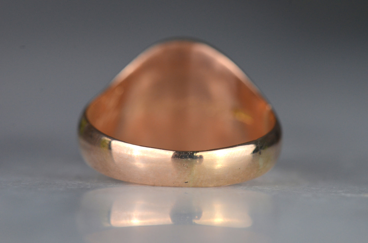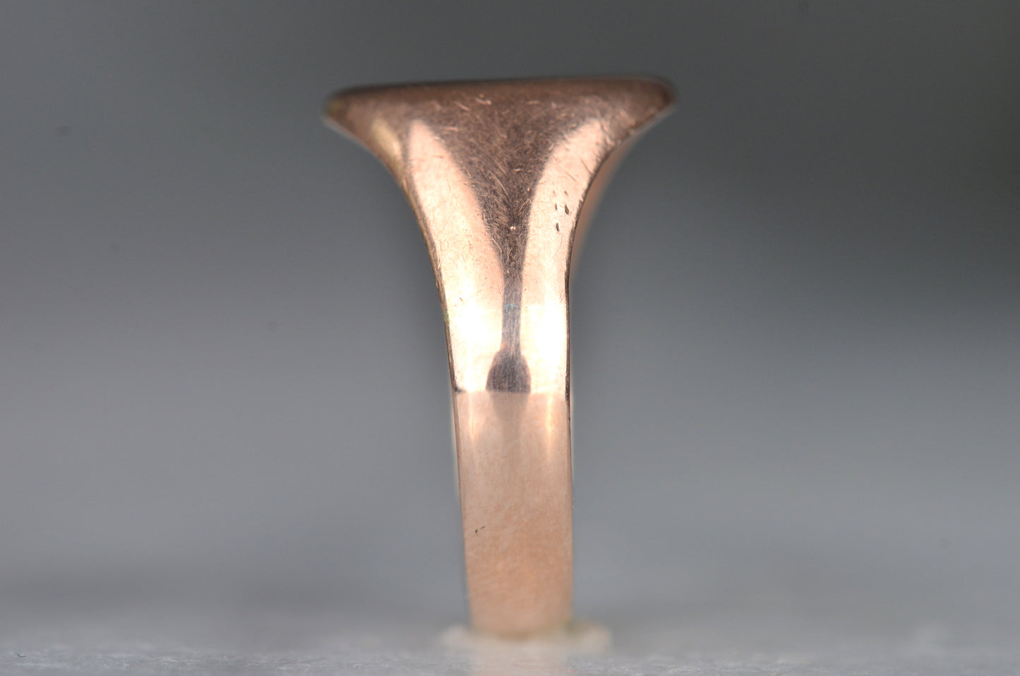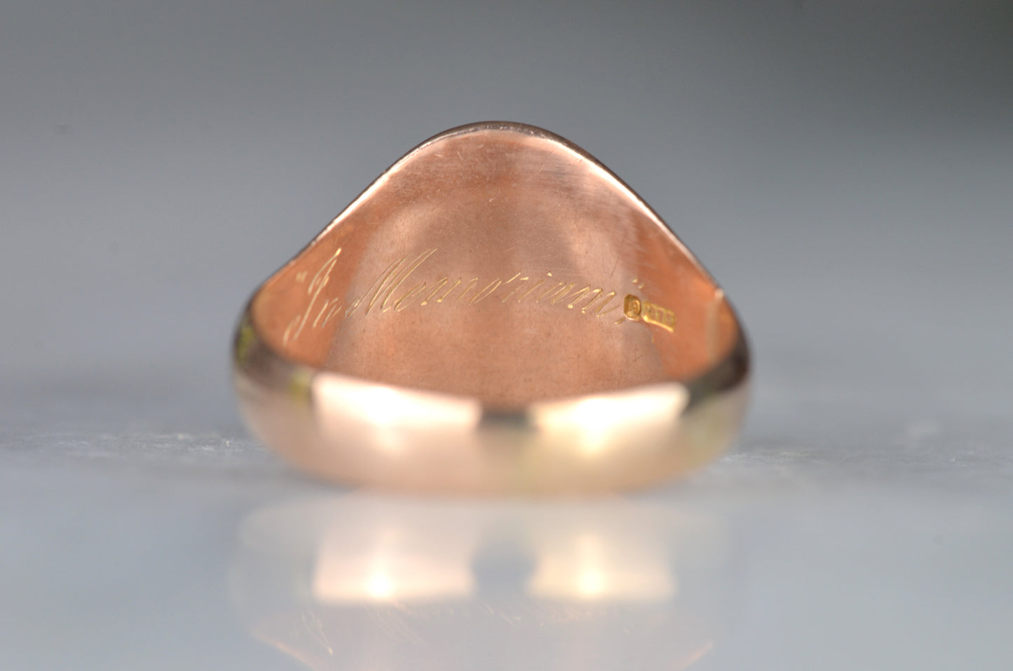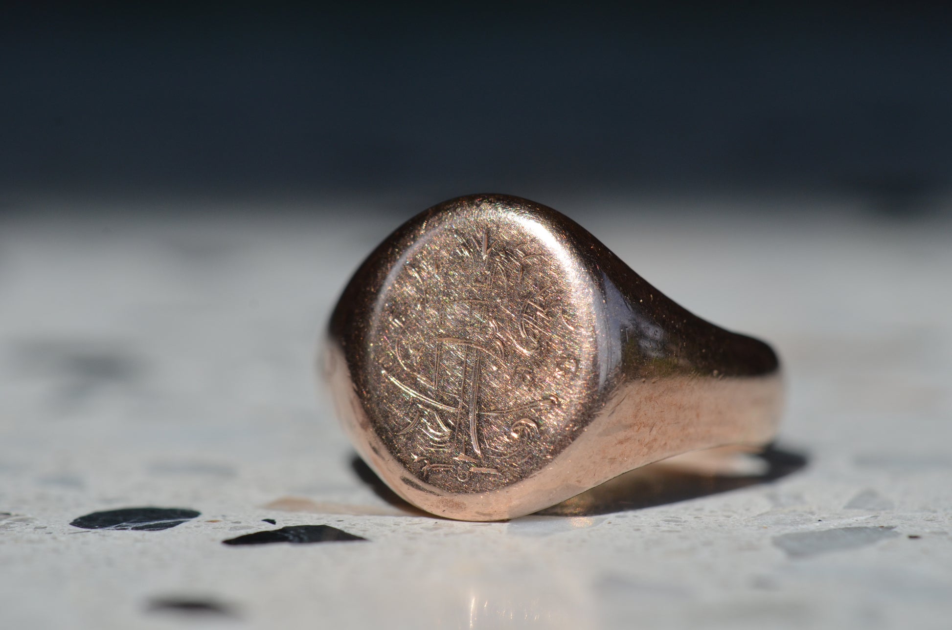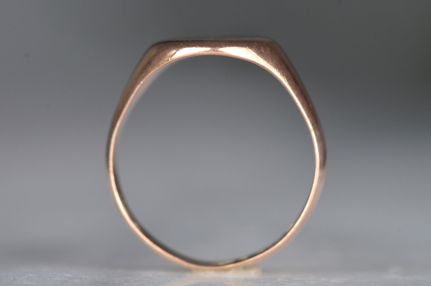 A warm and smooth oval ring, this piece is like a hug for your finger. There's something about a signet ring worn smooth like this that always tugs on our heart strings: the love that a previous caretaker had for this ring is evident in its wear, in the way that day to day life has left a beautiful smooth patina and just a suggestion of the letters that were once so carefully engraved. Tucked sweetly under the face and pressed snug against your skin is a hand engraved note, "In Memoriam." While mourning jewelry goes back to at least the middle ages, it was further popularized (like so many things) by Queen Victoria, who, upon Prince Albert's death in 1861, committed to a deep and public grief for the forty years she outlived him. Victorian motifs in mourning included materials such as hair (woven or painted in sepia), enamel (often black or white), and seed pearls (to represent tears), and symbolism including willows, crosses, ouroboros, and urns. Though none of these are present here, the personalization makes a subtle tribute to someone deeply loved and sadly lost.