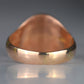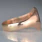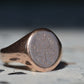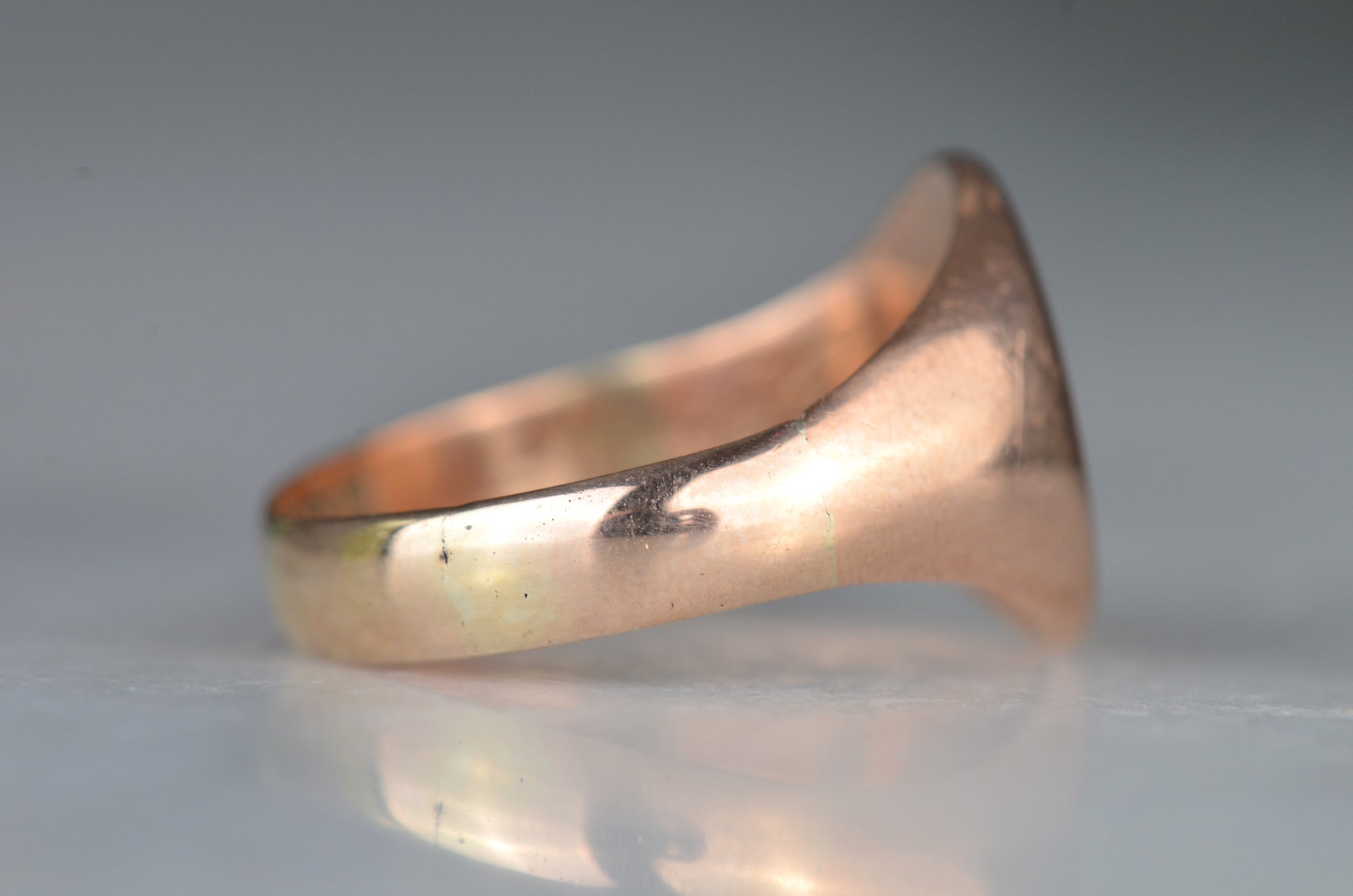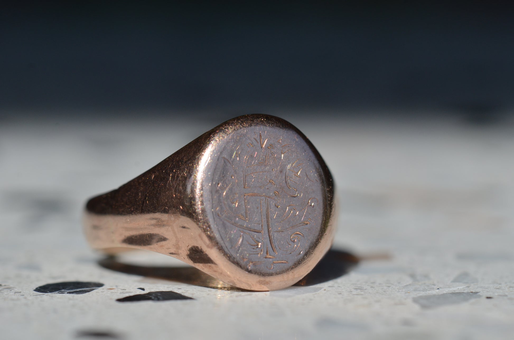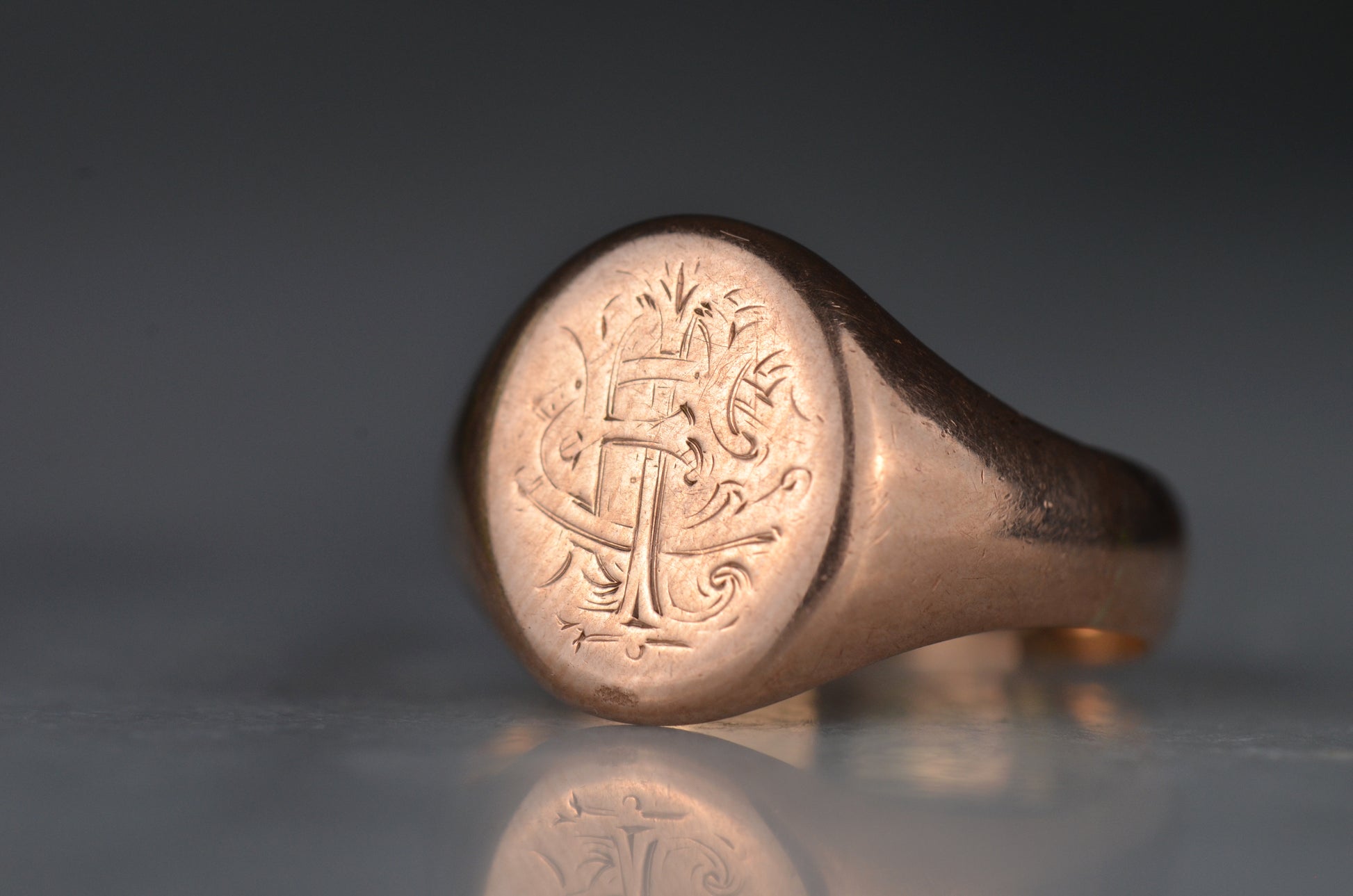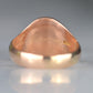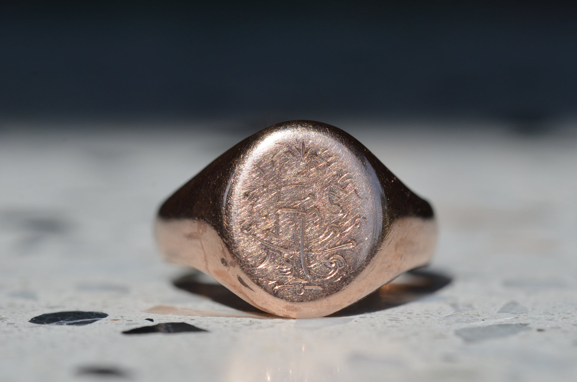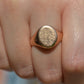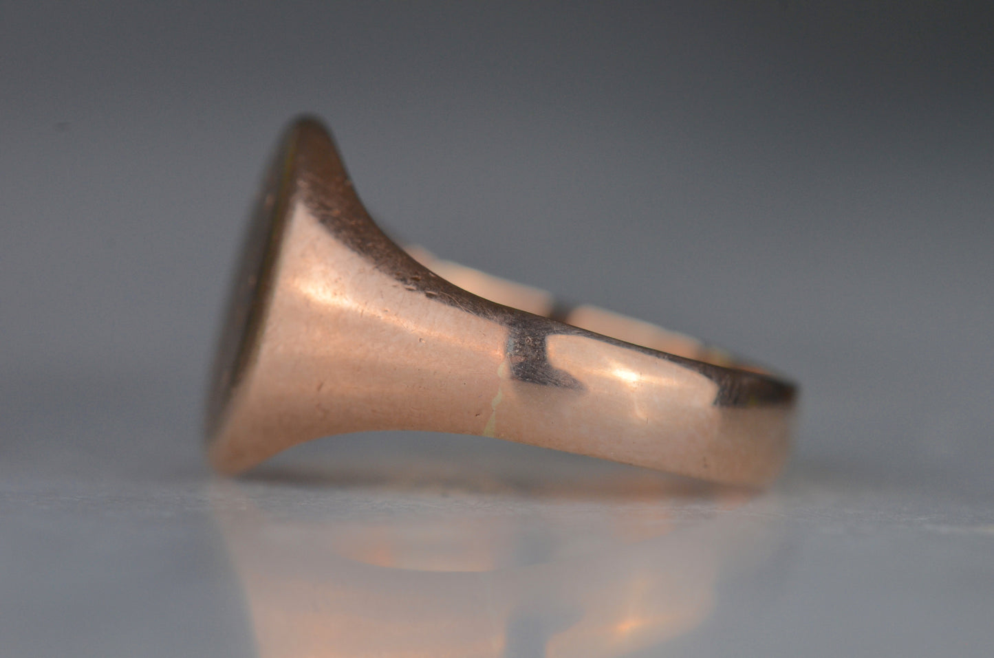 A warm and smooth oval ring, this piece is like a hug for your finger. There's something about a signet ring worn smooth like this that always tugs on our heart strings: the love that a previous caretaker had for this ring is evident in its wear, in the way that day to day life has left a beautiful smooth patina and just a suggestion of the letters that were once so carefully engraved. Tucked sweetly under the face and pressed snug against your skin is a hand engraved note, "In Memoriam." While mourning jewelry goes back to at least the middle ages, it was further popularized (like so many things) by Queen Victoria, who, upon Prince Albert's death in 1861, committed to a deep and public grief for the forty years she outlived him. Victorian motifs in mourning included materials such as hair (woven or painted in sepia), enamel (often black or white), and seed pearls (to represent tears), and symbolism including willows, crosses, ouroboros, and urns. Though none of these are present here, the personalization makes a subtle tribute to someone deeply loved and sadly lost.