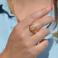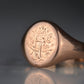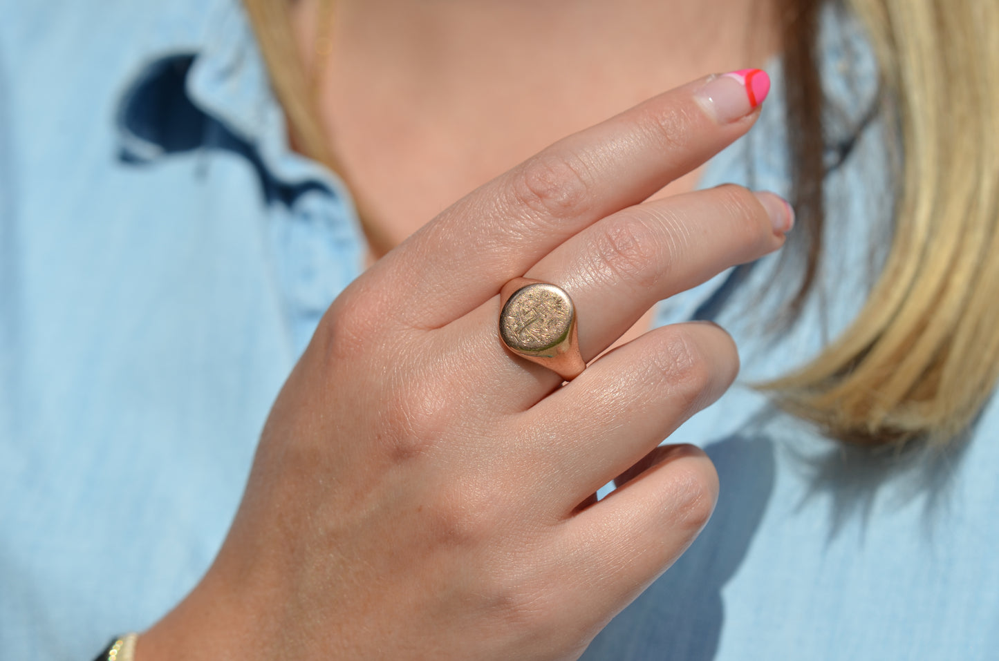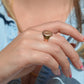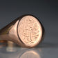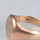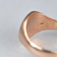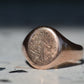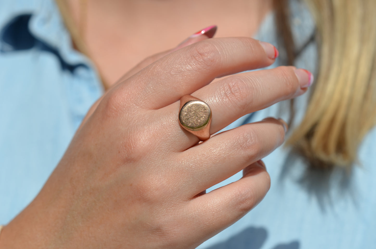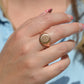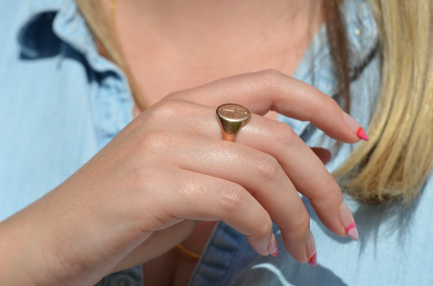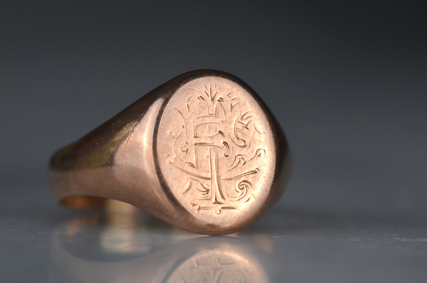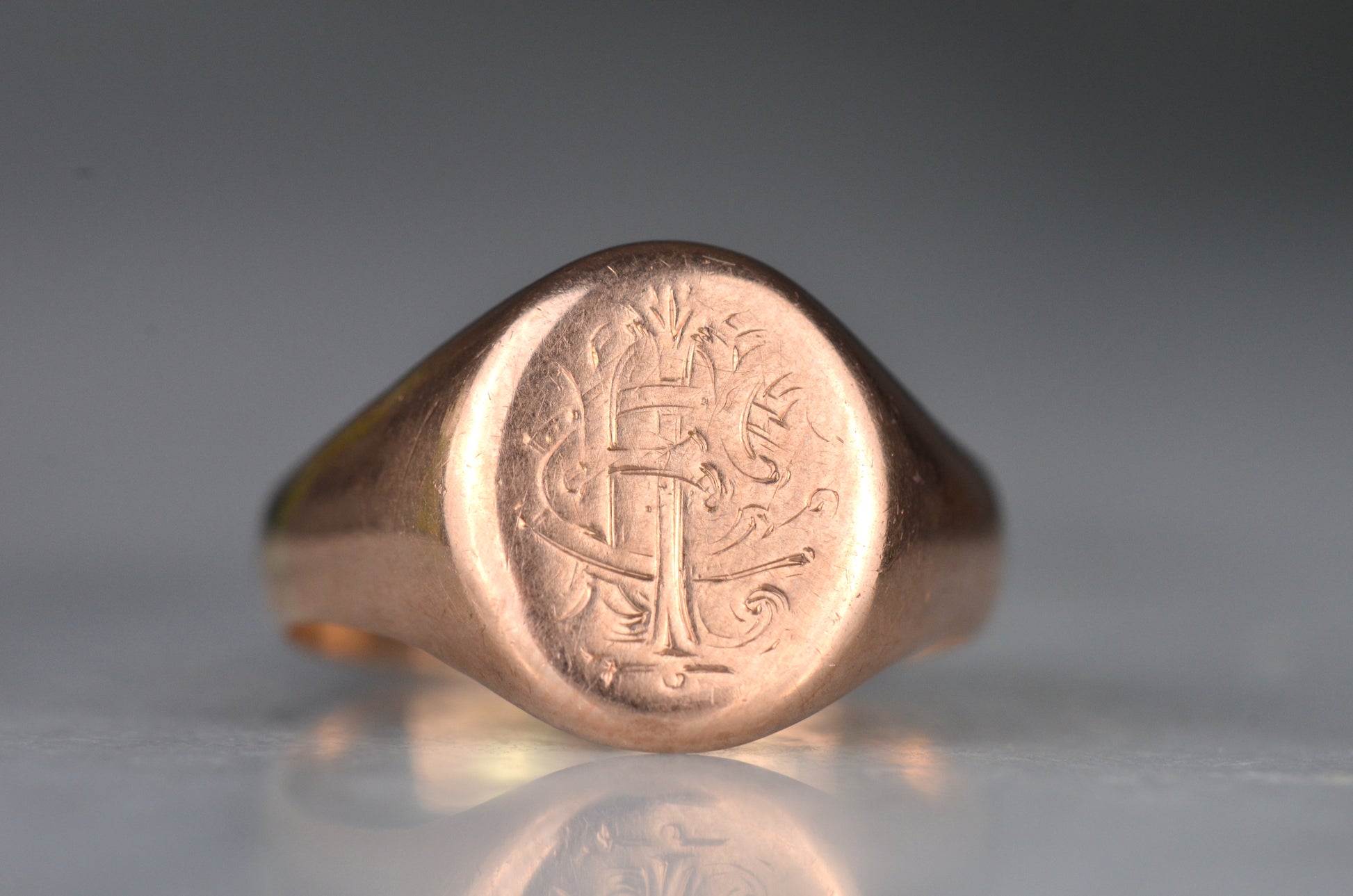 A warm and smooth oval ring, this piece is like a hug for your finger. There's something about a signet ring worn smooth like this that always tugs on our heart strings: the love that a previous caretaker had for this ring is evident in its wear, in the way that day to day life has left a beautiful smooth patina and just a suggestion of the letters that were once so carefully engraved. Tucked sweetly under the face and pressed snug against your skin is a hand engraved note, "In Memoriam." While mourning jewelry goes back to at least the middle ages, it was further popularized (like so many things) by Queen Victoria, who, upon Prince Albert's death in 1861, committed to a deep and public grief for the forty years she outlived him. Victorian motifs in mourning included materials such as hair (woven or painted in sepia), enamel (often black or white), and seed pearls (to represent tears), and symbolism including willows, crosses, ouroboros, and urns. Though none of these are present here, the personalization makes a subtle tribute to someone deeply loved and sadly lost.