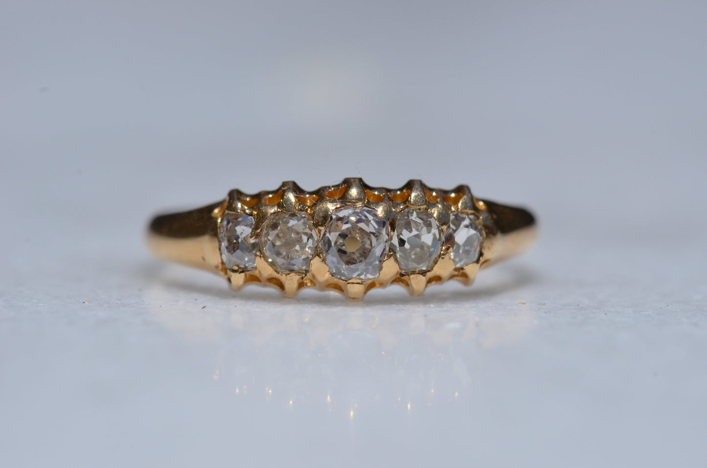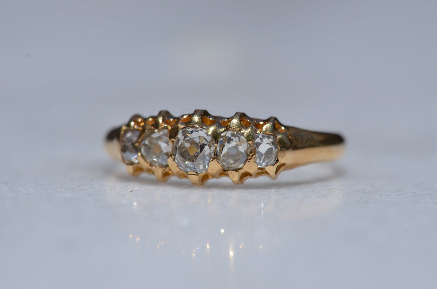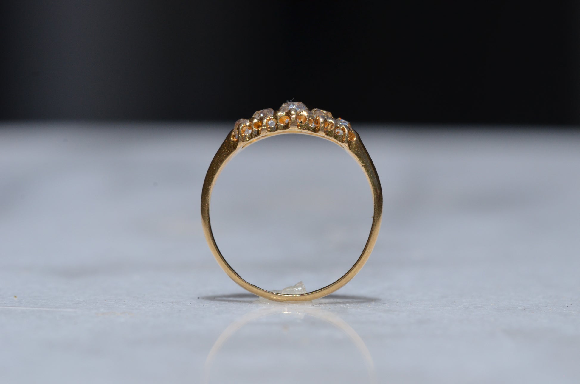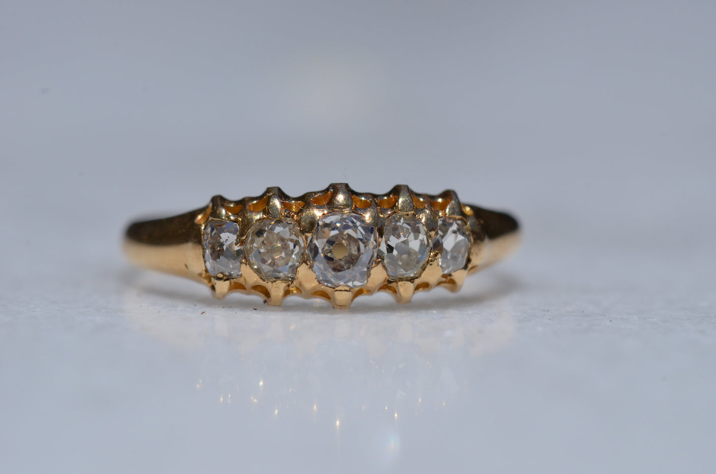 • Five old cut diamonds (outermost two slightly more elongated, inner three with a rounder profile) approximately 0.50ctw