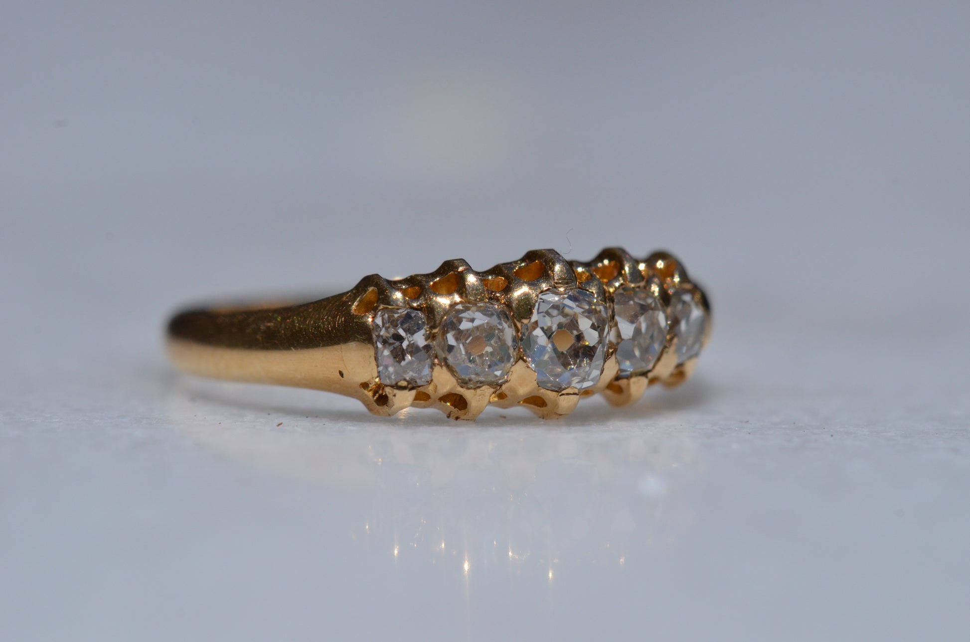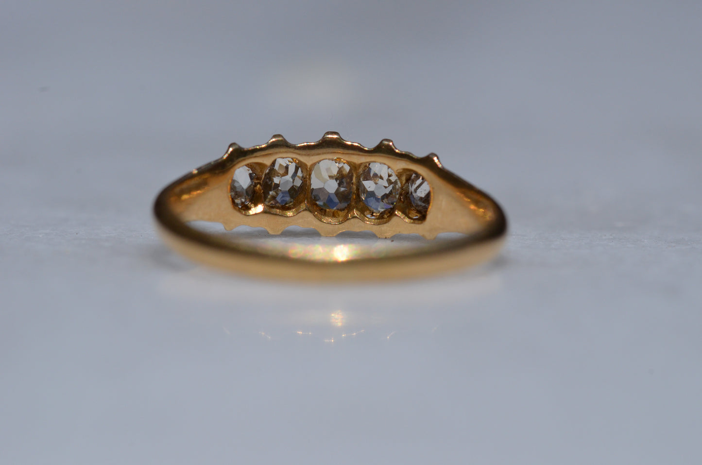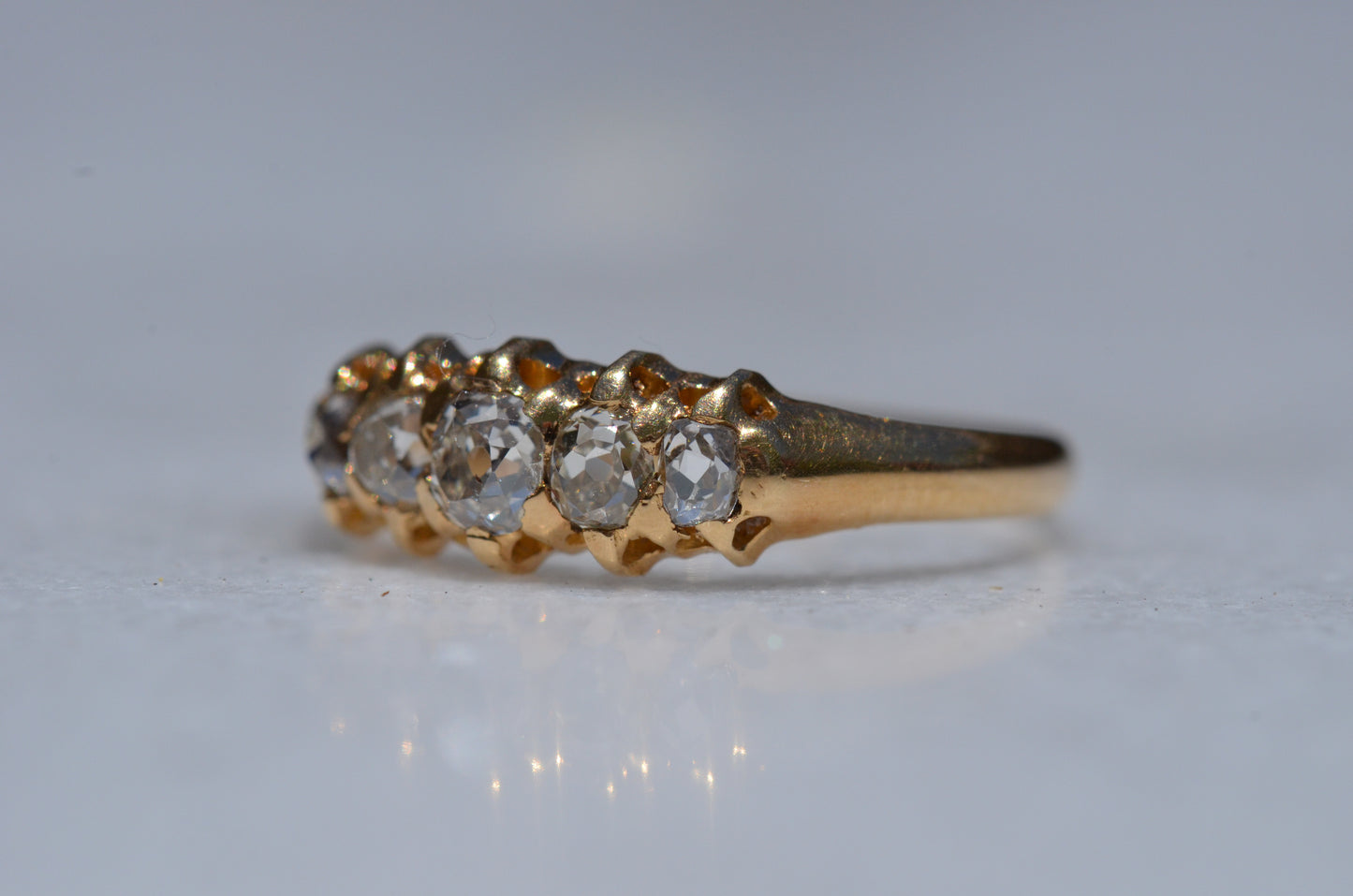 • Five old cut diamonds (outermost two slightly more elongated, inner three with a rounder profile) approximately 0.50ctw