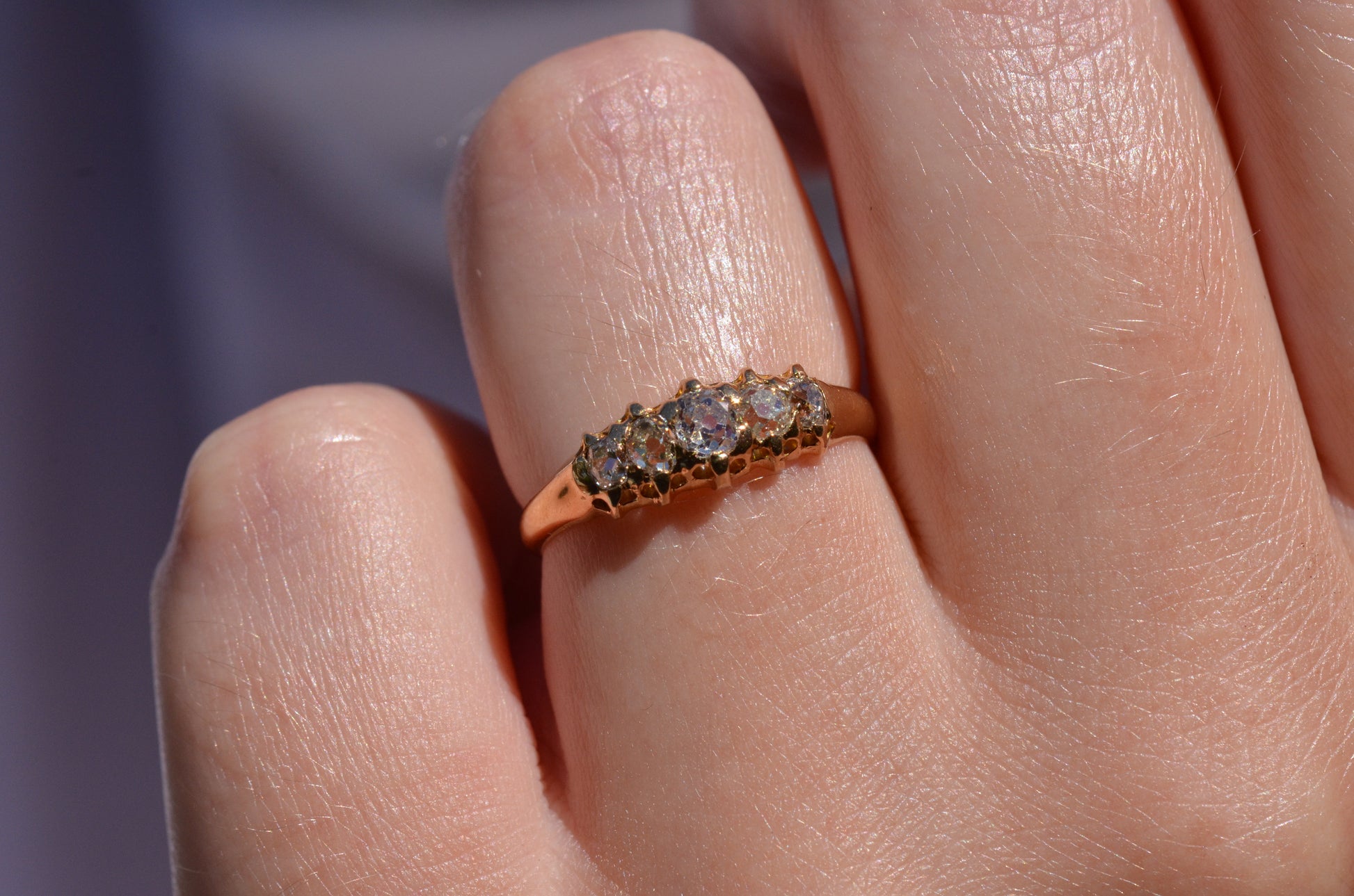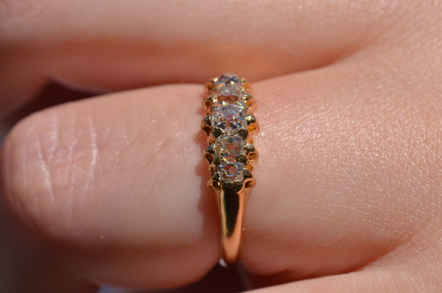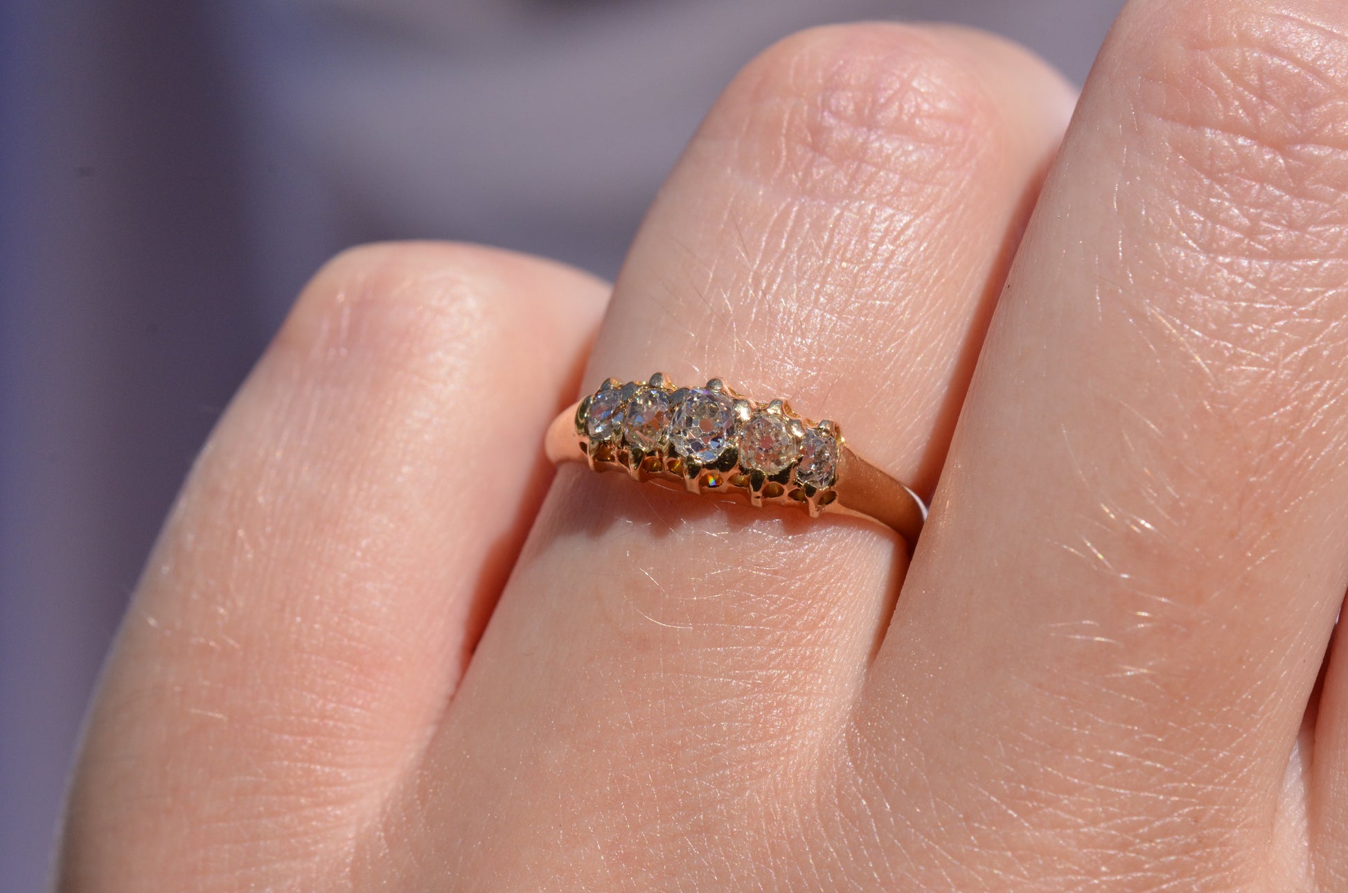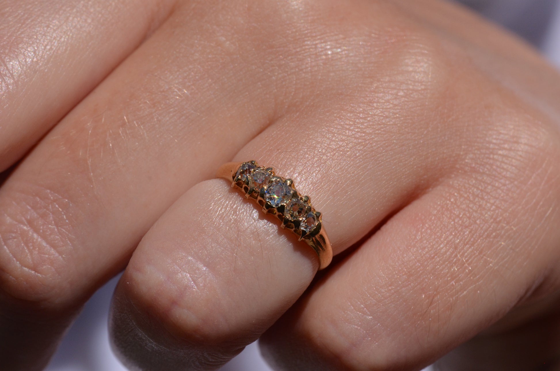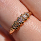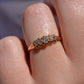 With softly worn prongs and old cut diamonds with the chunkiest facets, we love the way the stones take centre stage in this band. Five stone rings have been most popular for the century spanning the Georgian, Victorian, and Edwardian periods, with the boat-style of tapering sizes coming into greatest prominence around the turn of the 20th century. We love them best for their low profile, excellent finger coverage, and the way they can easily work as an engagement ring, wedding band, or even pull double duty as a 2-in-1.