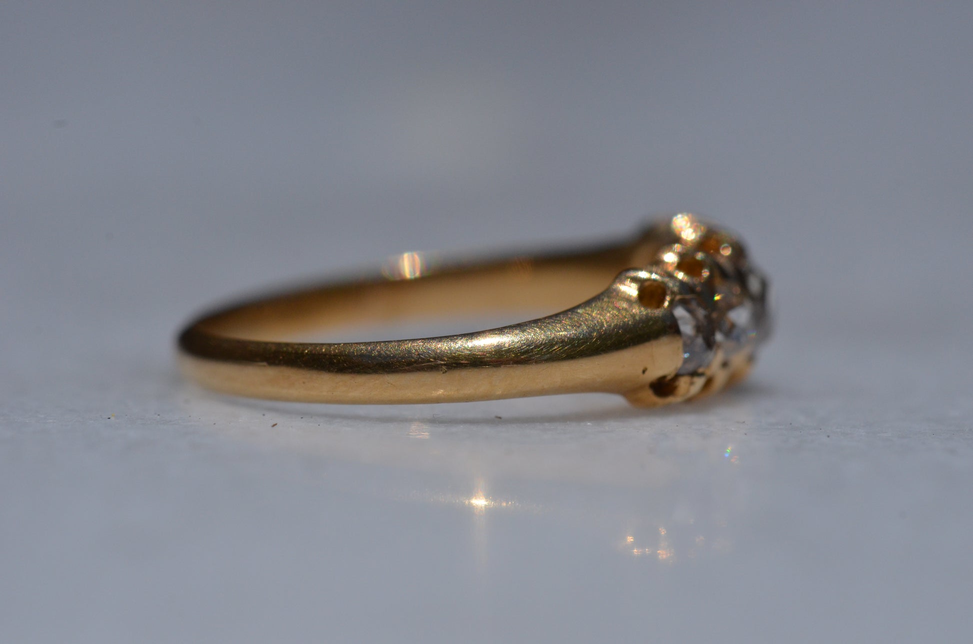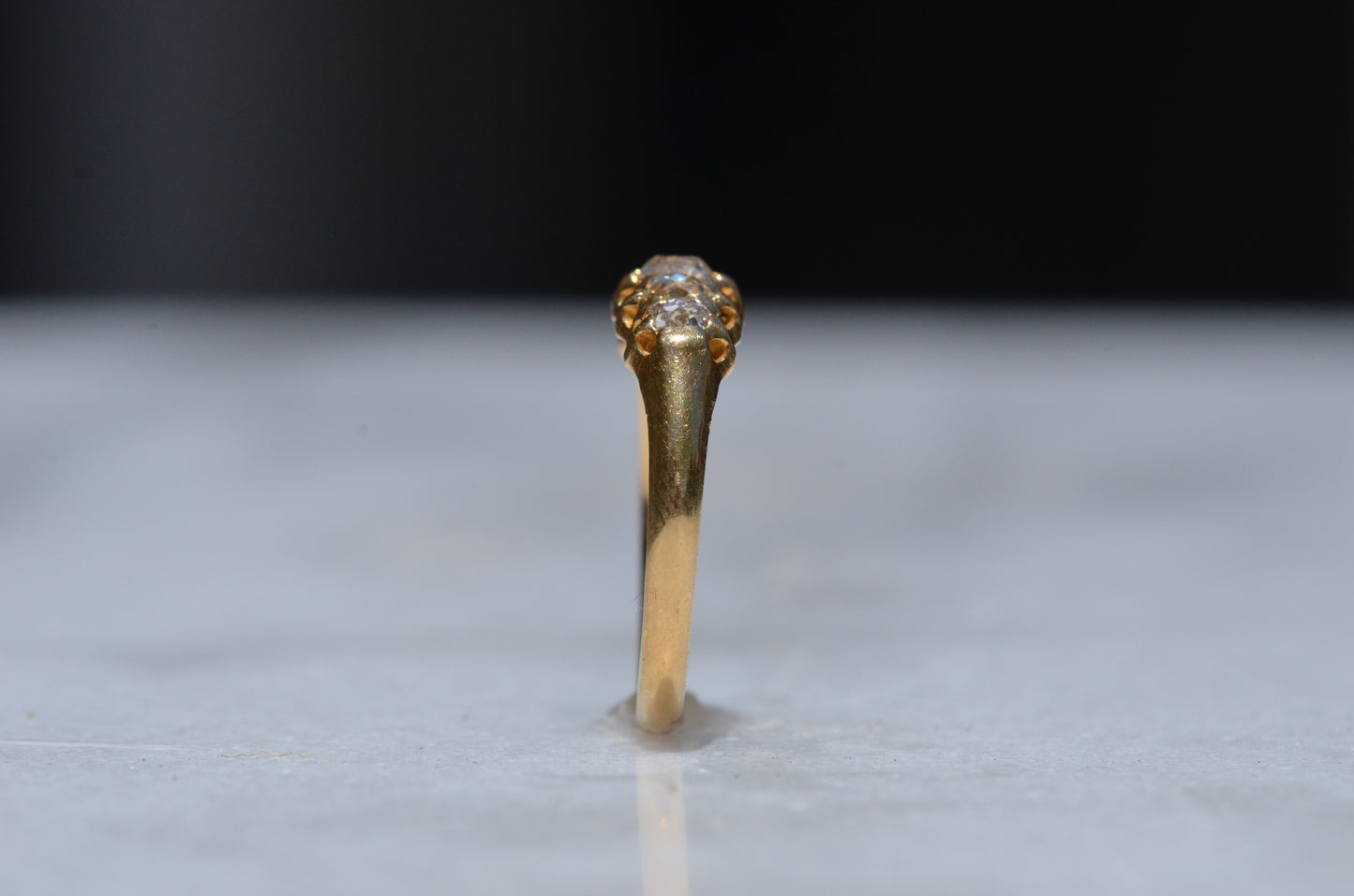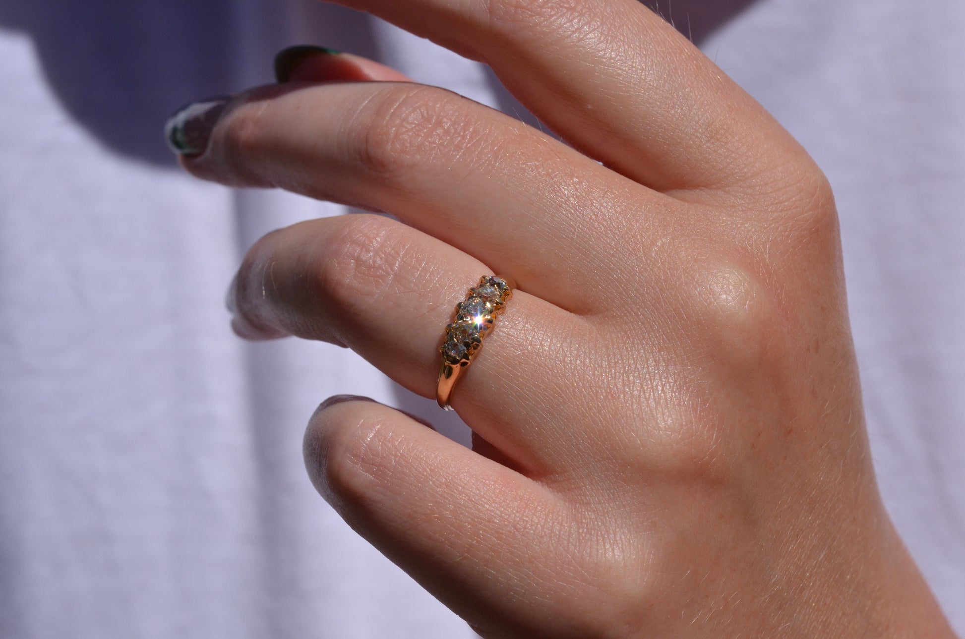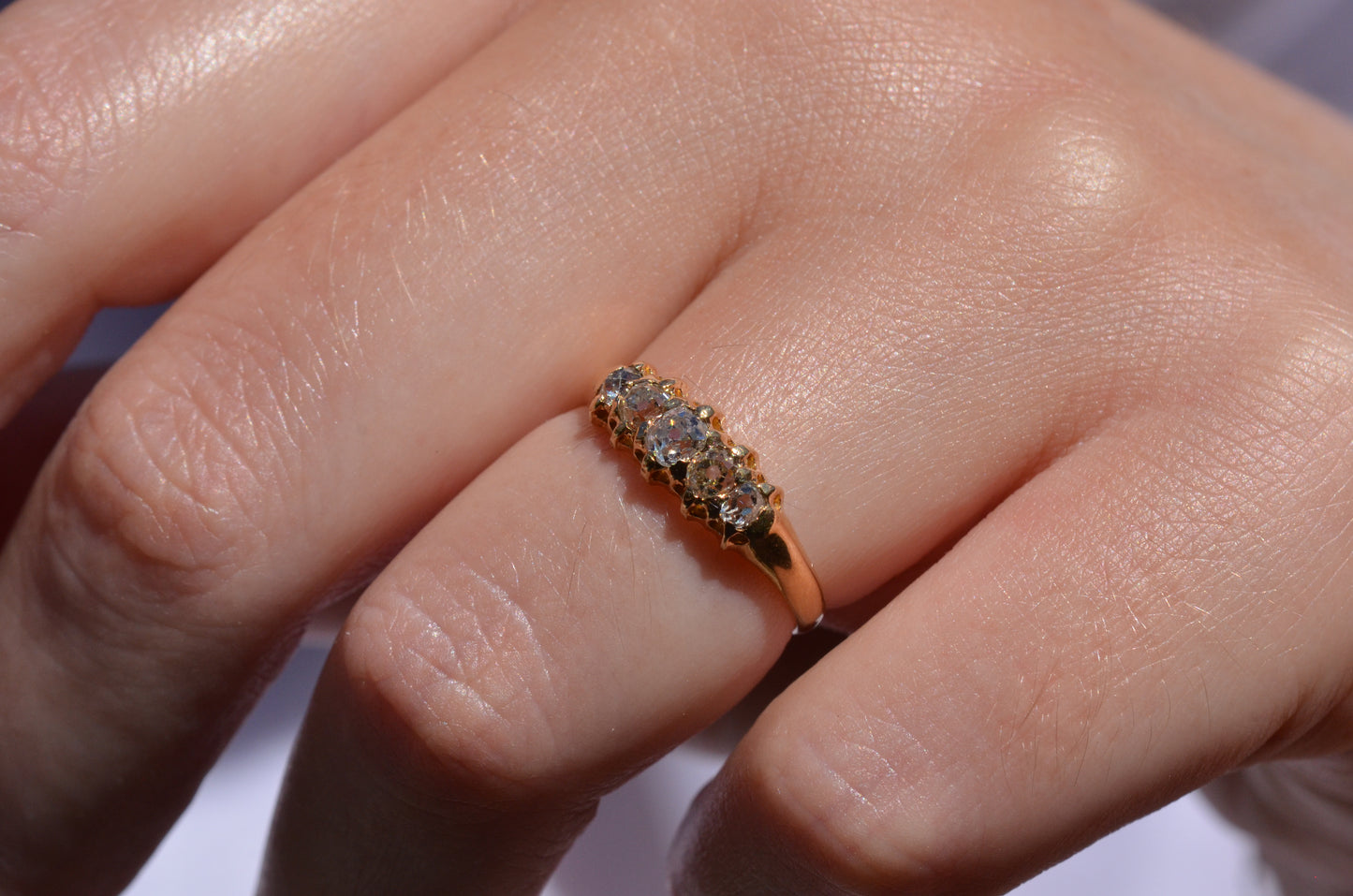 With softly worn prongs and old cut diamonds with the chunkiest facets, we love the way the stones take centre stage in this band. Five stone rings have been most popular for the century spanning the Georgian, Victorian, and Edwardian periods, with the boat-style of tapering sizes coming into greatest prominence around the turn of the 20th century. We love them best for their low profile, excellent finger coverage, and the way they can easily work as an engagement ring, wedding band, or even pull double duty as a 2-in-1.