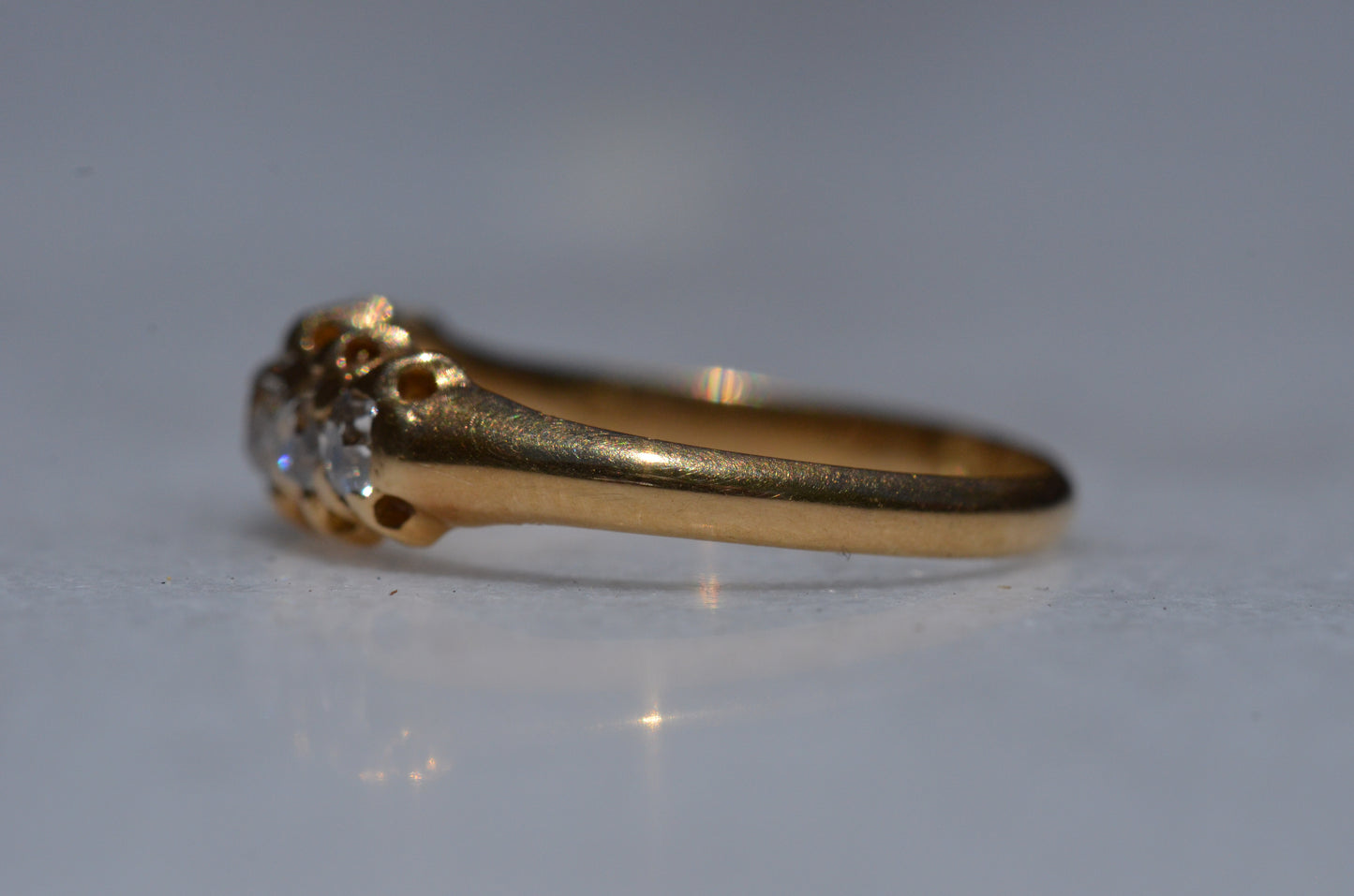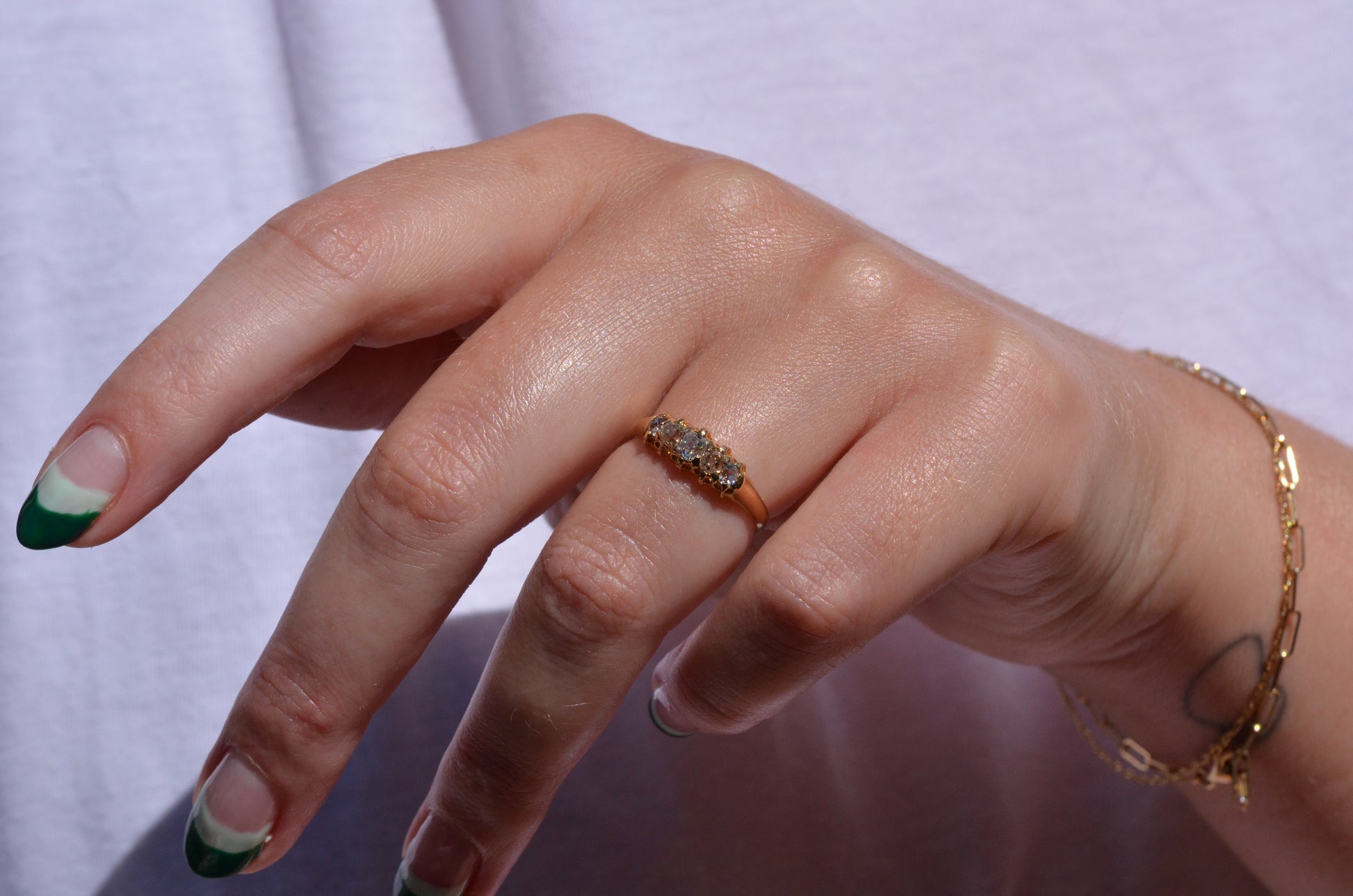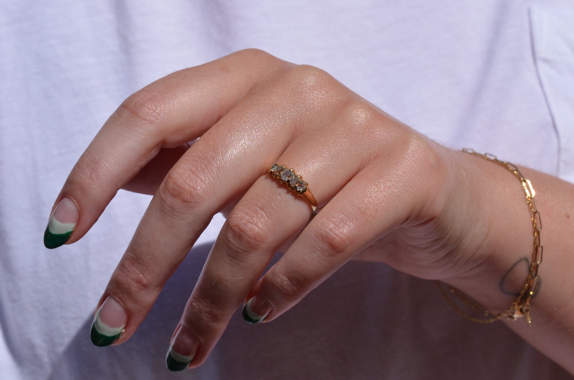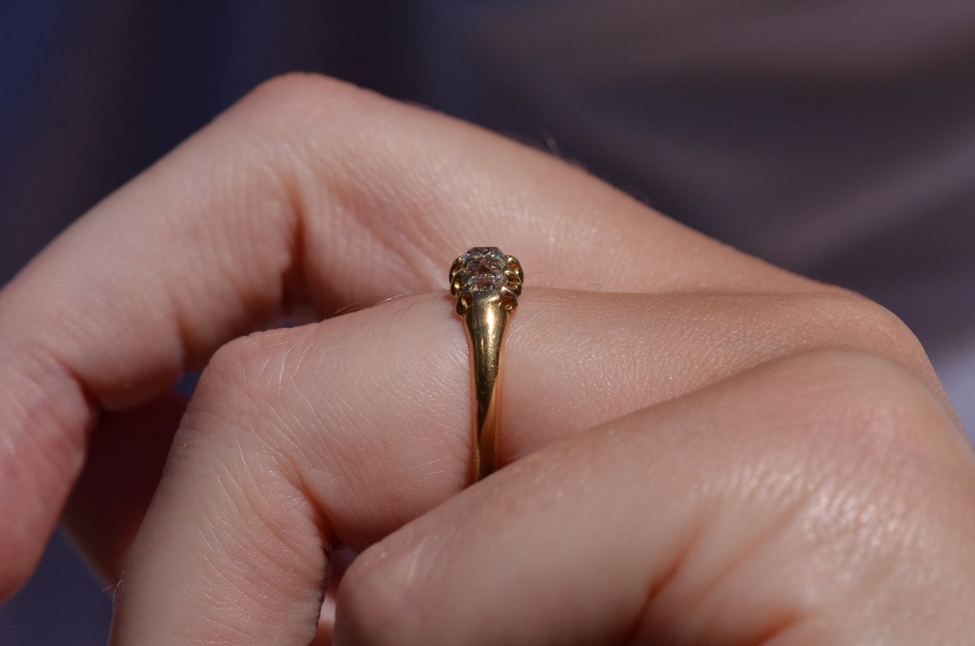 With softly worn prongs and old cut diamonds with the chunkiest facets, we love the way the stones take centre stage in this band. Five stone rings have been most popular for the century spanning the Georgian, Victorian, and Edwardian periods, with the boat-style of tapering sizes coming into greatest prominence around the turn of the 20th century. We love them best for their low profile, excellent finger coverage, and the way they can easily work as an engagement ring, wedding band, or even pull double duty as a 2-in-1.