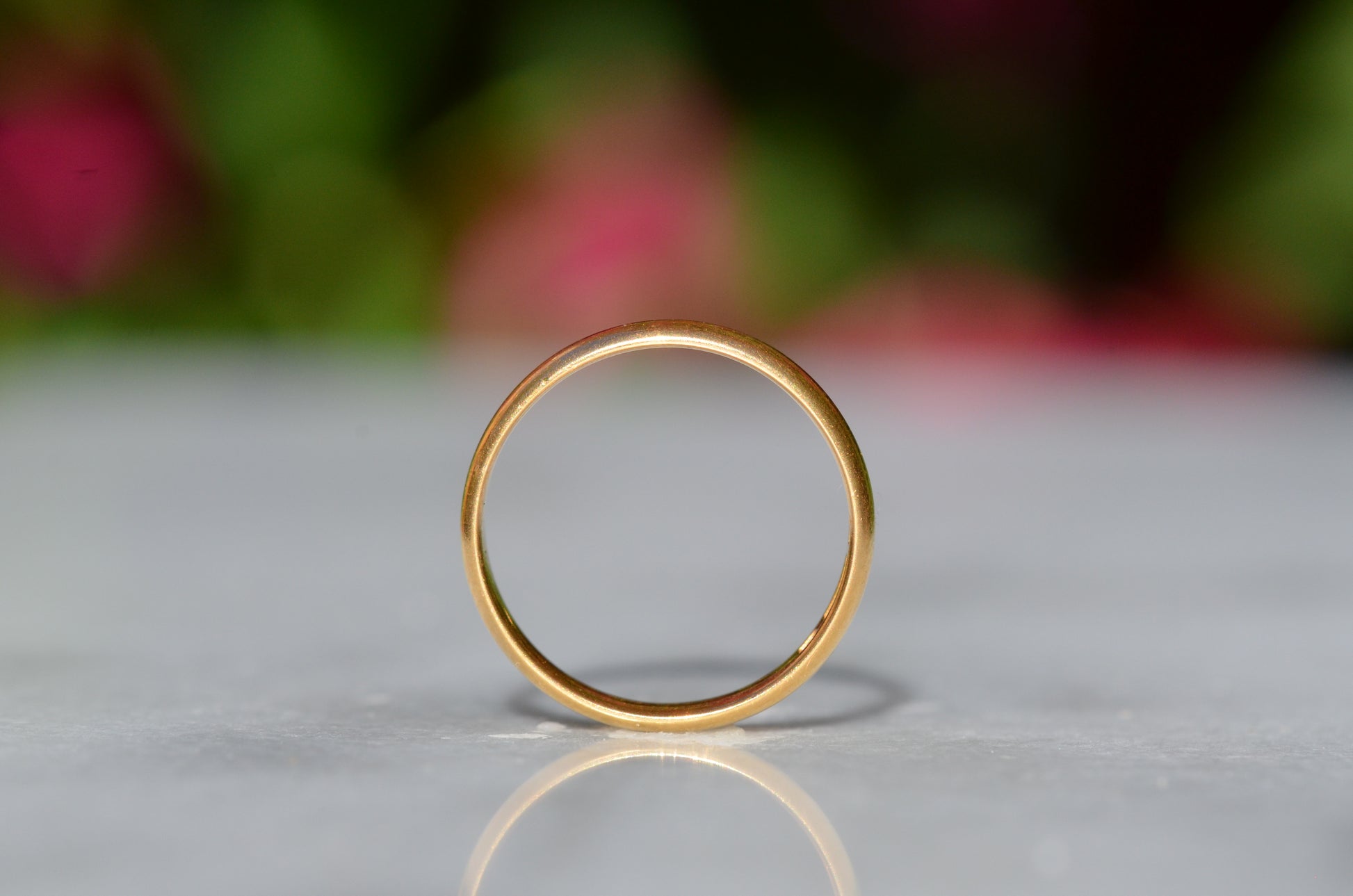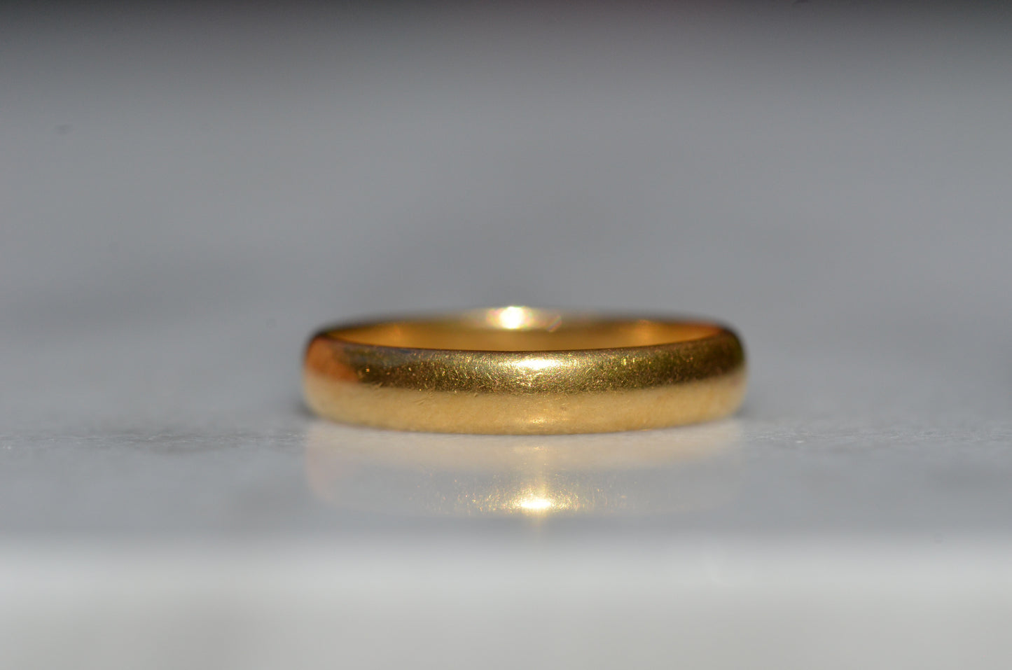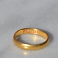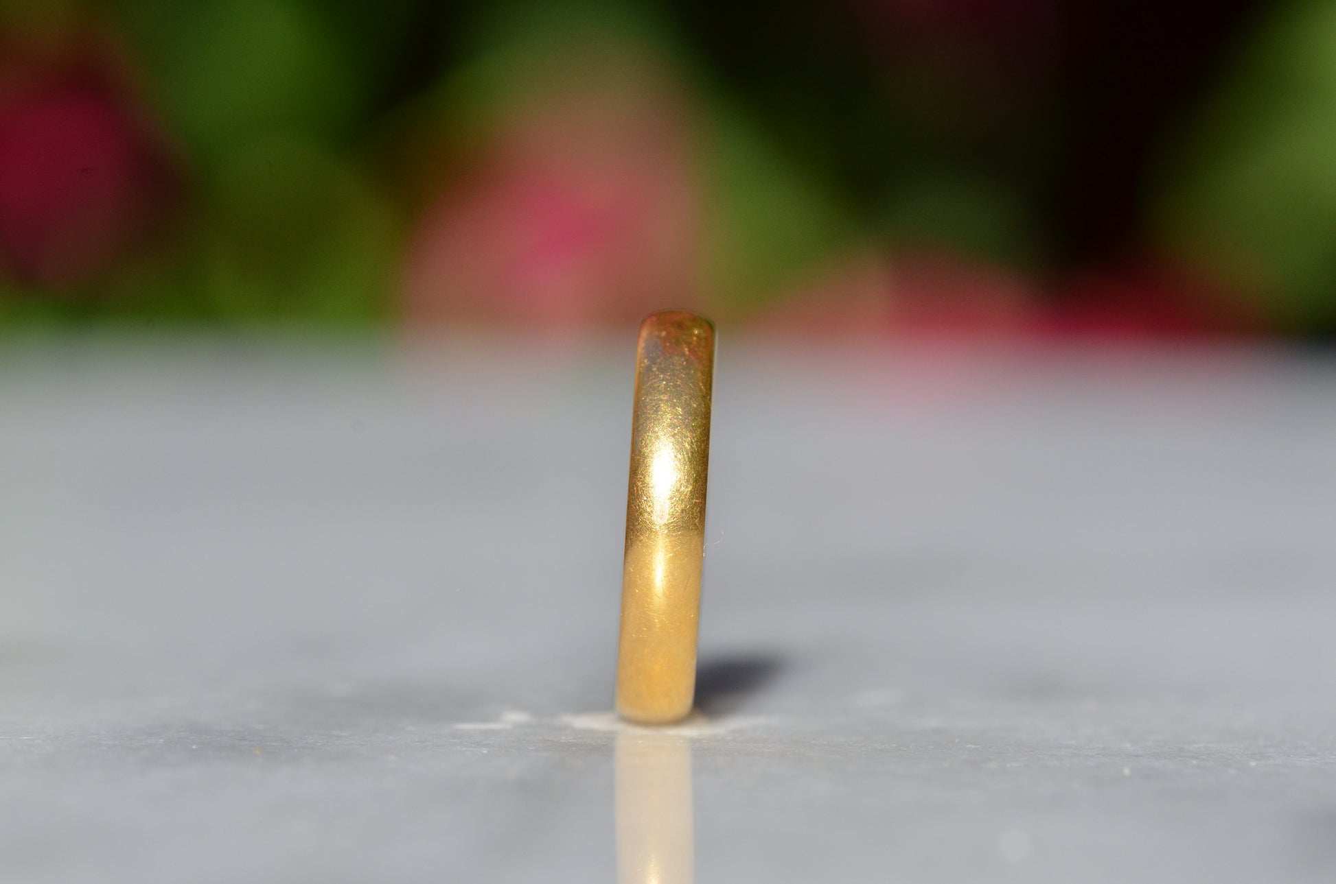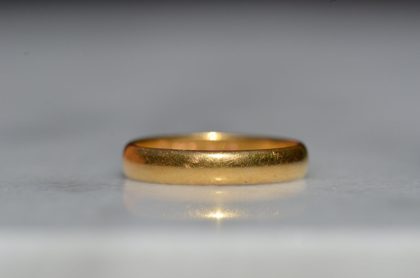 Gold alloys are softer in higher karats, so this old ring has developed some lovely wear over its lifetime with all the little scratches and dings that can't be replicated in a modern piece. While band rings are easy to resize, and often bear evidence of past resizing, we don't recommend it for this ring as that beautiful patina would be lost.