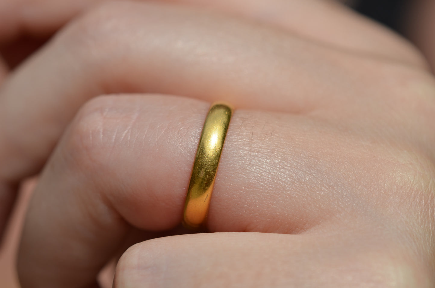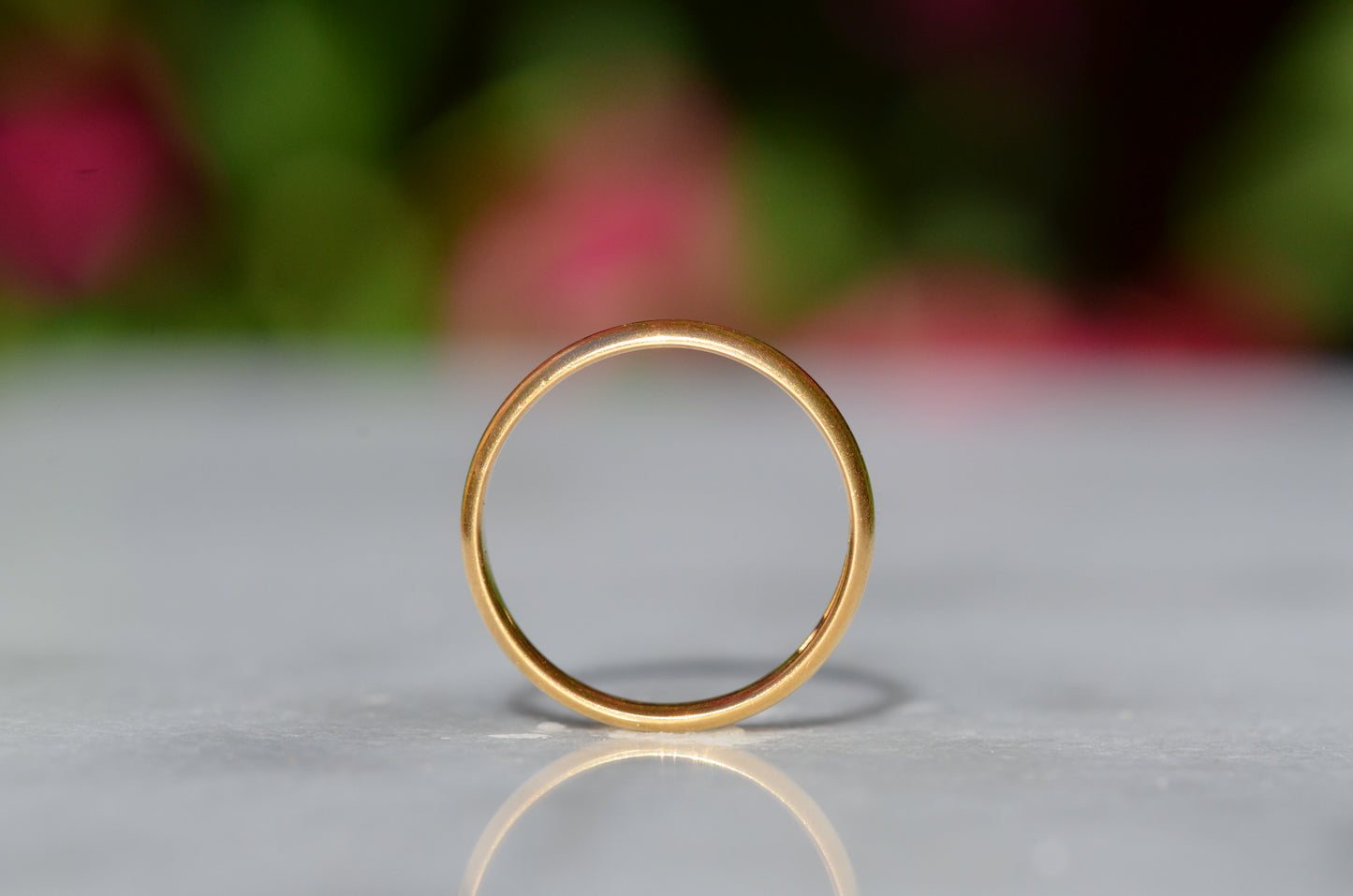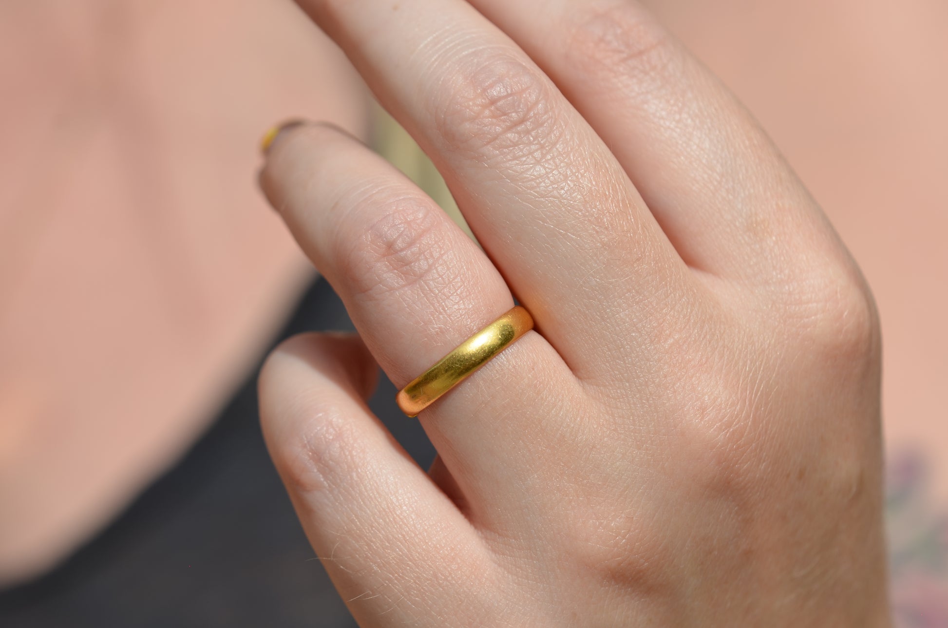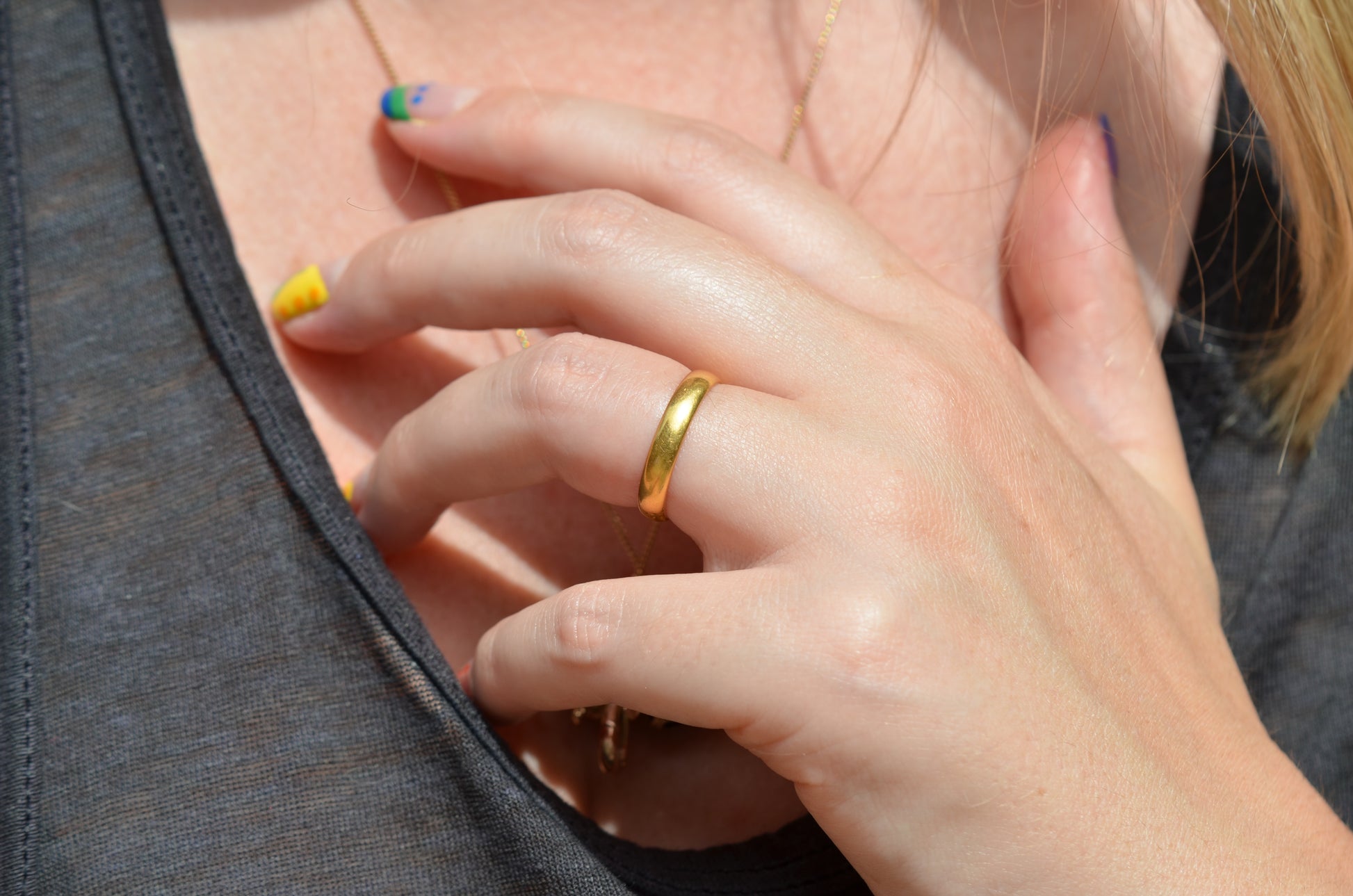 Gold alloys are softer in higher karats, so this old ring has developed some lovely wear over its lifetime with all the little scratches and dings that can't be replicated in a modern piece. While band rings are easy to resize, and often bear evidence of past resizing, we don't recommend it for this ring as that beautiful patina would be lost.