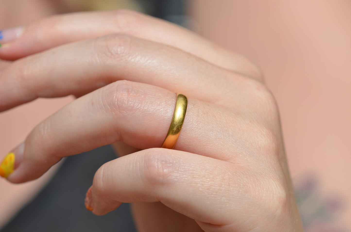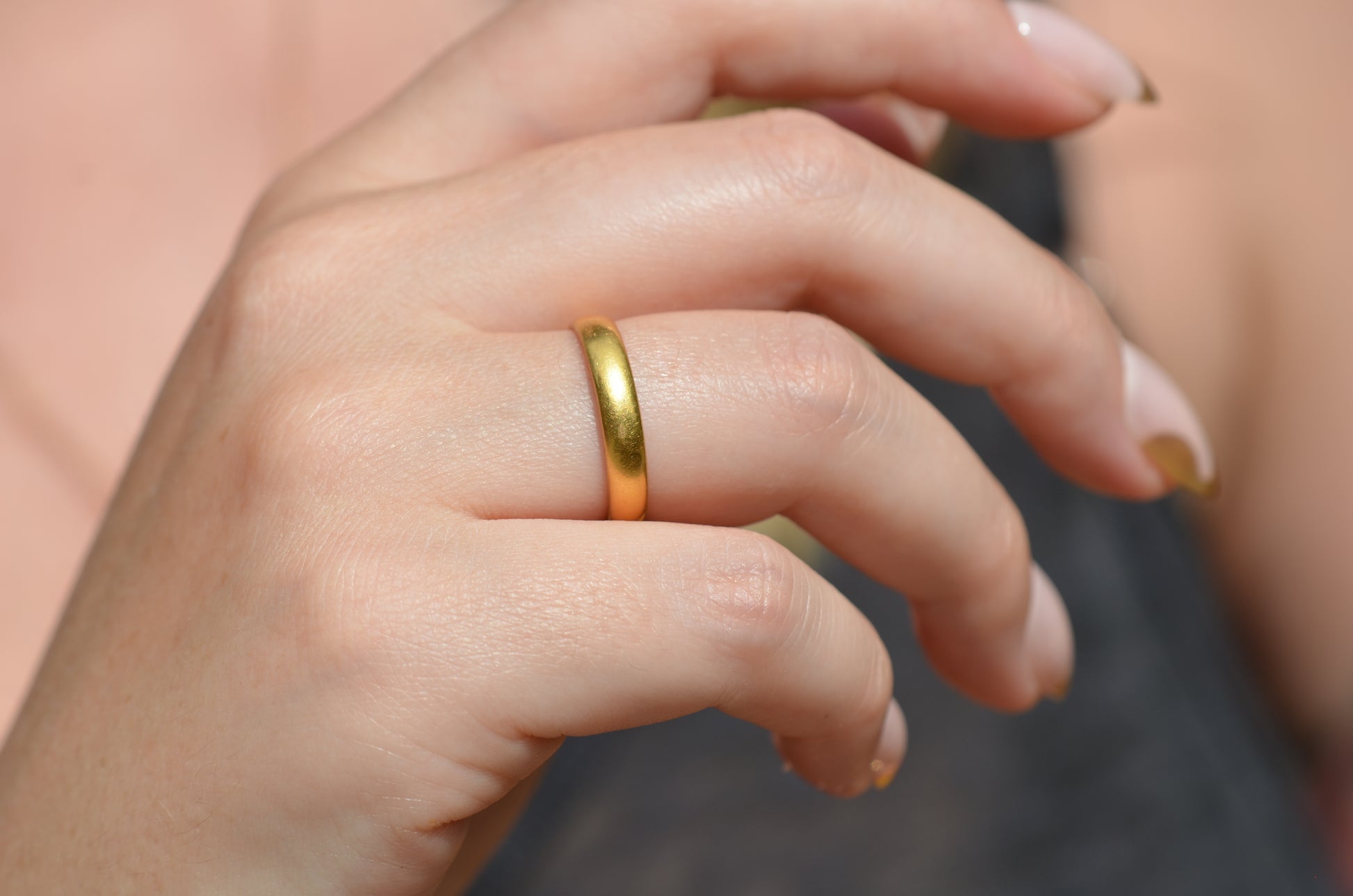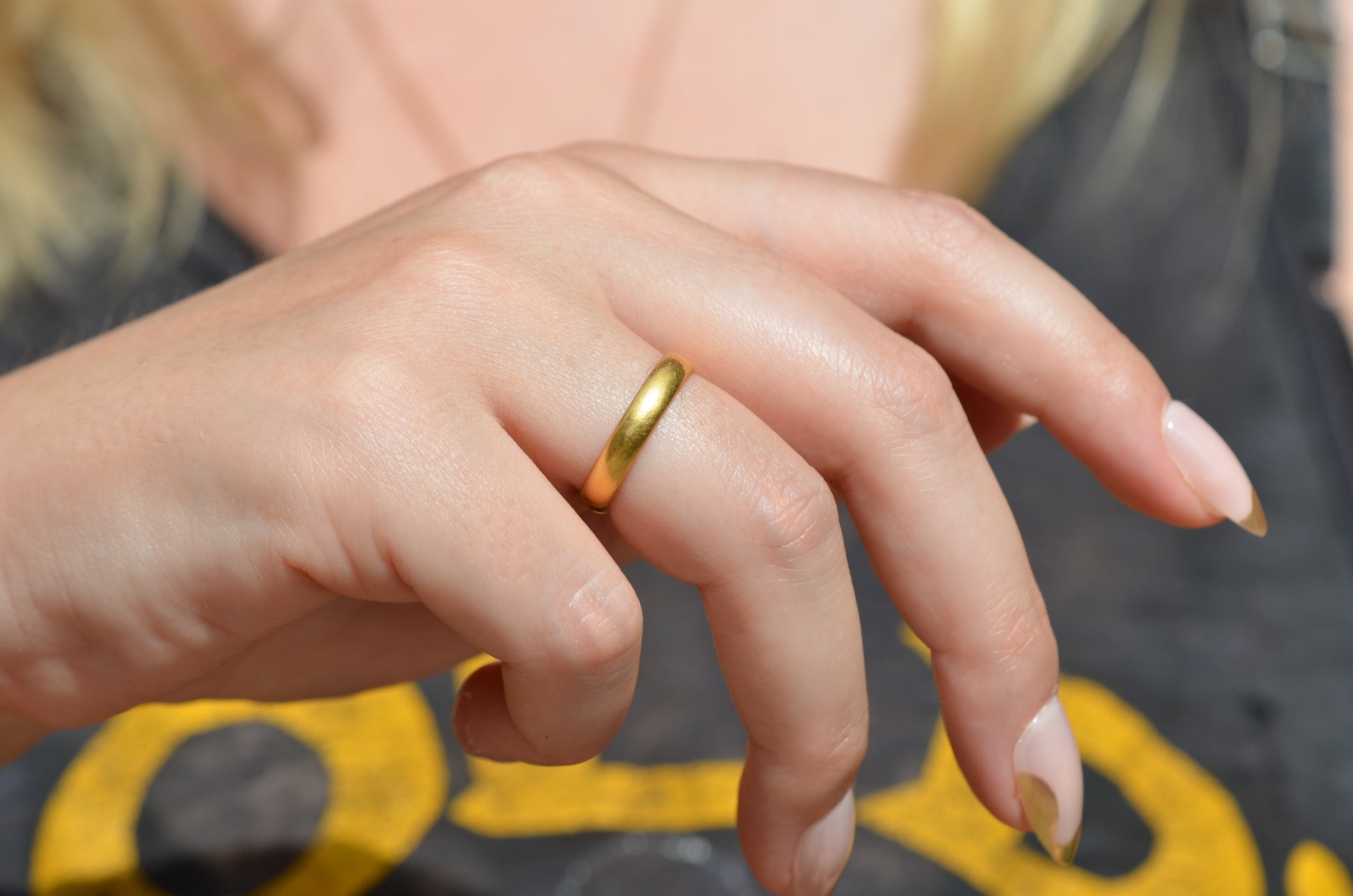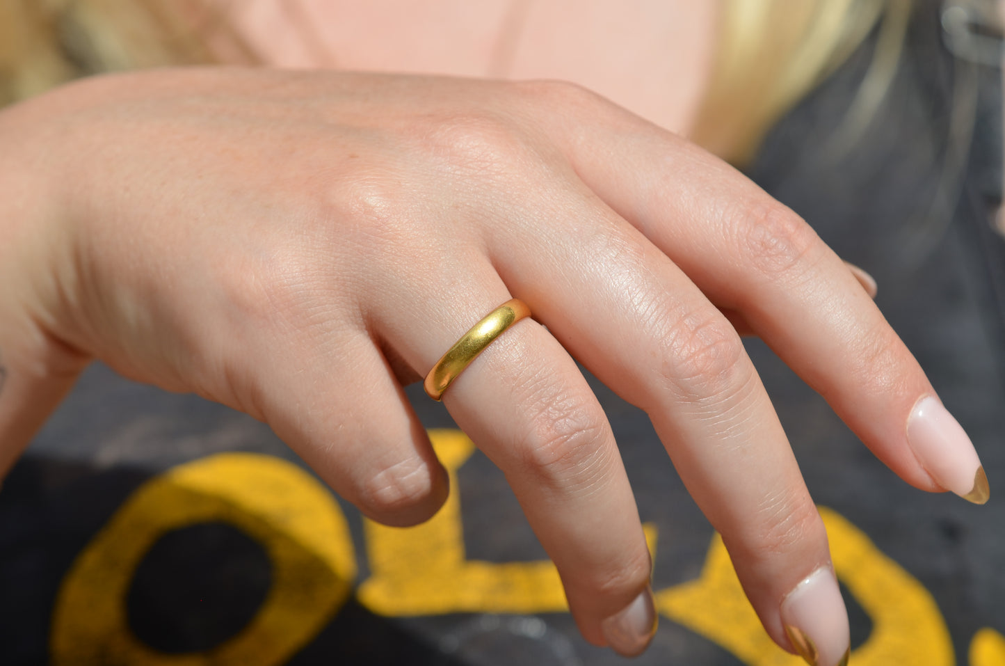 Gold alloys are softer in higher karats, so this old ring has developed some lovely wear over its lifetime with all the little scratches and dings that can't be replicated in a modern piece. While band rings are easy to resize, and often bear evidence of past resizing, we don't recommend it for this ring as that beautiful patina would be lost.