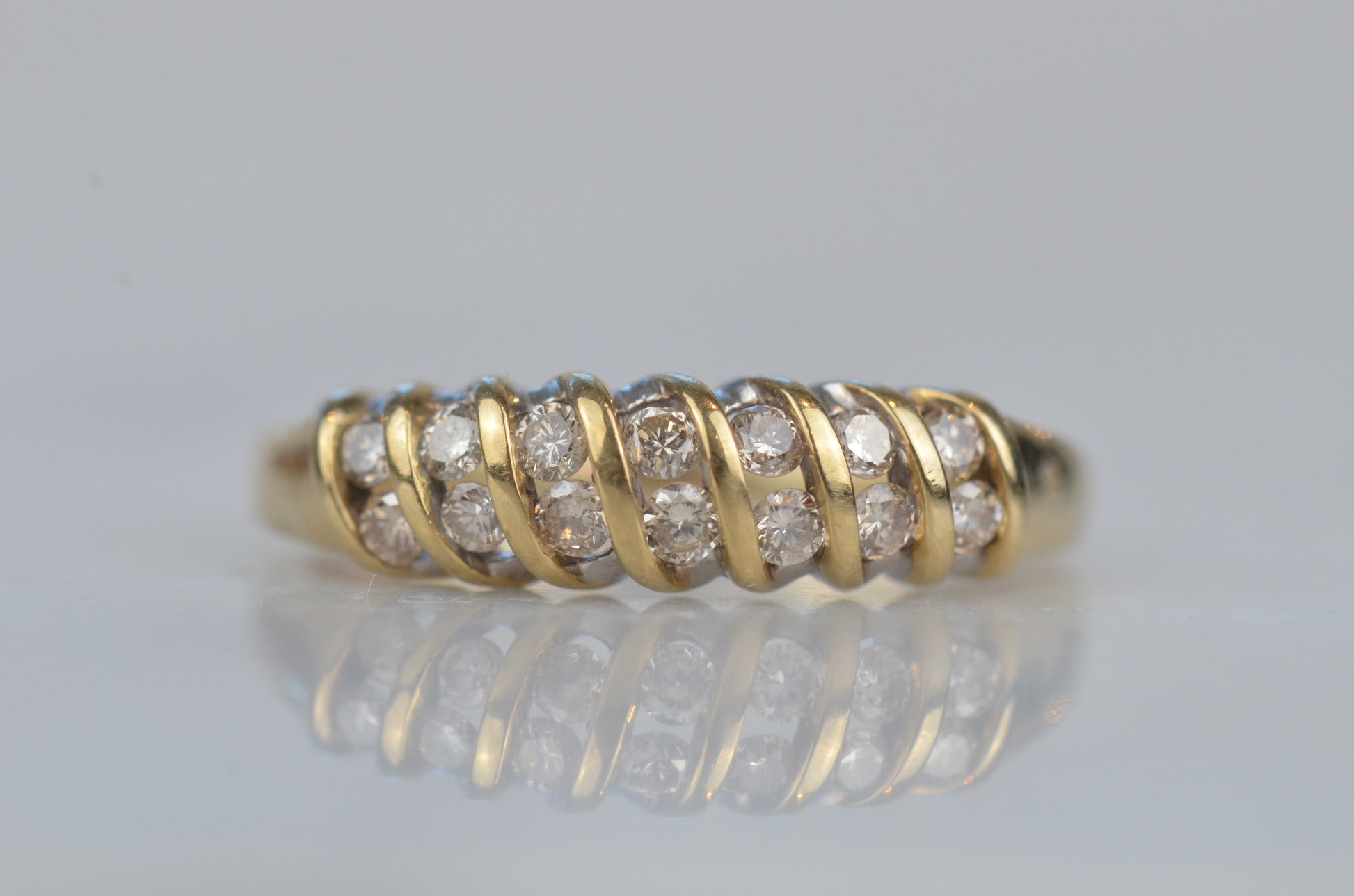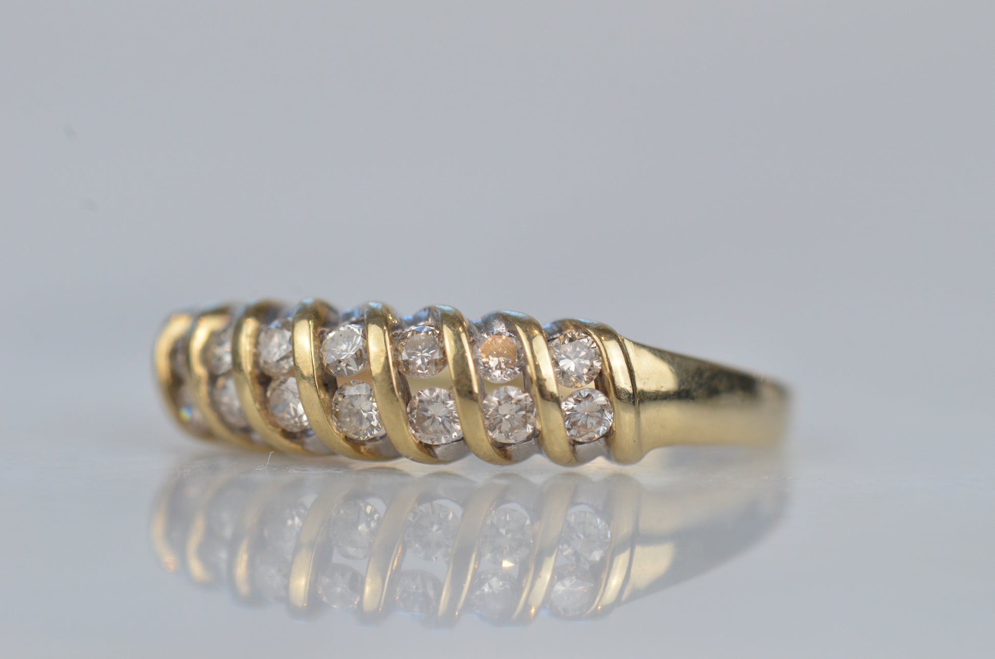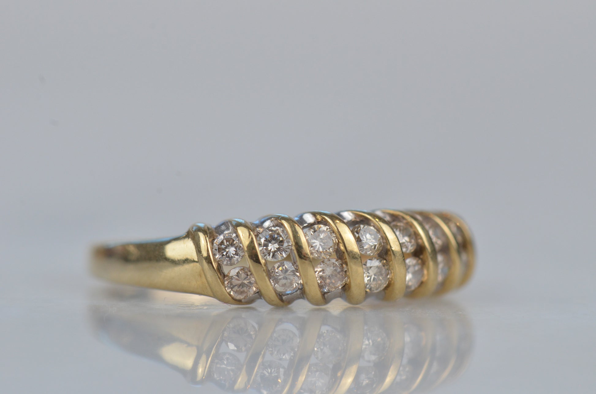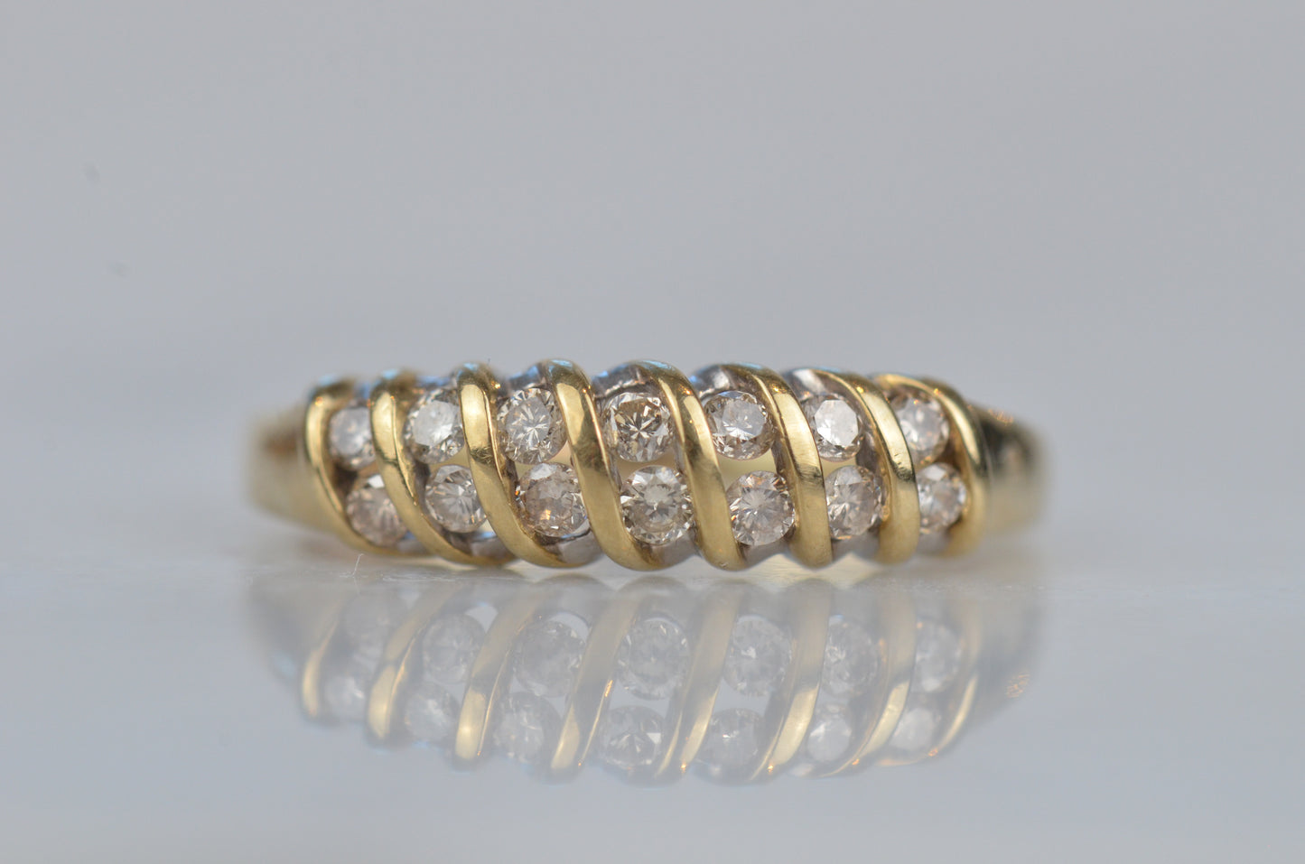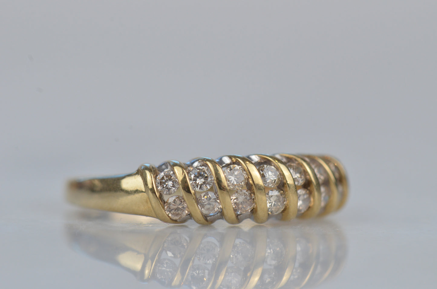 A gorgeous and sparkling ring with soft, swooping bands of gold between bright brilliant diamonds. Channel set in the diagonal bands, the diamonds appear to float in a dome of gold. Bold enough to be a statement ring, sturdy enough for every day wear, this ring would also make a gorgeous alternative engagement ring or wedding band.