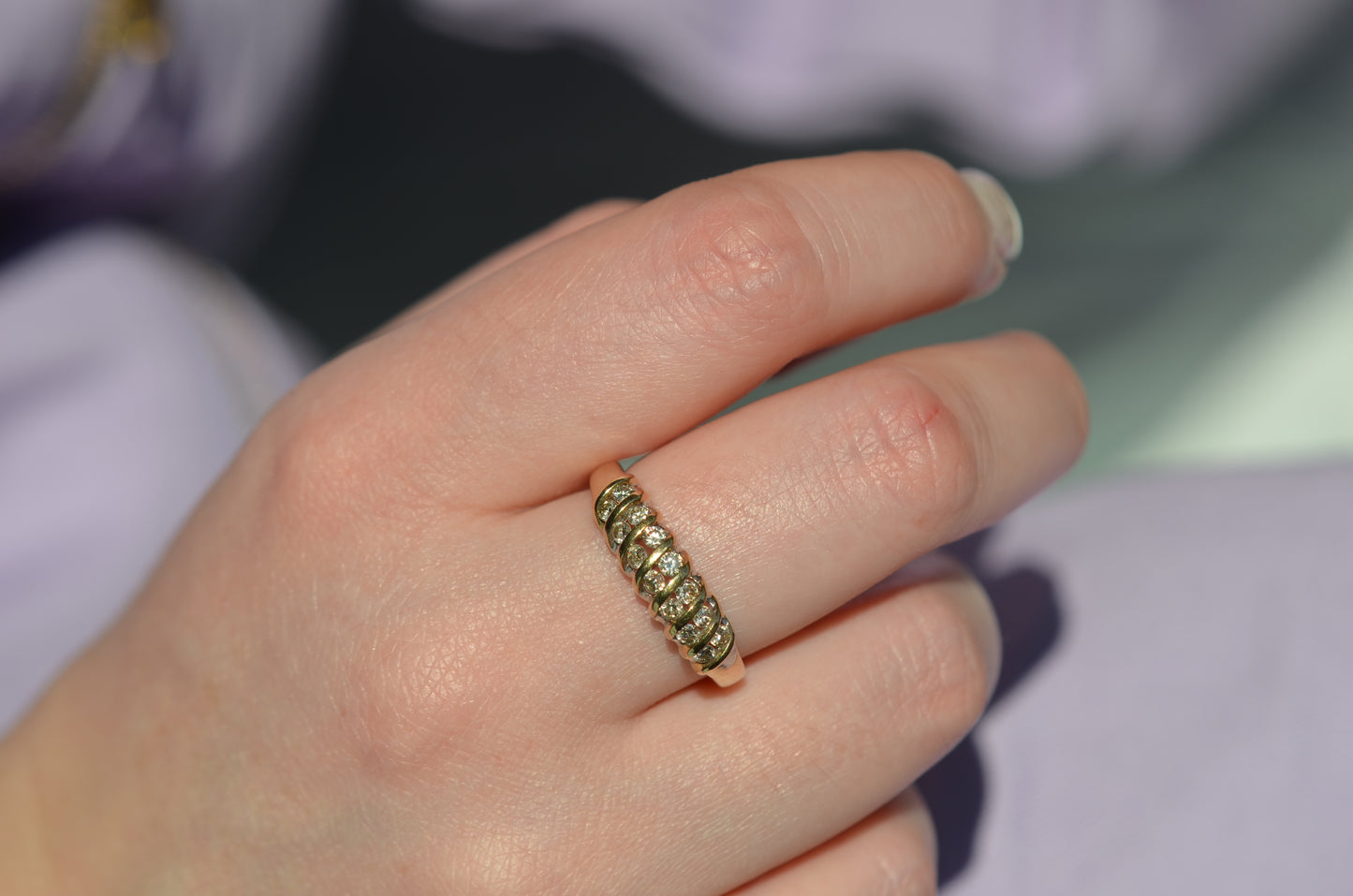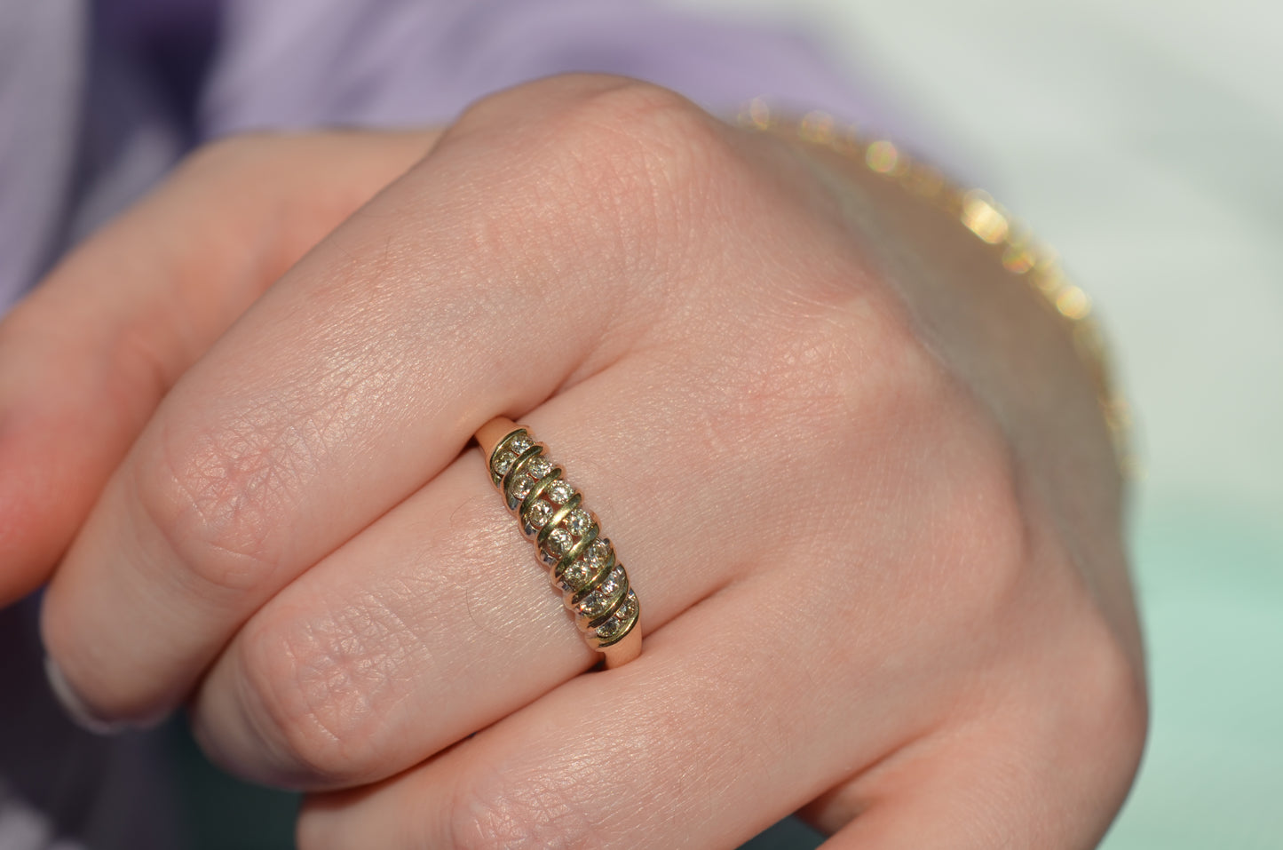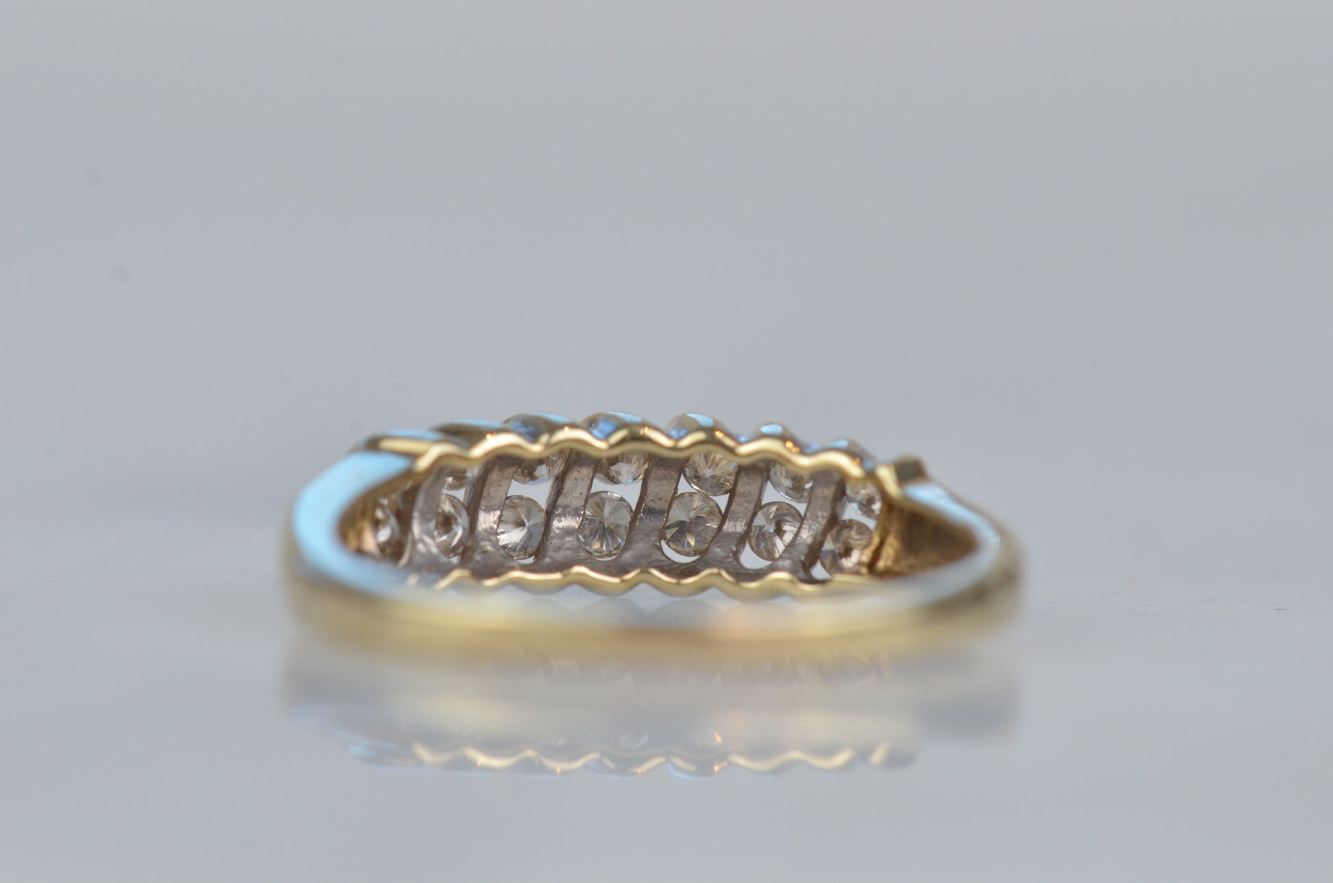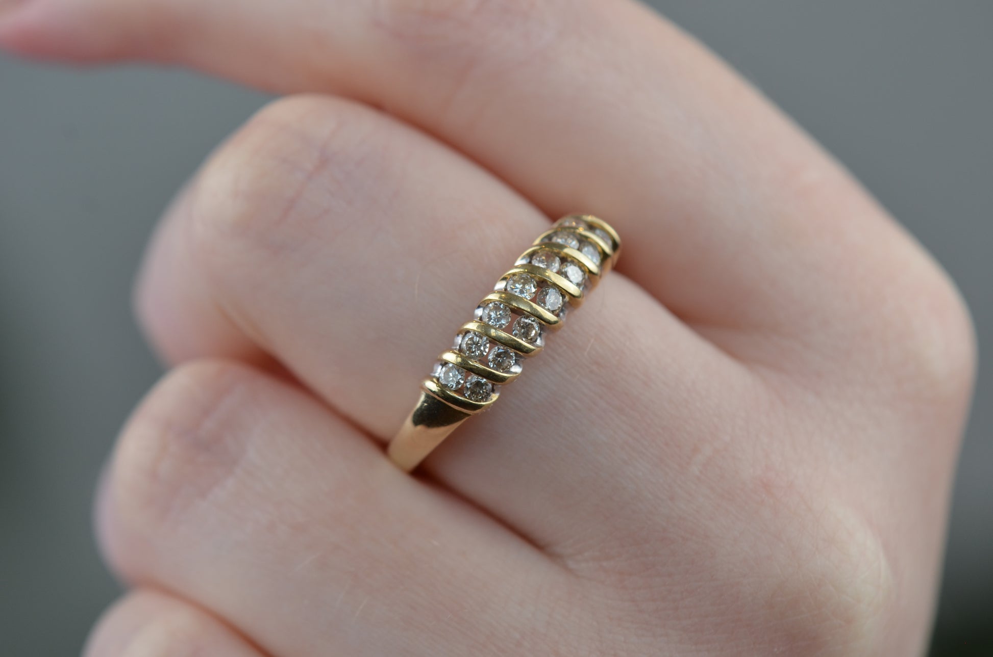 A gorgeous and sparkling ring with soft, swooping bands of gold between bright brilliant diamonds. Channel set in the diagonal bands, the diamonds appear to float in a dome of gold. Bold enough to be a statement ring, sturdy enough for every day wear, this ring would also make a gorgeous alternative engagement ring or wedding band.