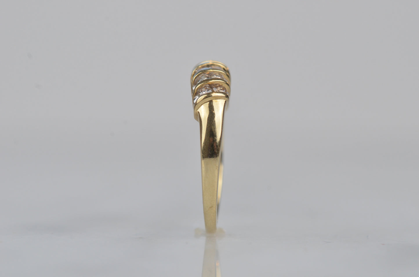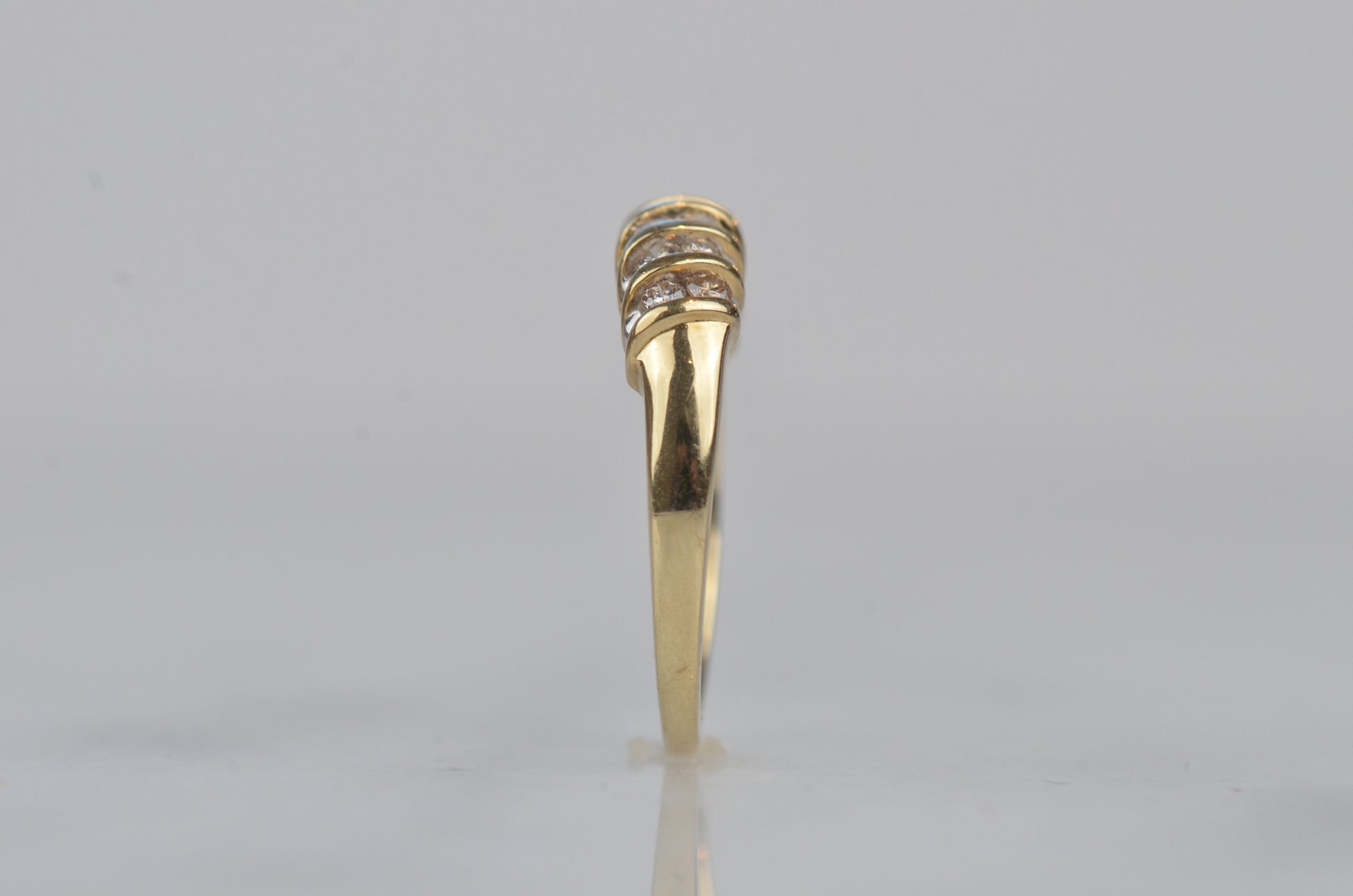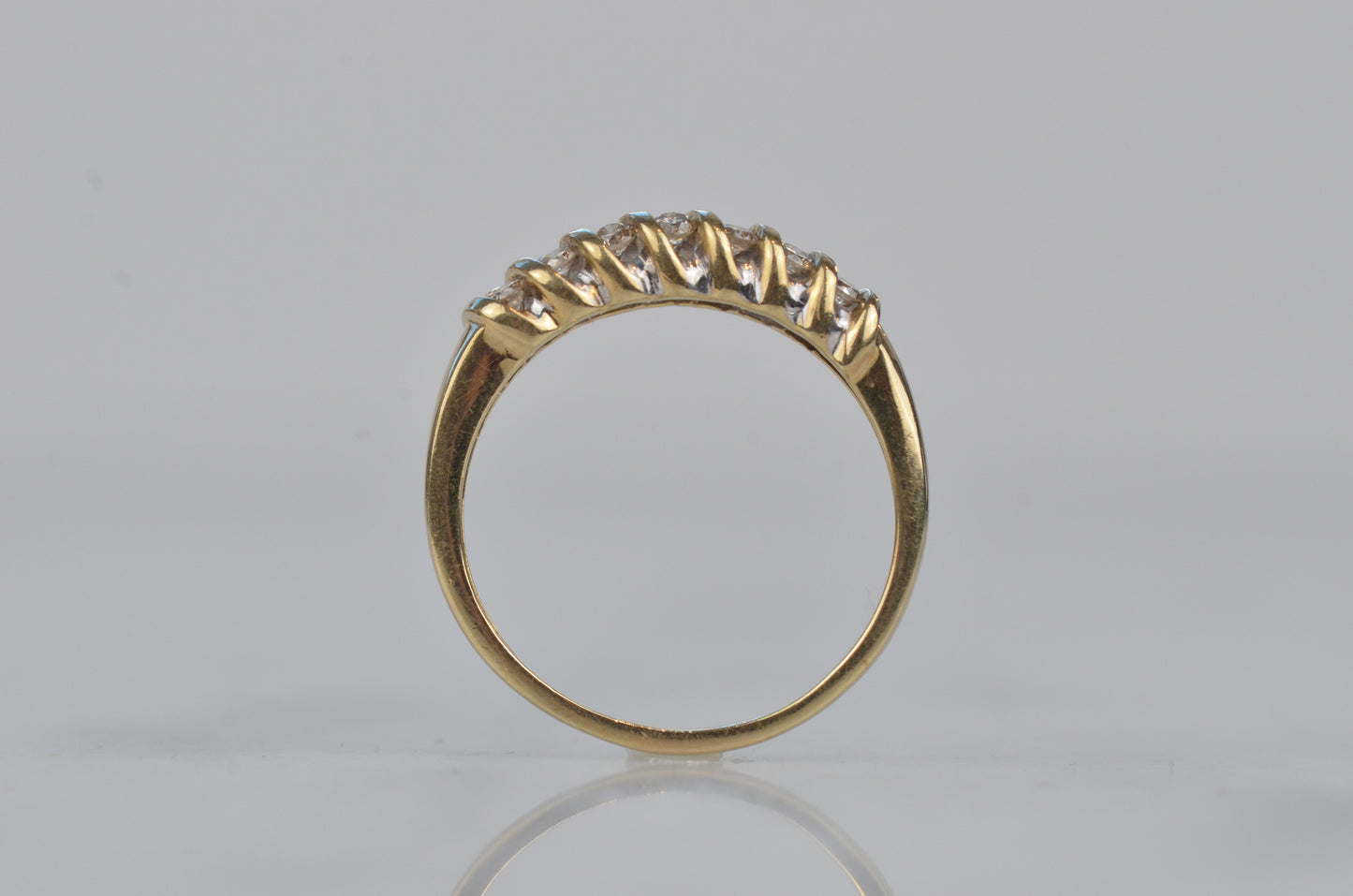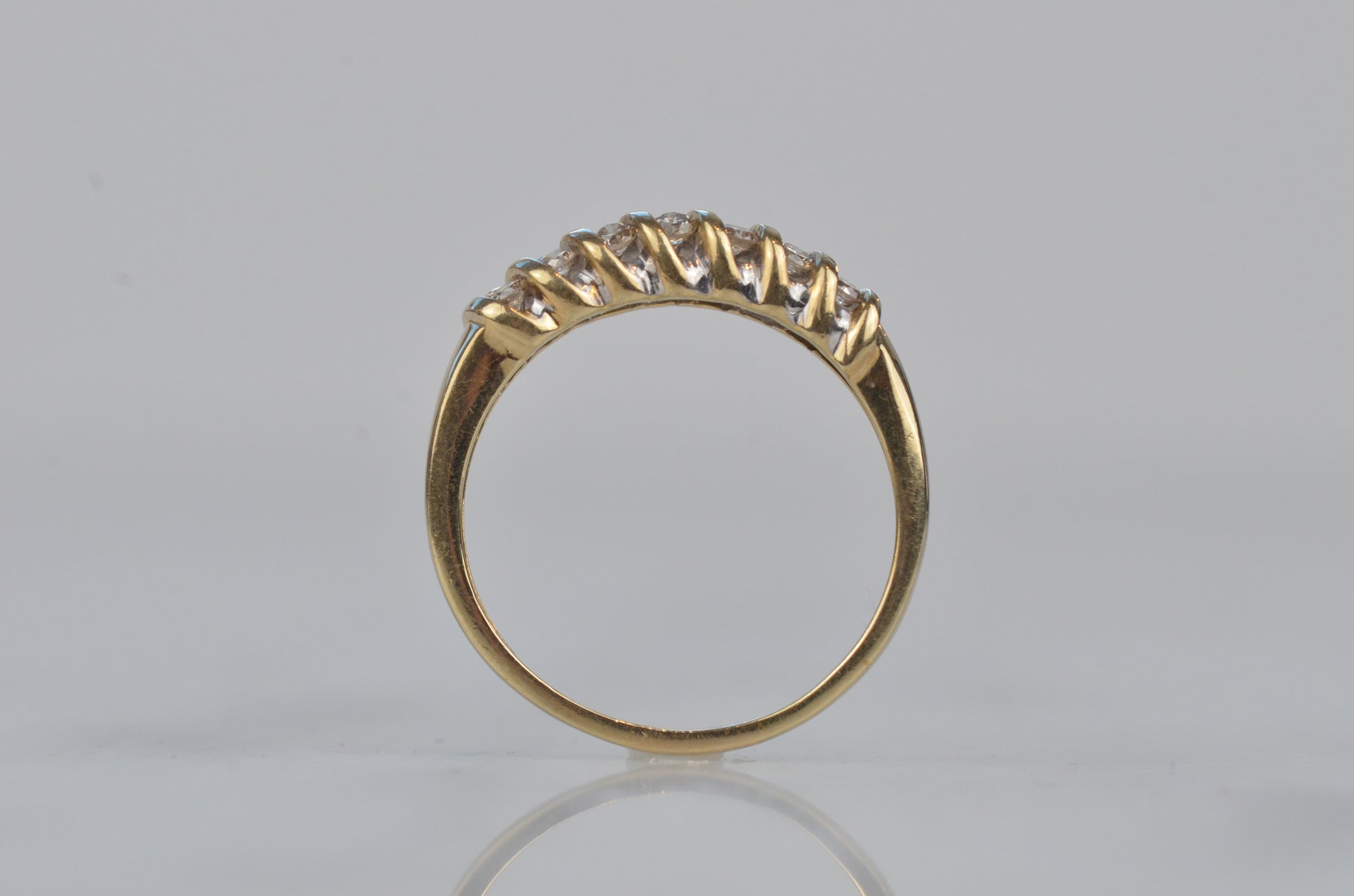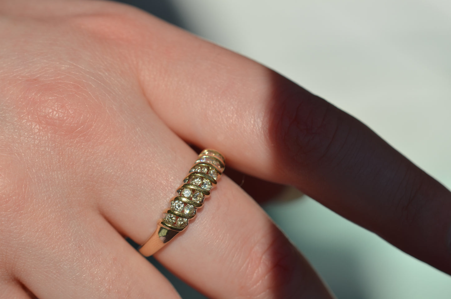 A gorgeous and sparkling ring with soft, swooping bands of gold between bright brilliant diamonds. Channel set in the diagonal bands, the diamonds appear to float in a dome of gold. Bold enough to be a statement ring, sturdy enough for every day wear, this ring would also make a gorgeous alternative engagement ring or wedding band.