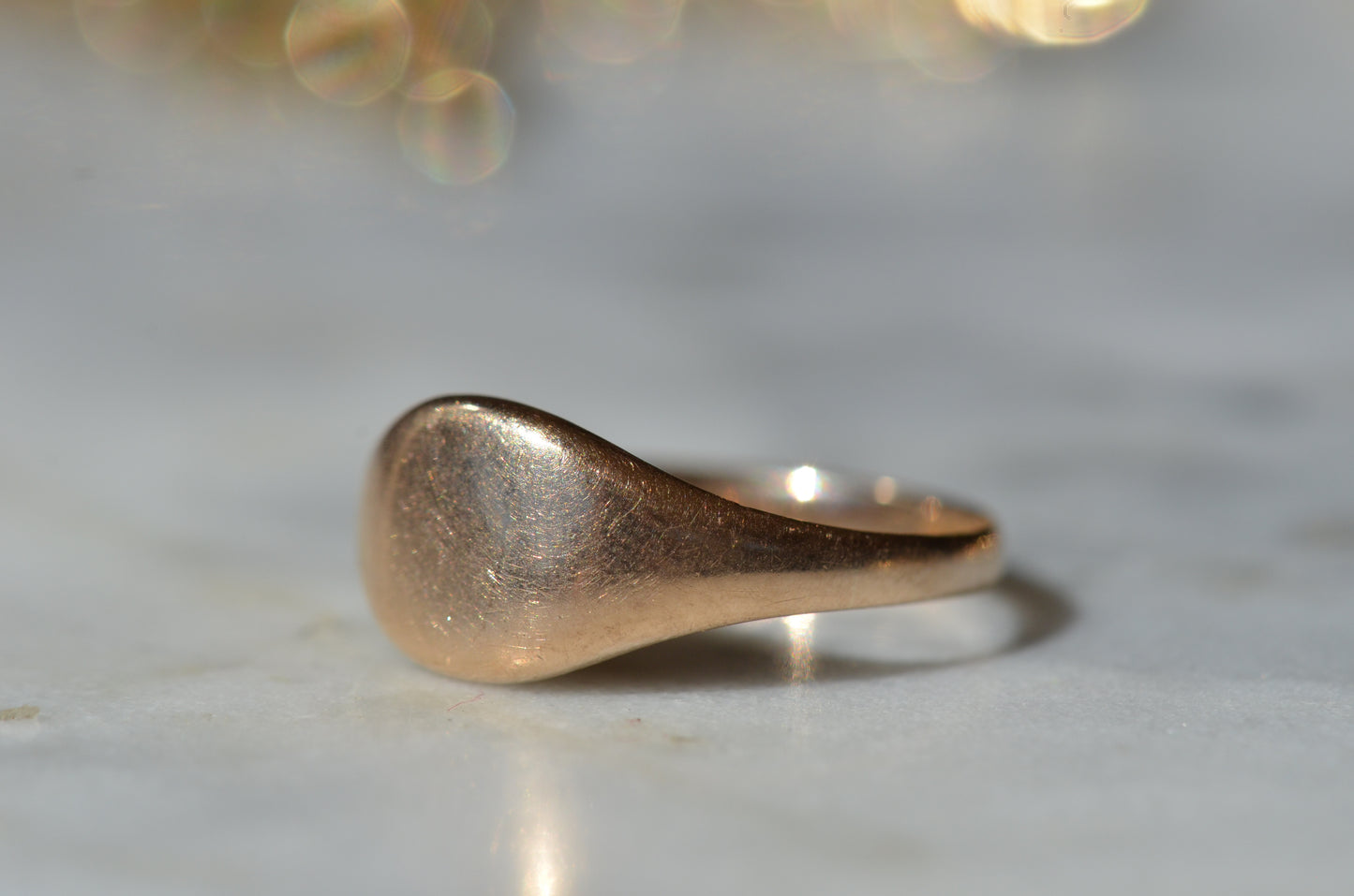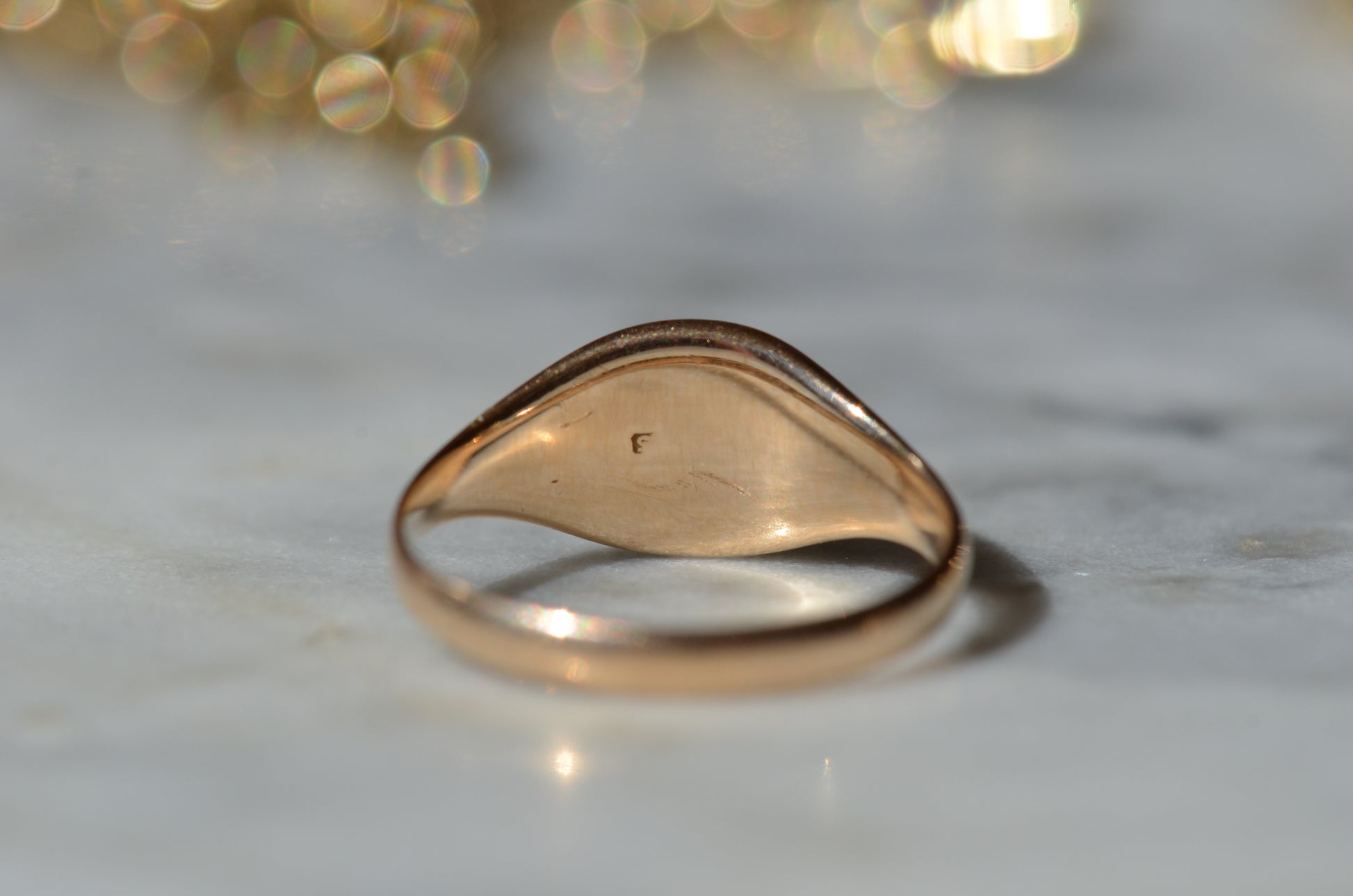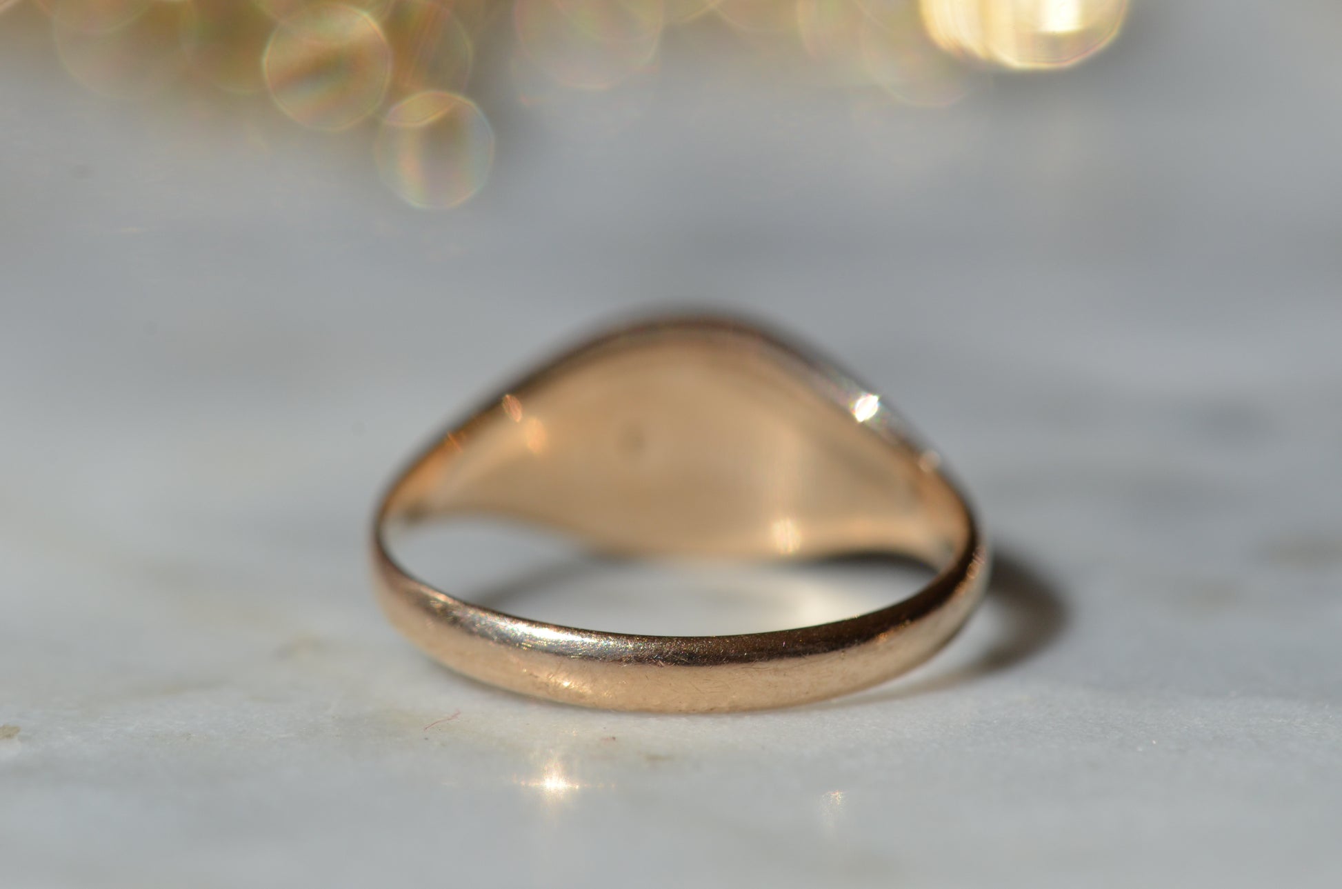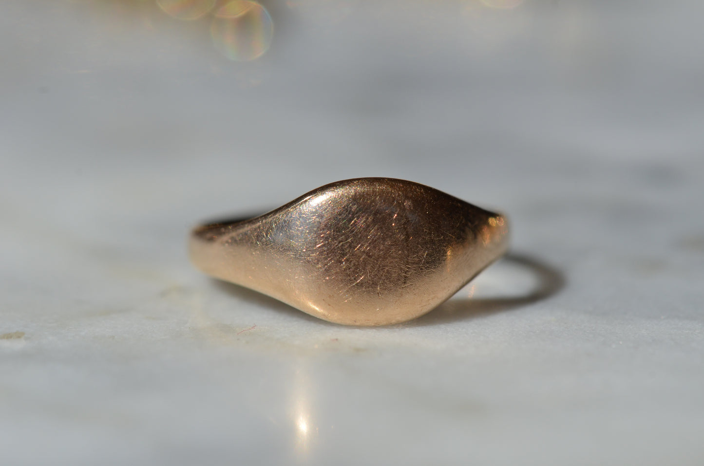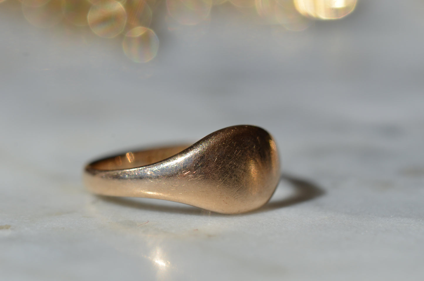 A rich and smooth ring, this piece is like a pat of butter for your finger (only so much better). There's something about a signet ring worn smooth like this that always tugs on our heart strings: the love that a previous caretaker had for this ring is evident in its wear, in the way that day to day life has left a beautiful smooth patina and just a suggestion of the letters that were once so carefully engraved.
