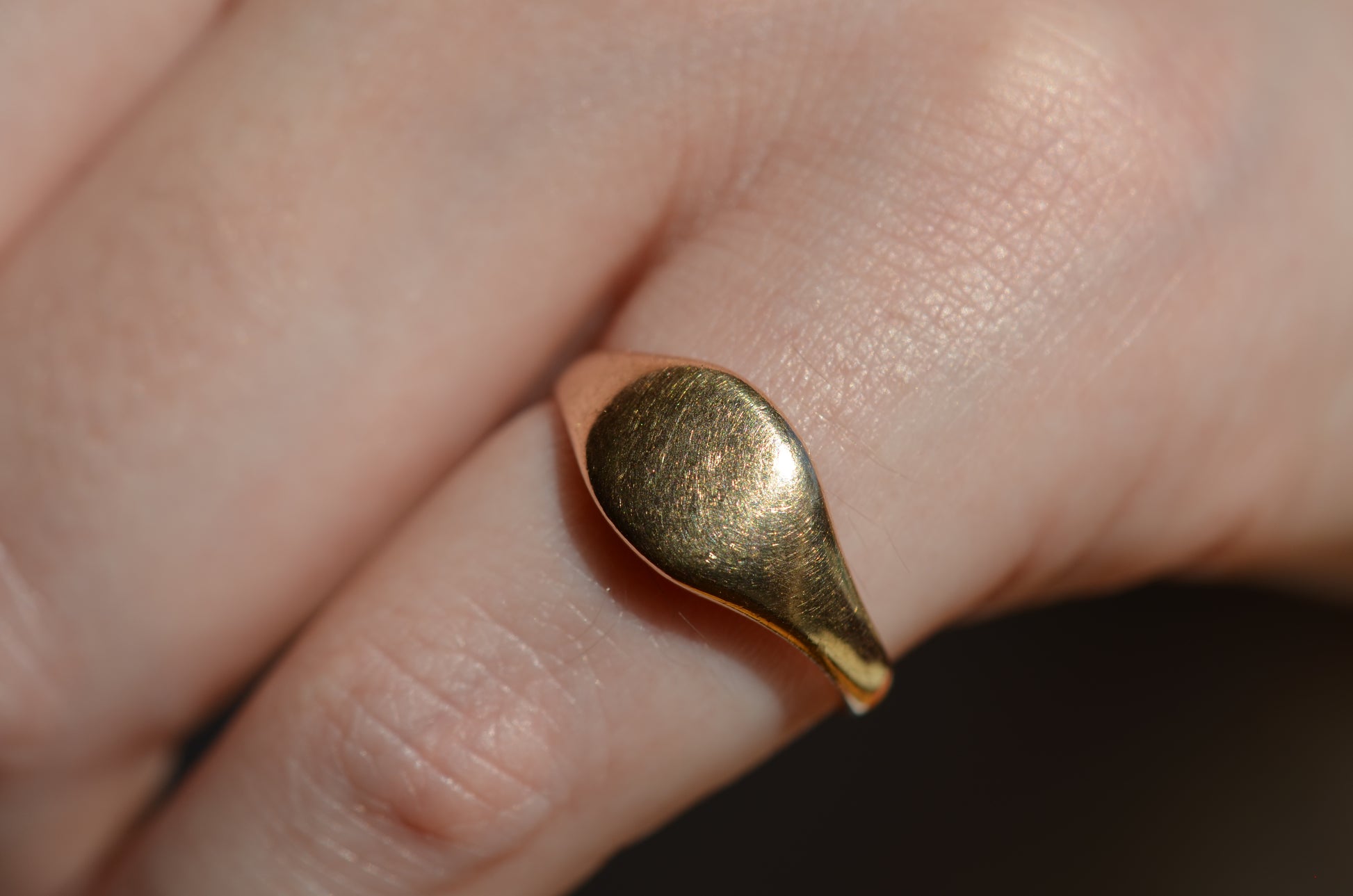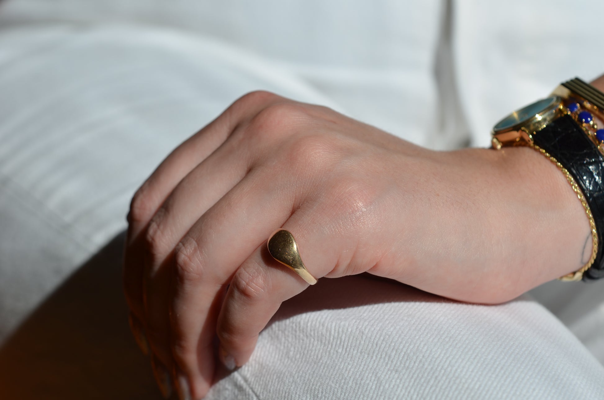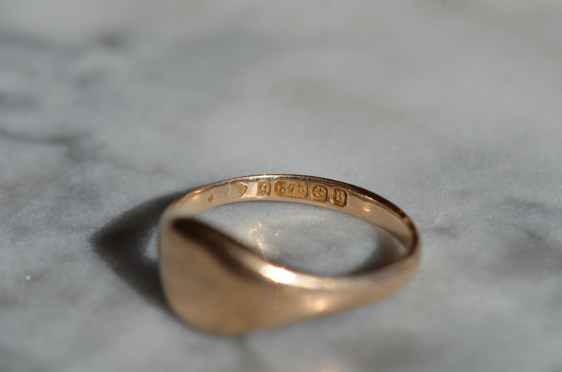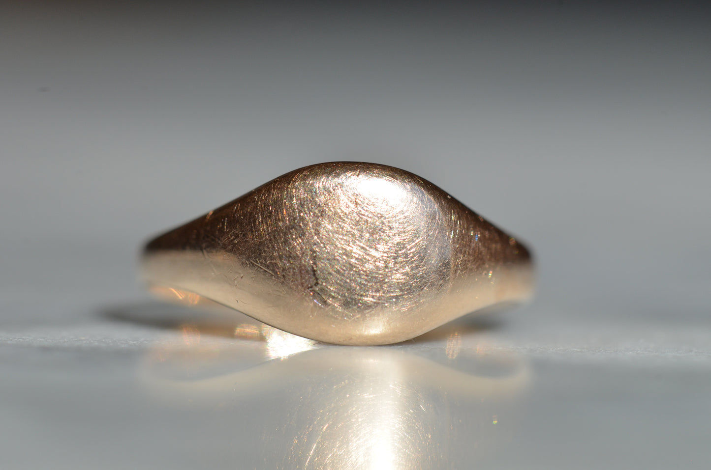 A rich and smooth ring, this piece is like a pat of butter for your finger (only so much better). There's something about a signet ring worn smooth like this that always tugs on our heart strings: the love that a previous caretaker had for this ring is evident in its wear, in the way that day to day life has left a beautiful smooth patina and just a suggestion of the letters that were once so carefully engraved.