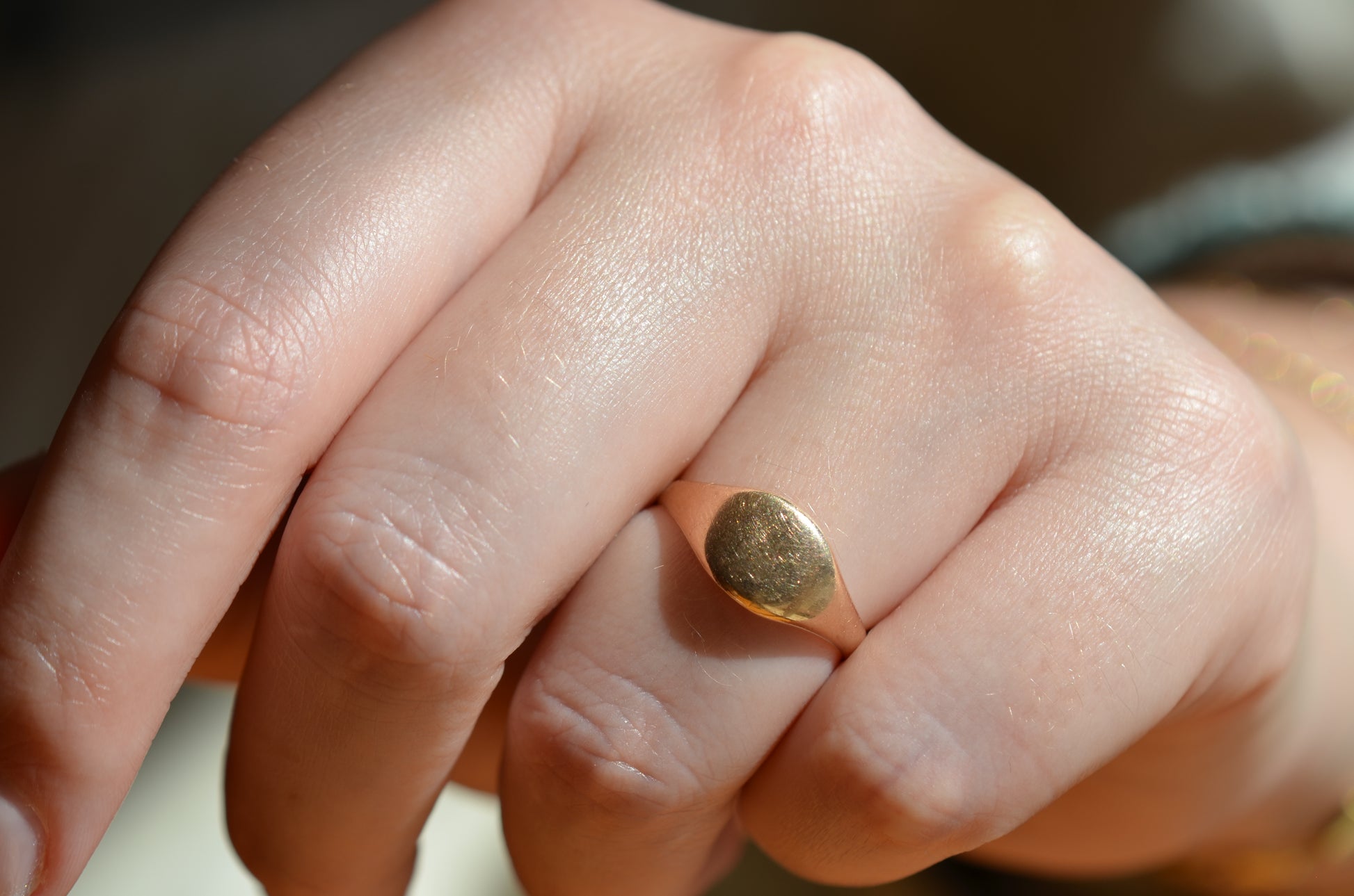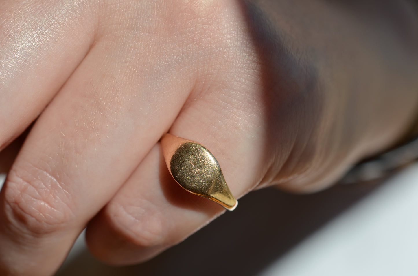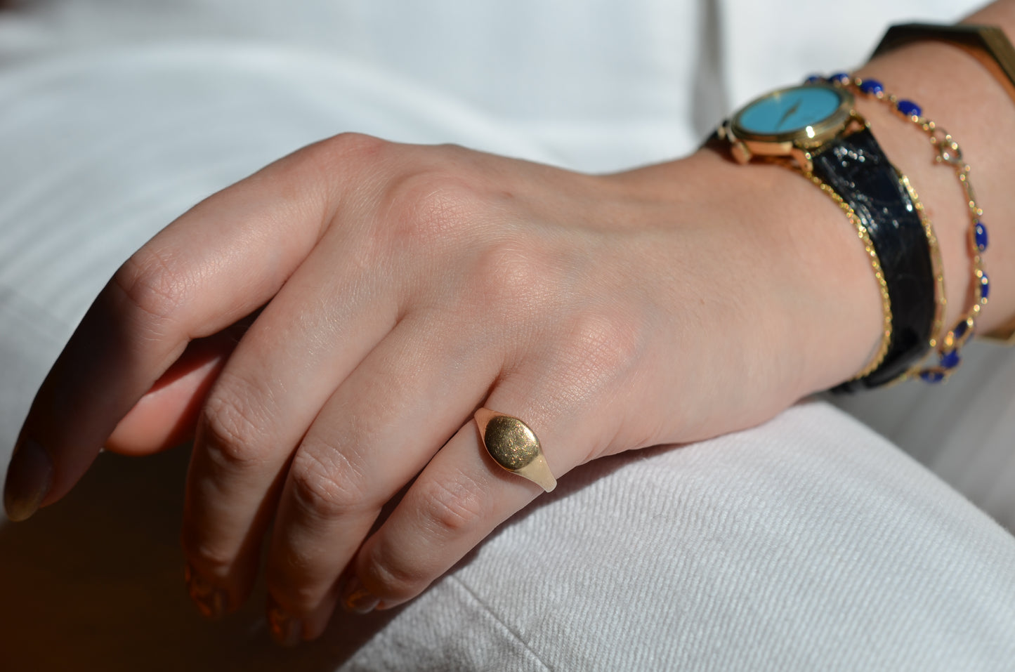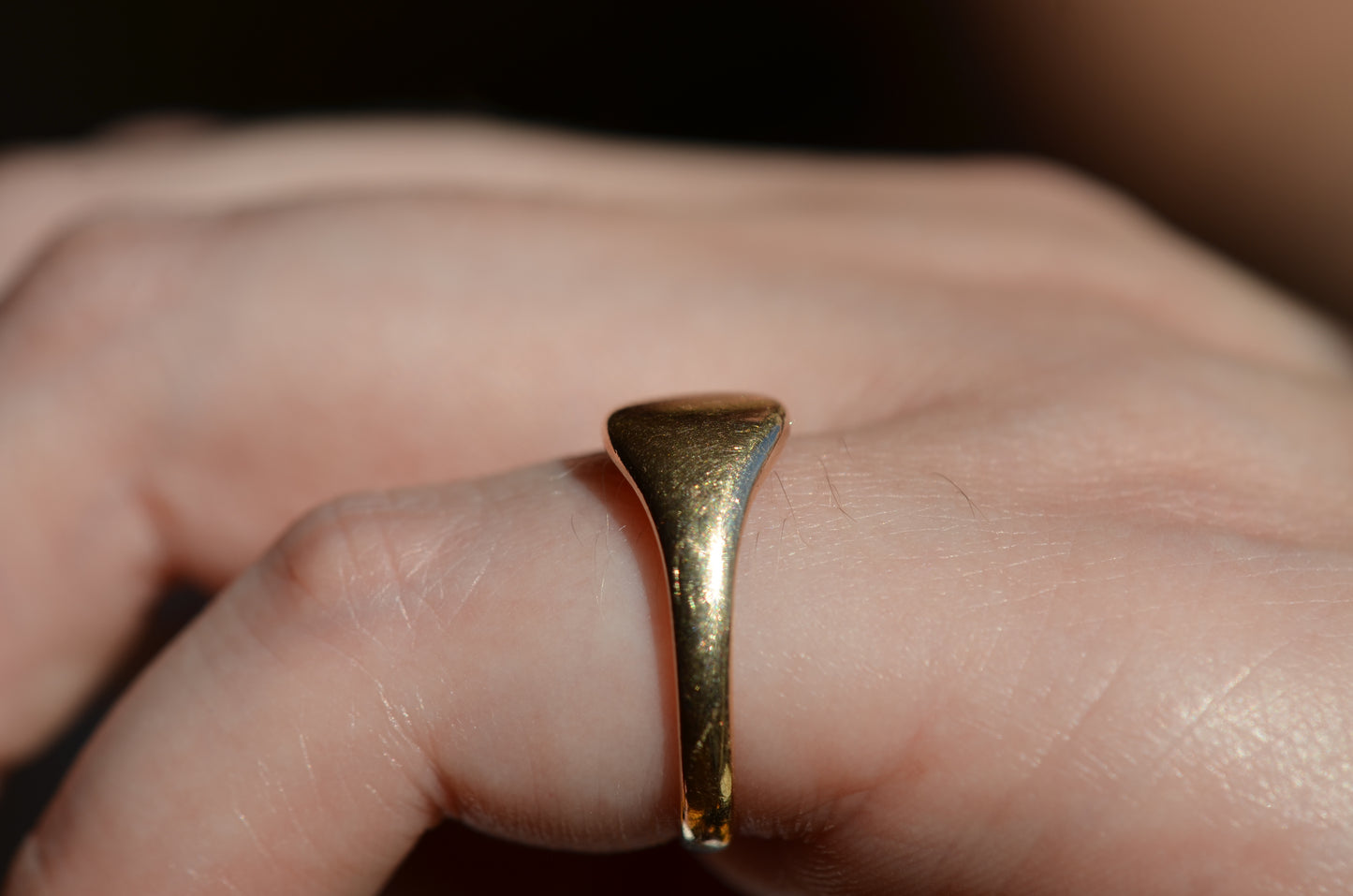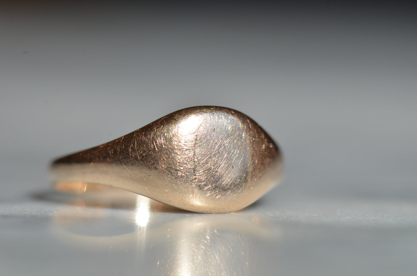 A rich and smooth ring, this piece is like a pat of butter for your finger (only so much better). There's something about a signet ring worn smooth like this that always tugs on our heart strings: the love that a previous caretaker had for this ring is evident in its wear, in the way that day to day life has left a beautiful smooth patina and just a suggestion of the letters that were once so carefully engraved.