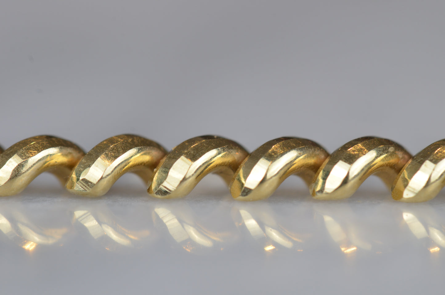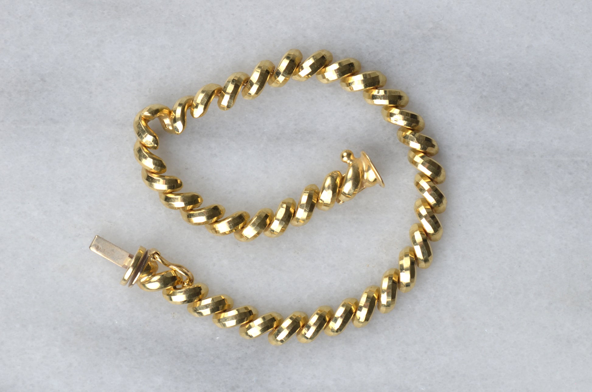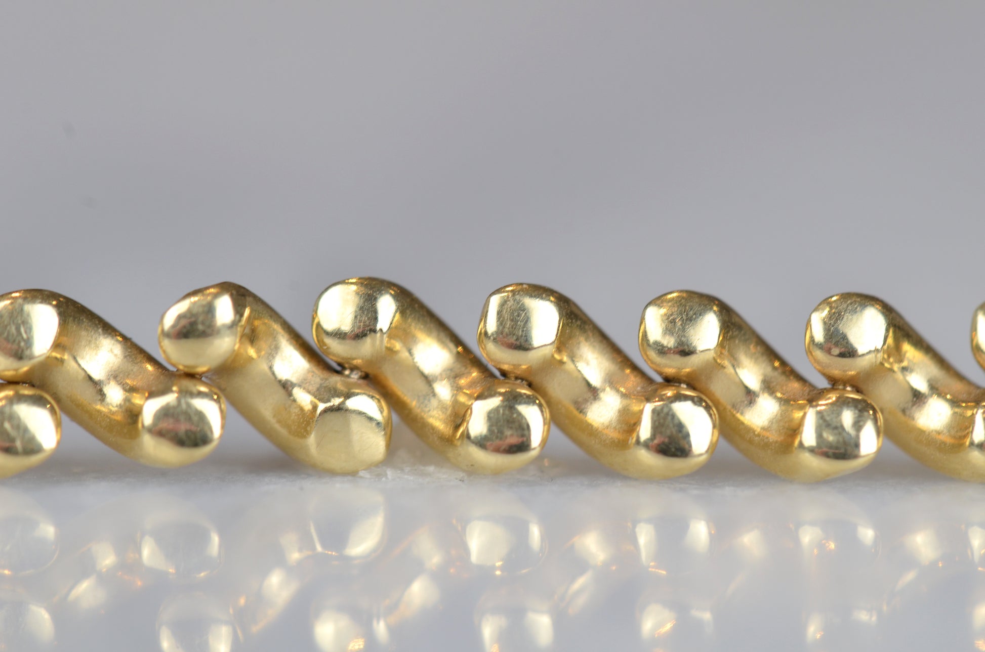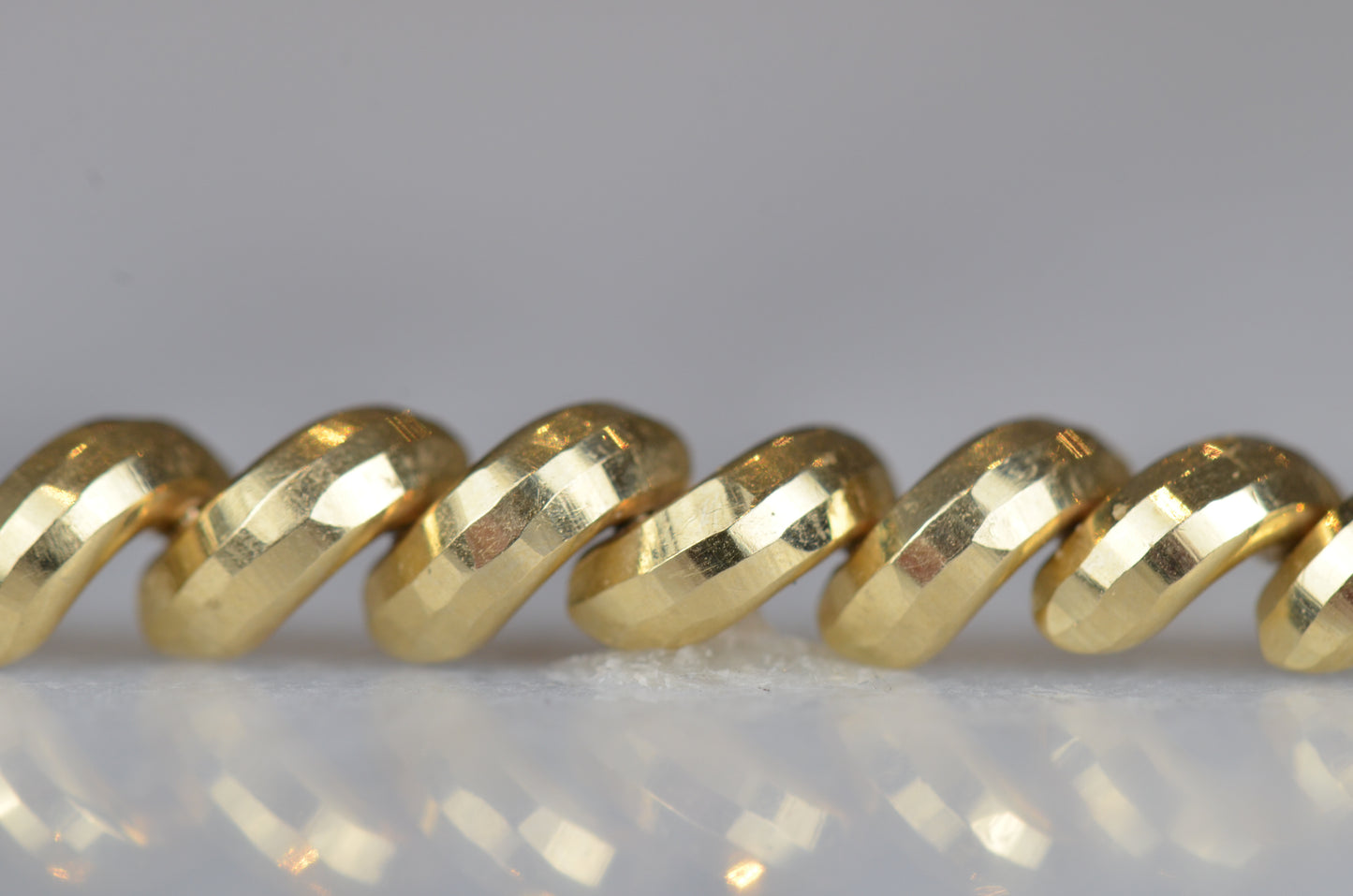 A gorgeous and covetable San Marco style bracelet with shimmering facets and perfectly puffed links. Affectionately called "macaroni" bracelets for their resemblance to the iconic noodle, this style of link was a mainstay of the 1980s and 1990s and has made a fierce comeback. To be expected from their era, they provide a lot of look for a more minimal weight, with hollow formed links, but by no means feel insubstantial. You'll love the way the sun hits these curves and will no doubt be wearing it day in and day out.