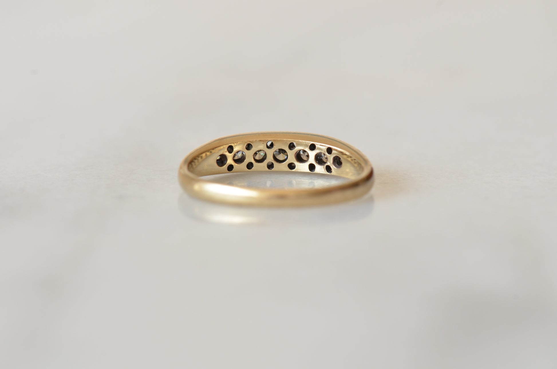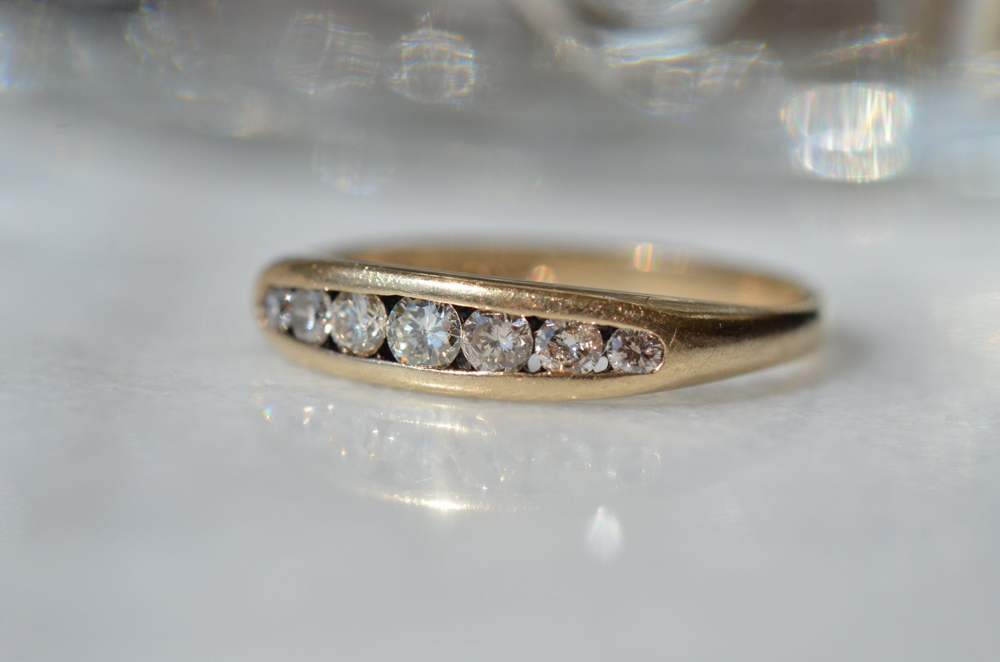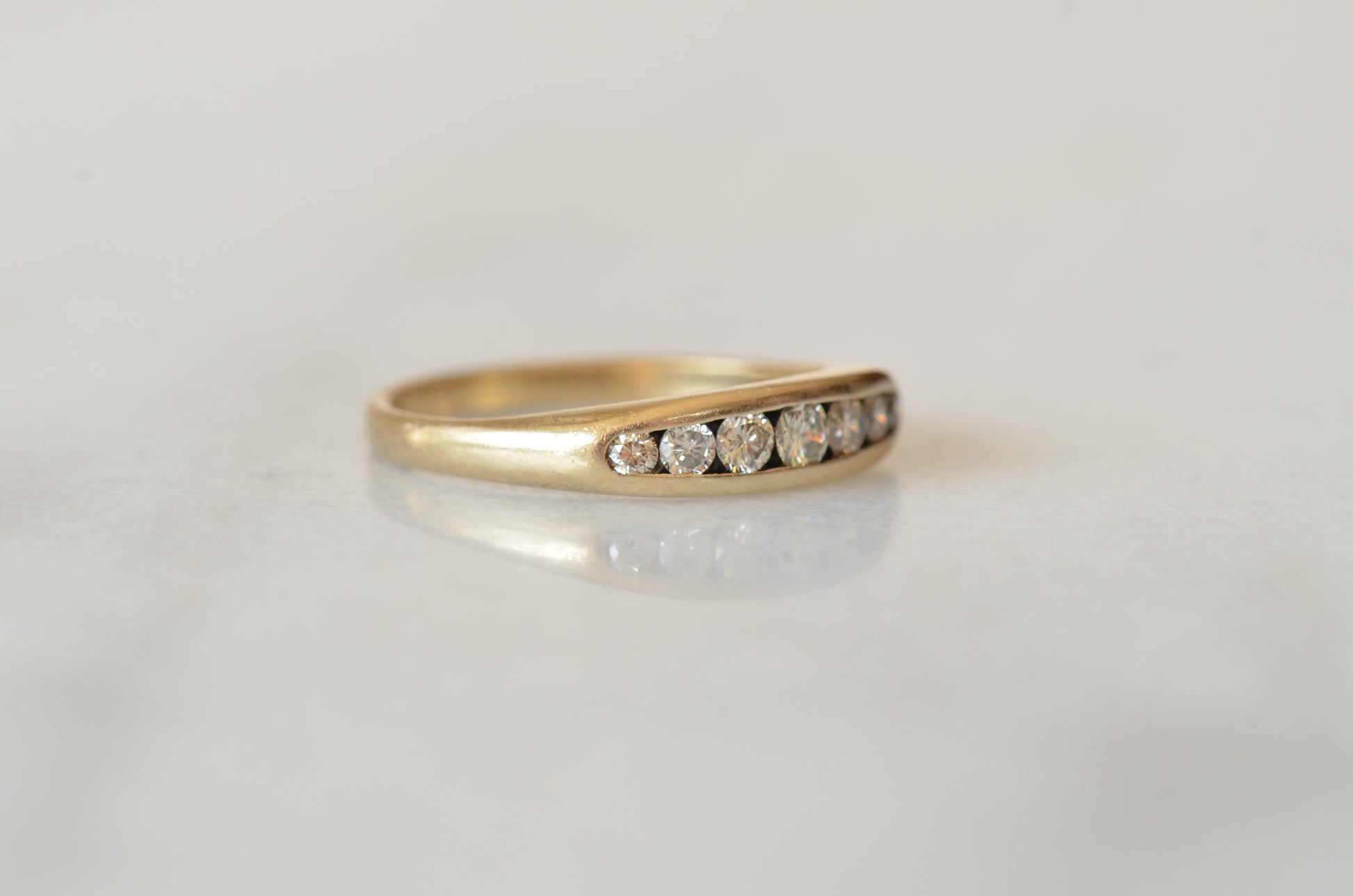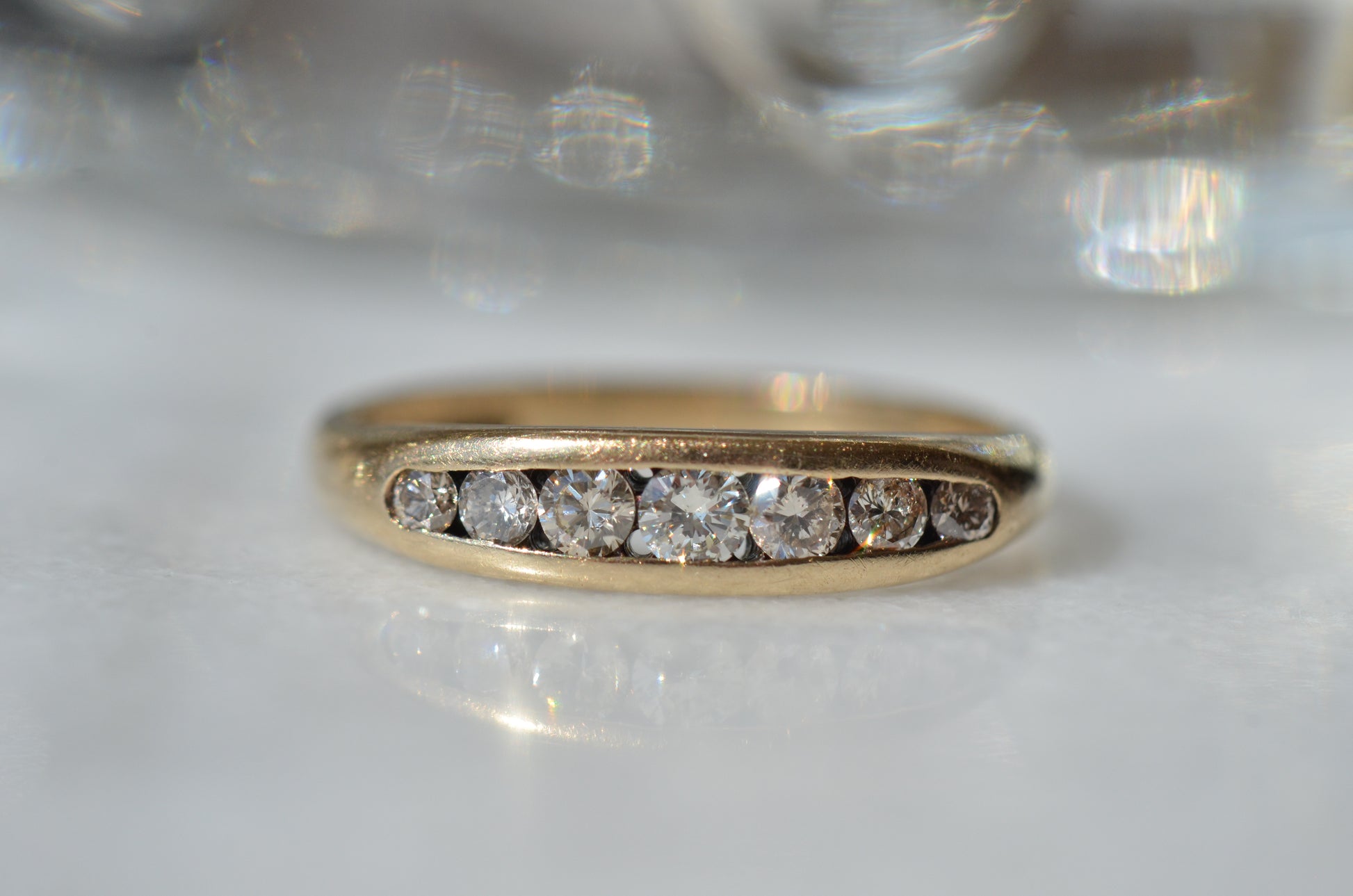 Simple and classic, this is a perfect no fuss ring for someone looking for durability, easy wearing, and a ton of sparkle! Seven subtly graduated diamonds line up in a clean channel setting that keeps them ultra low rise and easy to stack or wear alone. A hidden design detail of rounded ajoured openings in the back give it a little flair off the finger and make it easy to clean and keep those diamonds sparkling. This ring would make a perfect everyday band, wedding ring, or even a unique engagement ring perfect for someone with an active lifestyle who doesn't want the hassle of a solitaire ring popping up and catching.