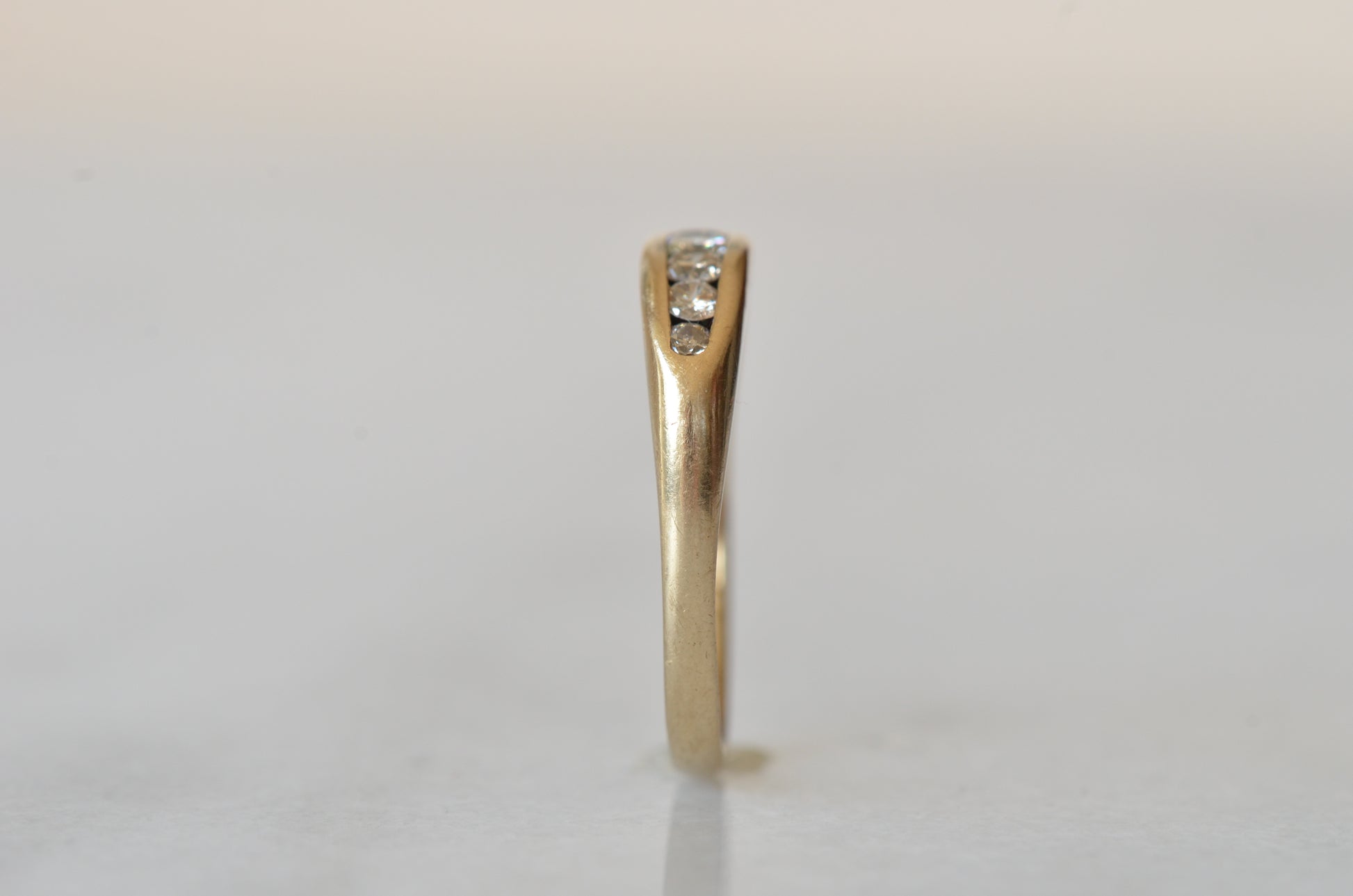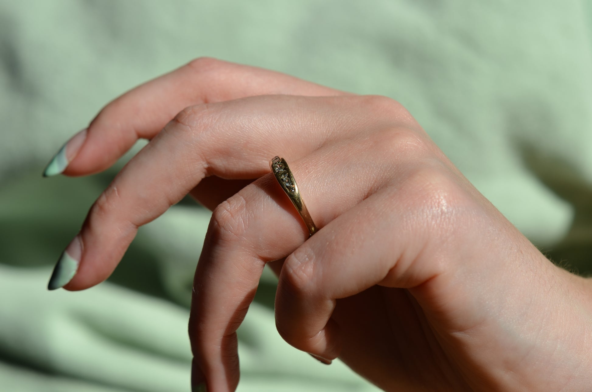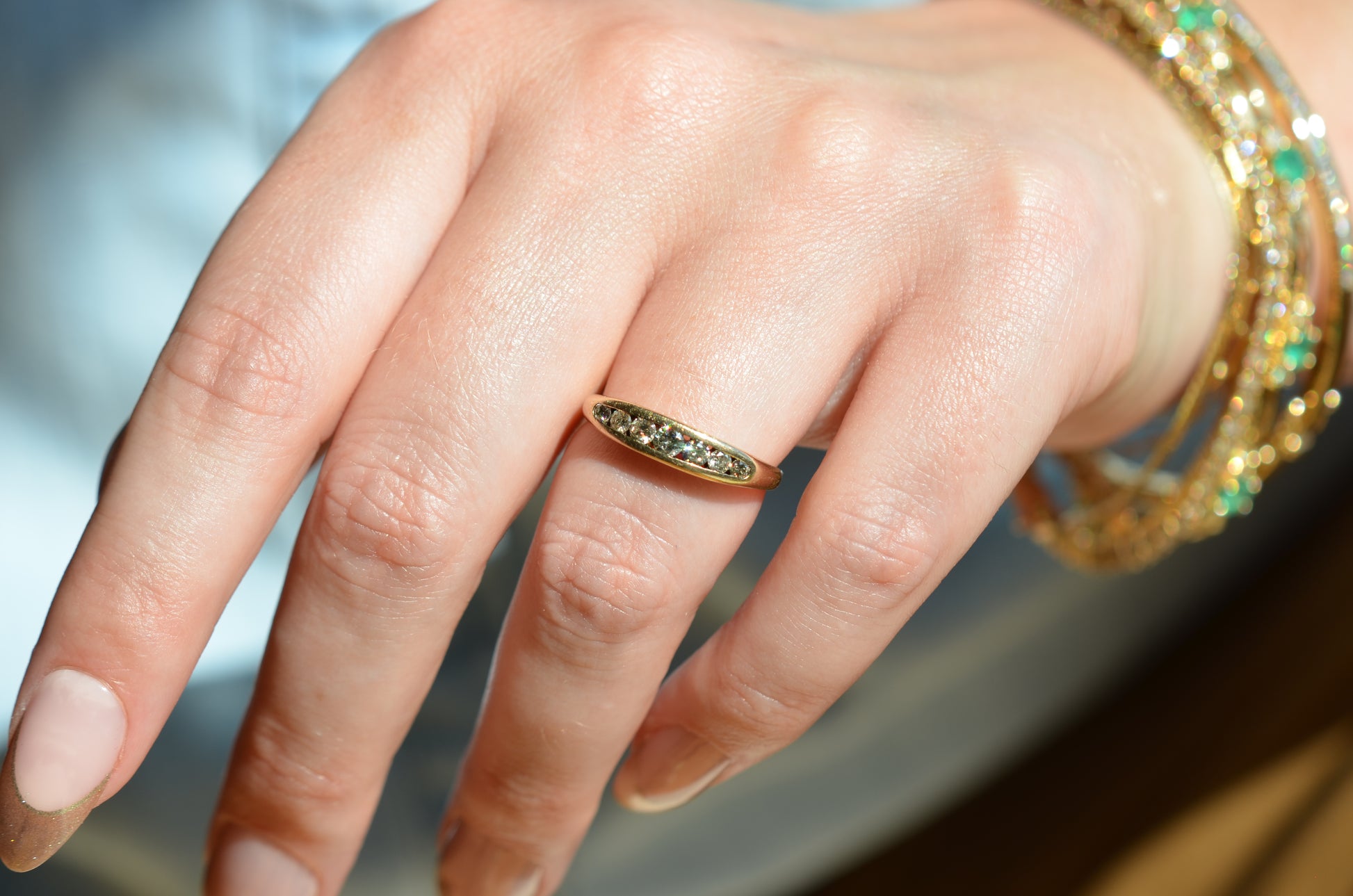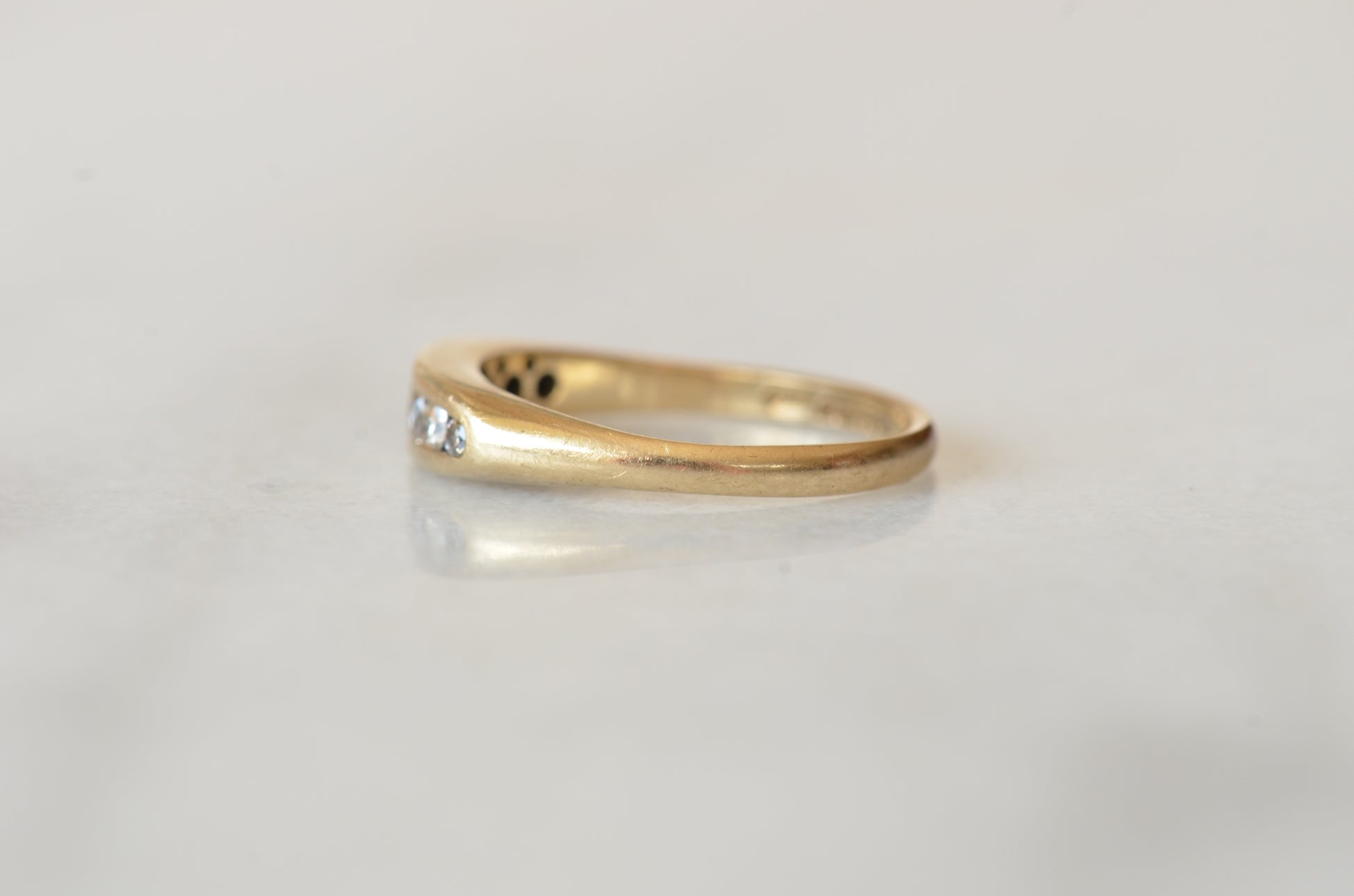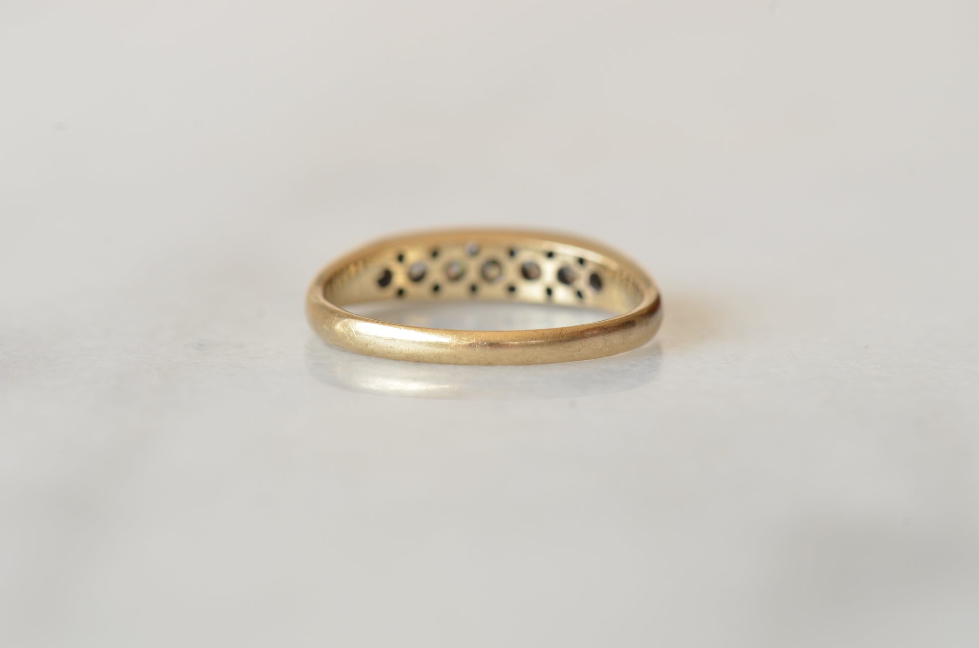 Simple and classic, this is a perfect no fuss ring for someone looking for durability, easy wearing, and a ton of sparkle! Seven subtly graduated diamonds line up in a clean channel setting that keeps them ultra low rise and easy to stack or wear alone. A hidden design detail of rounded ajoured openings in the back give it a little flair off the finger and make it easy to clean and keep those diamonds sparkling. This ring would make a perfect everyday band, wedding ring, or even a unique engagement ring perfect for someone with an active lifestyle who doesn't want the hassle of a solitaire ring popping up and catching.