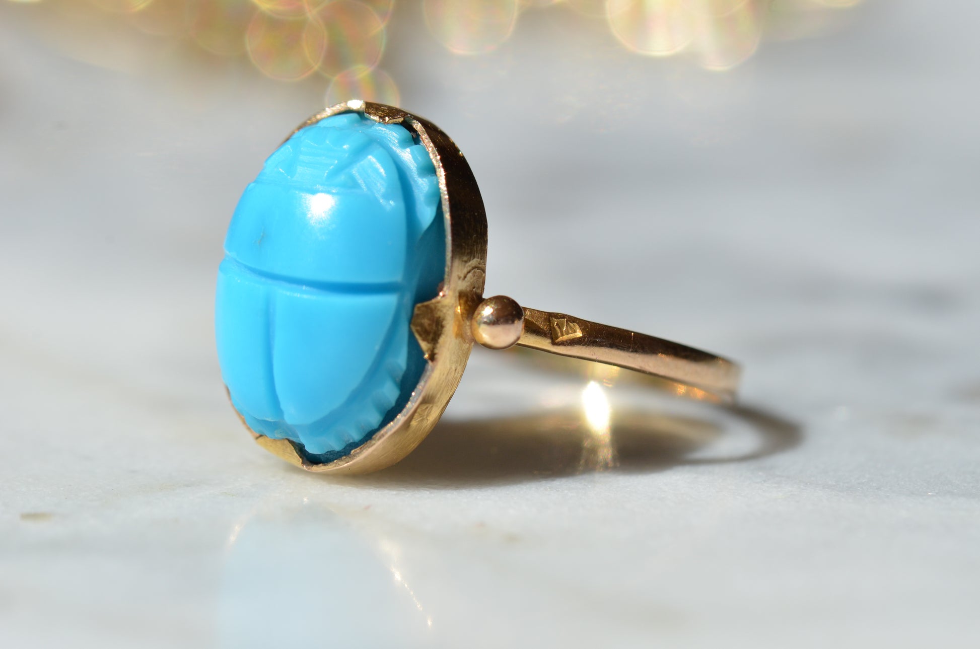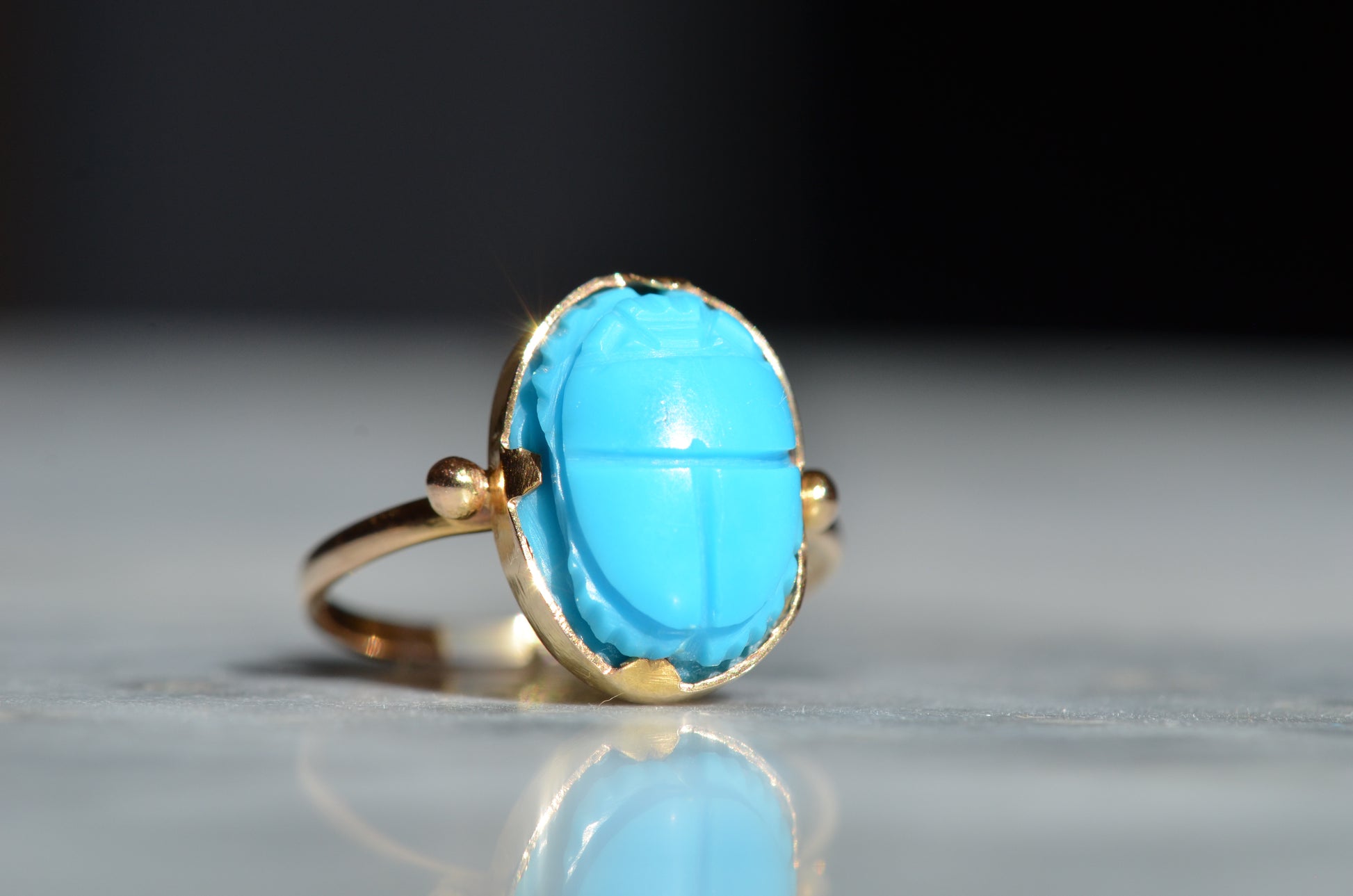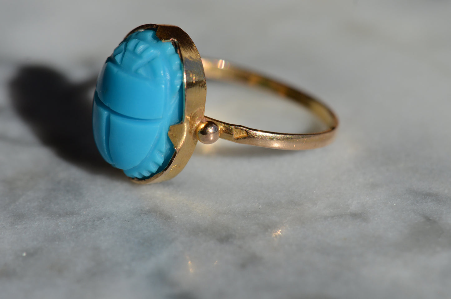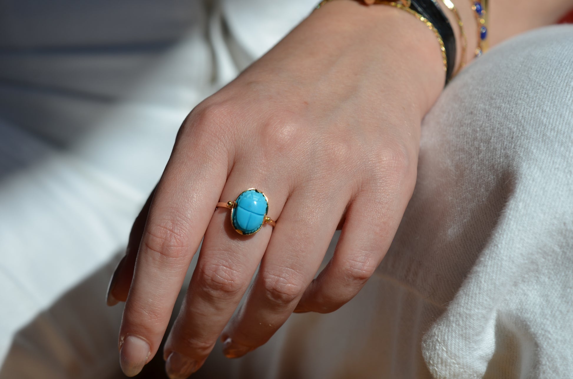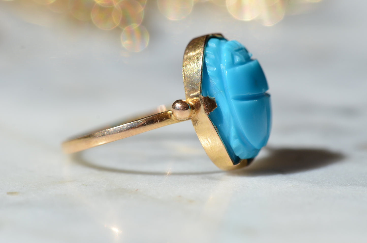 This bright and breathtaking ring - part of the late mid century Egyptian revival - features a vivid turquoise carved as a scarab set in high karat gold. The scarab (a dung beetle!) was revered in ancient Egypt as representing the cycle of rebirth - a symbol of immortality, of transformation, and of resurrection. We love the aesthetic, but we also love the idea of this powerful motif reminding us that through change we continue on day after day.