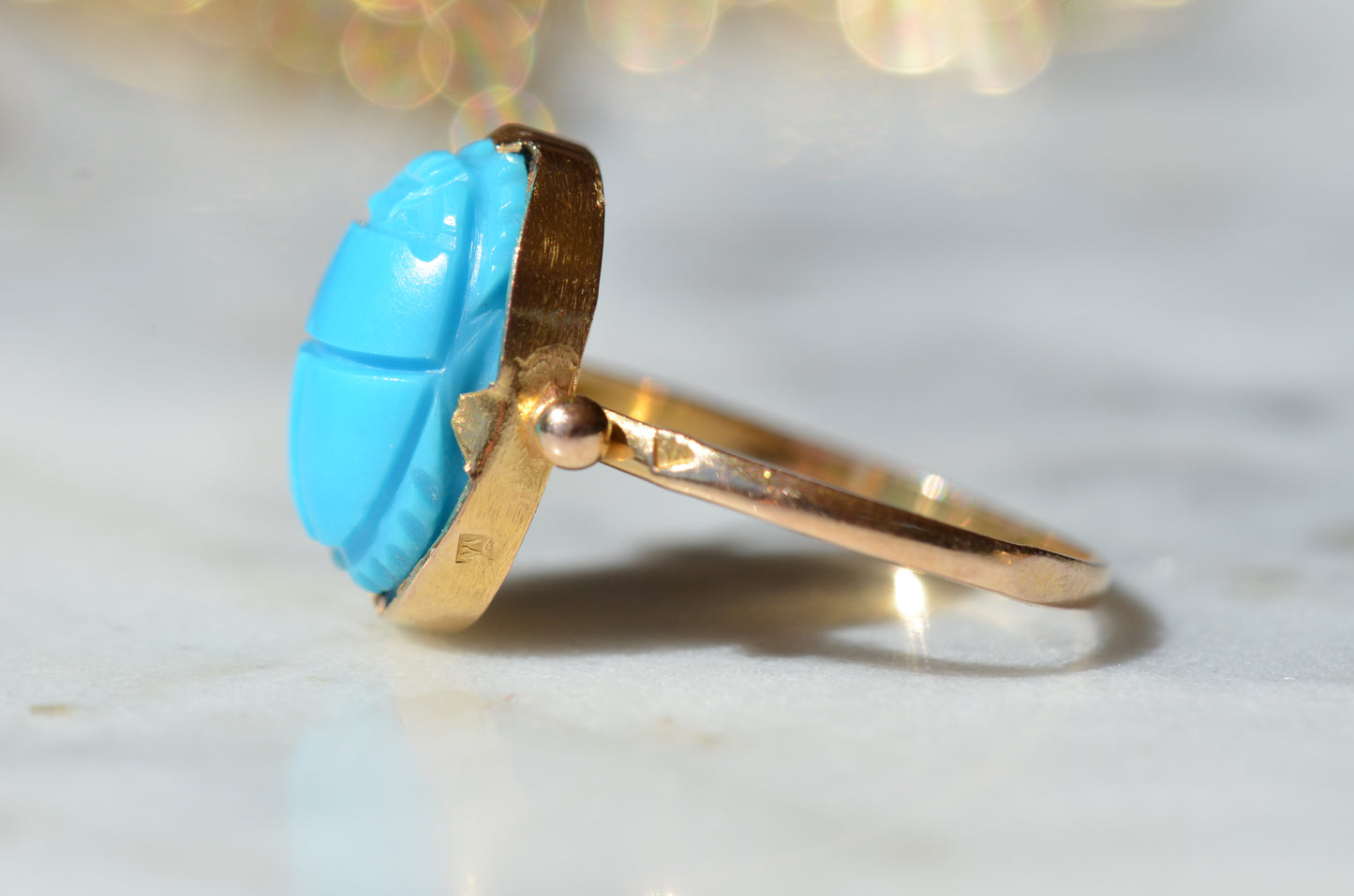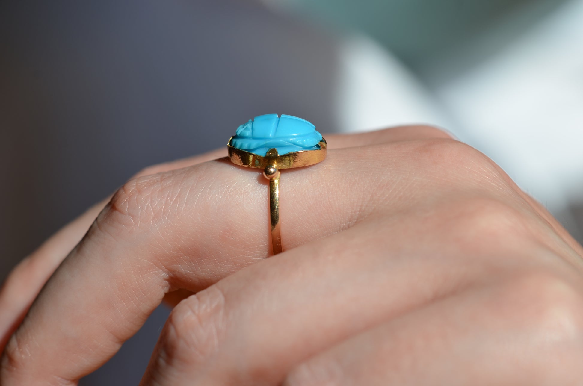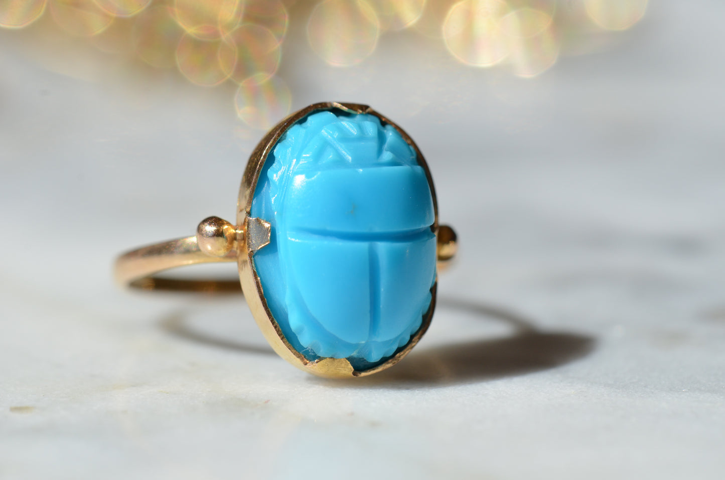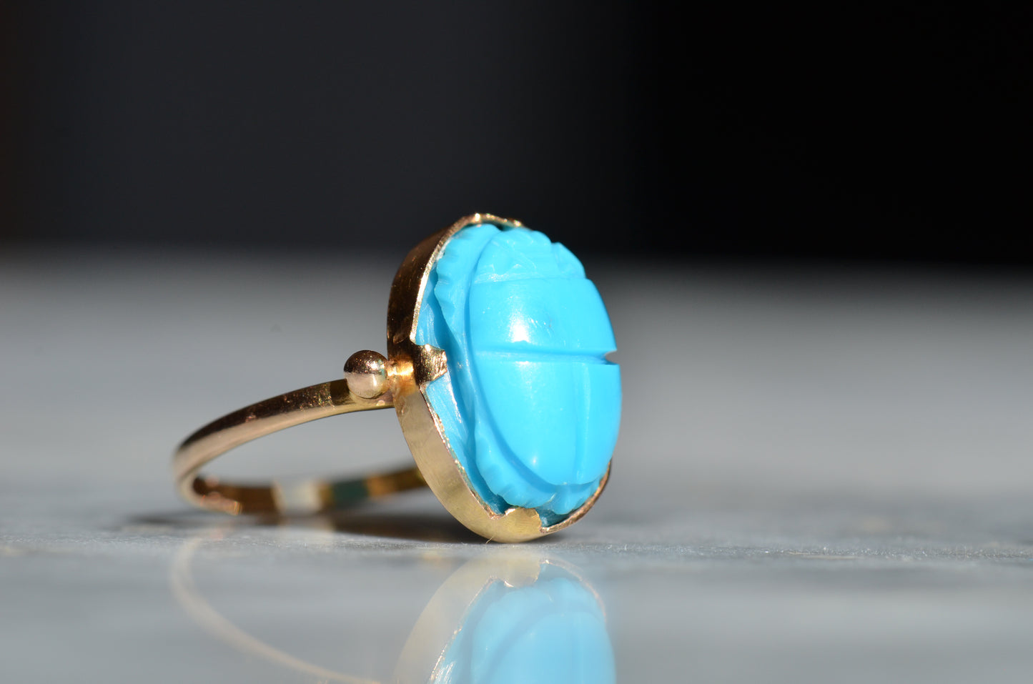 This bright and breathtaking ring - part of the late mid century Egyptian revival - features a vivid turquoise carved as a scarab set in high karat gold. The scarab (a dung beetle!) was revered in ancient Egypt as representing the cycle of rebirth - a symbol of immortality, of transformation, and of resurrection. We love the aesthetic, but we also love the idea of this powerful motif reminding us that through change we continue on day after day.