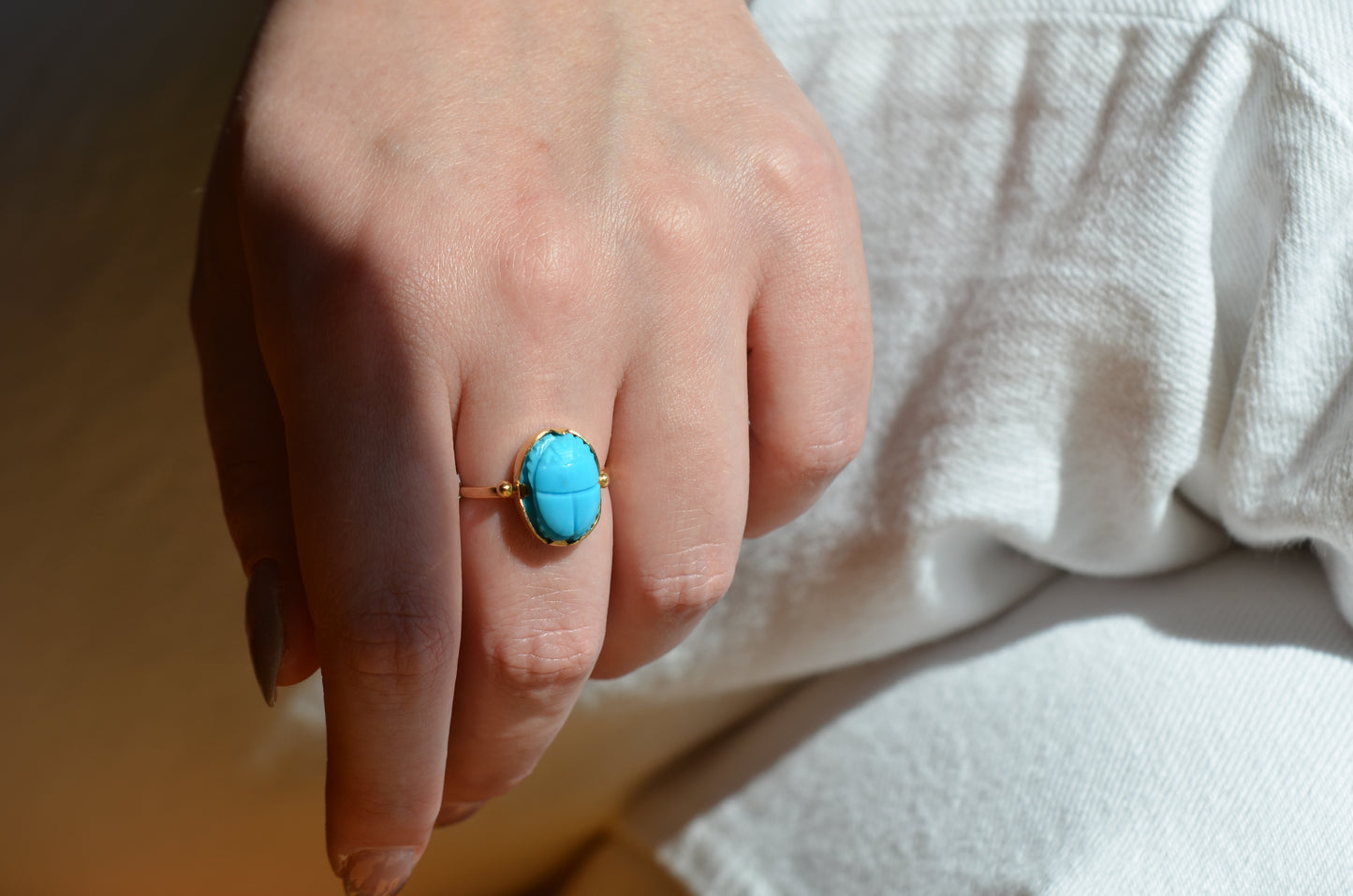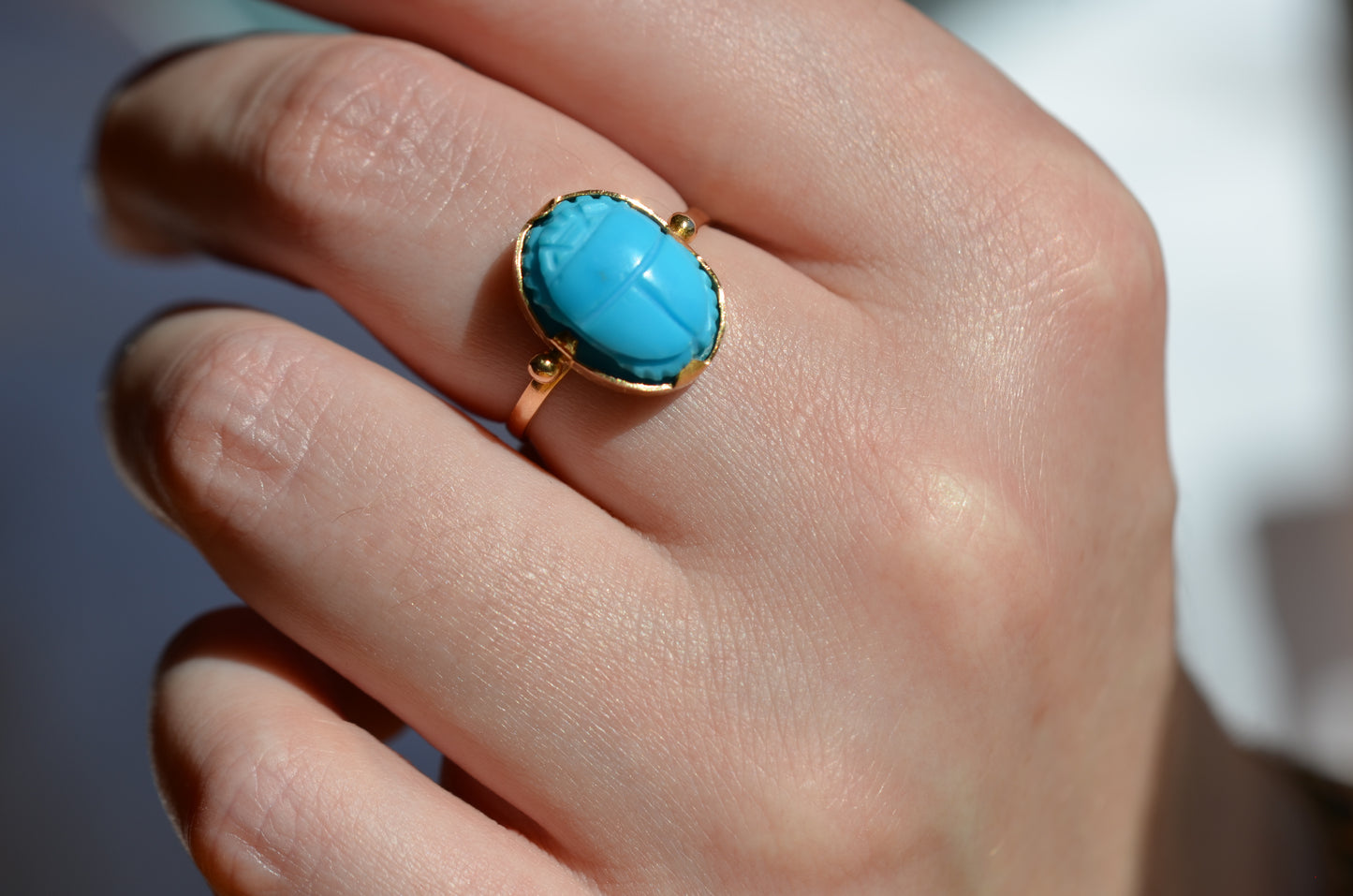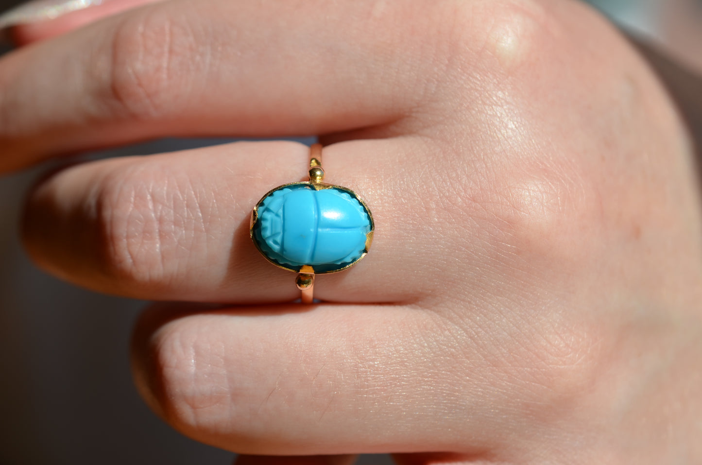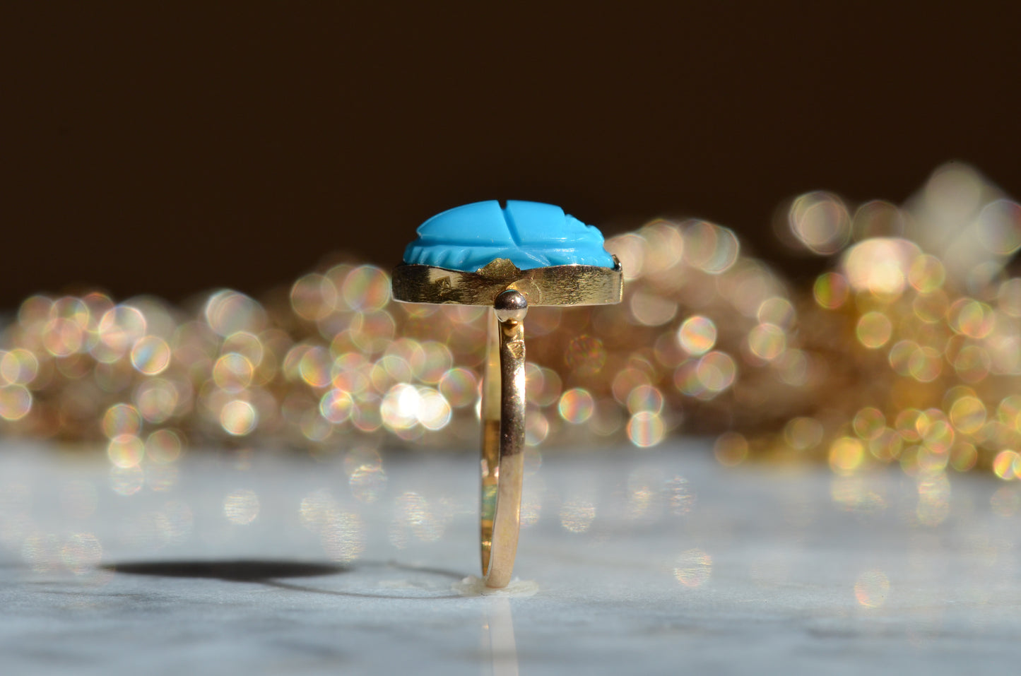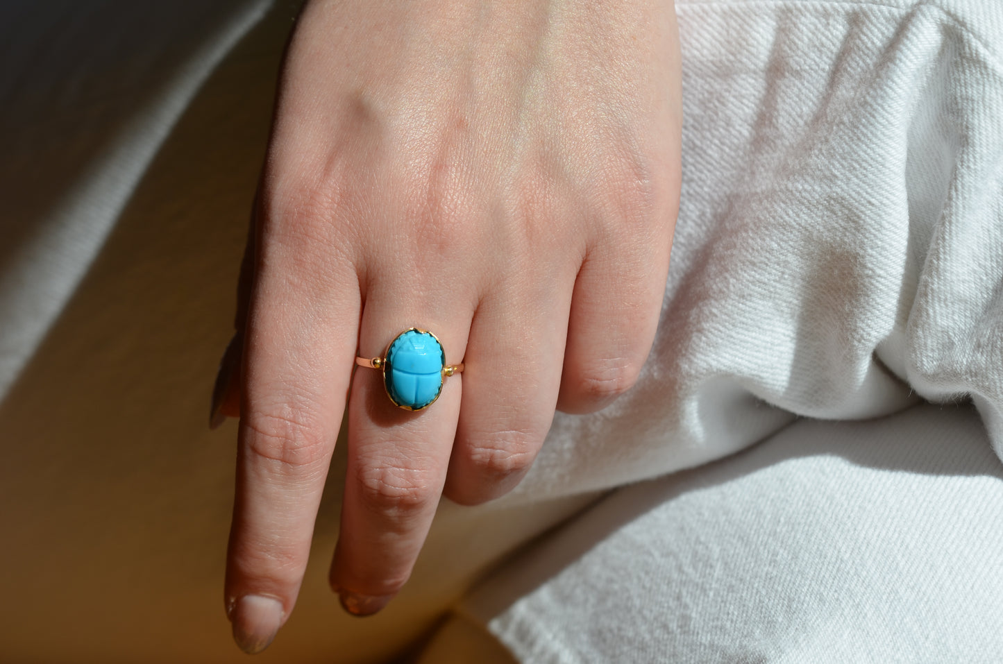 This bright and breathtaking ring - part of the late mid century Egyptian revival - features a vivid turquoise carved as a scarab set in high karat gold. The scarab (a dung beetle!) was revered in ancient Egypt as representing the cycle of rebirth - a symbol of immortality, of transformation, and of resurrection. We love the aesthetic, but we also love the idea of this powerful motif reminding us that through change we continue on day after day.