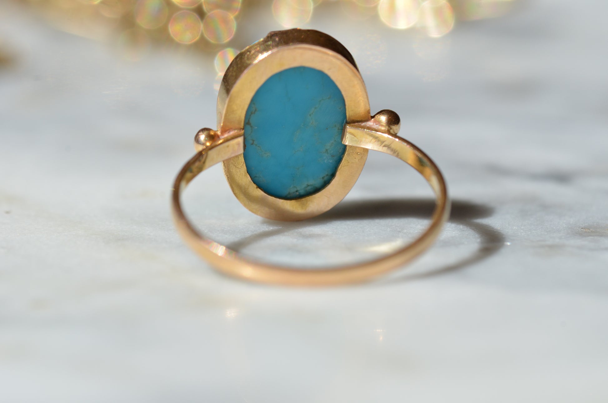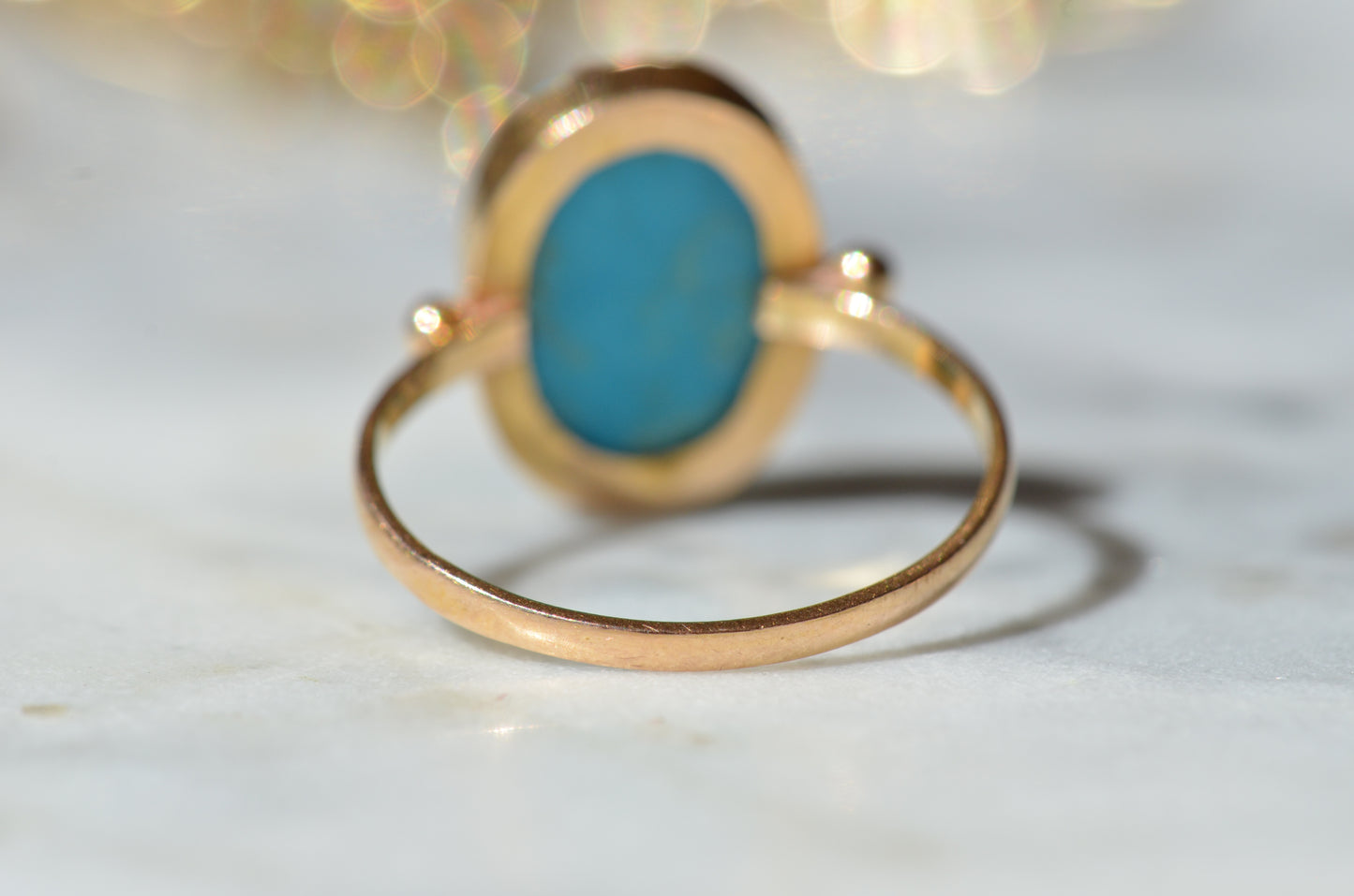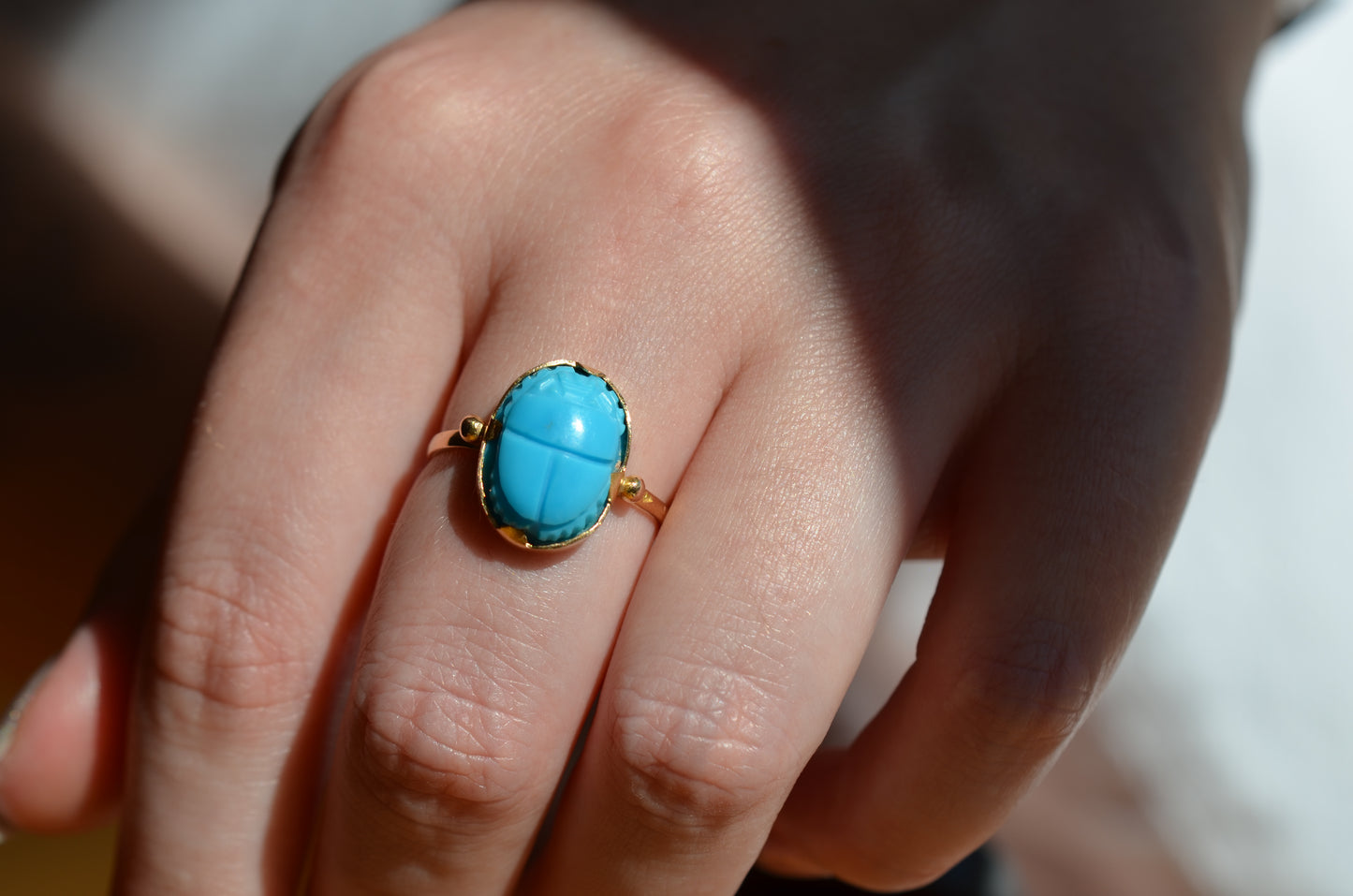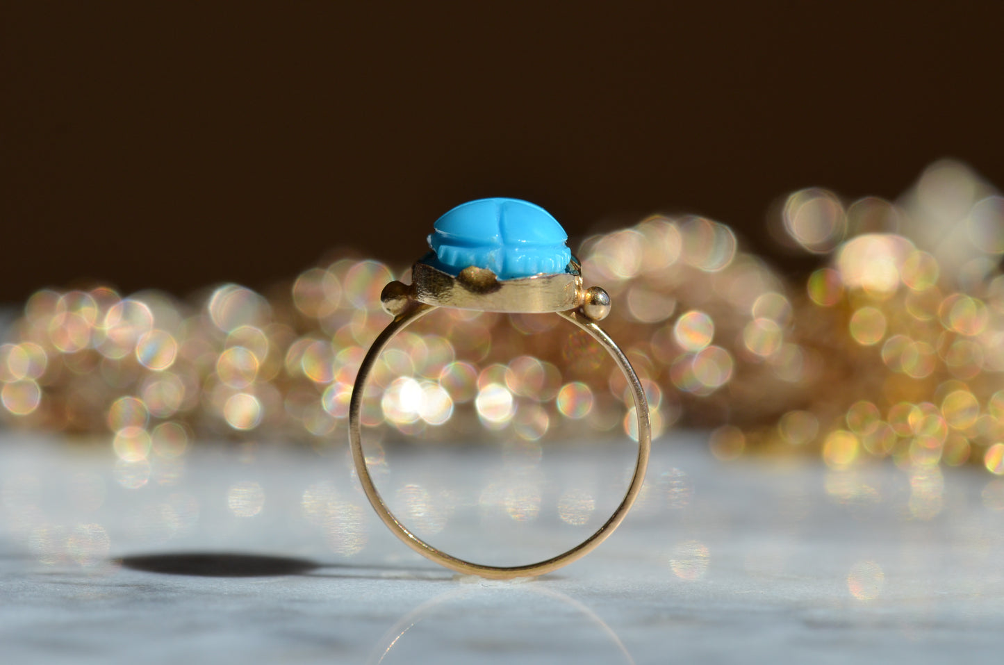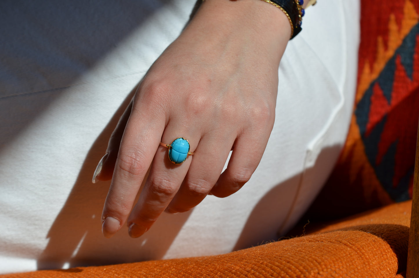 This bright and breathtaking ring - part of the late mid century Egyptian revival - features a vivid turquoise carved as a scarab set in high karat gold. The scarab (a dung beetle!) was revered in ancient Egypt as representing the cycle of rebirth - a symbol of immortality, of transformation, and of resurrection. We love the aesthetic, but we also love the idea of this powerful motif reminding us that through change we continue on day after day.