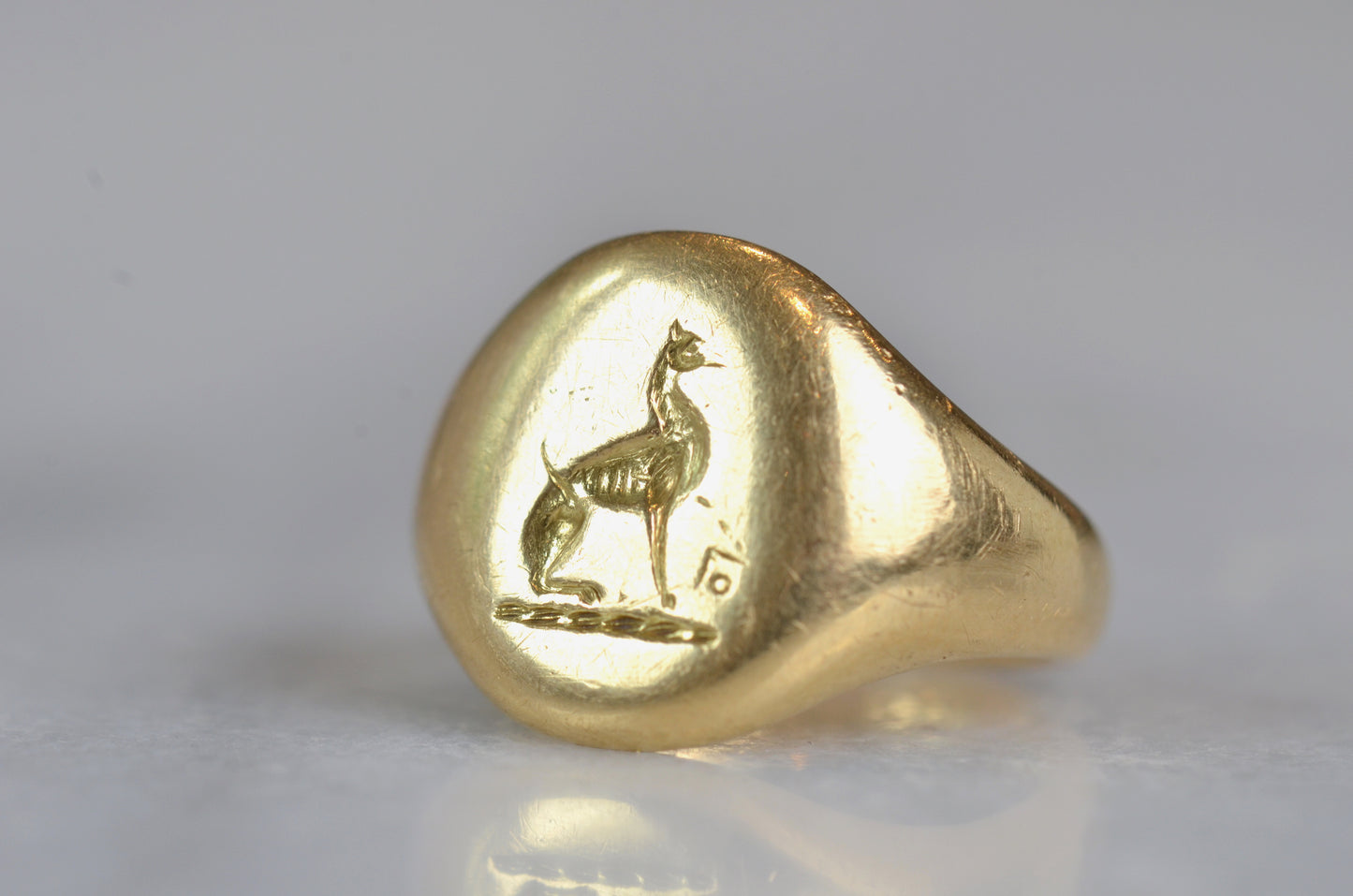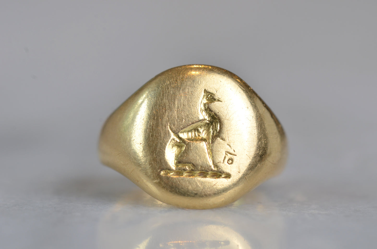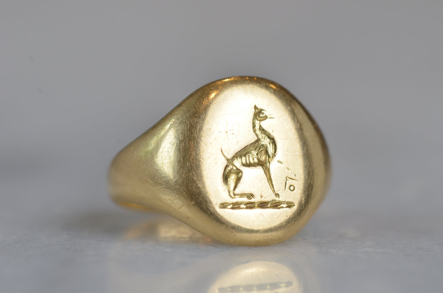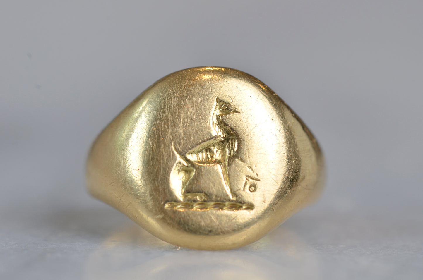 This beautiful and heavyweight signet ring is made all the more charming by the smoothing and wear to its face: this was a ring that was loved and worn, and you're sure to find yourself compelled to the same! Engraved on the face is a seated greyhound, with single front paw lifted at a figure whose detail is mostly lost. The dog's athletic form and slim, streamlined tail curled up past its haunch are plainly evidence in the depth and care taken in detailing the engraving. While we've yet to track down the family or organization this fine ring is associated with, it obviously held great sentimental value. In general, dogs have been used for thousands of years on crests and in heraldry to connote loyalty and integrity.