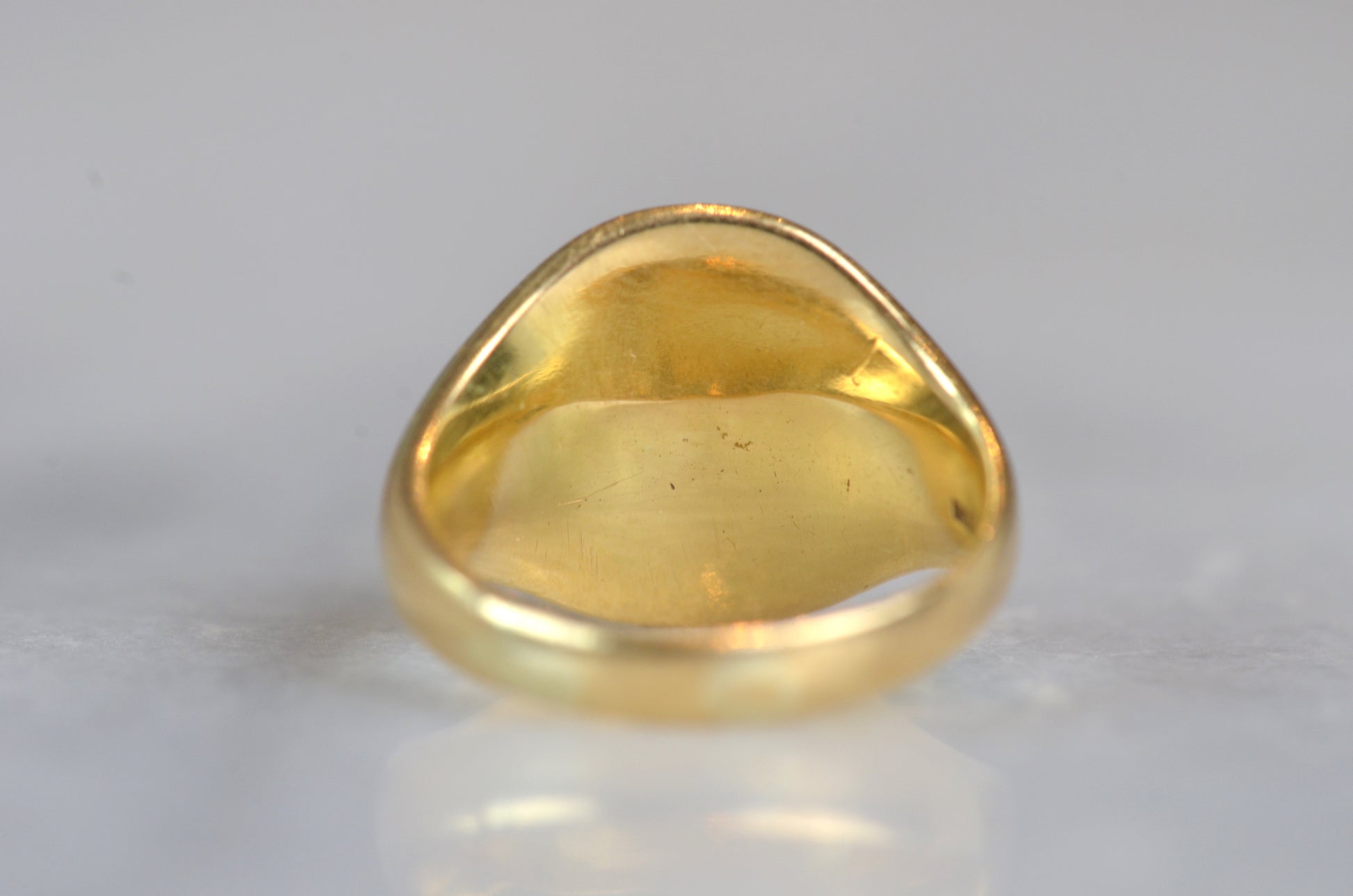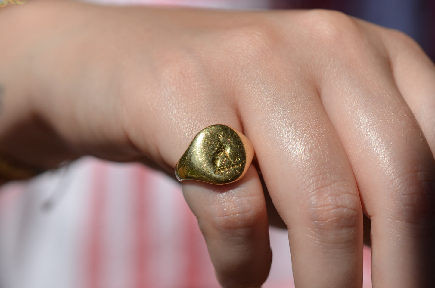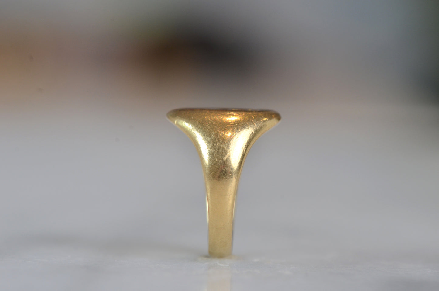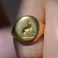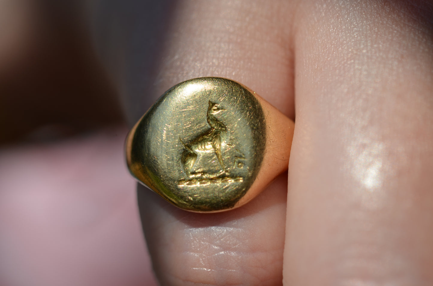 This beautiful and heavyweight signet ring is made all the more charming by the smoothing and wear to its face: this was a ring that was loved and worn, and you're sure to find yourself compelled to the same! Engraved on the face is a seated greyhound, with single front paw lifted at a figure whose detail is mostly lost. The dog's athletic form and slim, streamlined tail curled up past its haunch are plainly evidence in the depth and care taken in detailing the engraving. While we've yet to track down the family or organization this fine ring is associated with, it obviously held great sentimental value. In general, dogs have been used for thousands of years on crests and in heraldry to connote loyalty and integrity.