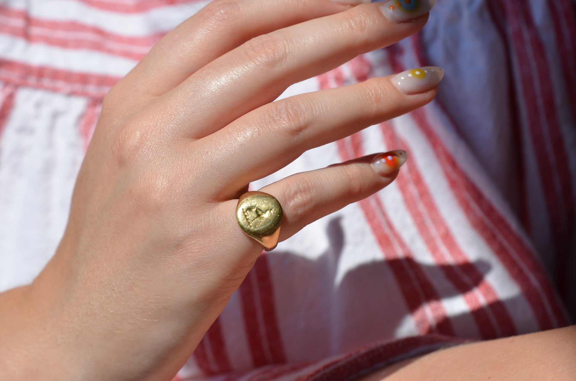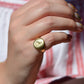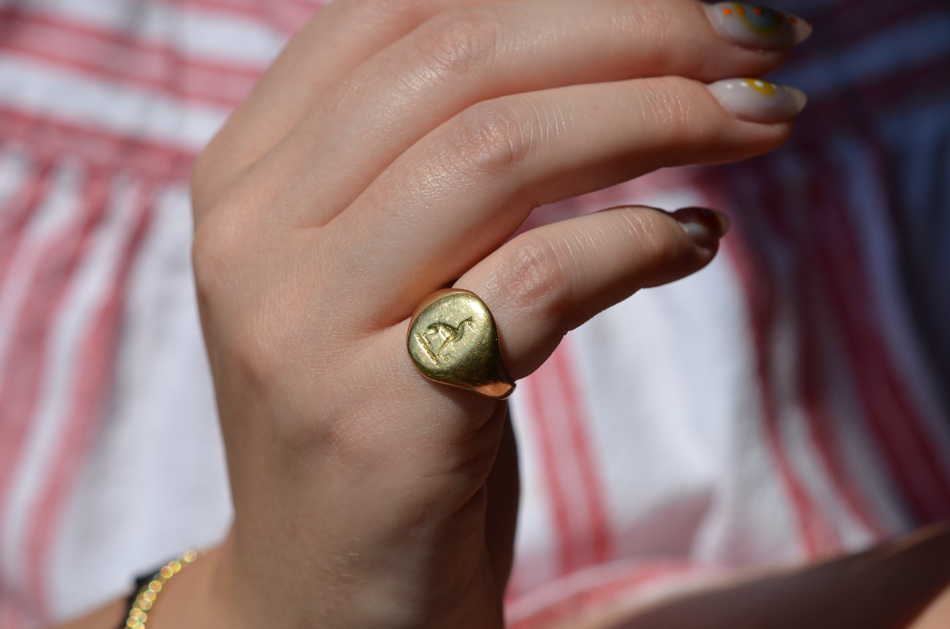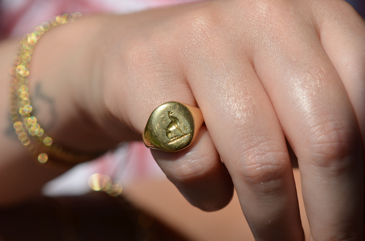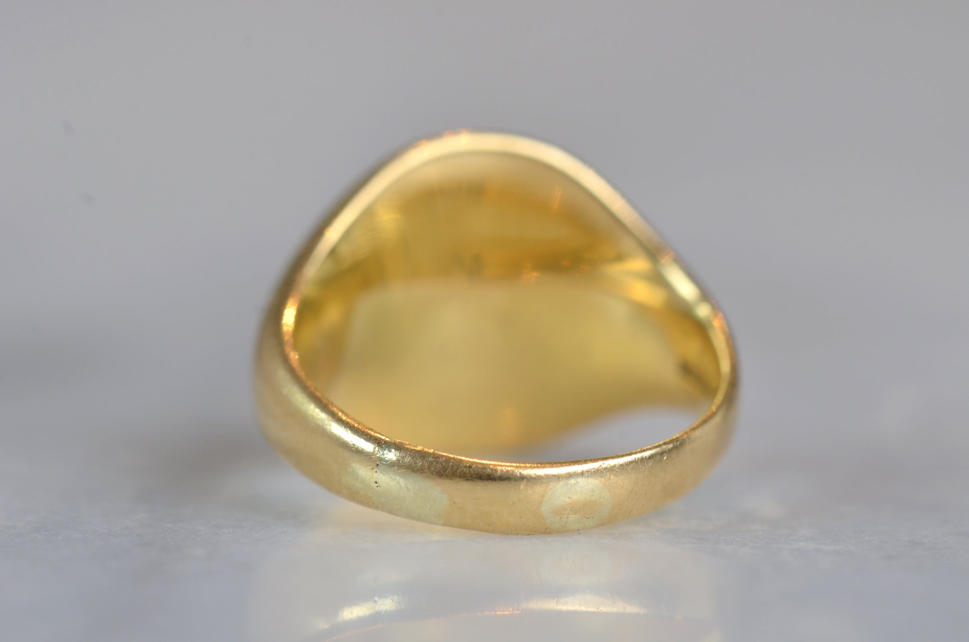 This beautiful and heavyweight signet ring is made all the more charming by the smoothing and wear to its face: this was a ring that was loved and worn, and you're sure to find yourself compelled to the same! Engraved on the face is a seated greyhound, with single front paw lifted at a figure whose detail is mostly lost. The dog's athletic form and slim, streamlined tail curled up past its haunch are plainly evidence in the depth and care taken in detailing the engraving. While we've yet to track down the family or organization this fine ring is associated with, it obviously held great sentimental value. In general, dogs have been used for thousands of years on crests and in heraldry to connote loyalty and integrity.