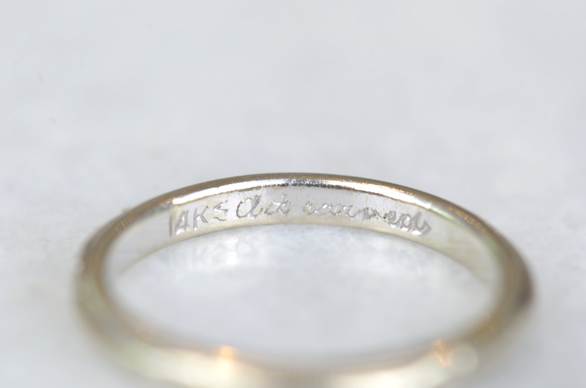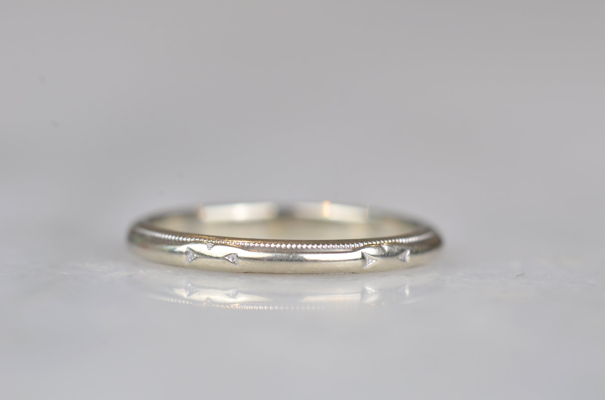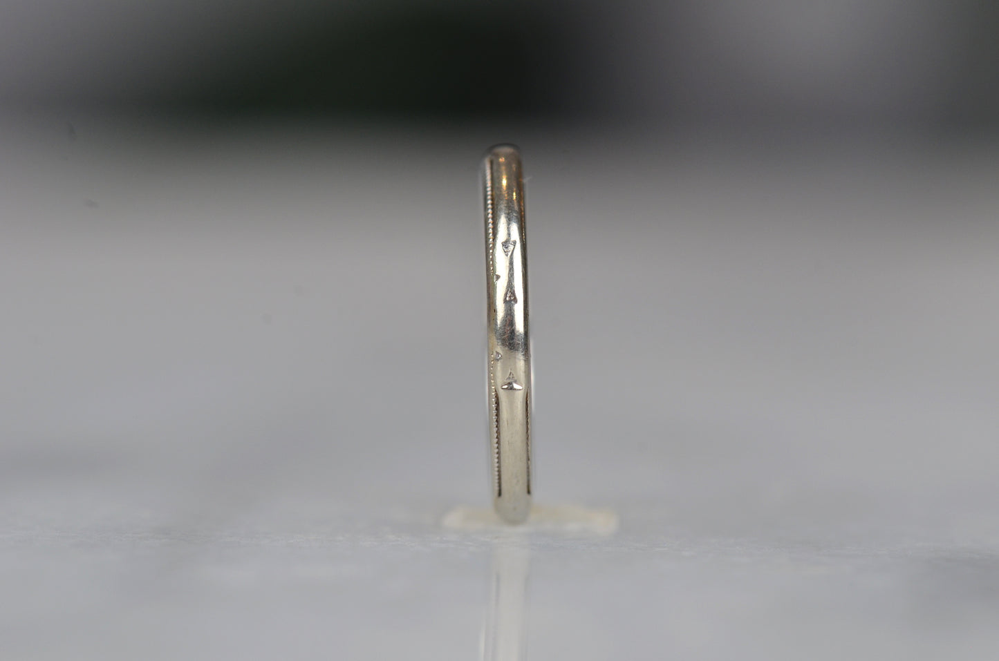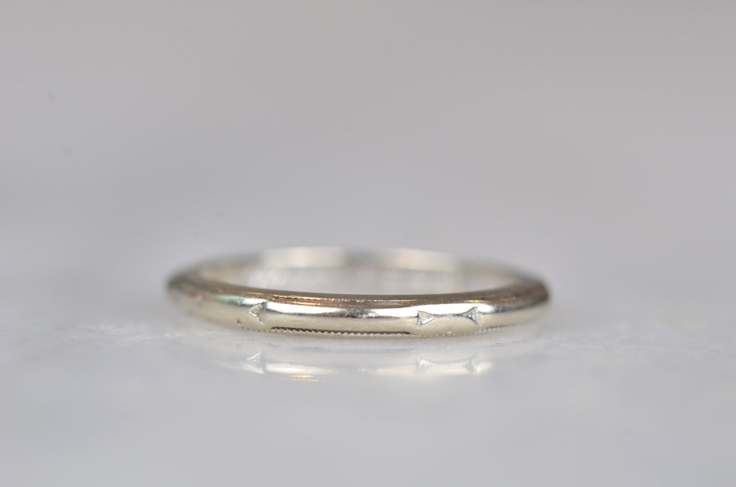 A beautiful wedding band that was clearly well-loved, evidenced by the worn orange blossom eternity engraving. While the tradition of gifting orange blossoms for a wedding reaches back to Greek and Roman mythology, naturally it was Queen Victoria who reignited the craze when she wore a wreath of orange blossoms in her wedding to Prince Albert. The flower has been said to represent fertility for its association with bearing fruit, purity for its white blossoms, and eternal love for its source on an evergreen tree. As such it was a well-loved motif for engraved and die-struck wedding bands, particularly in the Art Deco period, and continues to be used today to give modern jewelry a vintage feel.