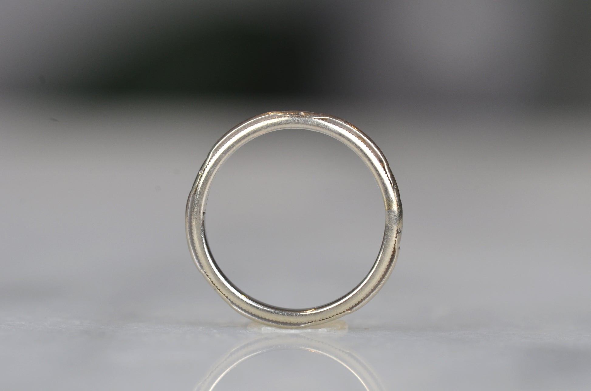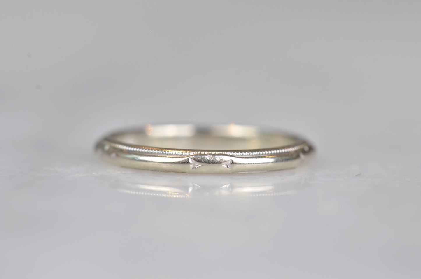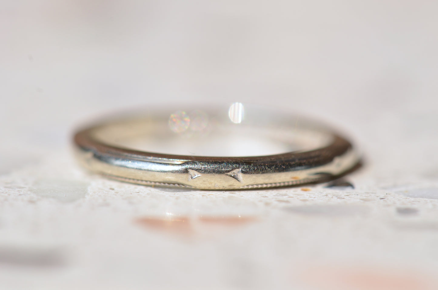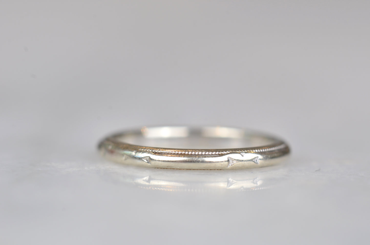 A beautiful wedding band that was clearly well-loved, evidenced by the worn orange blossom eternity engraving. While the tradition of gifting orange blossoms for a wedding reaches back to Greek and Roman mythology, naturally it was Queen Victoria who reignited the craze when she wore a wreath of orange blossoms in her wedding to Prince Albert. The flower has been said to represent fertility for its association with bearing fruit, purity for its white blossoms, and eternal love for its source on an evergreen tree. As such it was a well-loved motif for engraved and die-struck wedding bands, particularly in the Art Deco period, and continues to be used today to give modern jewelry a vintage feel.