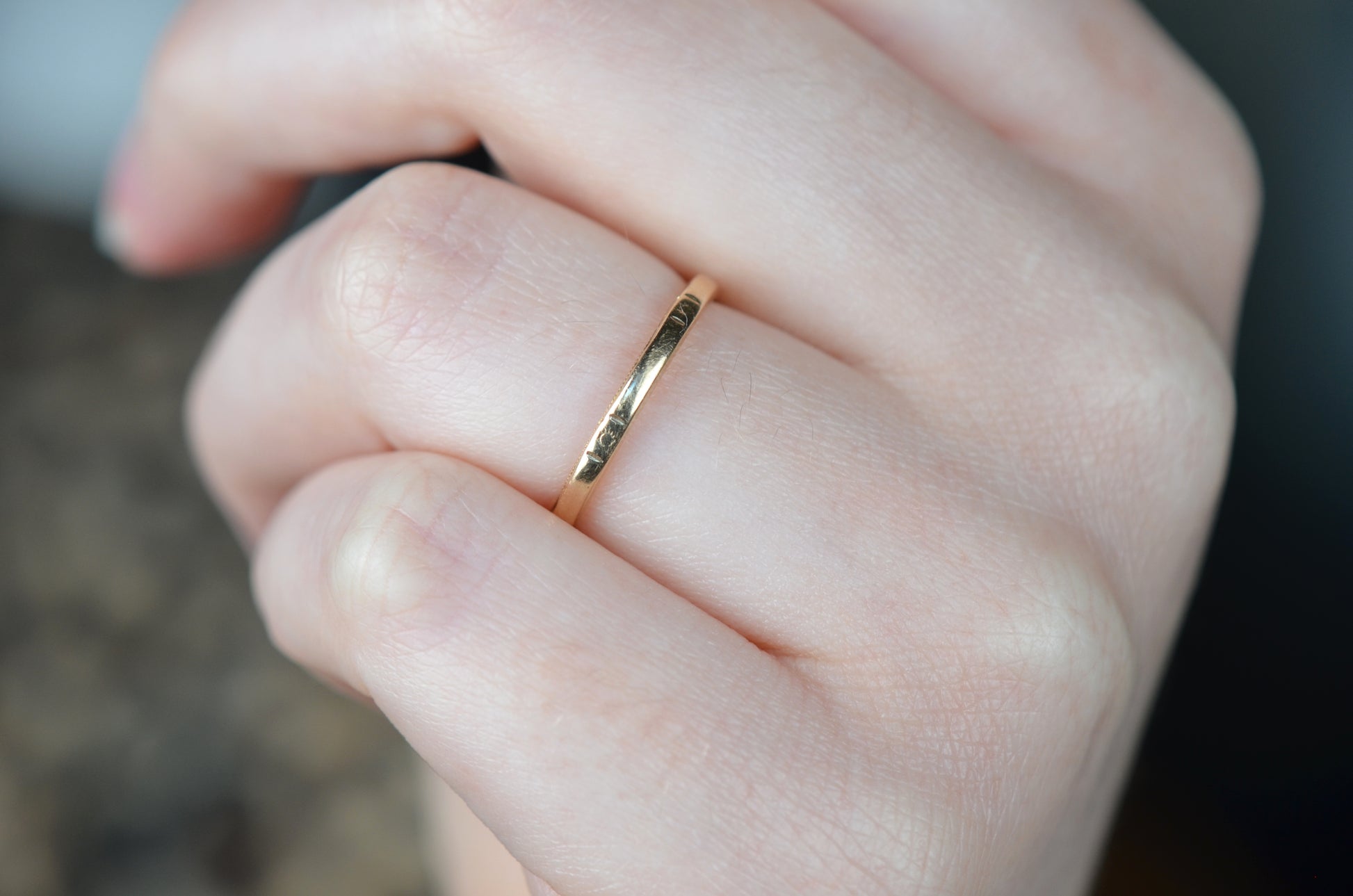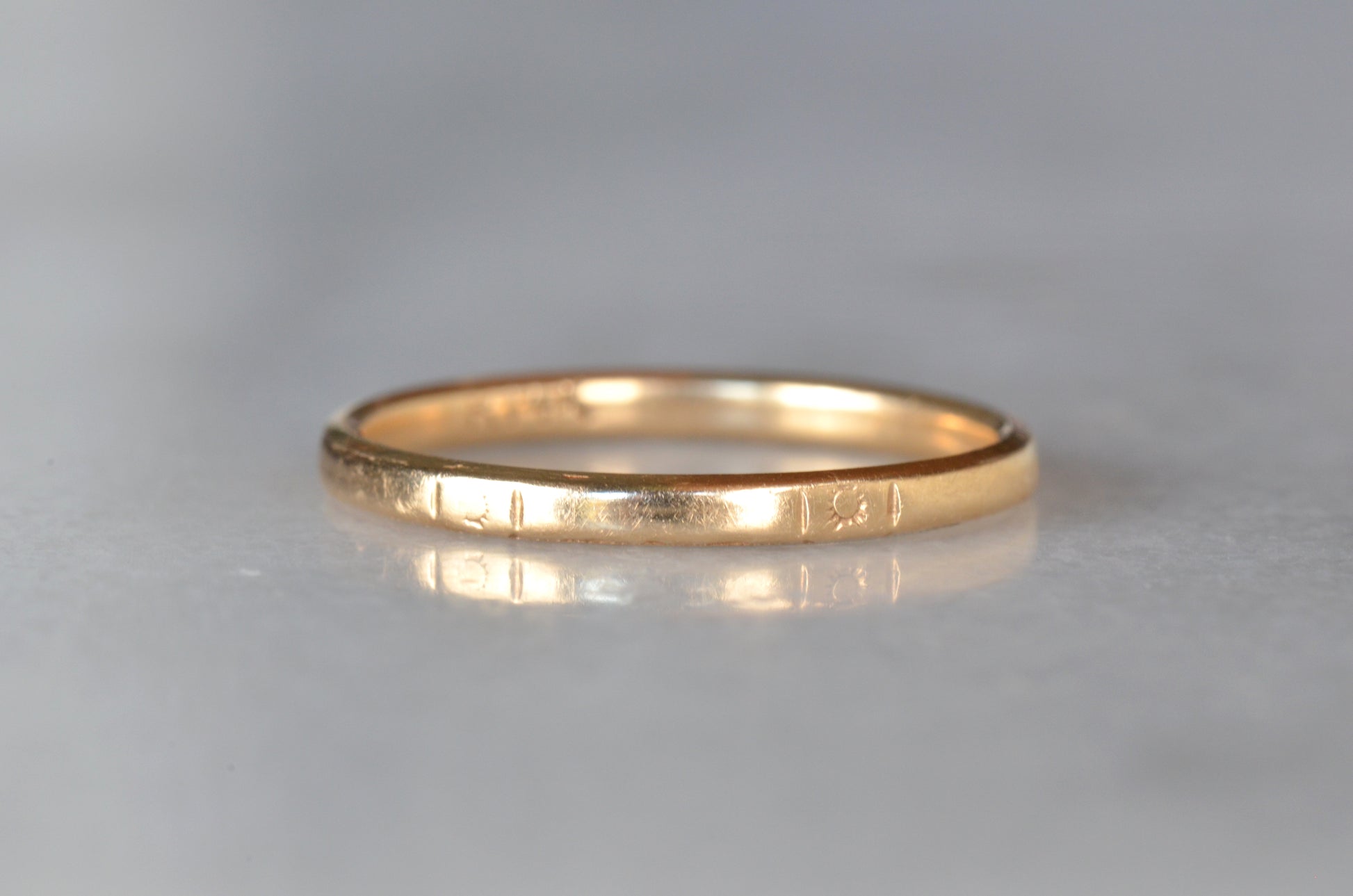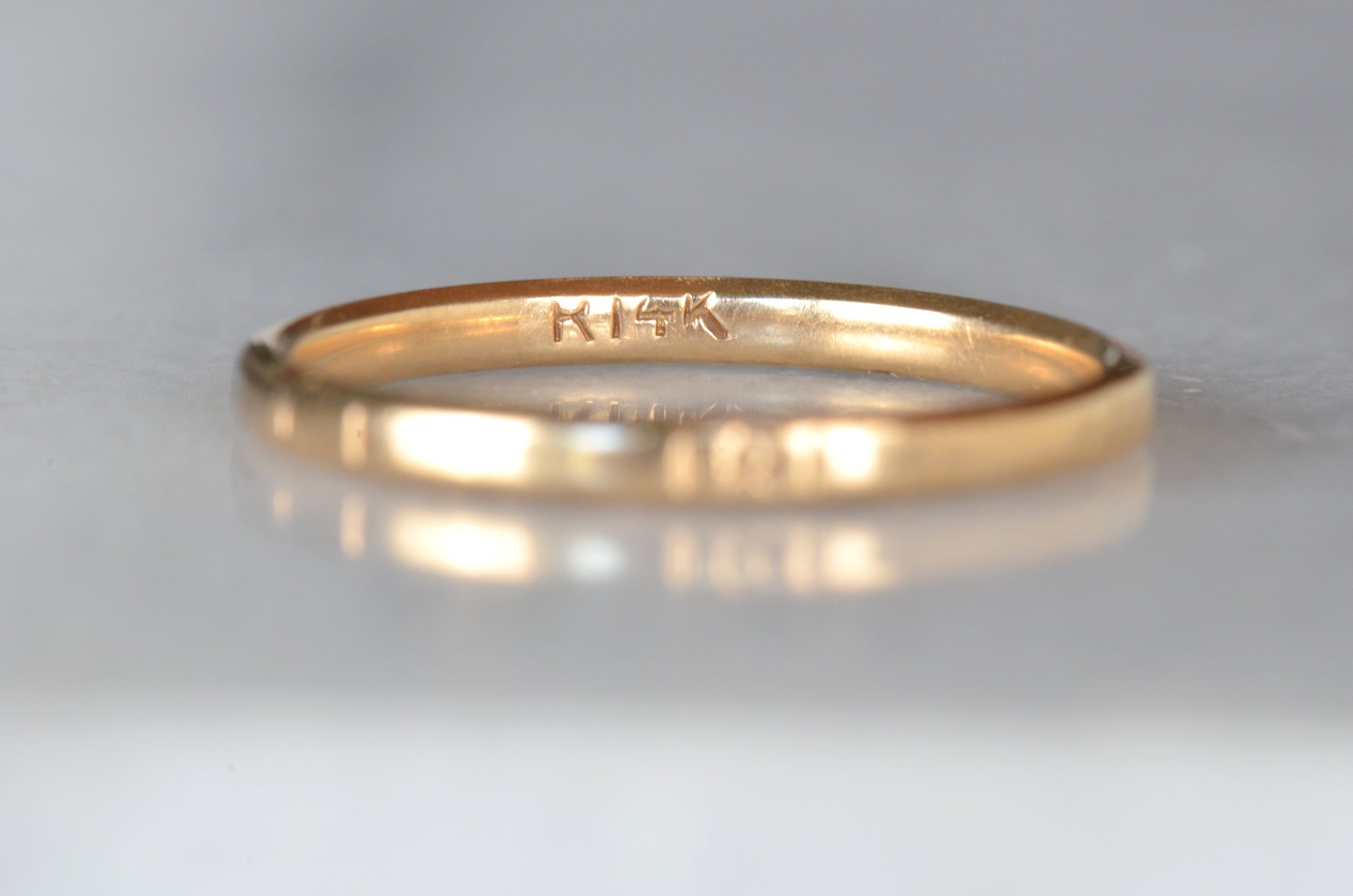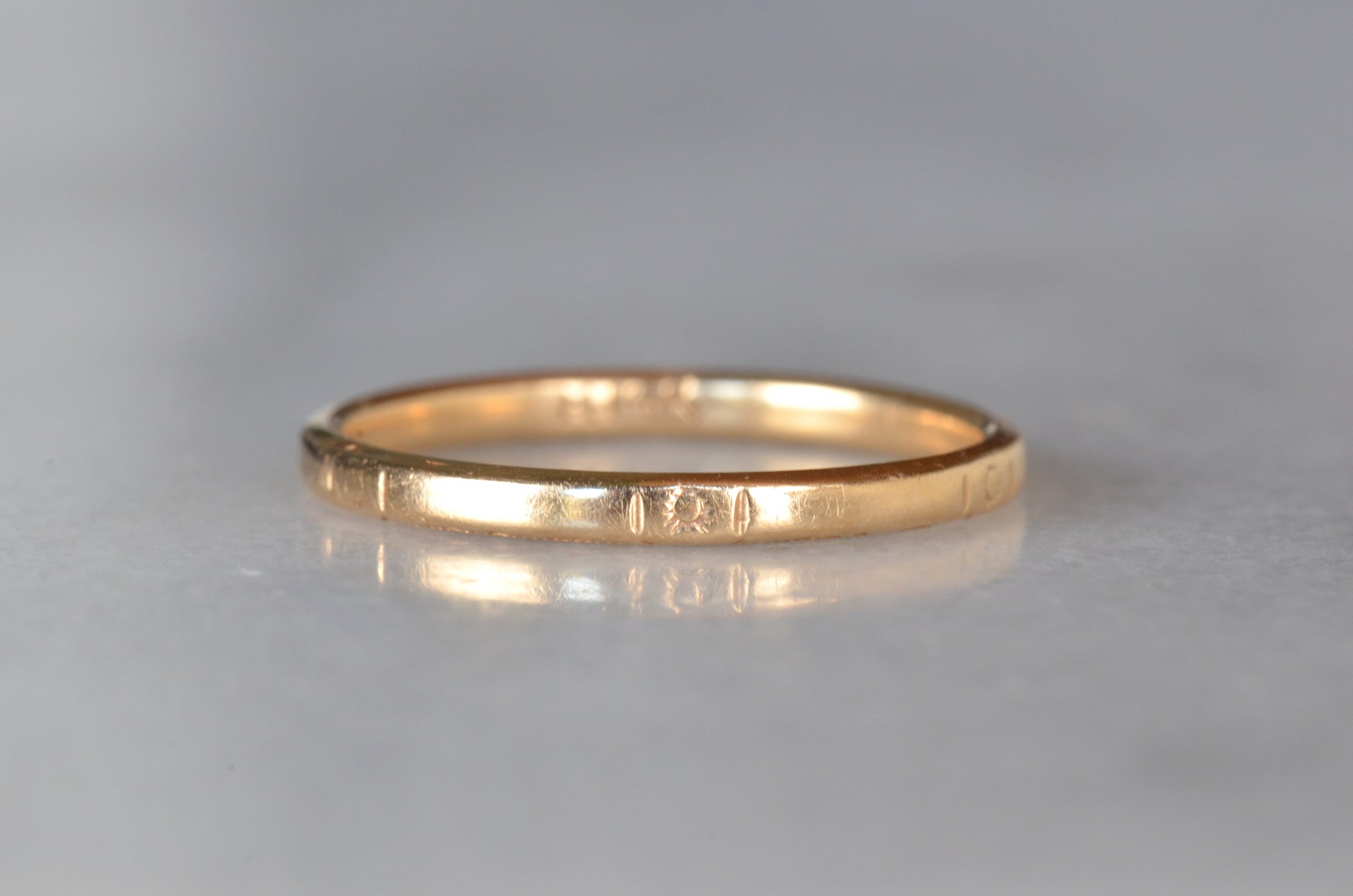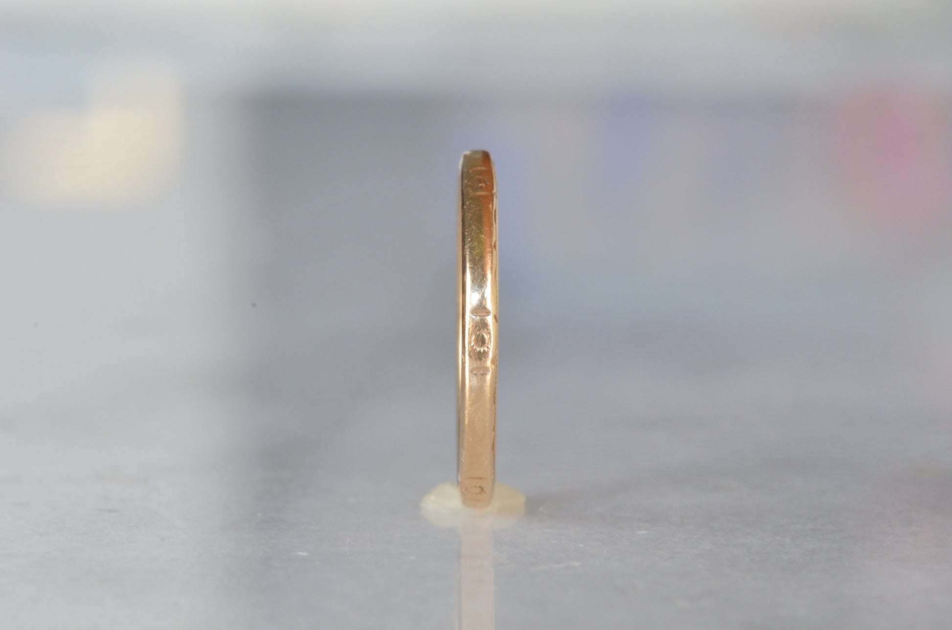 A lovely delicate little ring, this band has clearly been well loved and well worn. Evidence of her original detailing is still visible: when new, this band would have been decorated all around with engraved orange blossoms, broken up by smoother panels, perhaps with a linear detail.