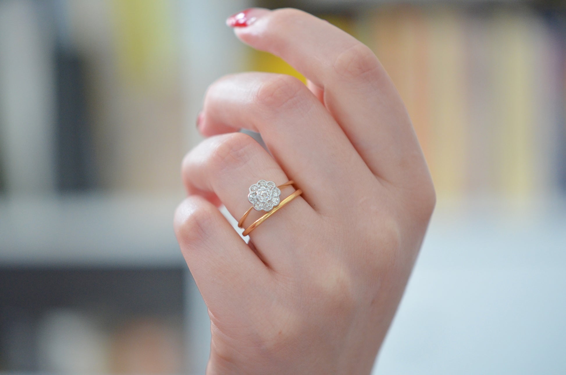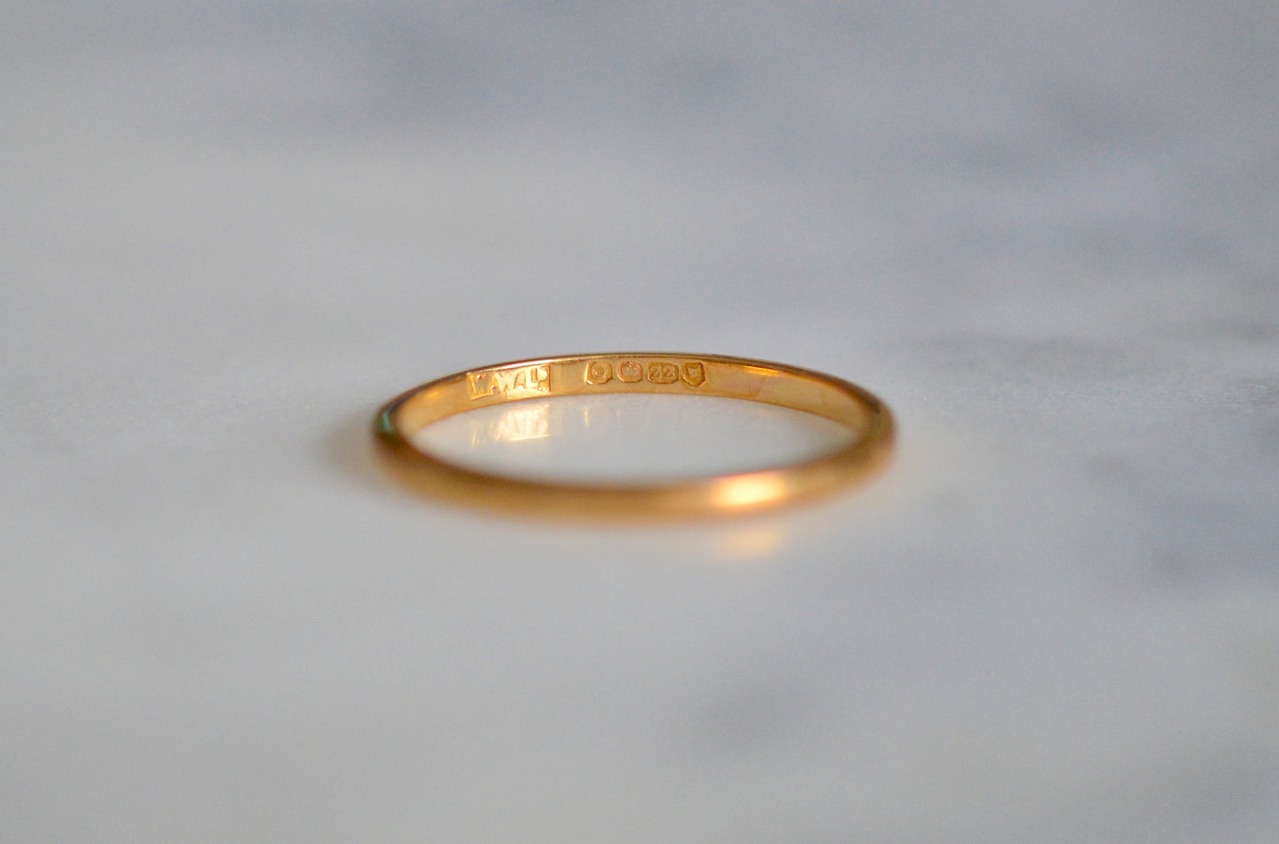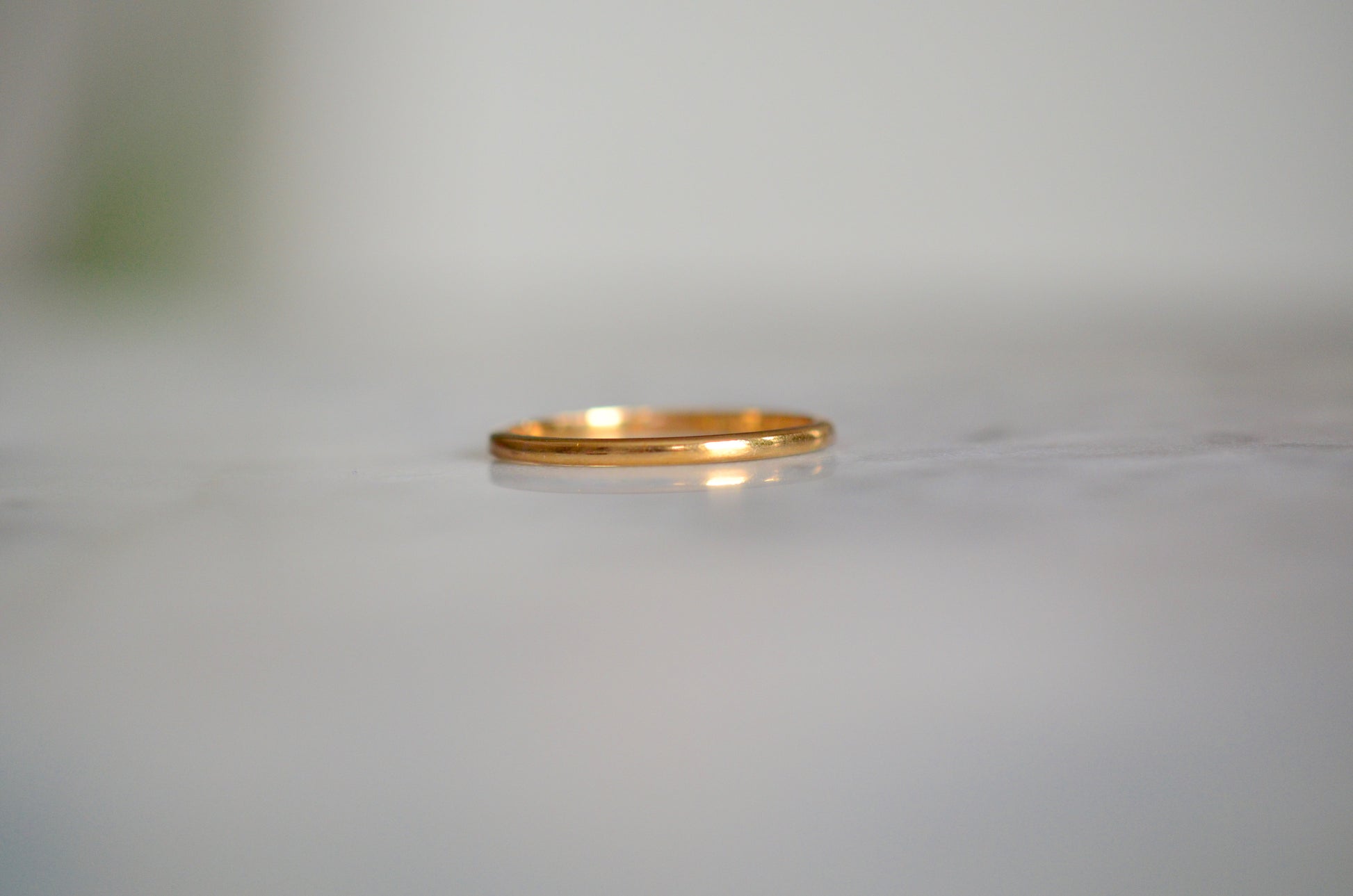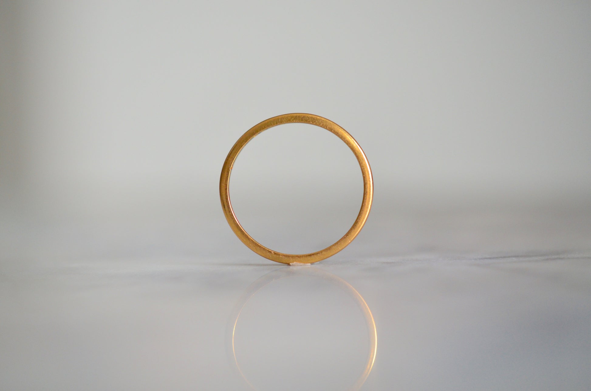 An ultra-skinny and modern style ring that hails from the middle of the 20th century, this is a dreamy wedding band or a chic addition to your regular ring stack. We love how well the thin band will pair with an antique engagement, as well as how it provides a sturdy and rich base in 22k for a modern or mixed-era stack.