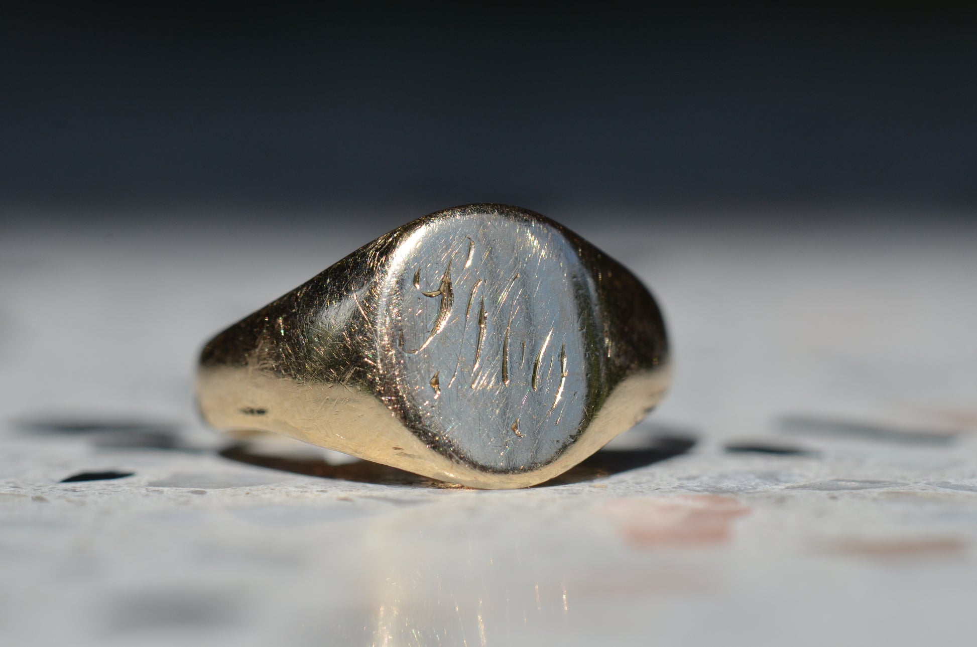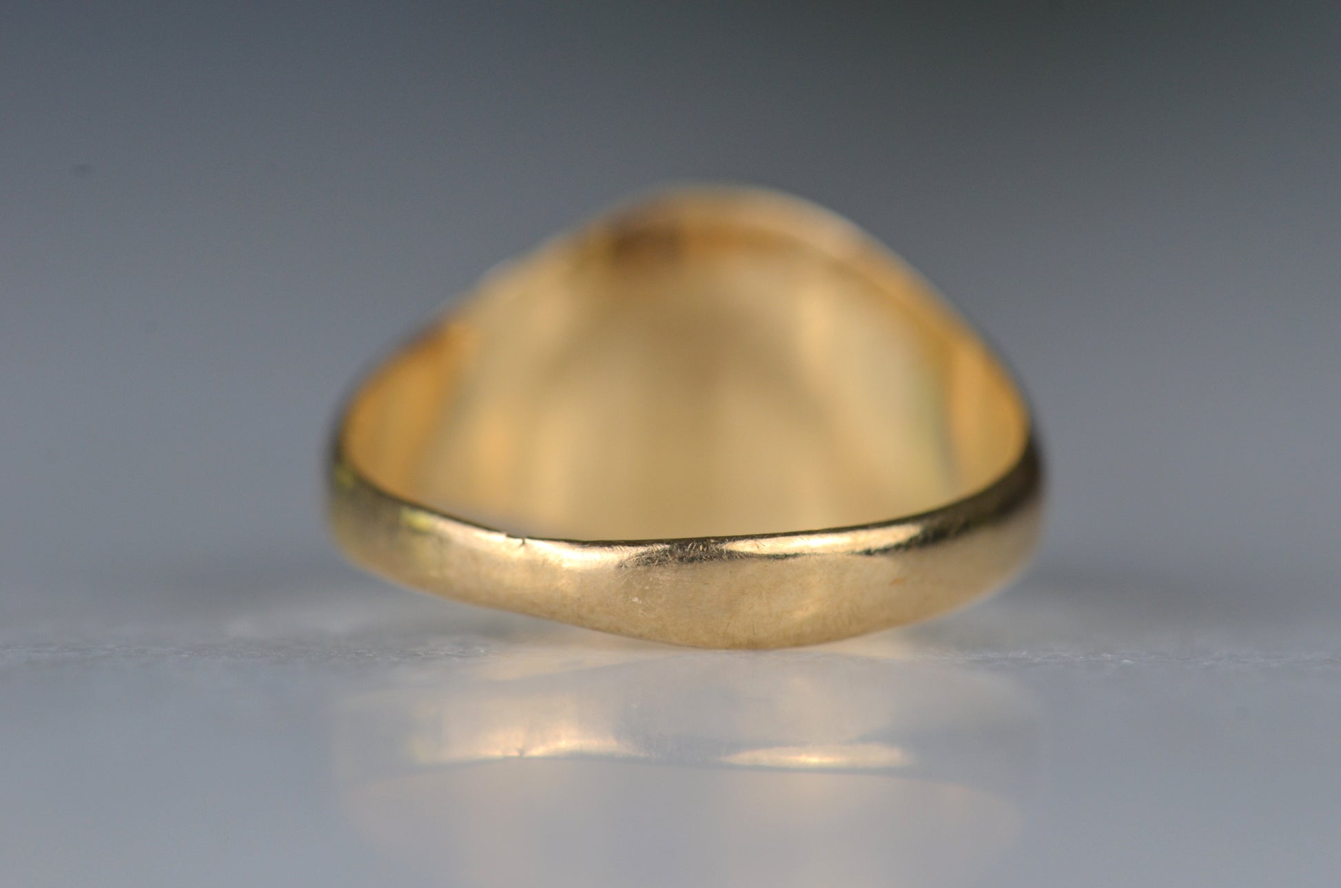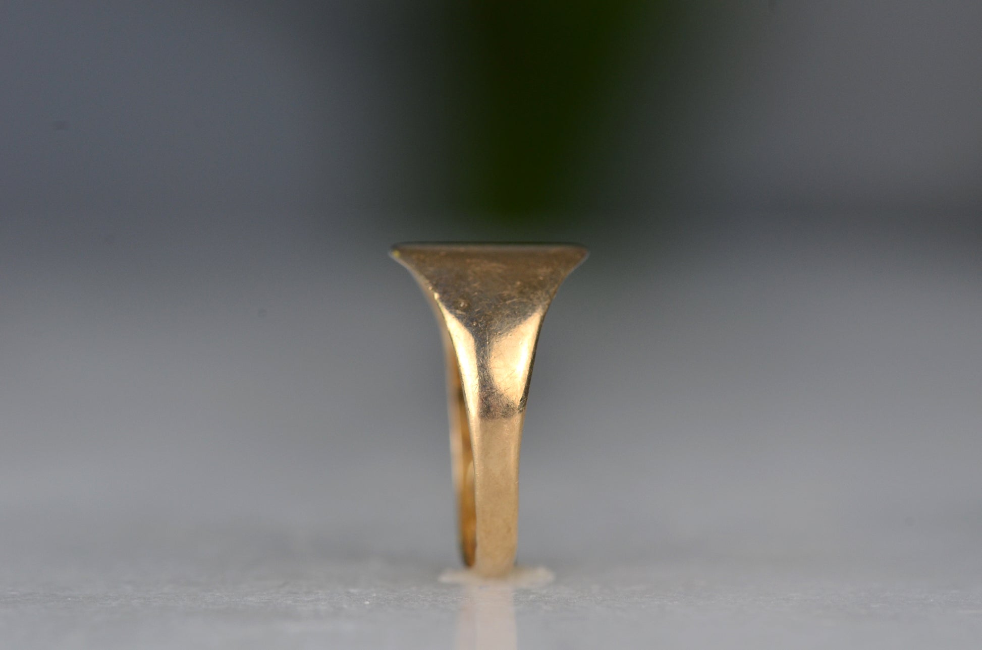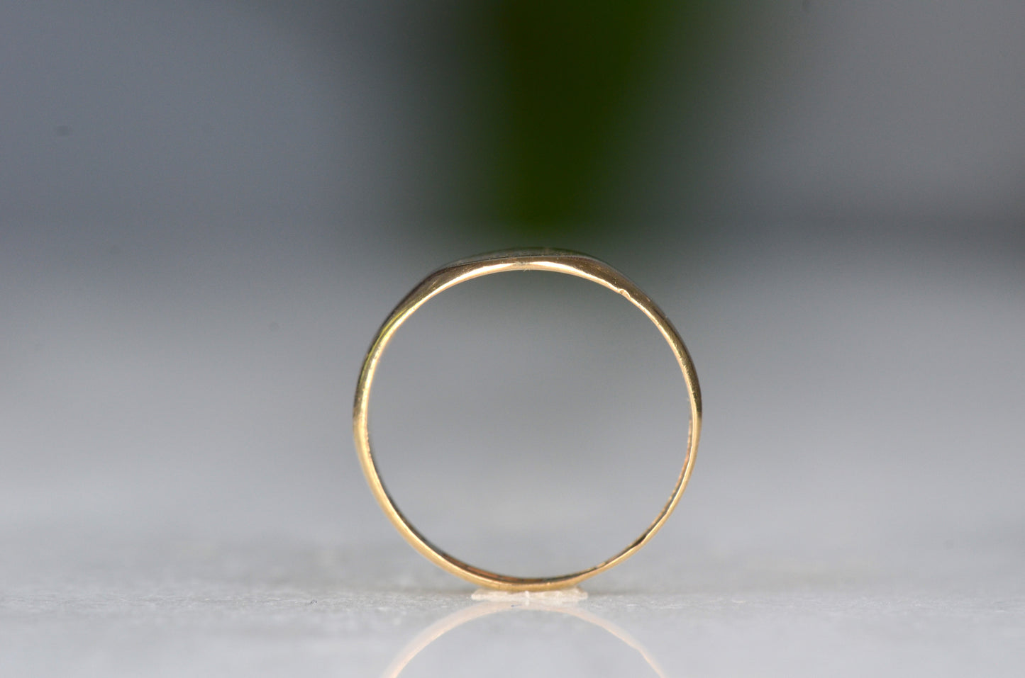 A rich and smooth oval ring, this piece is so slim you'll barely notice it but for the ample reflective surface to catch the sun. There's something about a signet ring worn smooth like this that always tugs on our heart strings: the love that a previous caretaker had for this ring is evident in its wear, in the way that day to day life has left a beautiful smooth patina and just a suggestion of the letters that were once so carefully engraved. Slim, sleek, and utterly smooth, this is a piece you'll likewise reach for day in and day out.