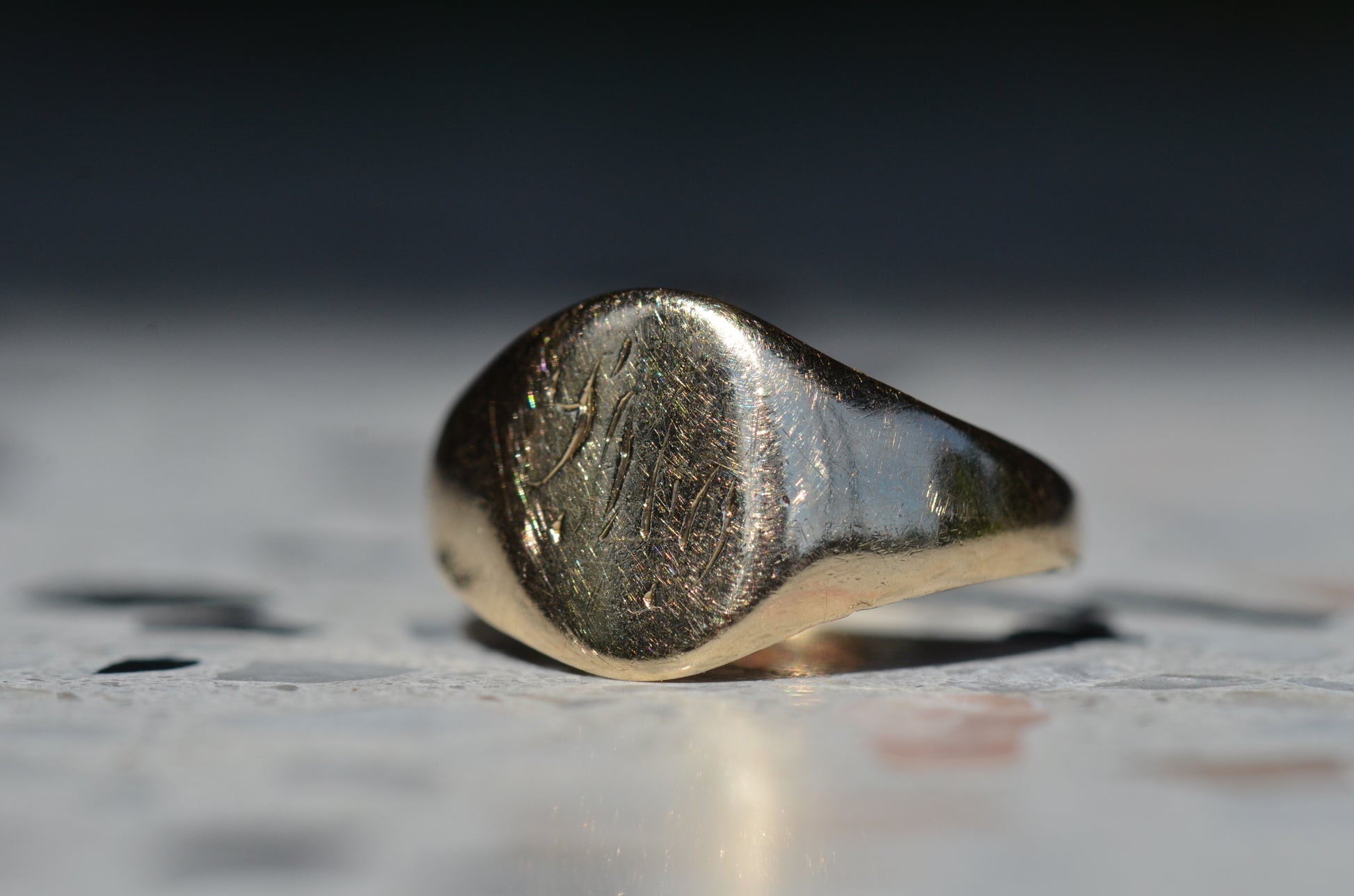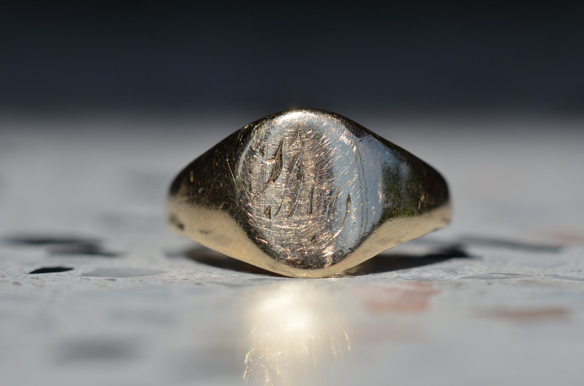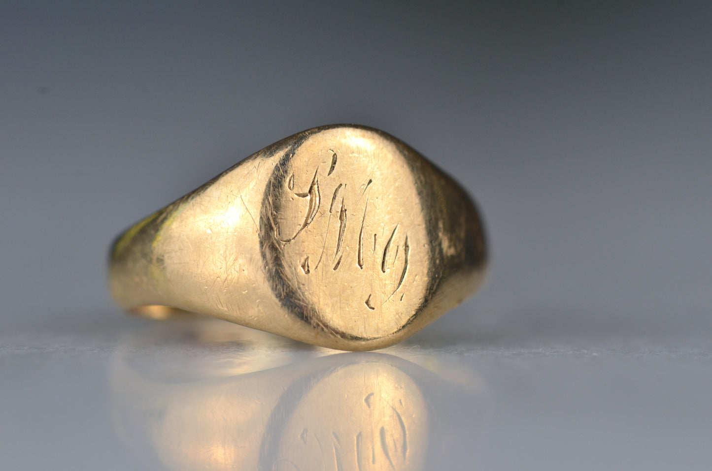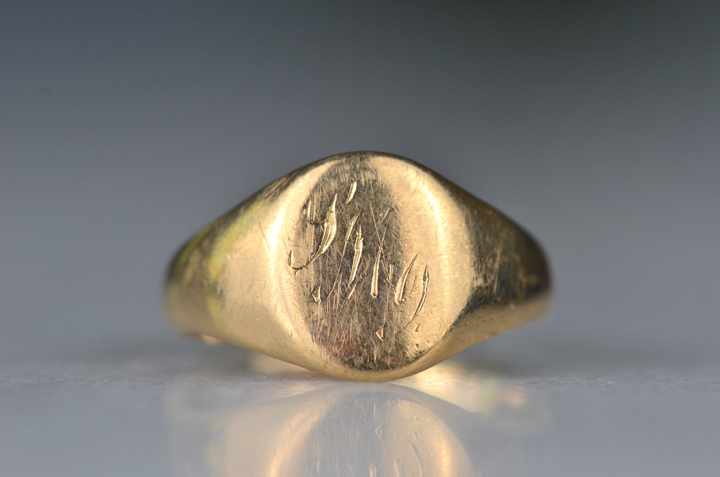 A rich and smooth oval ring, this piece is so slim you'll barely notice it but for the ample reflective surface to catch the sun. There's something about a signet ring worn smooth like this that always tugs on our heart strings: the love that a previous caretaker had for this ring is evident in its wear, in the way that day to day life has left a beautiful smooth patina and just a suggestion of the letters that were once so carefully engraved. Slim, sleek, and utterly smooth, this is a piece you'll likewise reach for day in and day out.