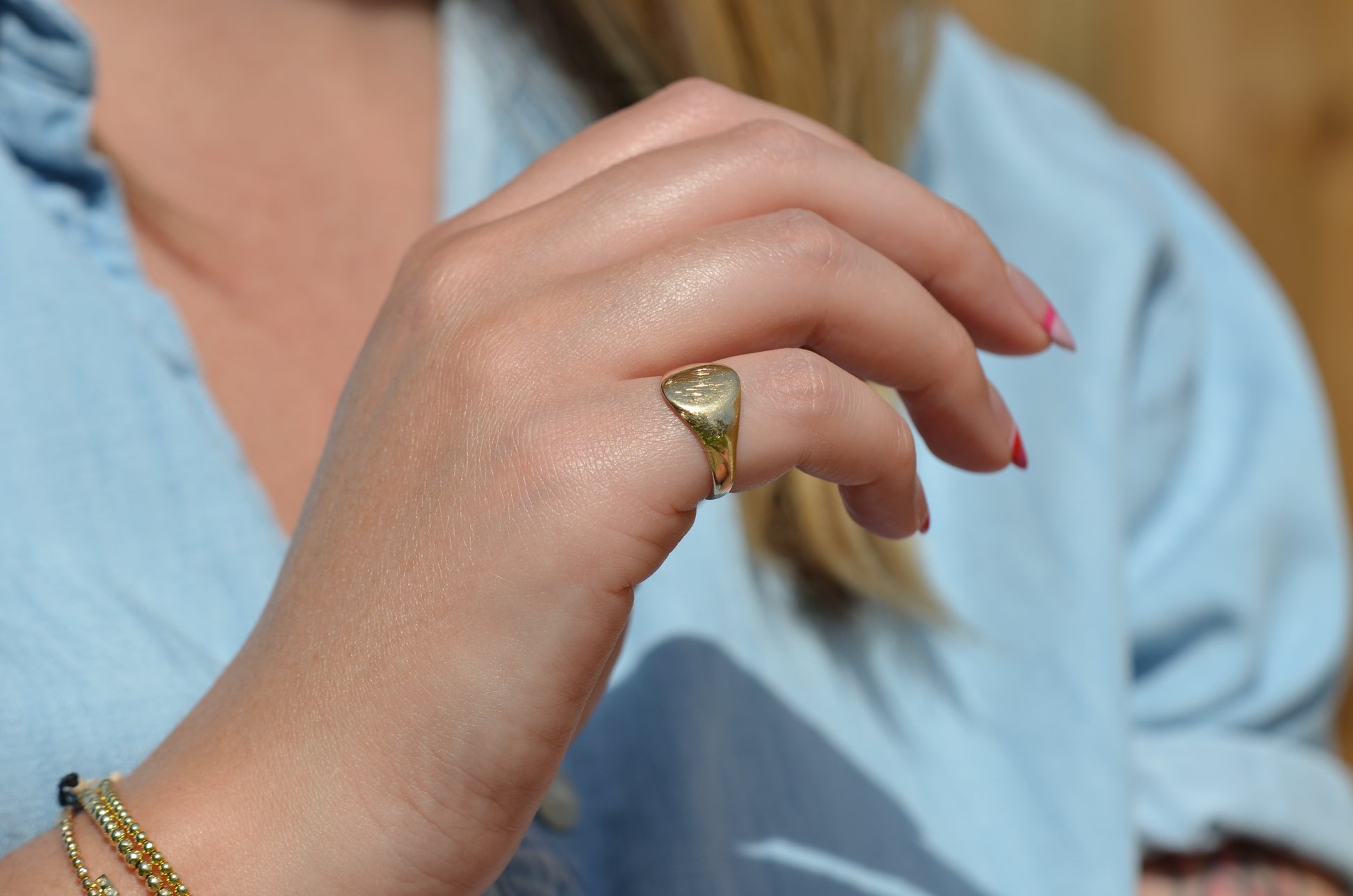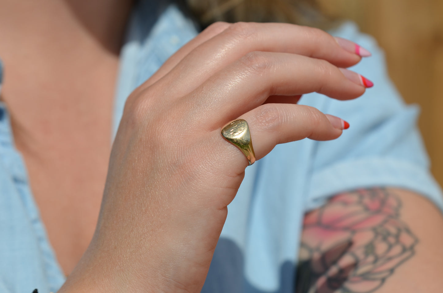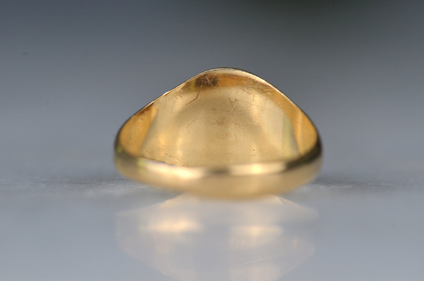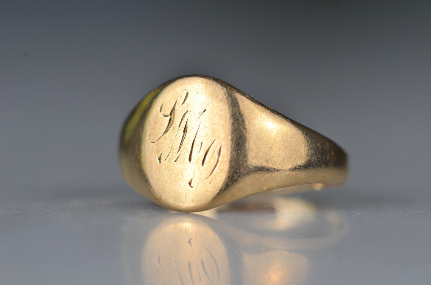 A rich and smooth oval ring, this piece is so slim you'll barely notice it but for the ample reflective surface to catch the sun. There's something about a signet ring worn smooth like this that always tugs on our heart strings: the love that a previous caretaker had for this ring is evident in its wear, in the way that day to day life has left a beautiful smooth patina and just a suggestion of the letters that were once so carefully engraved. Slim, sleek, and utterly smooth, this is a piece you'll likewise reach for day in and day out.