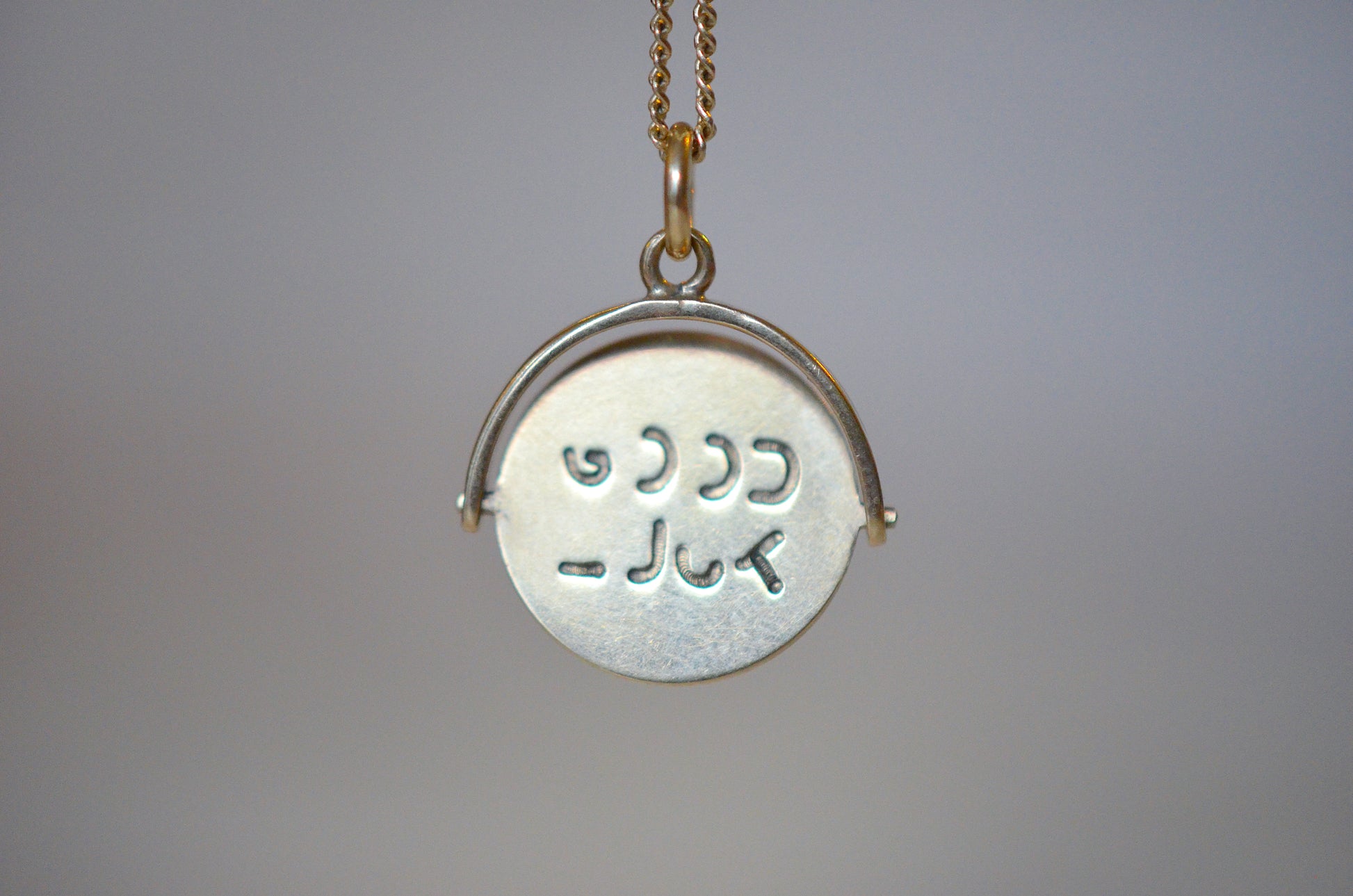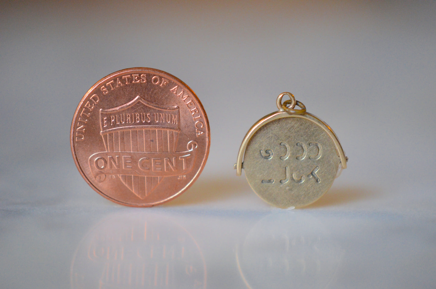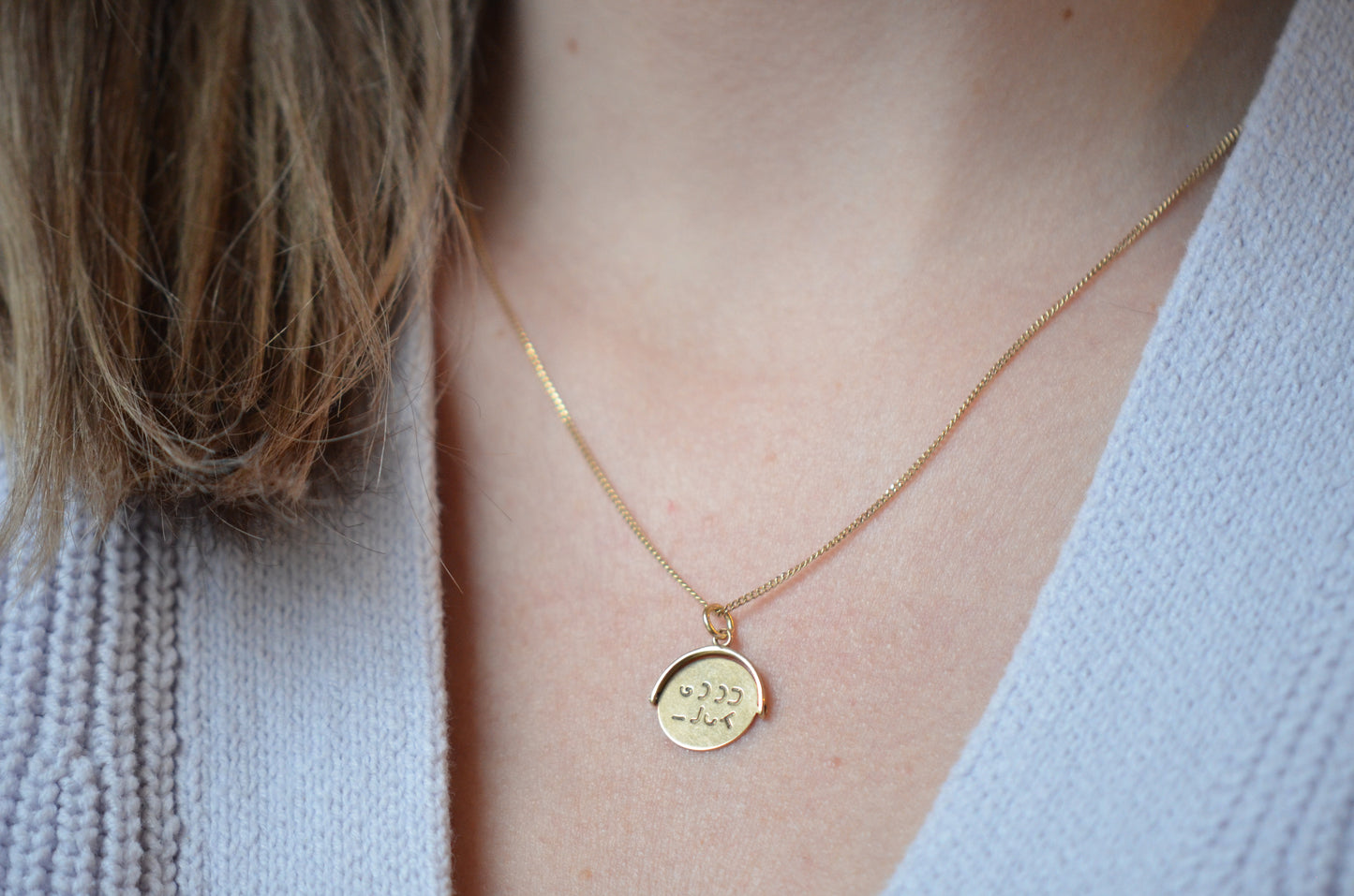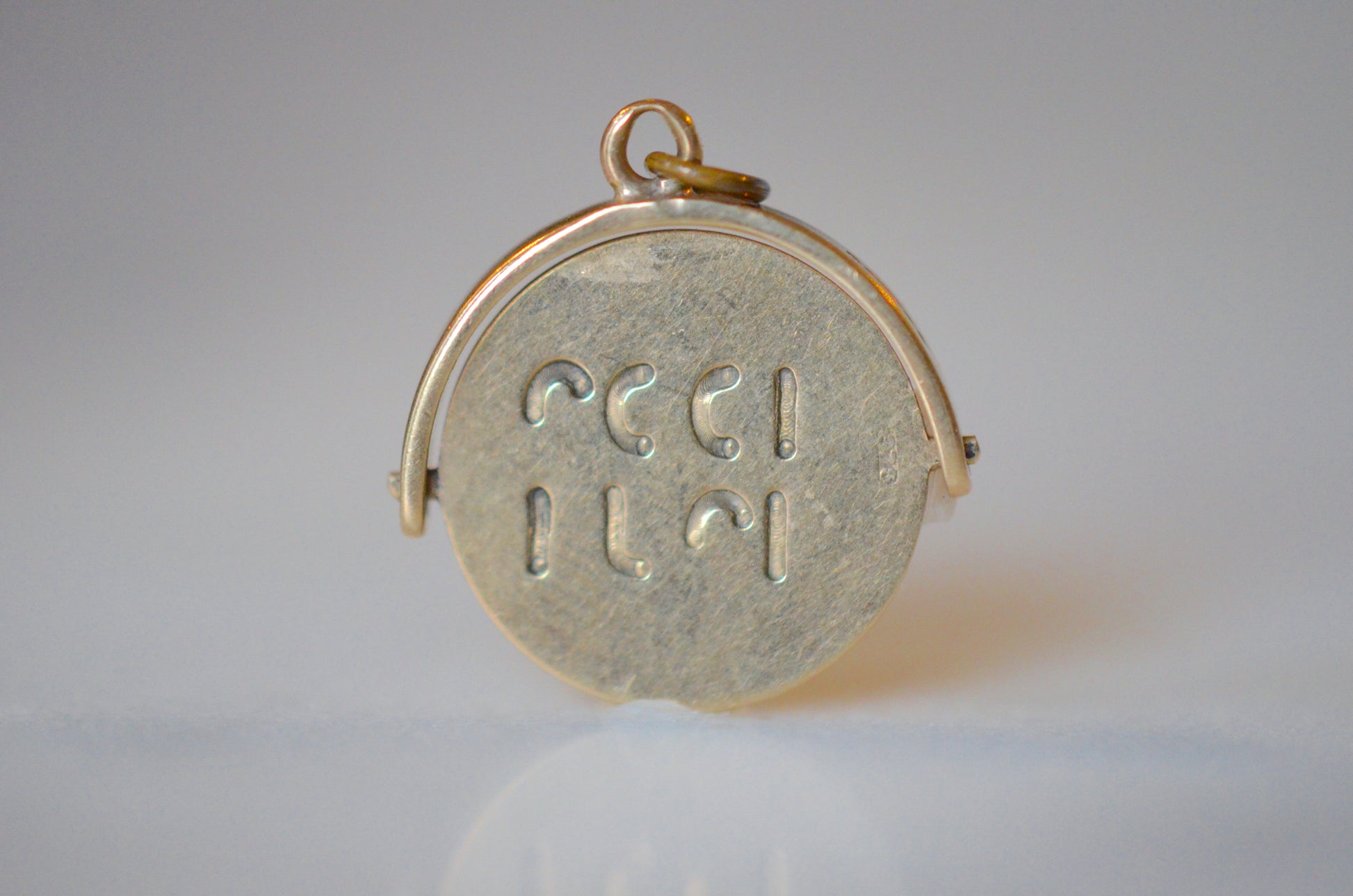 Straight from the mid-century charm craze, these delightful pieces can be added to your own charm bracelet or necklace, or worn alone on a chain to give them all the focus. Each side of the disc bears only a portion of each letter, creating a secret message that is only revealed when the disc is spun and in motion.