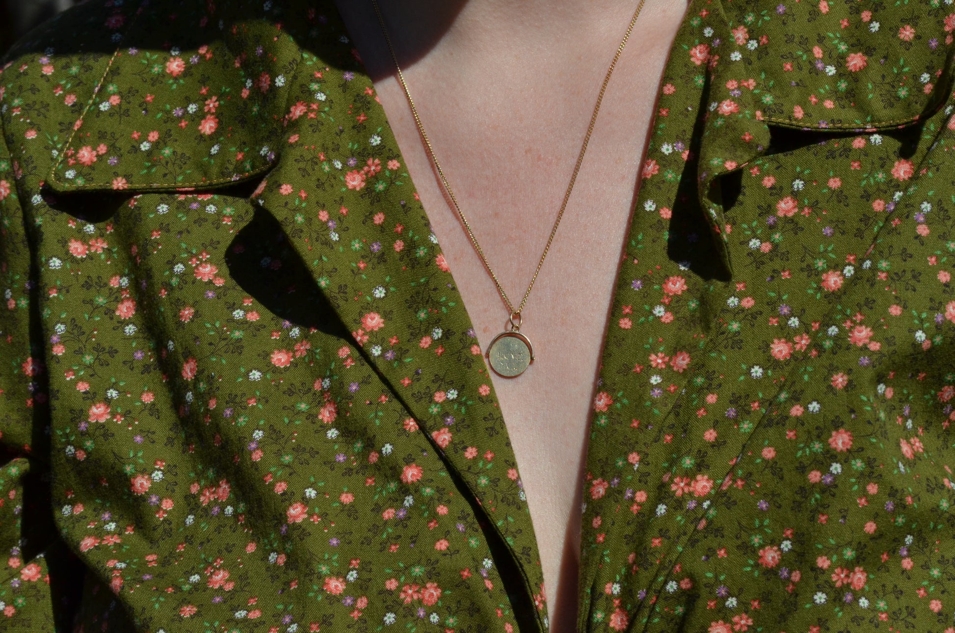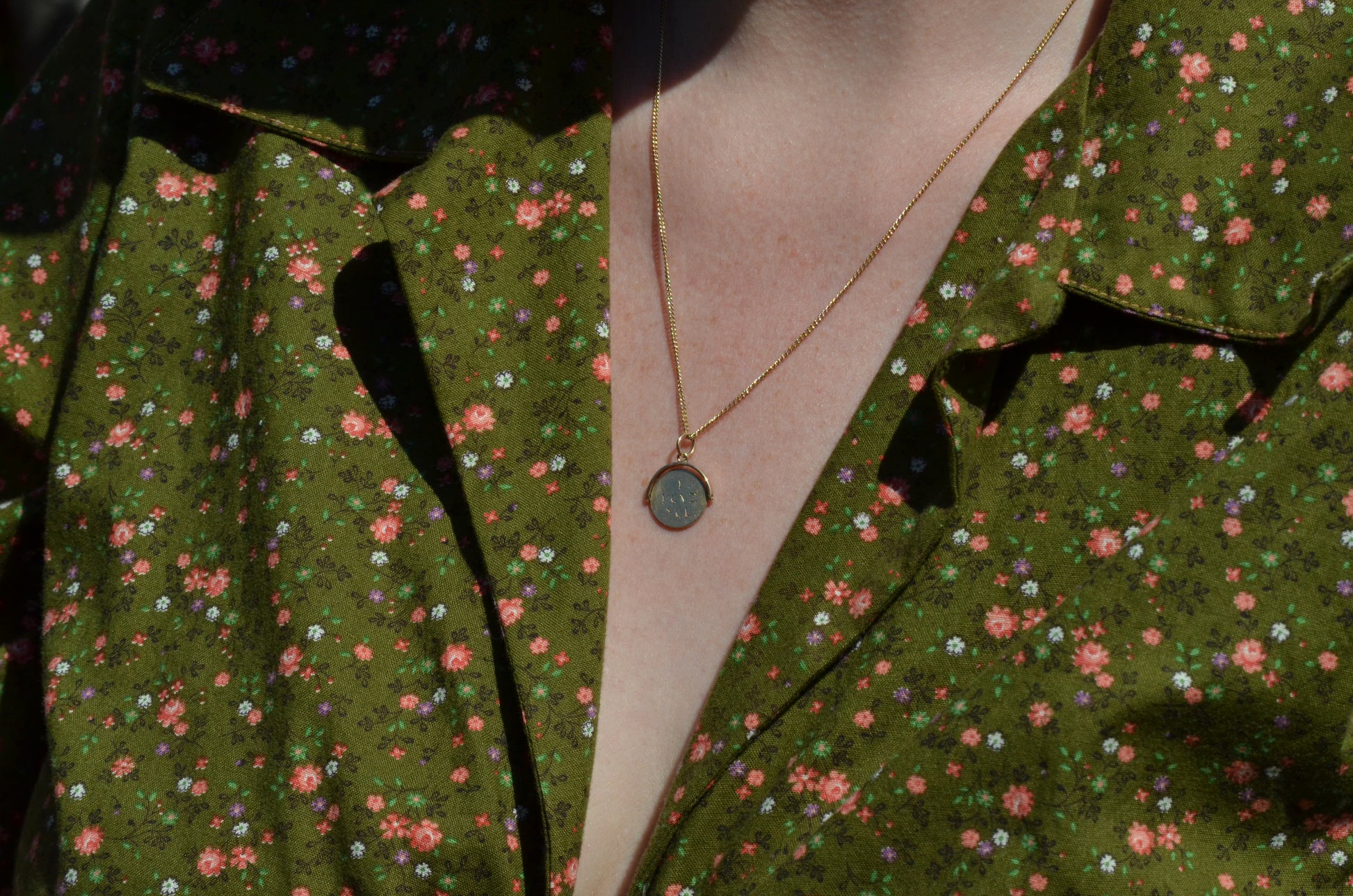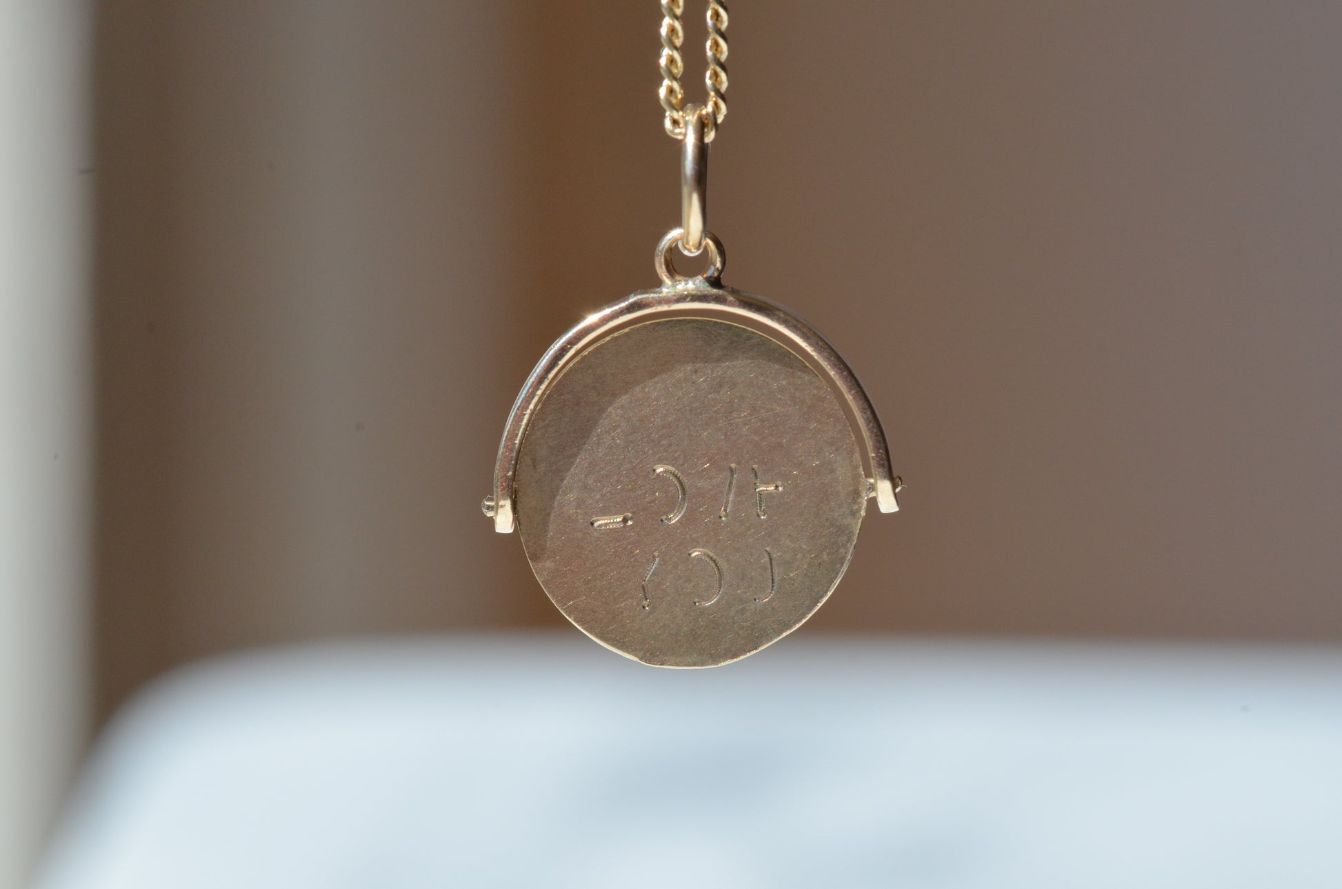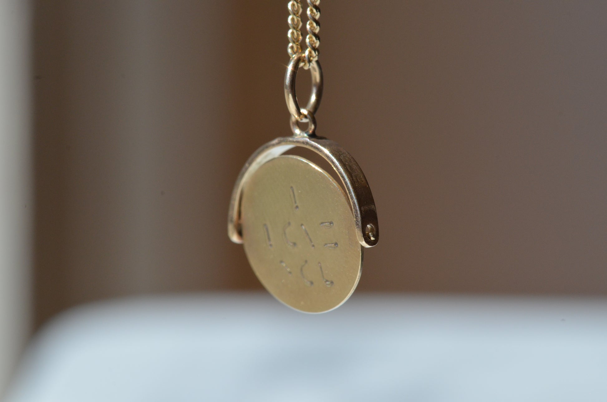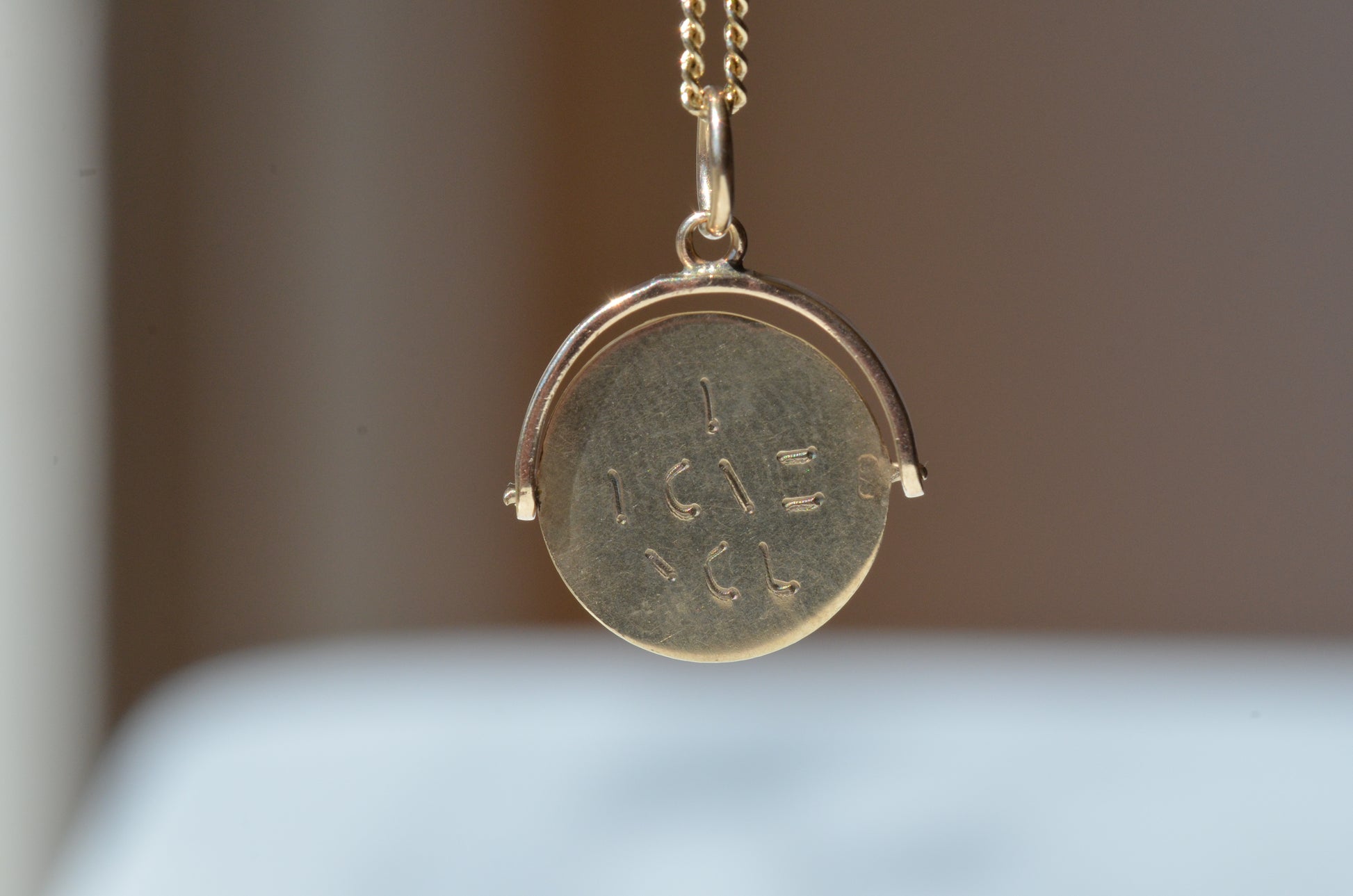 Straight from the midcentury charm craze, these delightful pieces can be added to your own charm bracelet or necklace, or worn alone on a chain to give them all the focus. Each side of the disc bears only a portion of each letter, creating a secret message that is only revealed when the disc is spun and in motion.