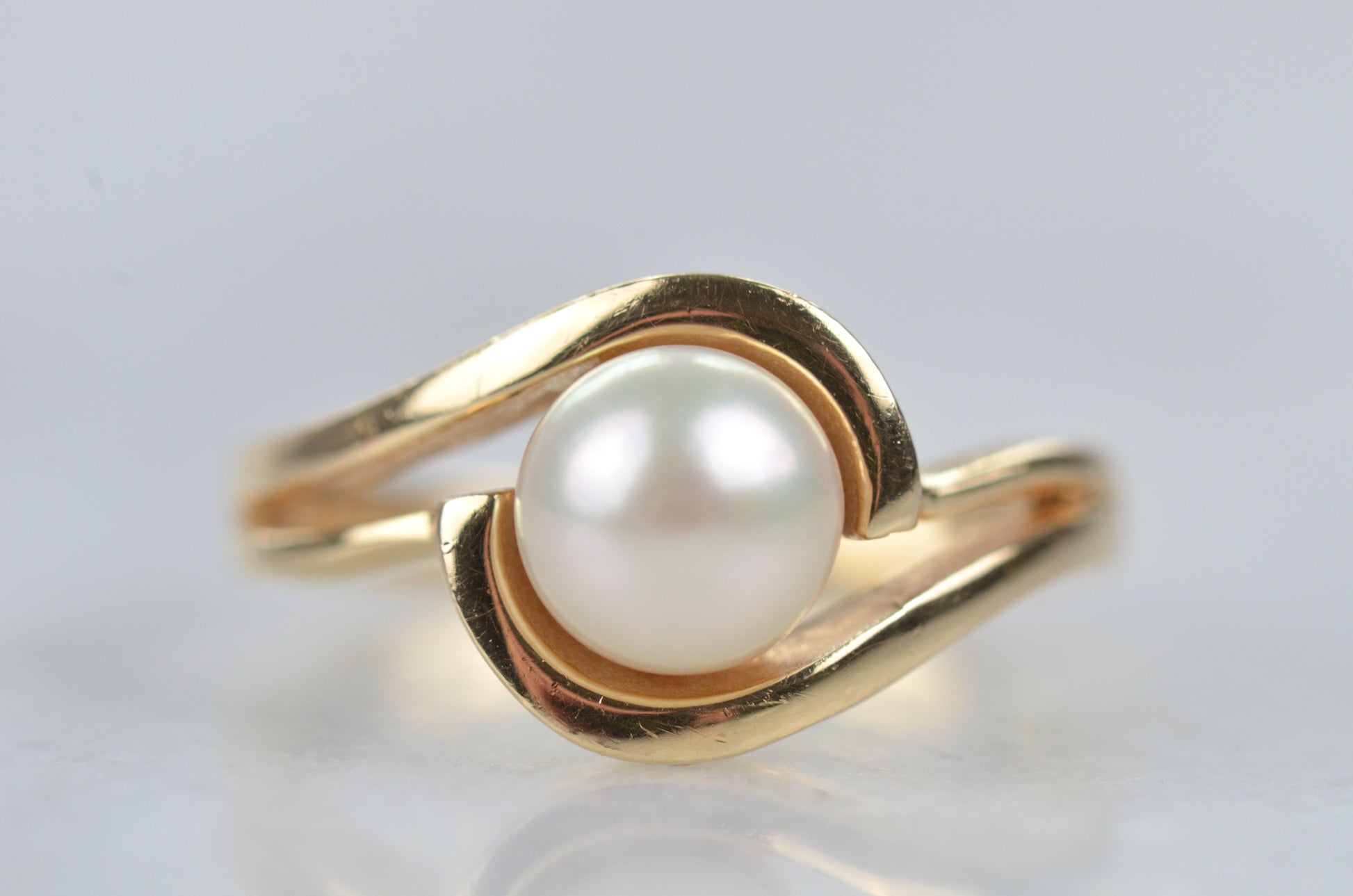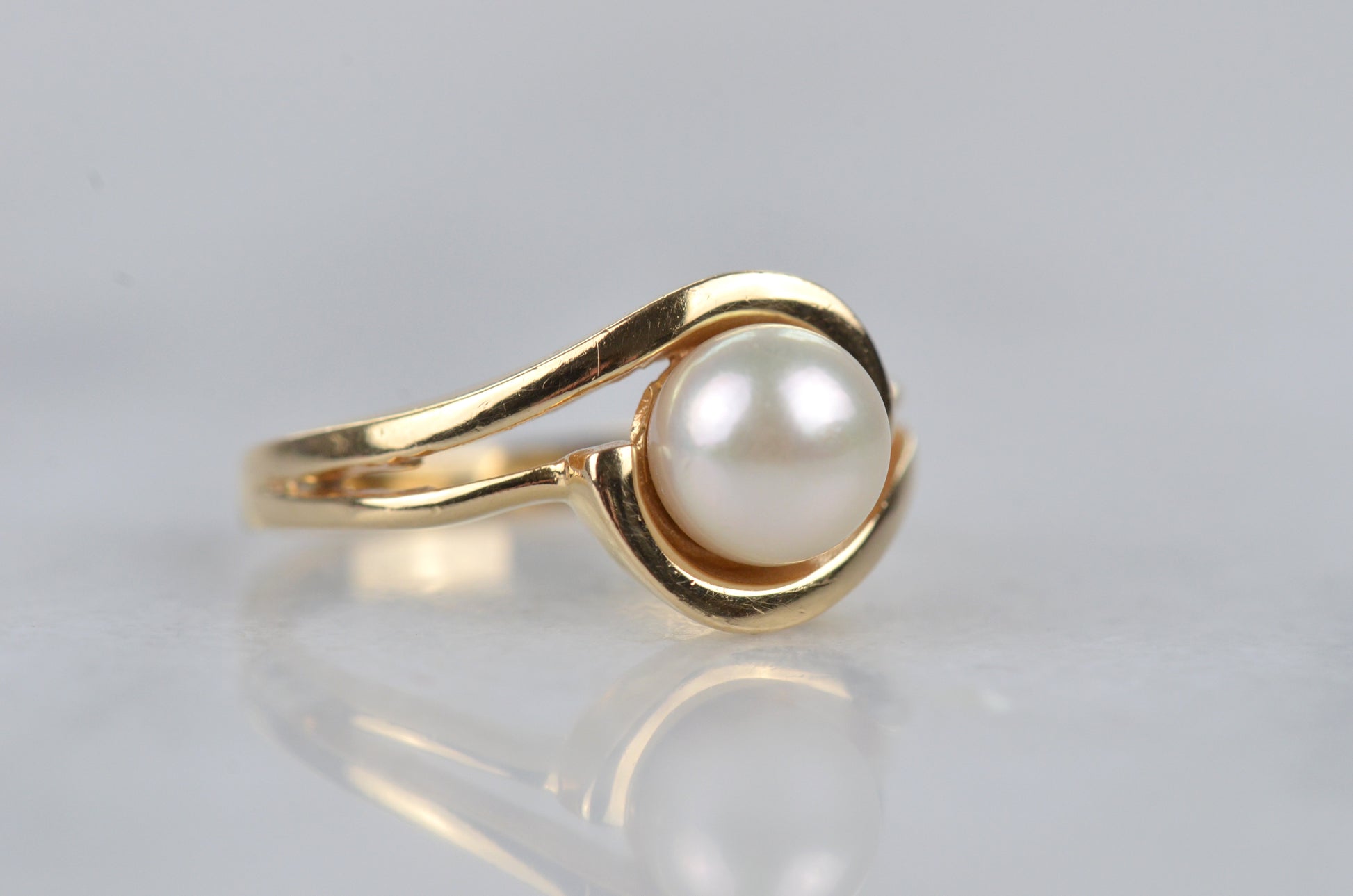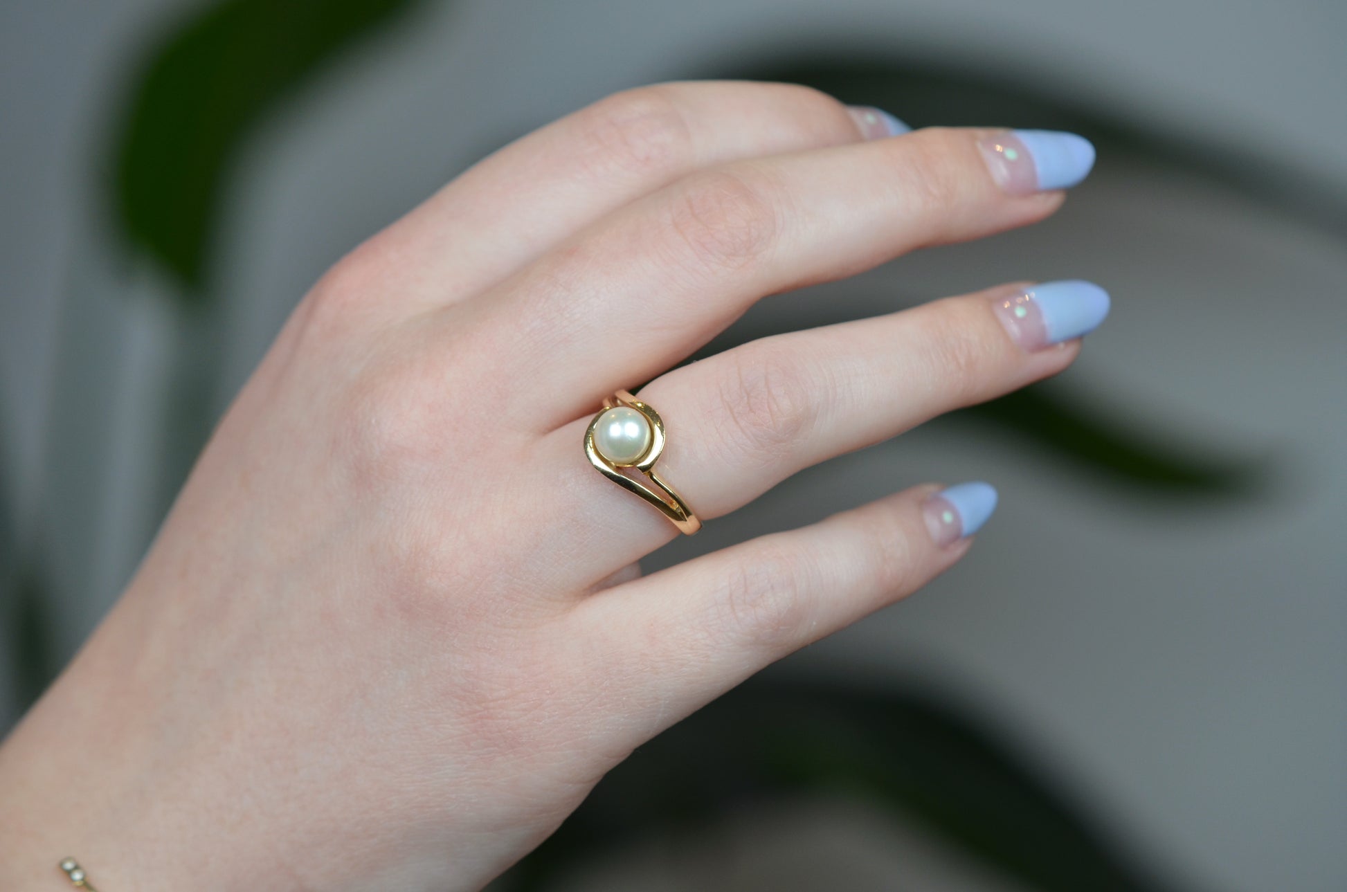 Bold and dynamic with a feminine flair, this ring features a lustrous pearl anchored in swirling, wave-like bands of gold - with split shoulders opening negative space that plays beautifully against the thick, bright gold and the soft, luminous pearl. Strong and femme all at once, this ring has movement you can feel.